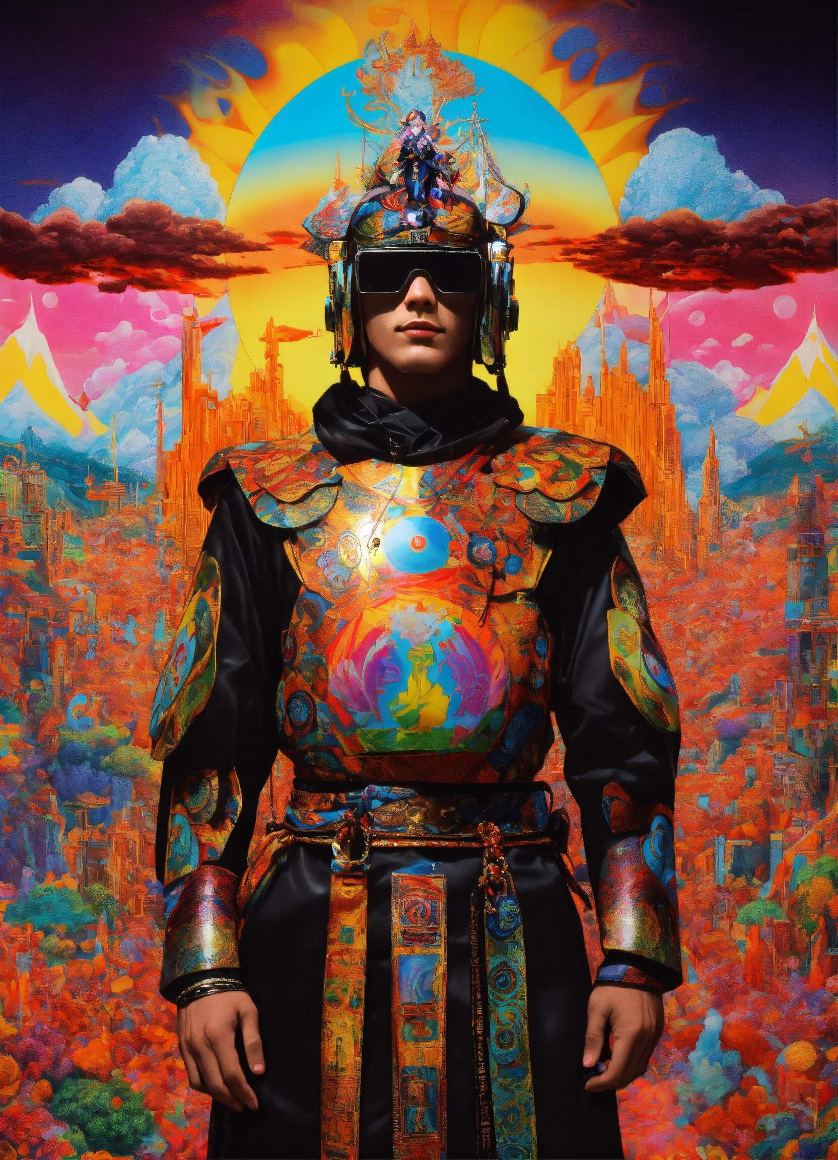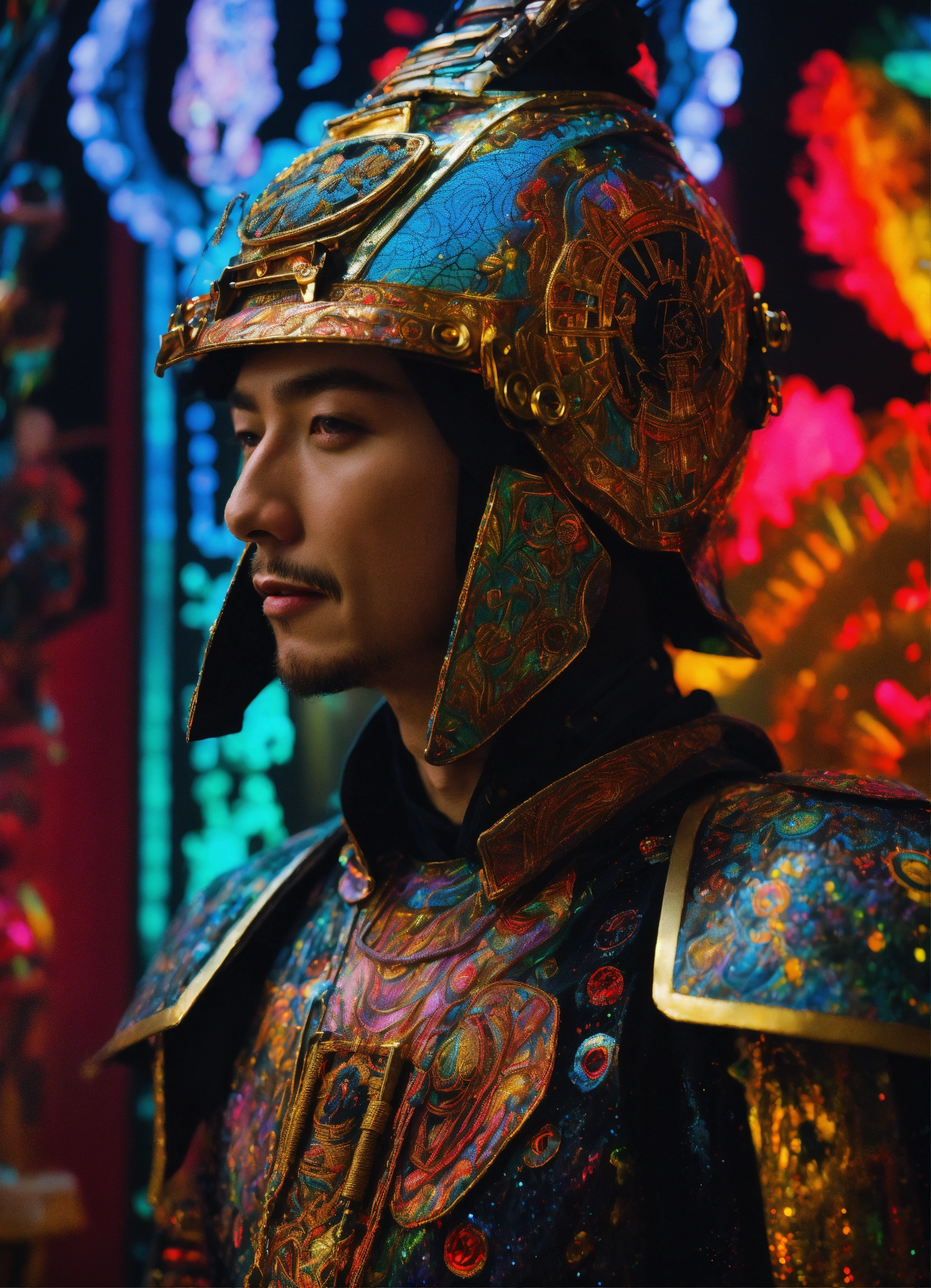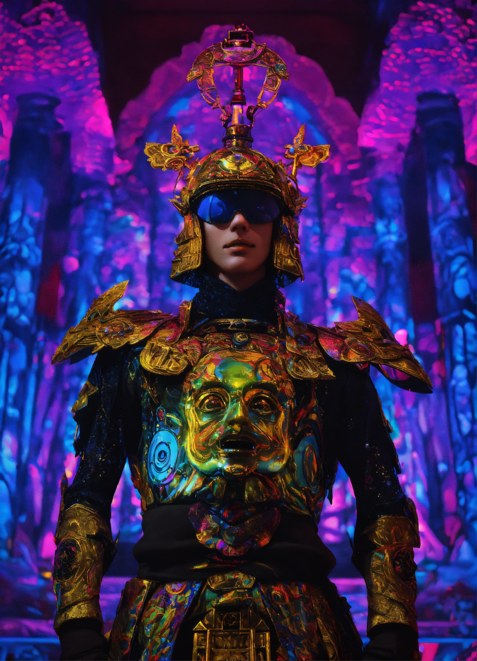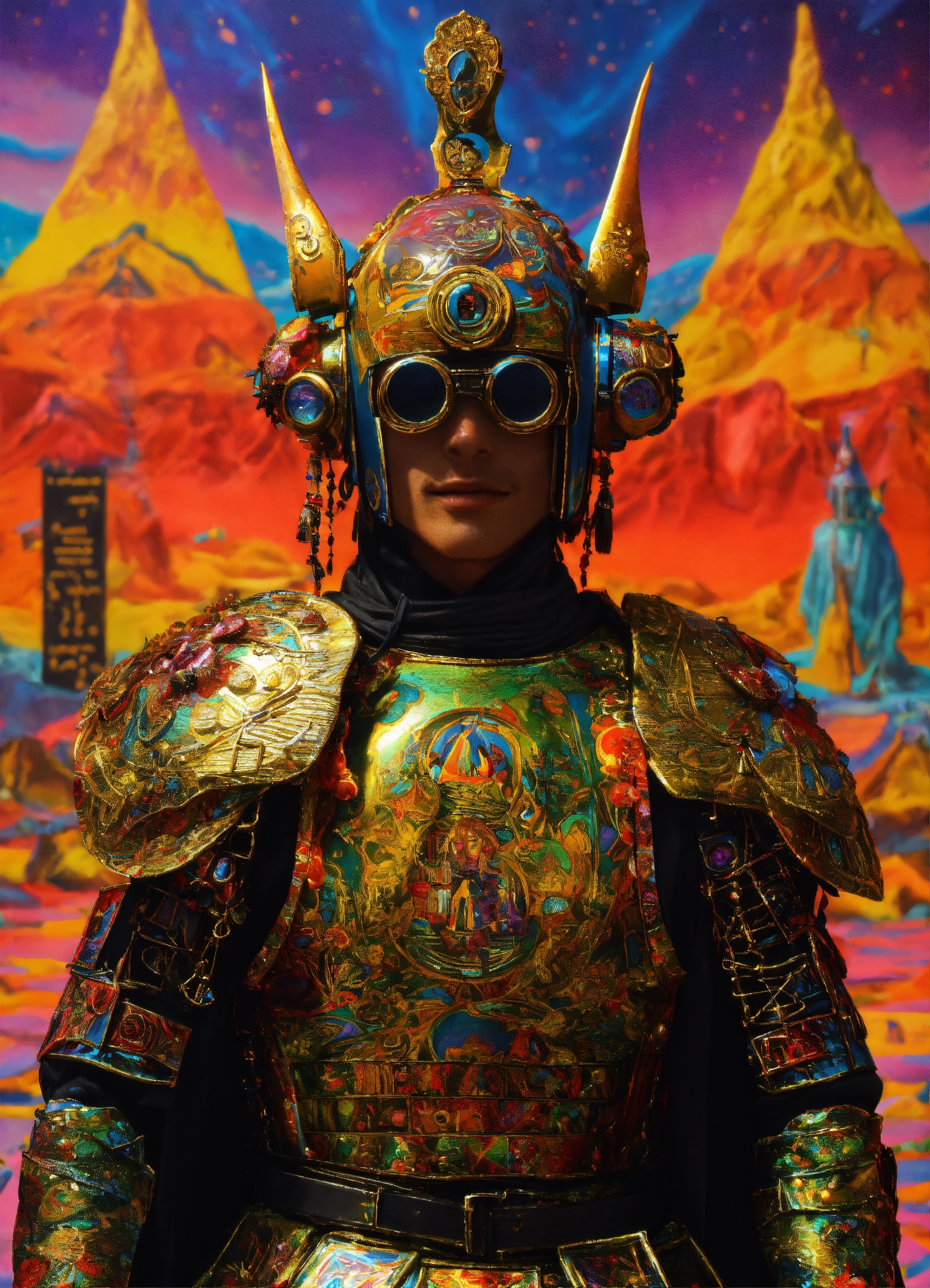 Hyperion in holy mountain the movie photorealistic 3d 35 mm portrait of gothic samurai robot wear prada male tantric warrior man ai god dmt laughing psytrance grimes punk rock anime haute couture costume, baptized in a cosmic alex grey painting in a dmt tokyo black laser light black glitter holographic techno club art by salvador dali and holy mountain the movie.