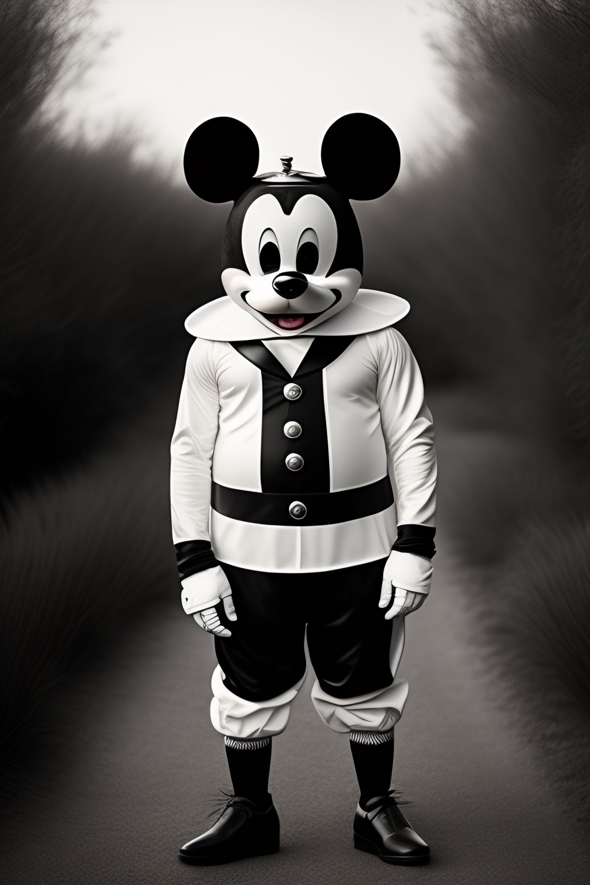 Old black and white photo of a very scary 1920s style mickey mouse costume