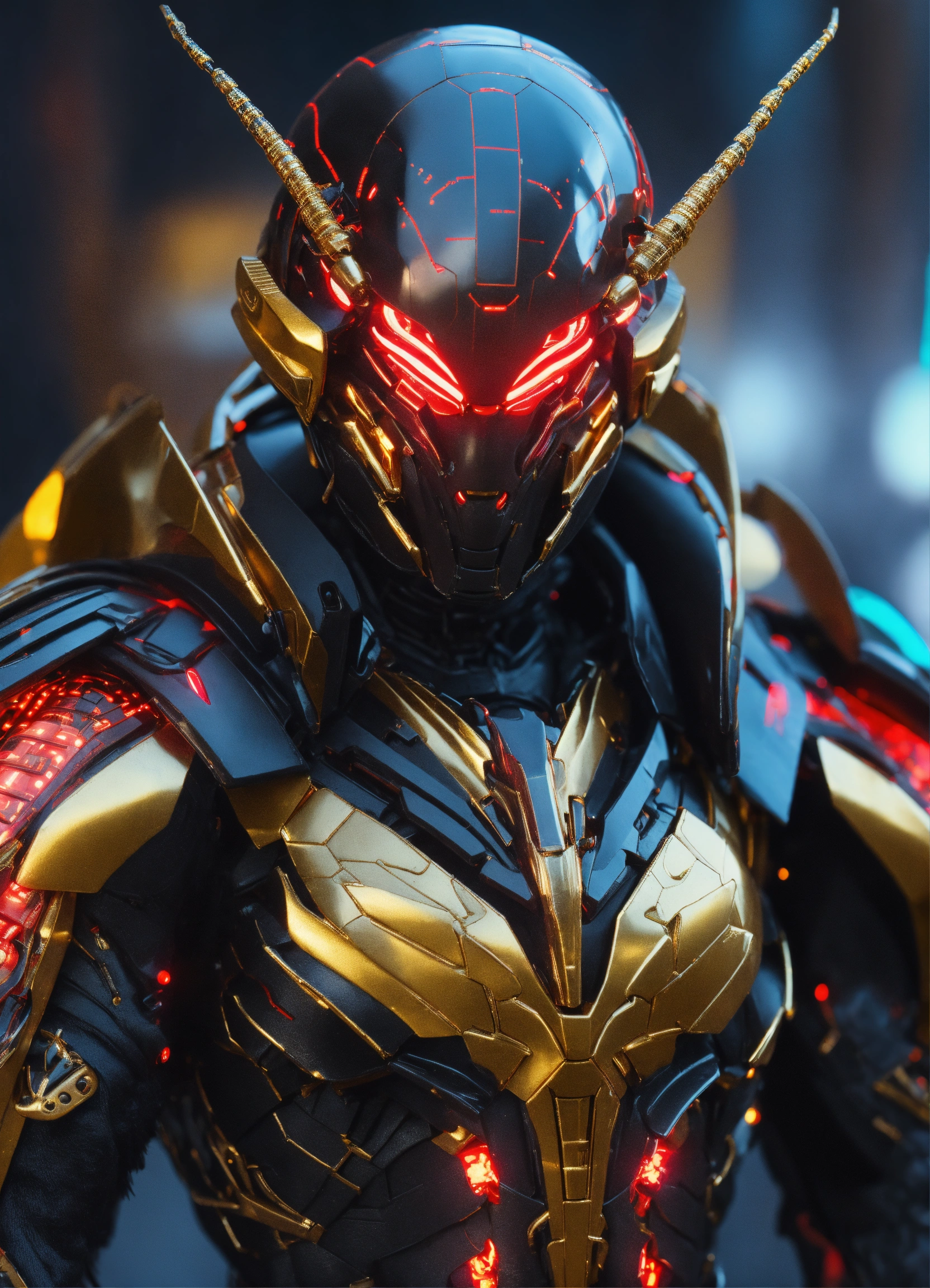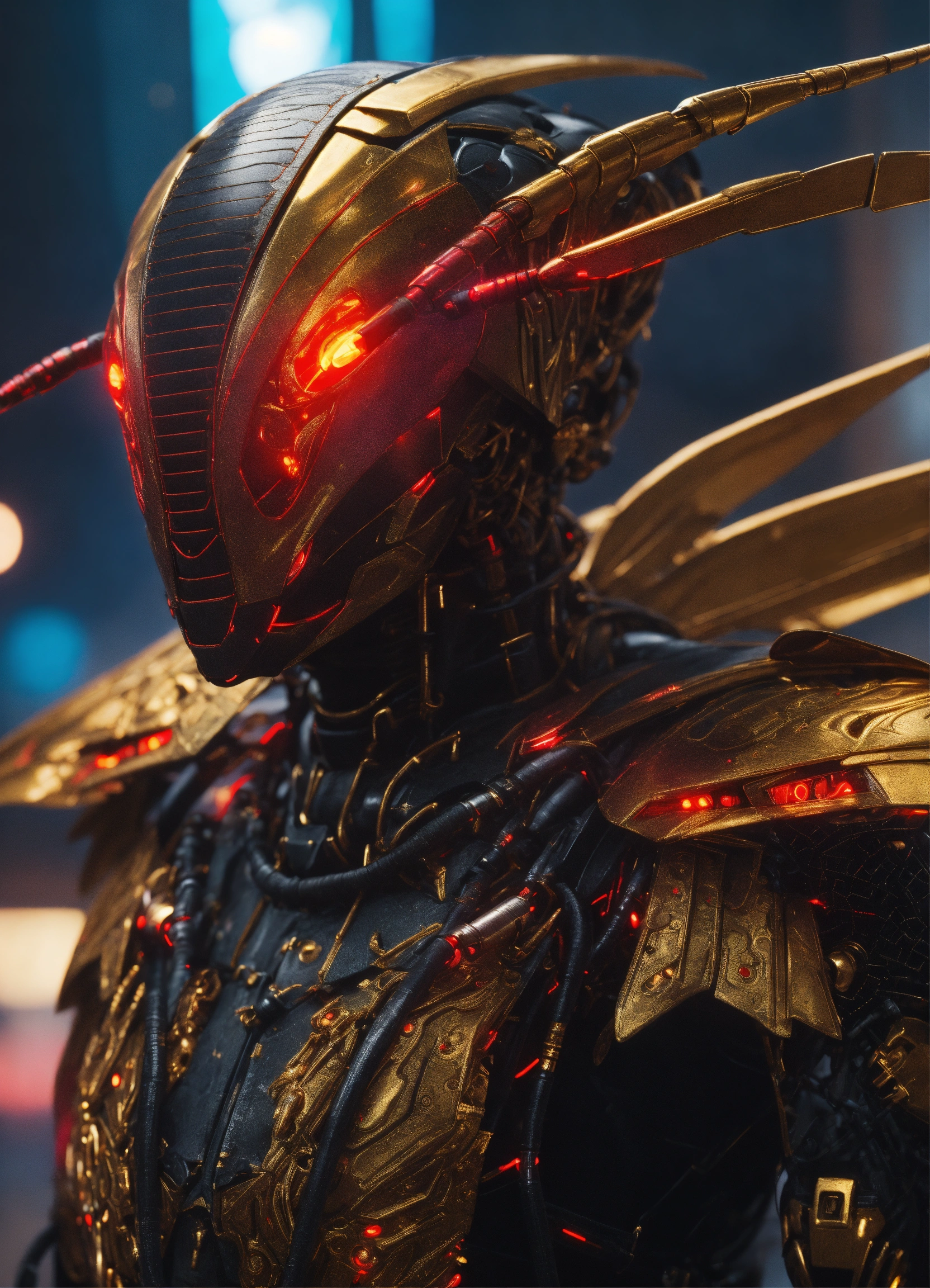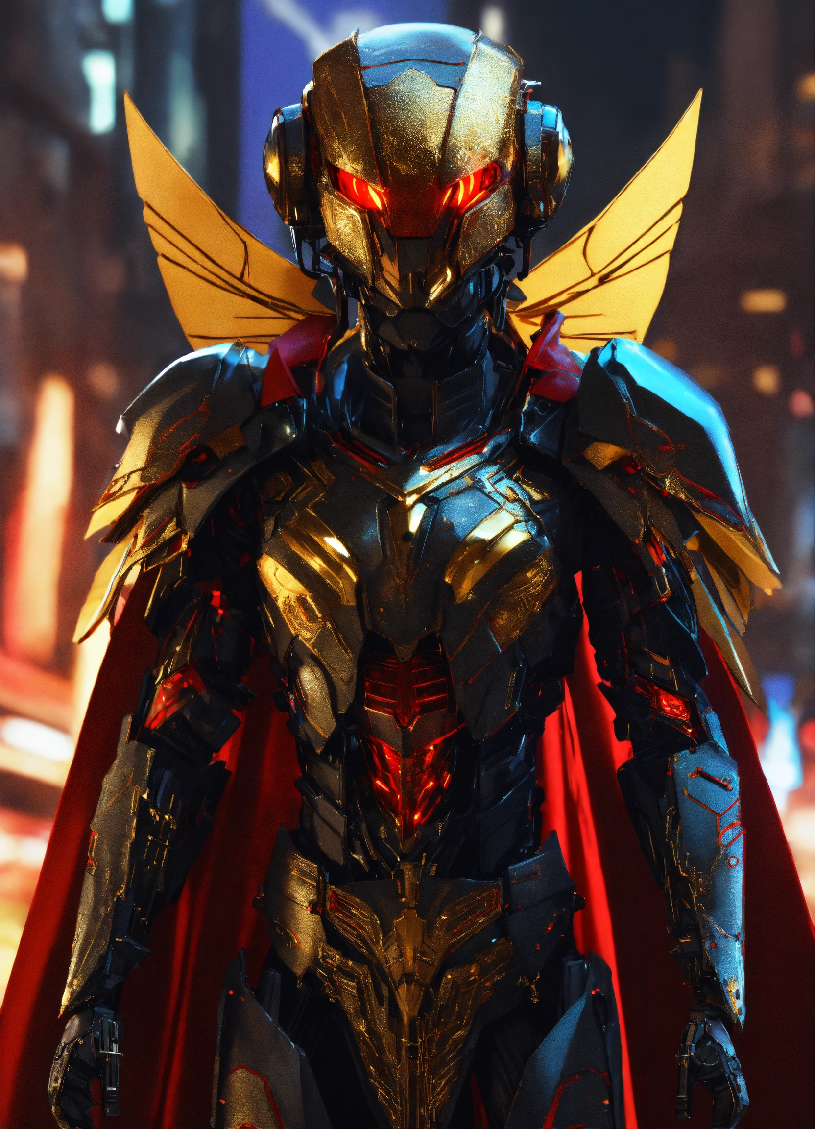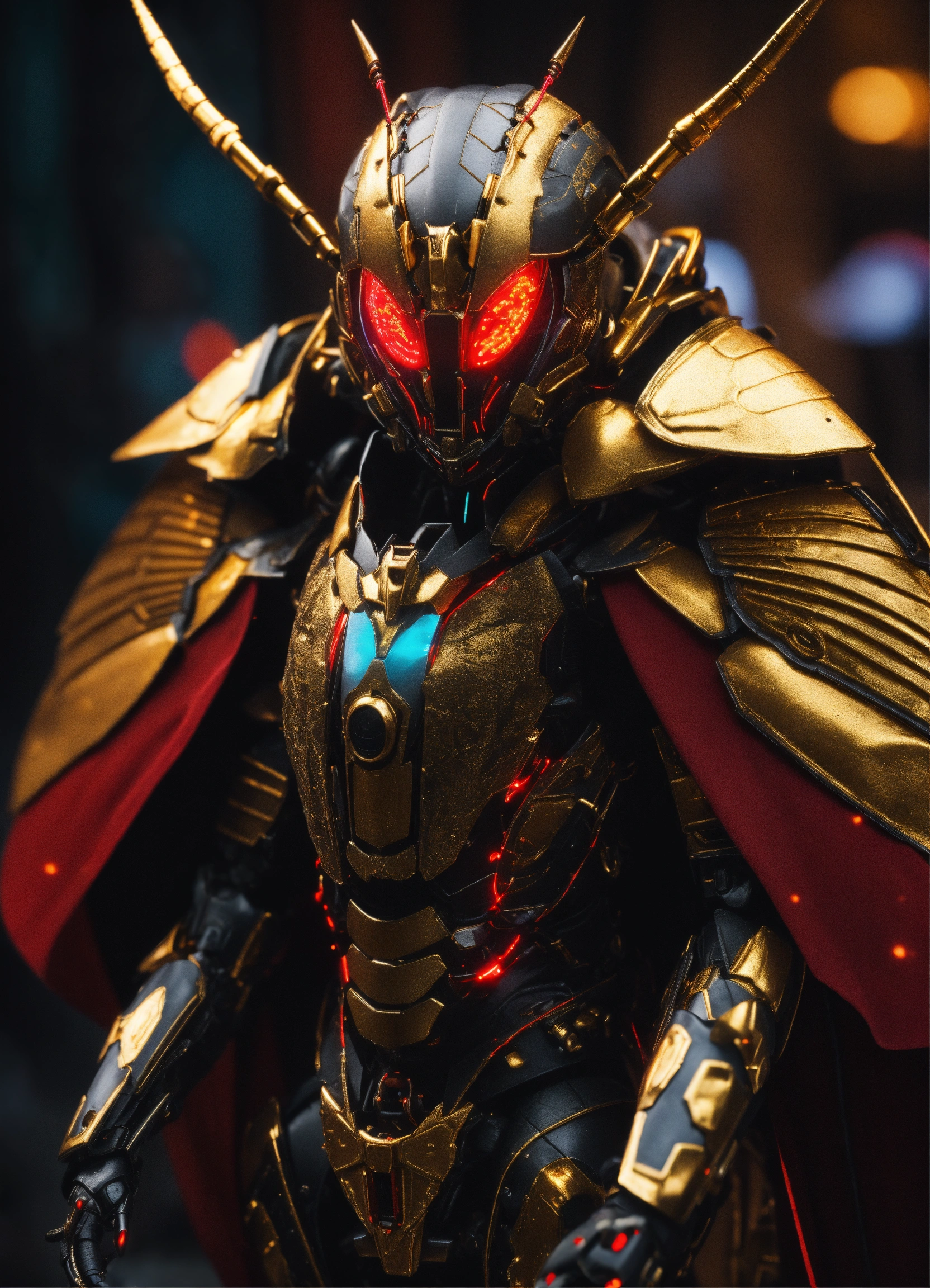 Close up of black cockroach faced humanoid with red glowing eyes, golden circuitry decor, and long draped down colorful cape like wings and hi-tech armored humanoid body, realistic, 8k