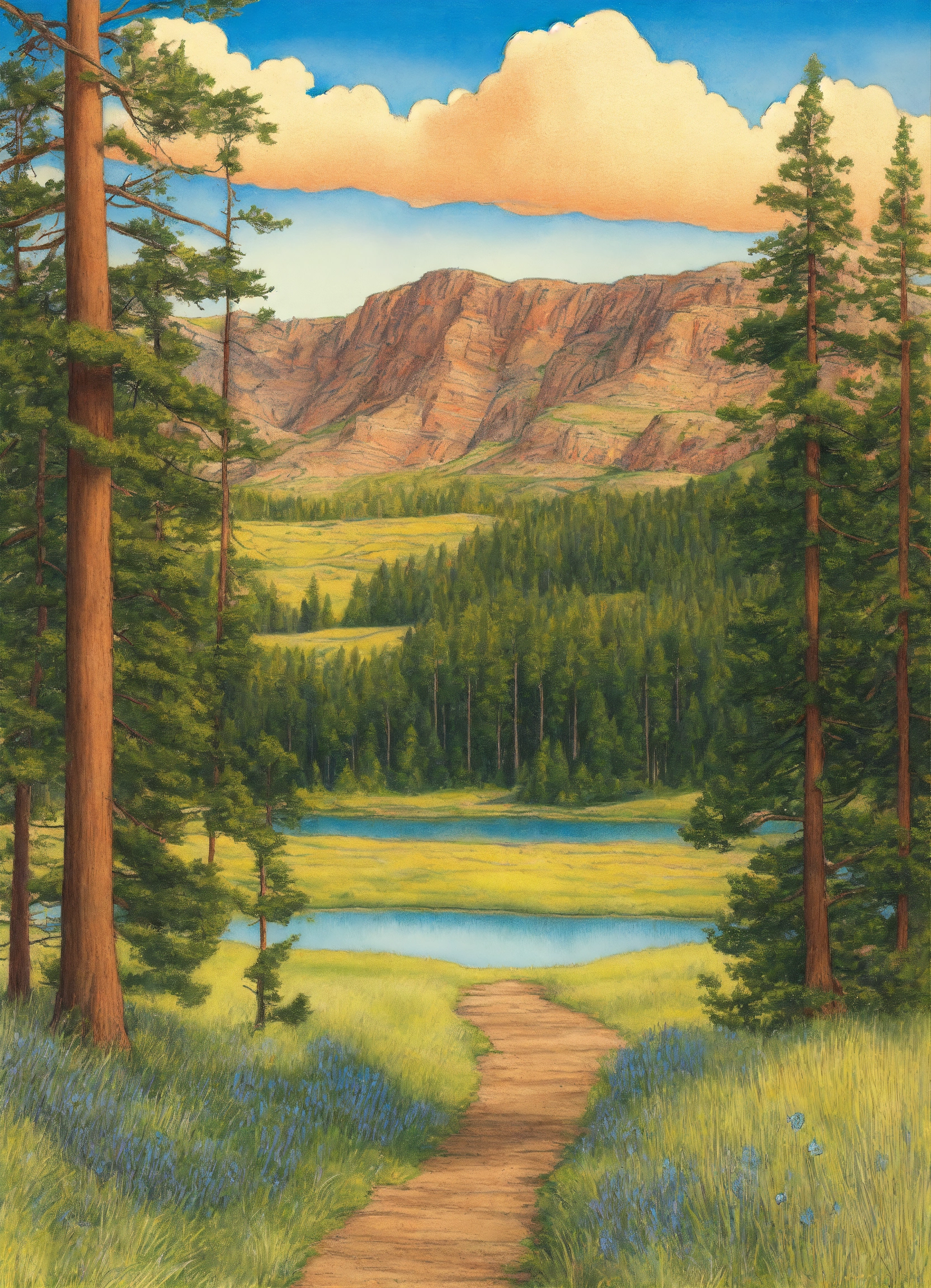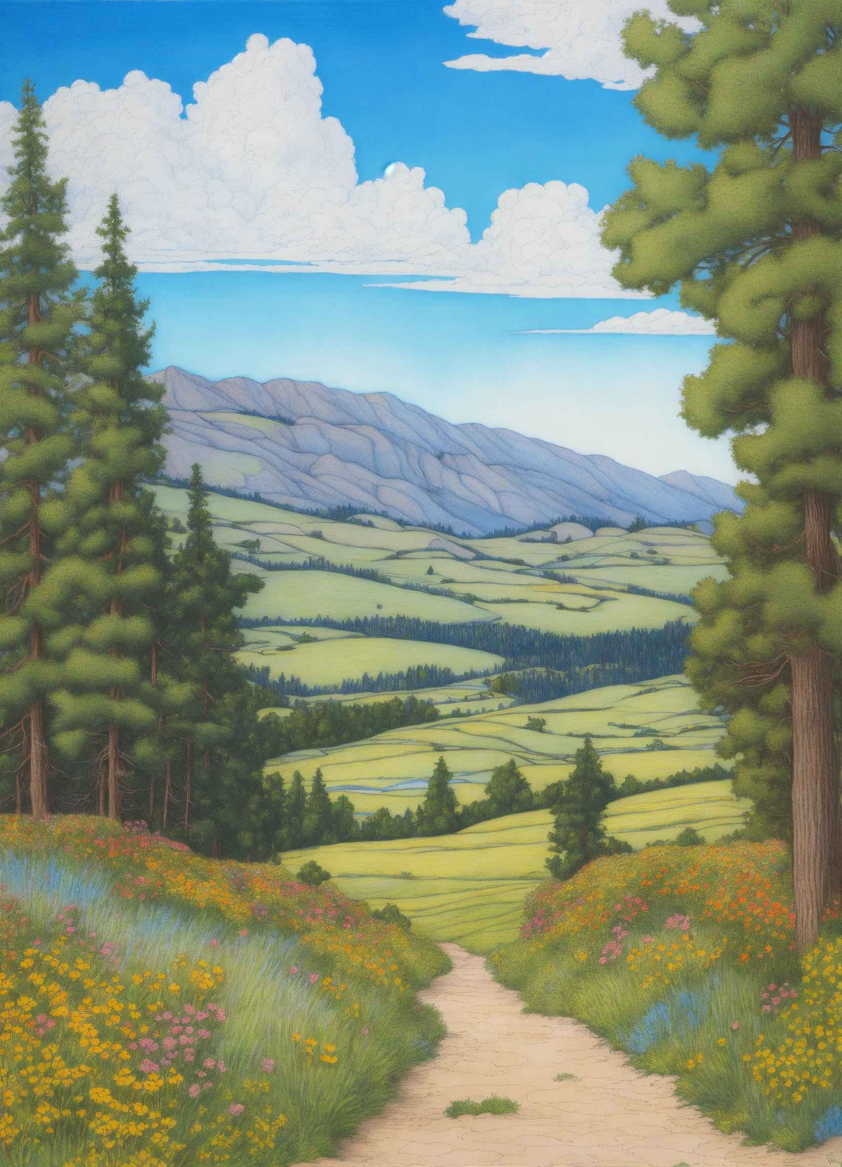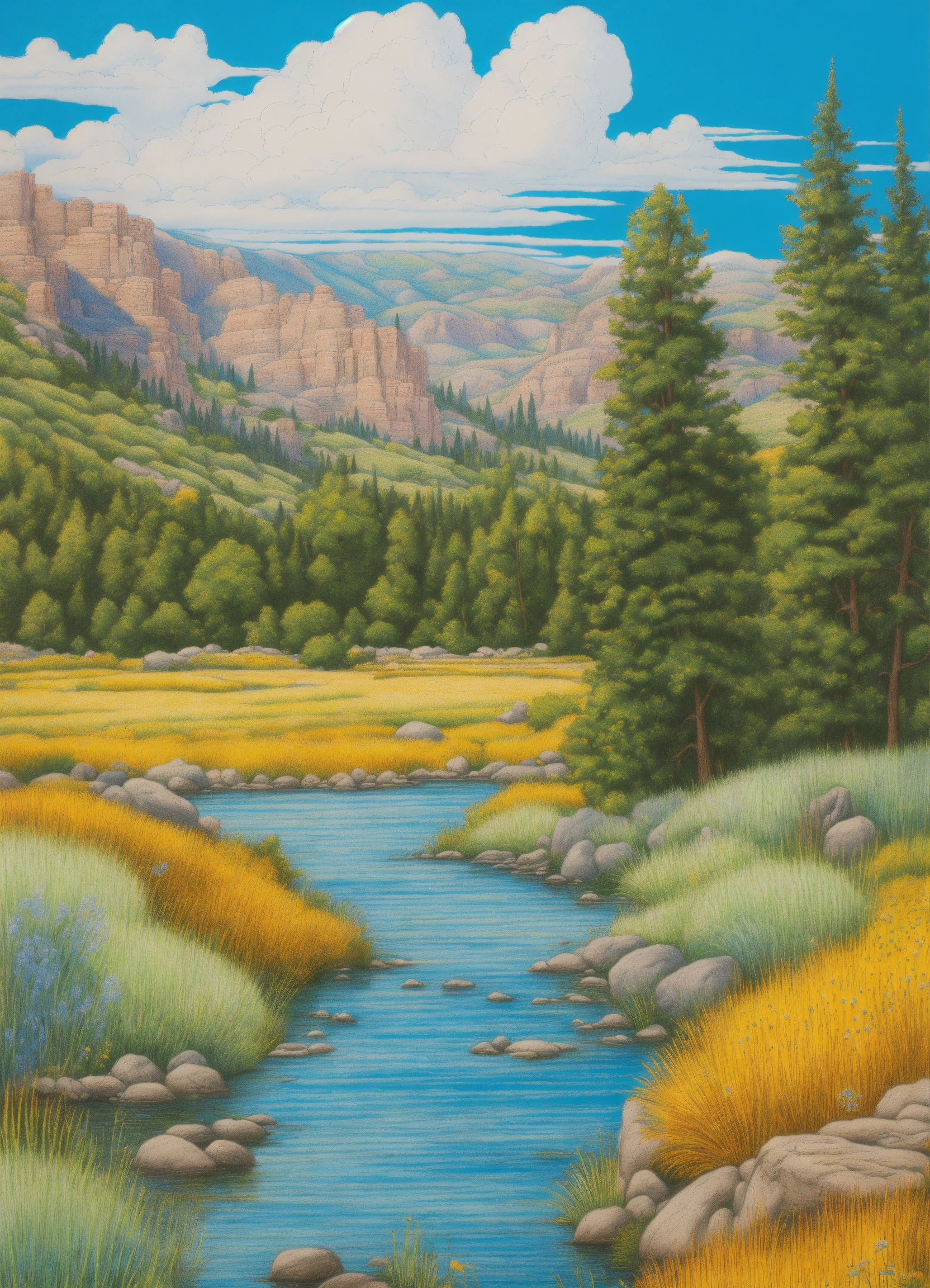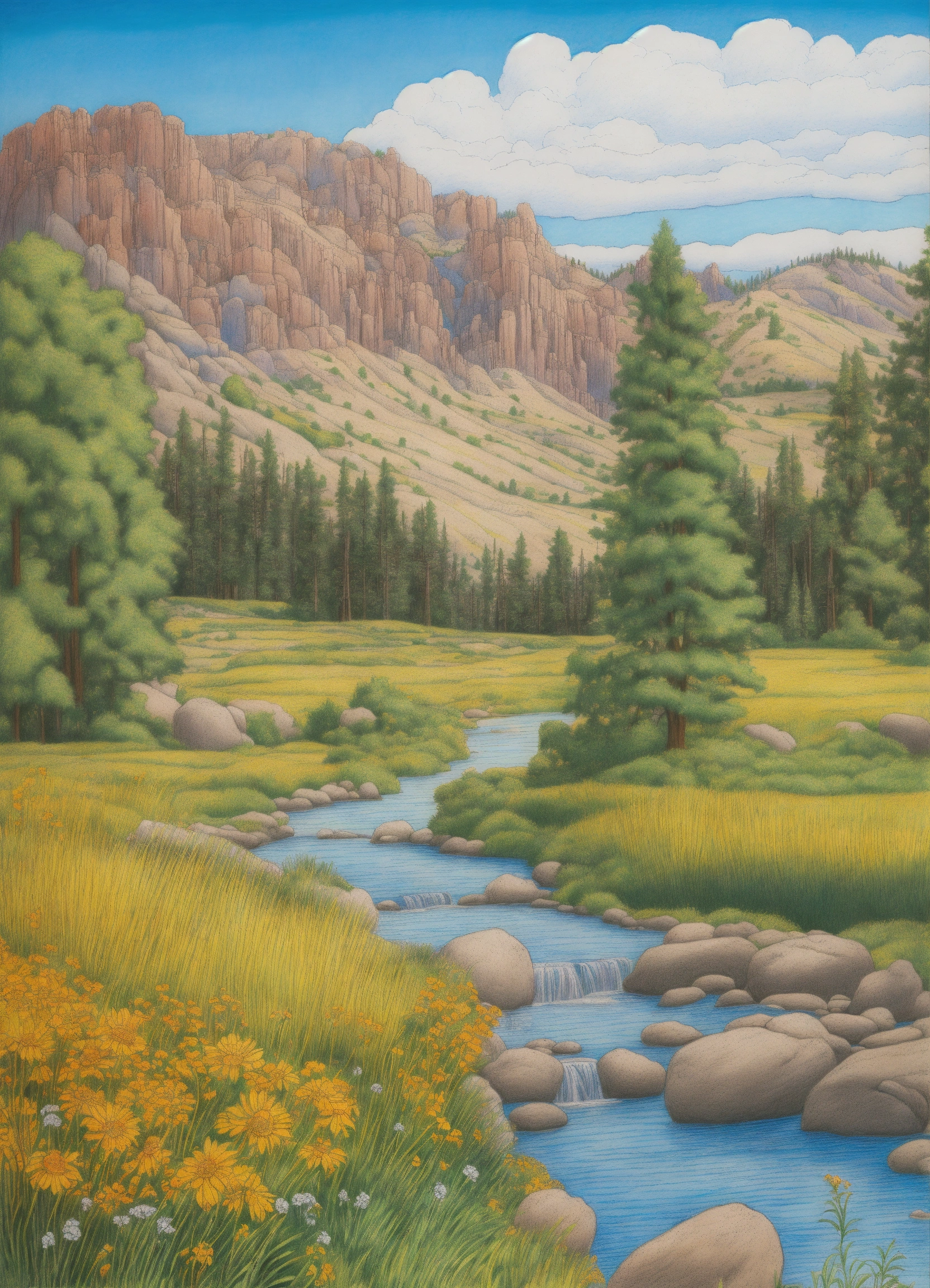 Drawing an idaho landscape in summer with blue sky. crystal clear, line drawing, clean clear lines, coloring book style, bright colors, intricate details, elegant, discreete, serene, magical, peaceful, fine detail, pastel pencils, winsor mccay style.