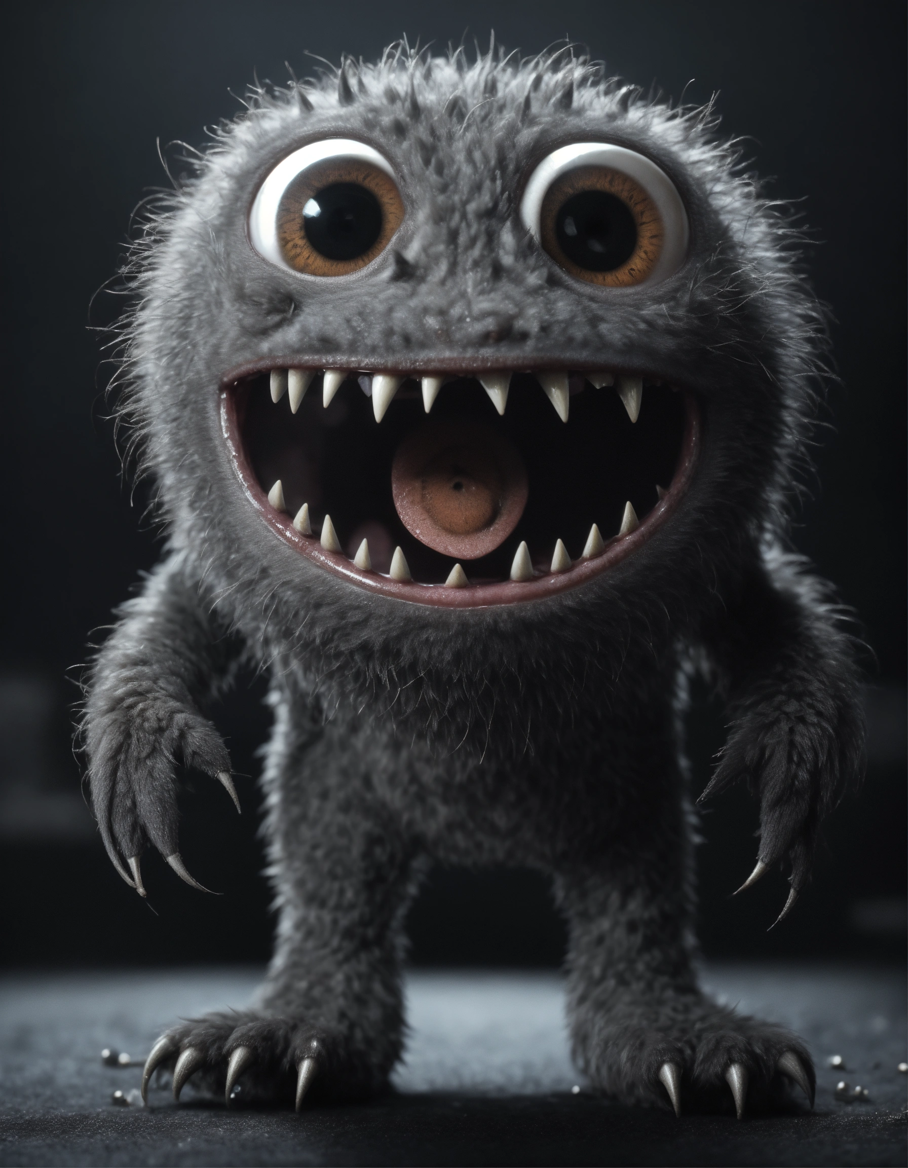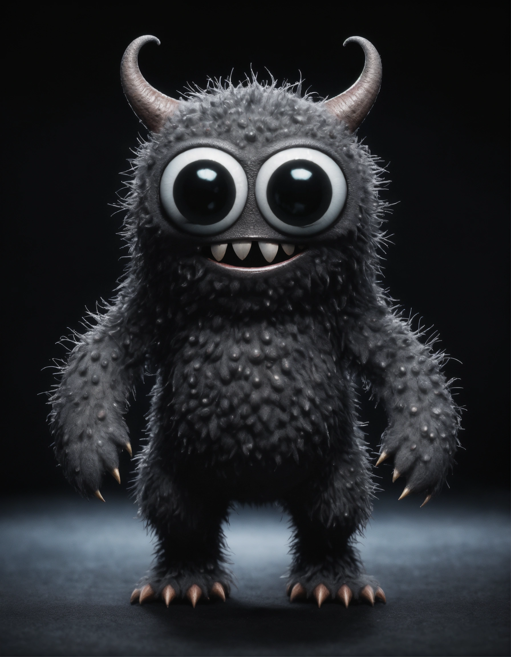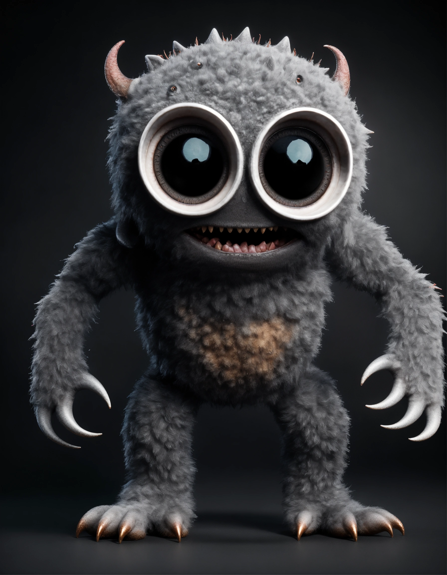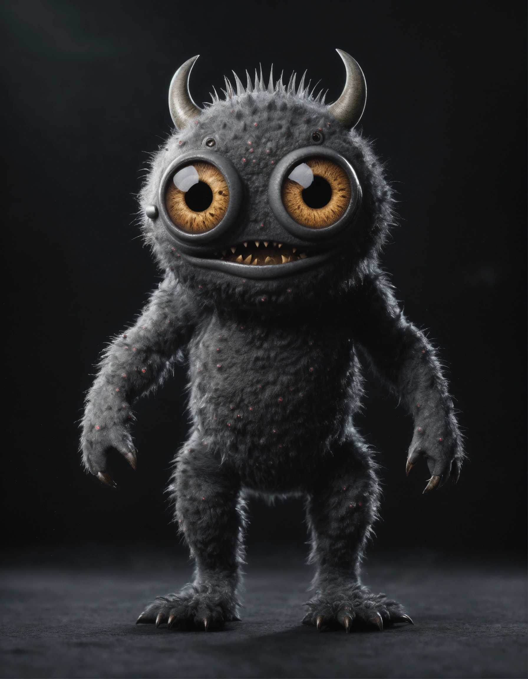 Very cute, realistic grey monster whit many eyes standing in background complete black, 4k render, hyper-realistic, full body image. solid black background, extremely detailed, realistic photo, 4k realistic photo, faded photo