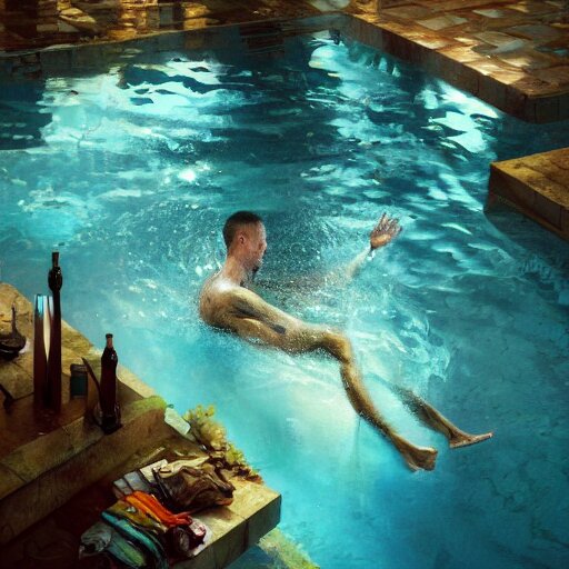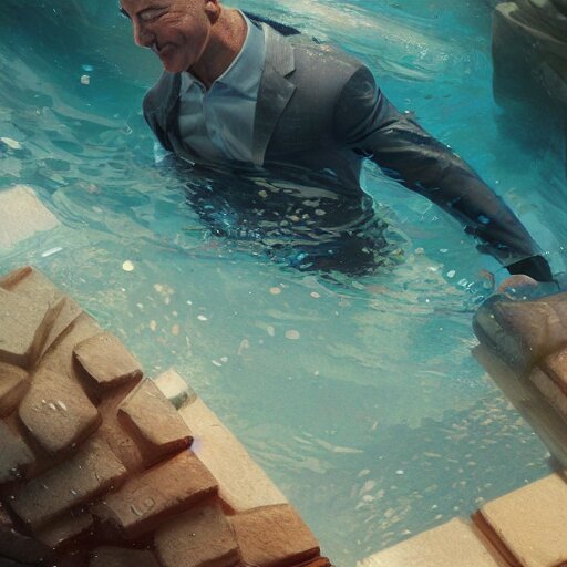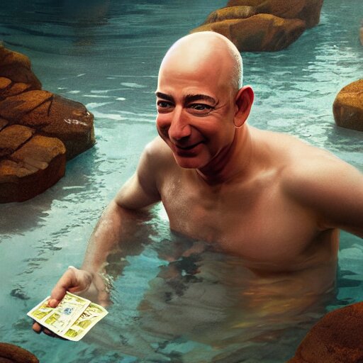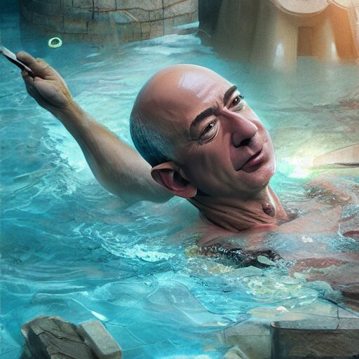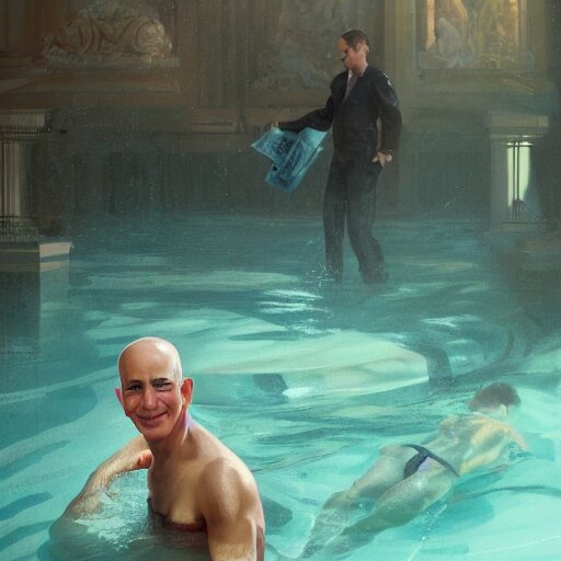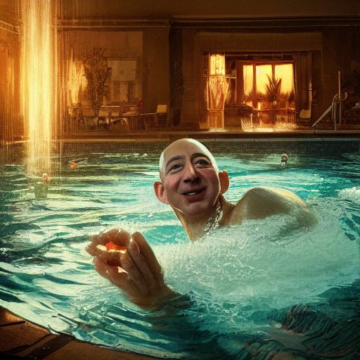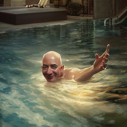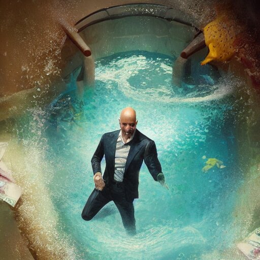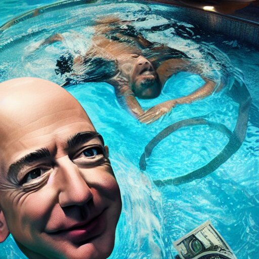 Jeff bezos swimming in a pool filled with cash, 4 k, photography, extremely detailed, digital art, trending on artstation, greg rutkowski, cinematic lighting, hyperrealistic