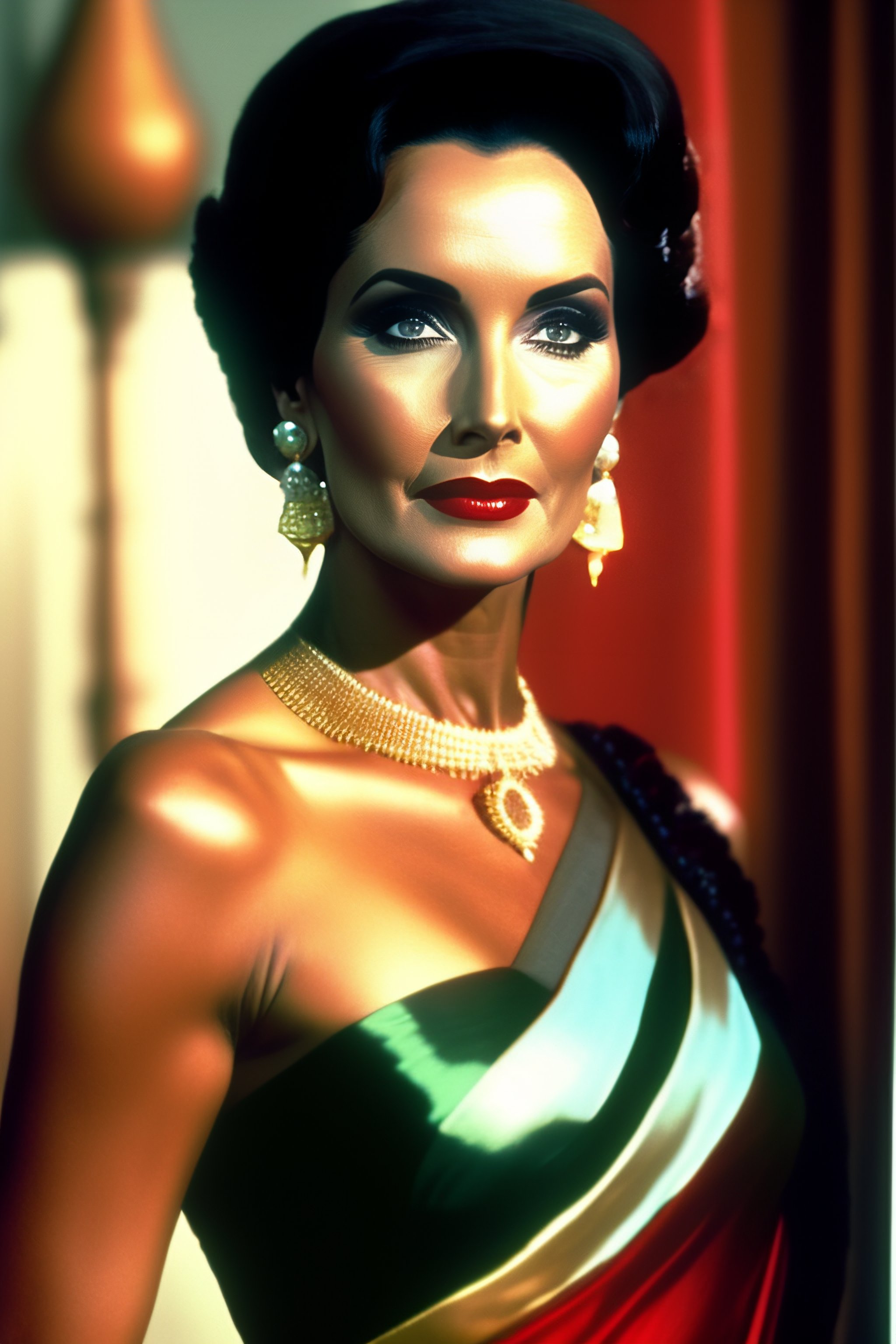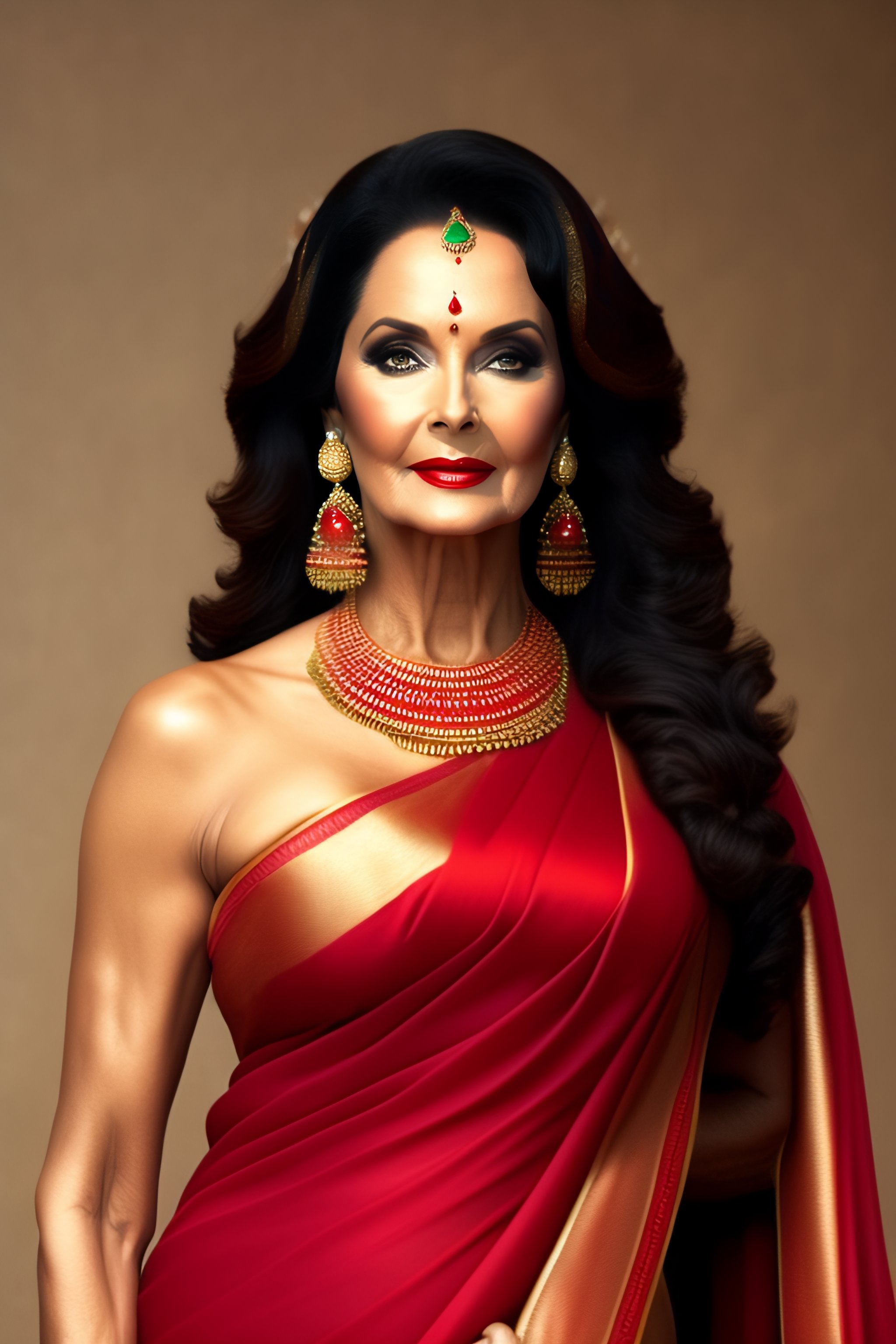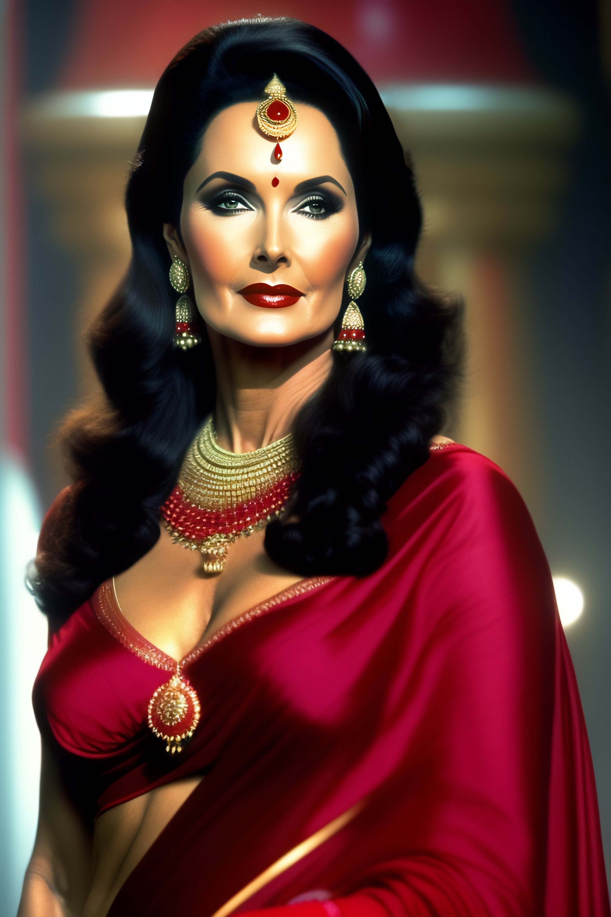 Lynda carter, wearing saree, navel and abs visible, very tall, hour glass waist, red lipstick, wearing jewellery, serious face