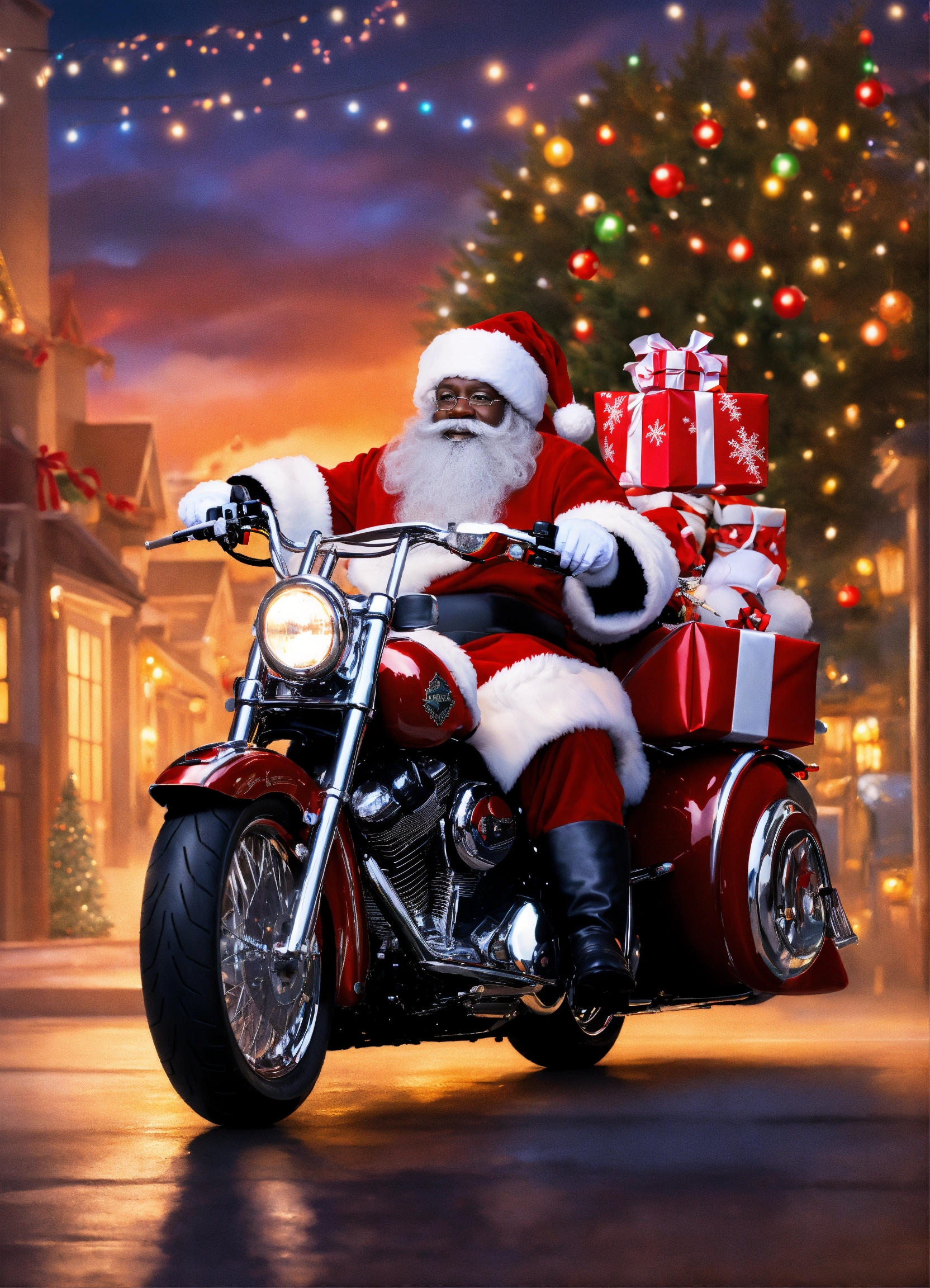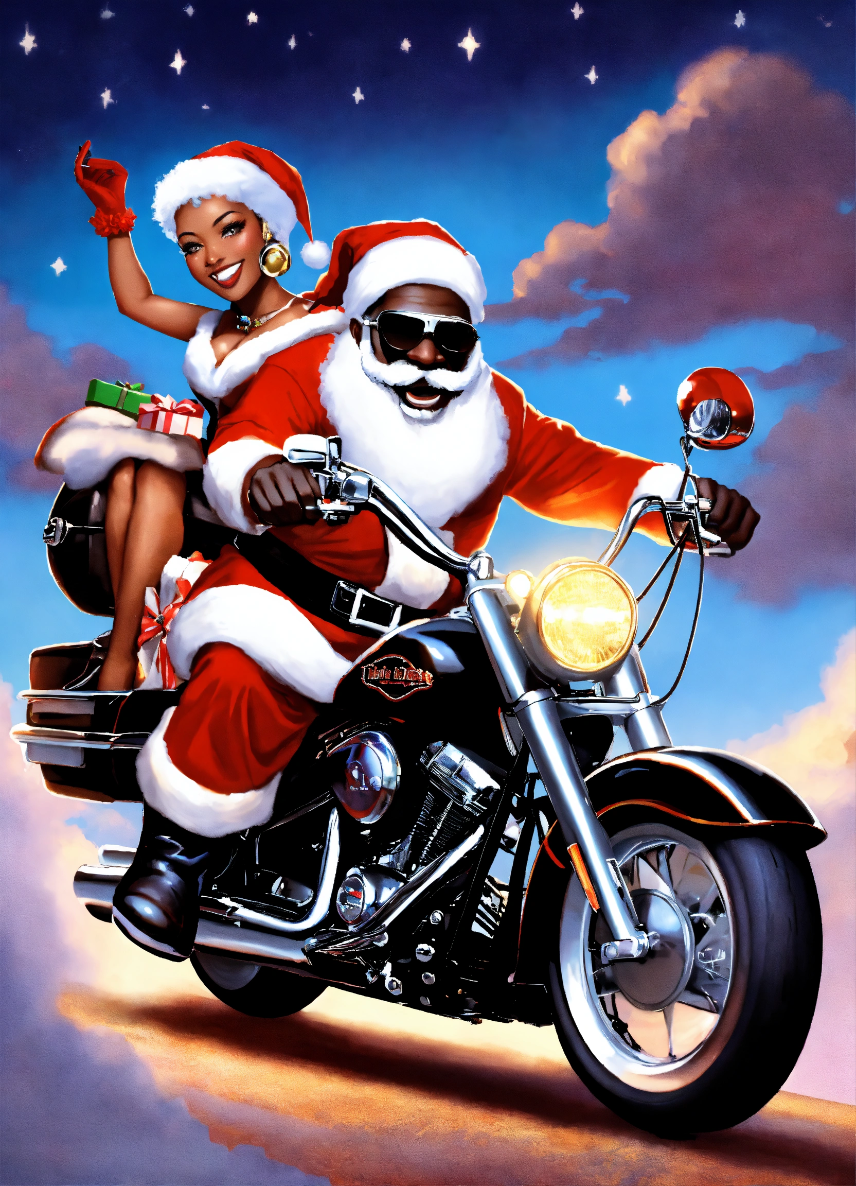 Black santa riding a harley davidson motorcycle with miss clause sitting on the back, lights on tire rims, presents on the back, santa waiving, clouds in background, disney