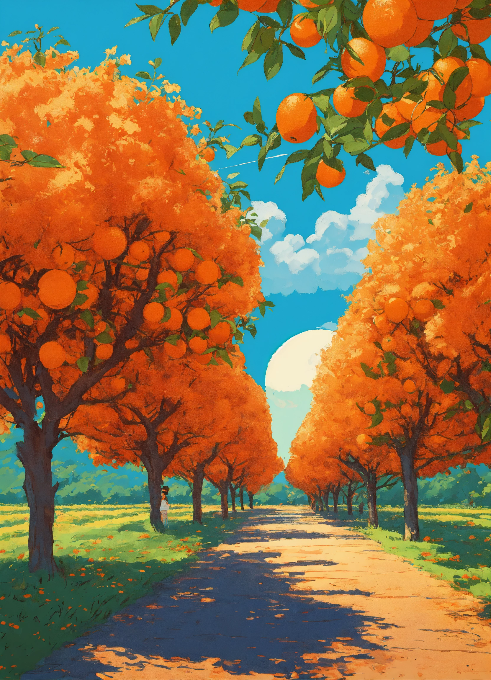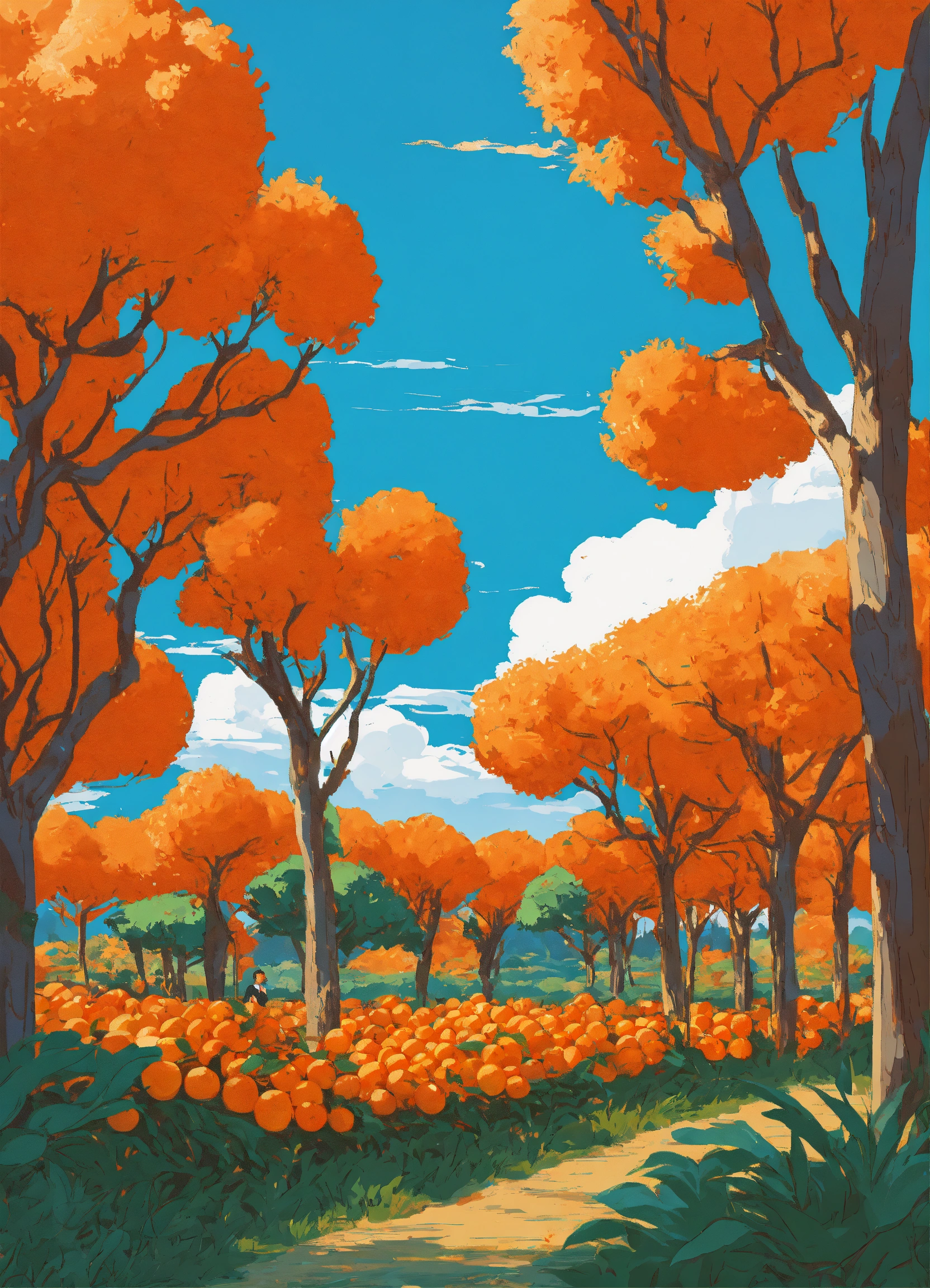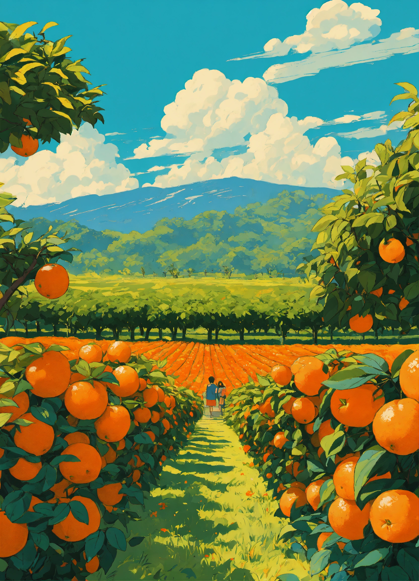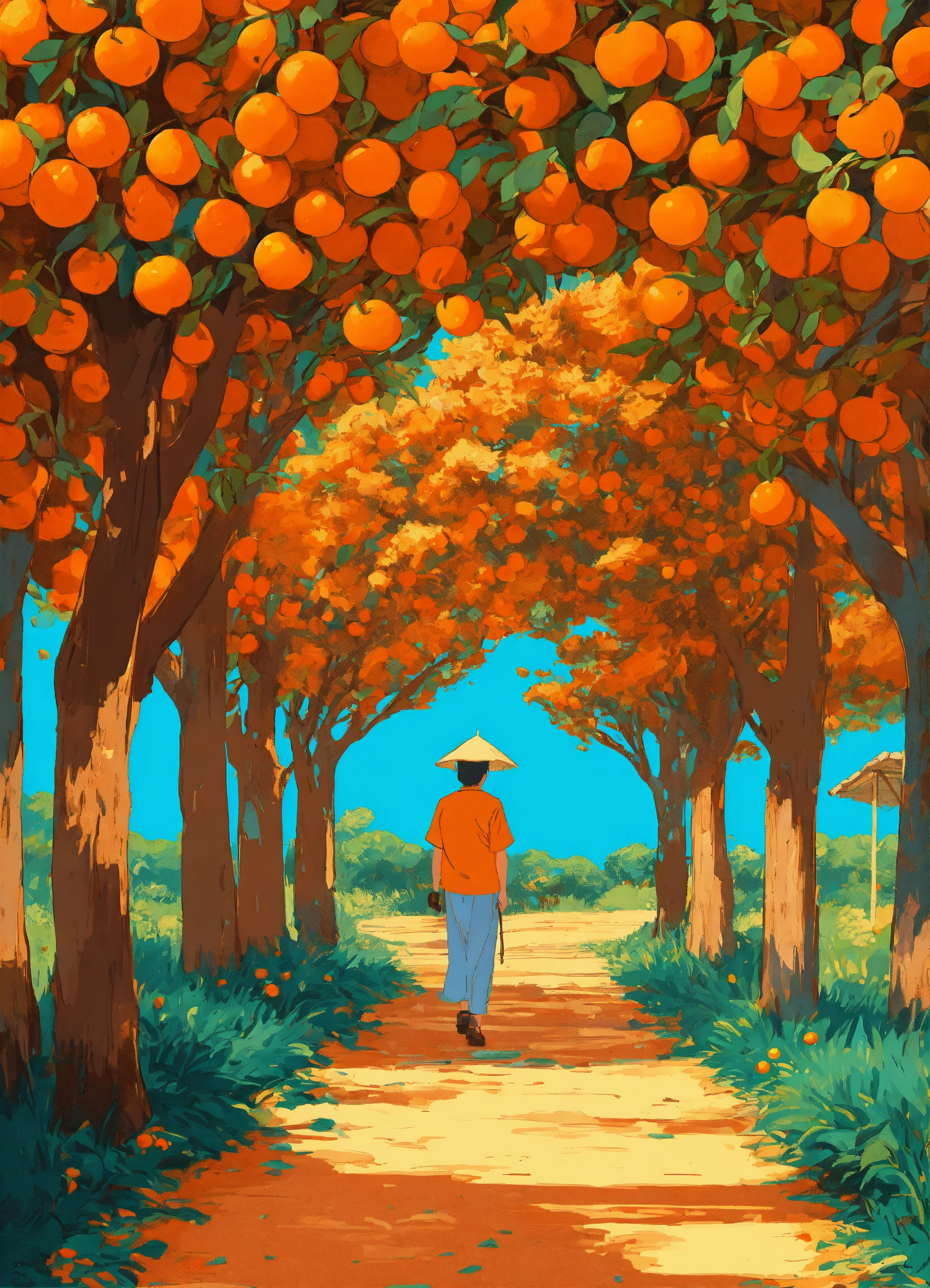 Studio ghibli, in an orange orchard in thailand, blue sky, orange garden dynamic, digital art, pop art, poster or flyer in trendy retro colors, vector illustration, comic art, 8k resolution trending on artstation, wood painting techniques.