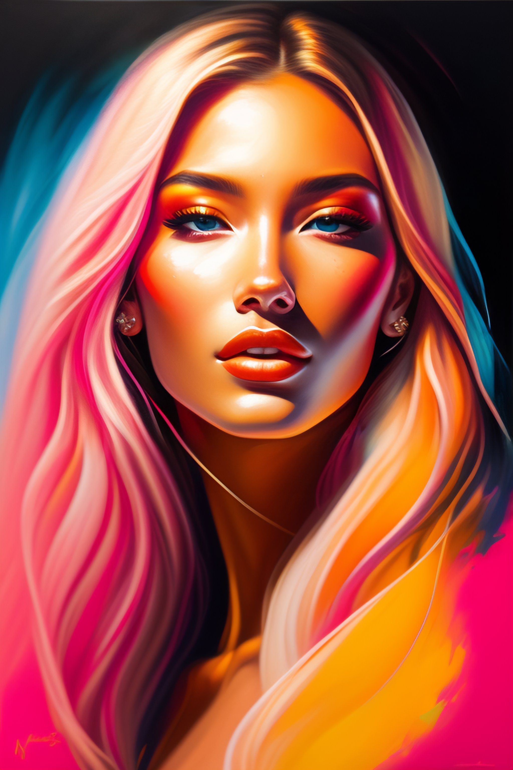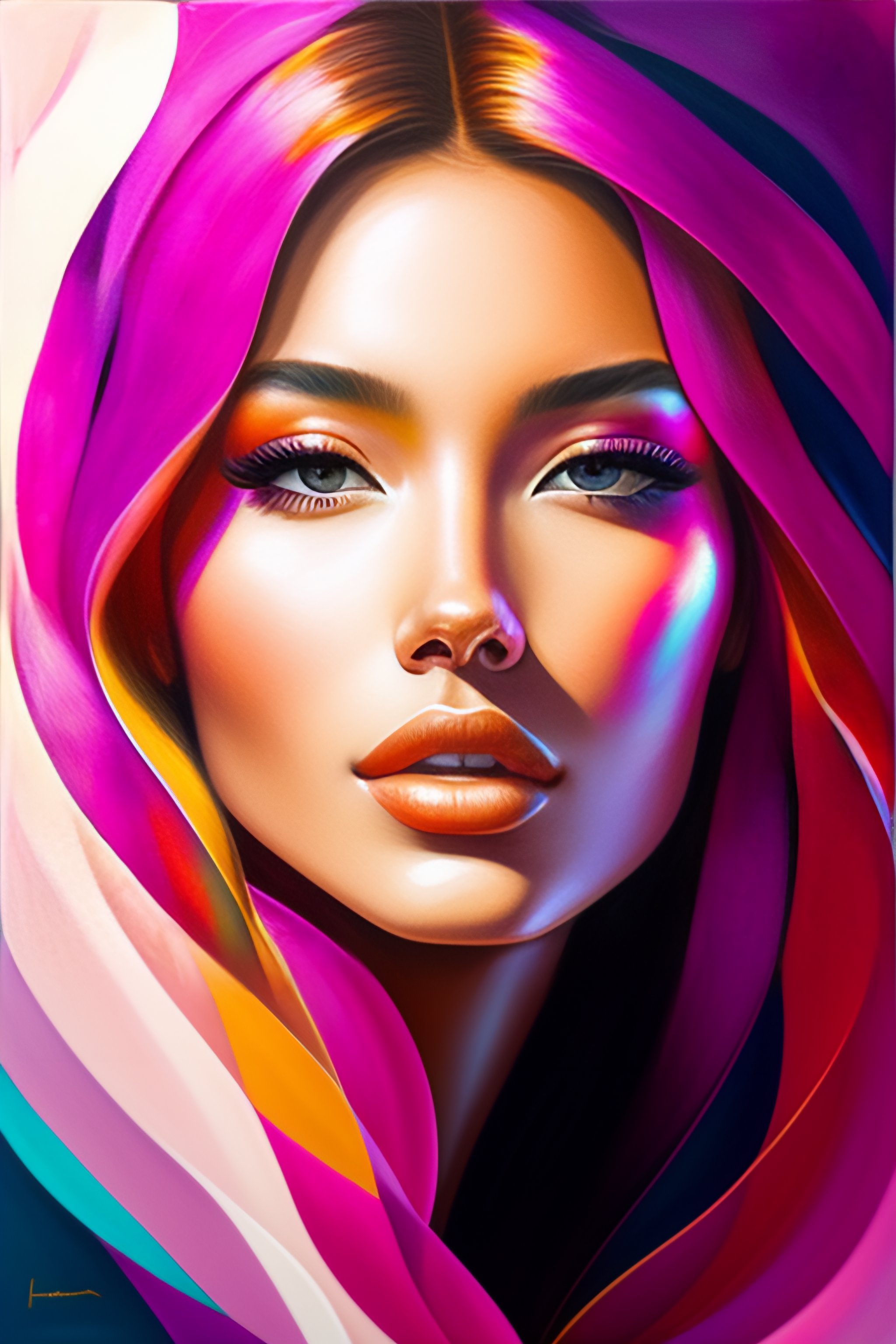 A painting of a beautiful female face, by michael flohr, pink and gold color palette, colourful, large paint brush, expressive feminine face, high quality, triangle shards, 8k stunning artwork, award-winning artwork, steve zheng, caravagio, young female face