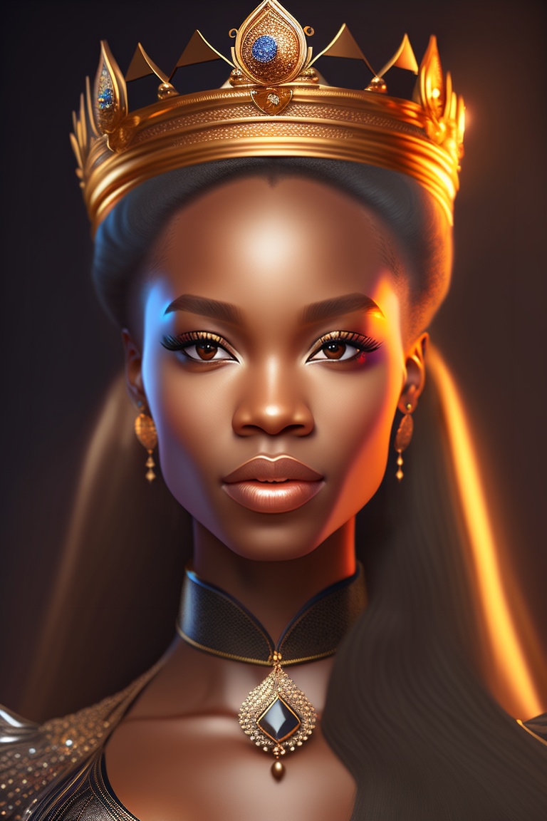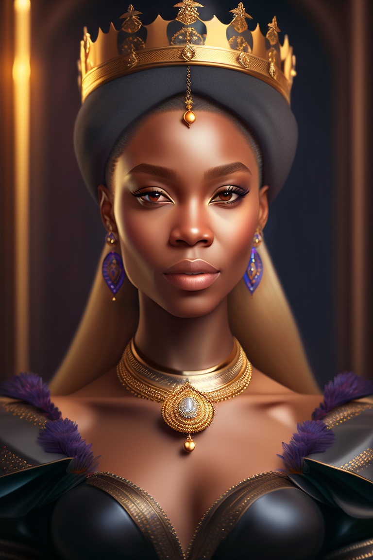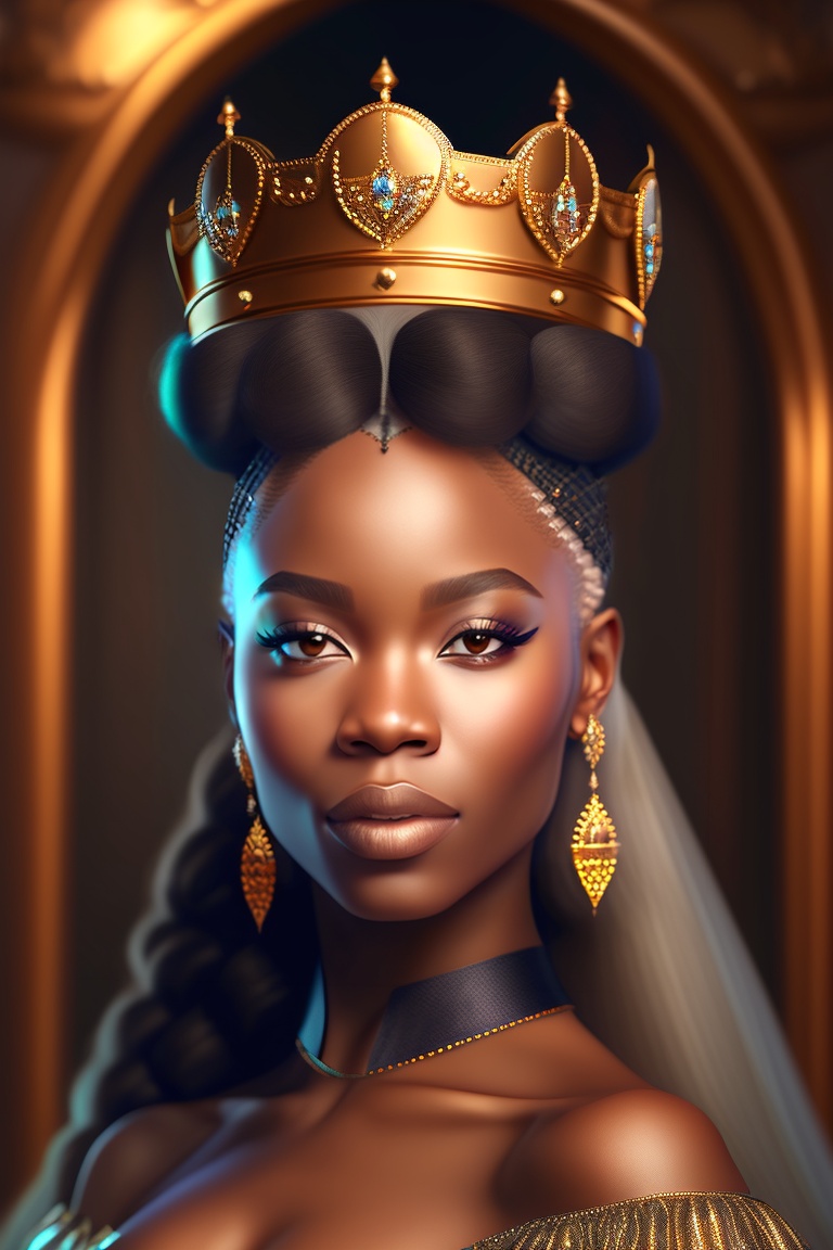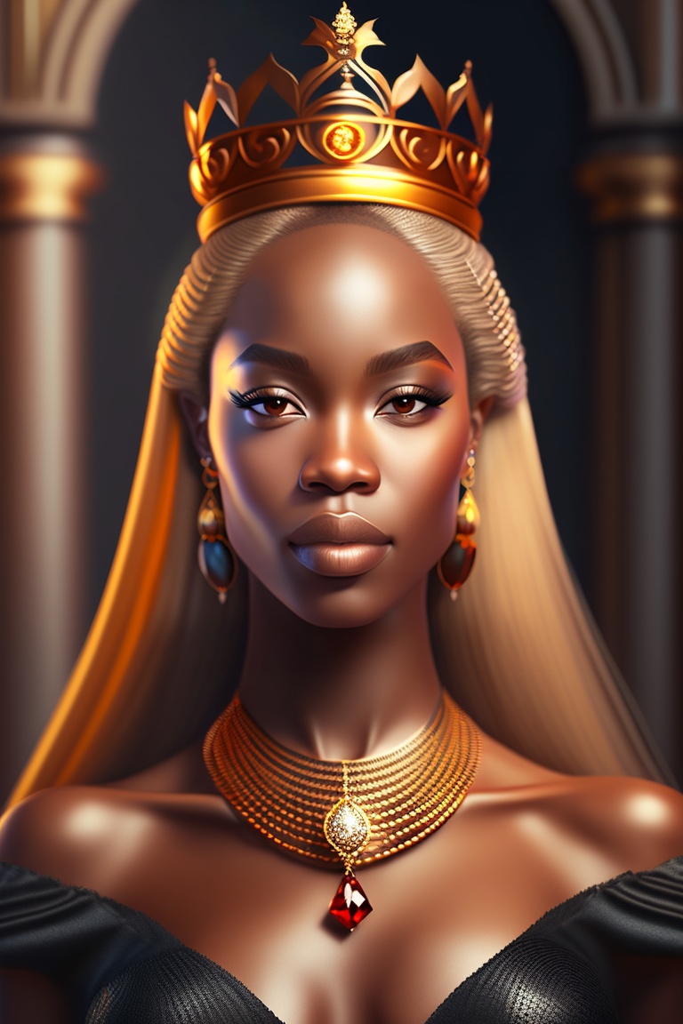 Photorealistic photo, light-skinned african american woman portrait of fantasy medieval woman princess in dark gothic room. woman queen looking at camera, beauty face. vintage trendy glamour dress golden luxury crown, long loose blonde hair. fashion model. highly detailed, digital art, sharp focus, trending on art station, 8k