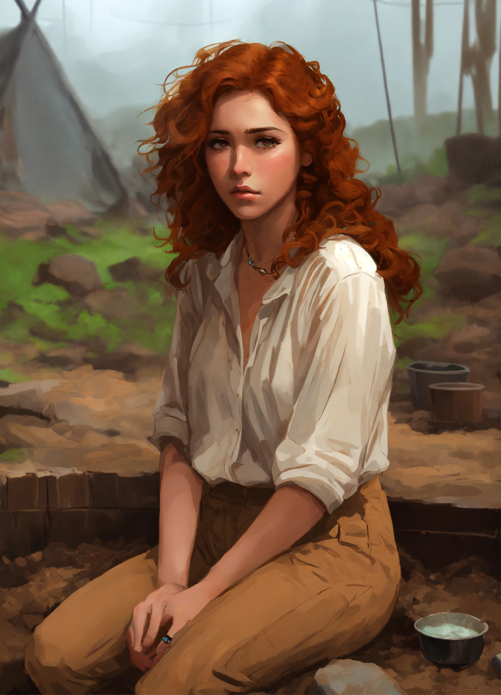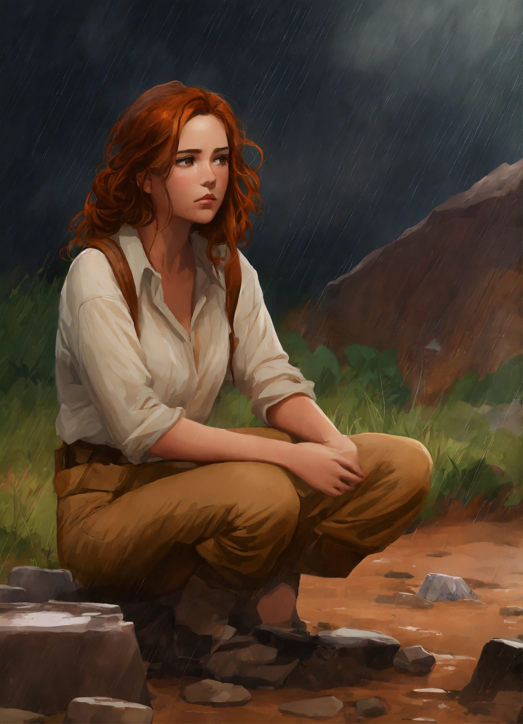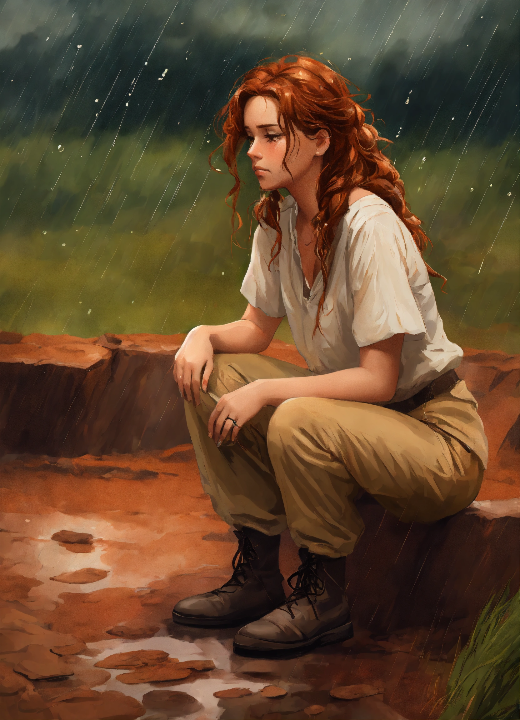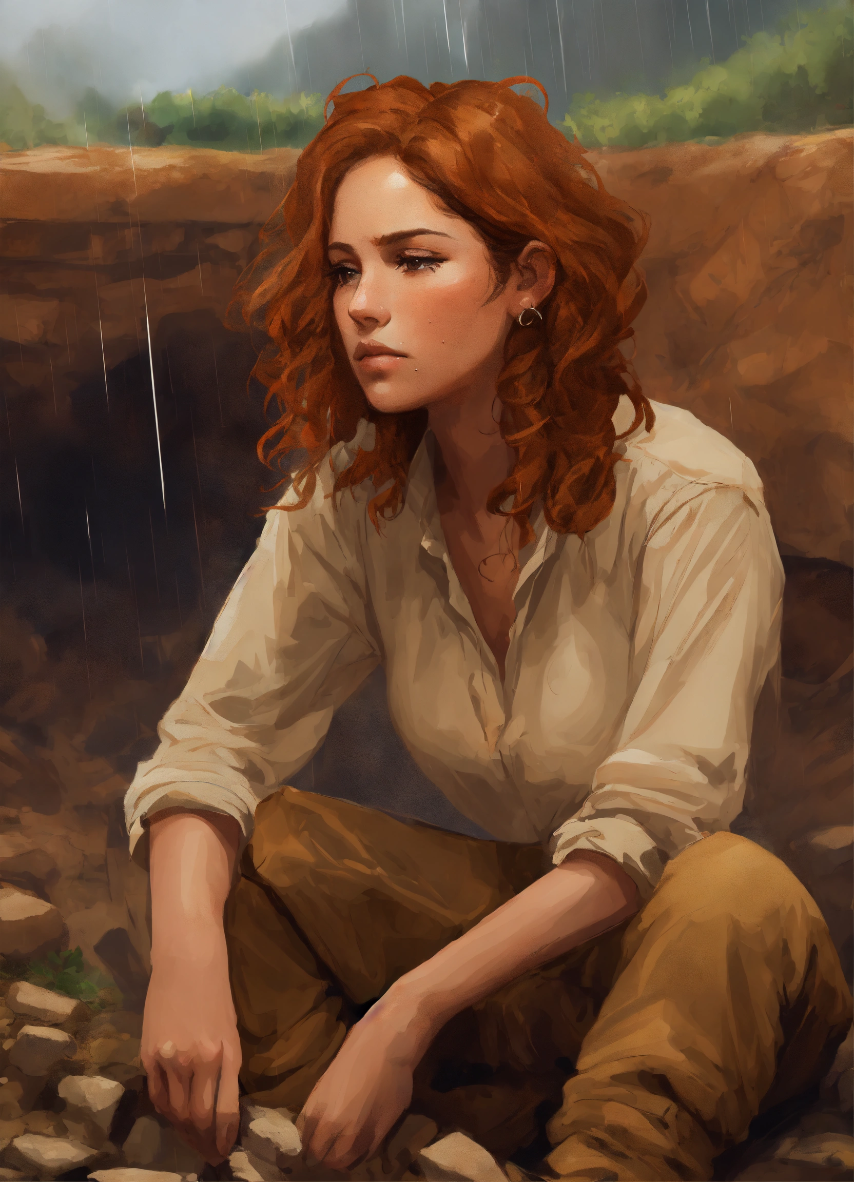Digital art painting of a sad woman with ringlet copper hair, wearing a loose cream shirt and tan pants. she is at an archaeological dig site in the rain.