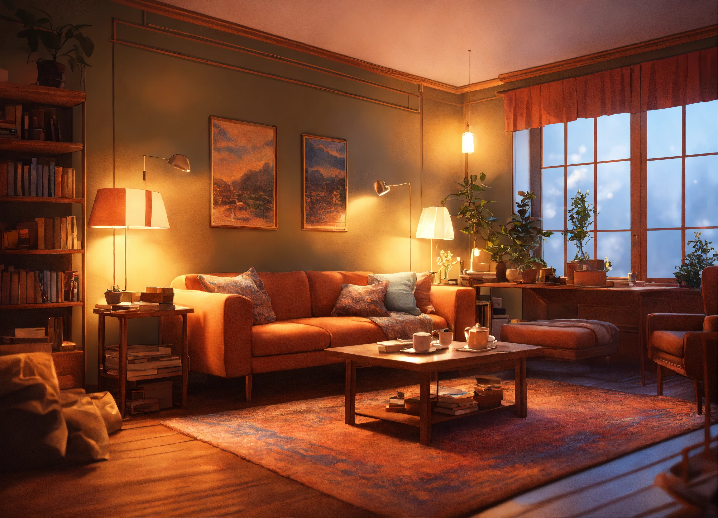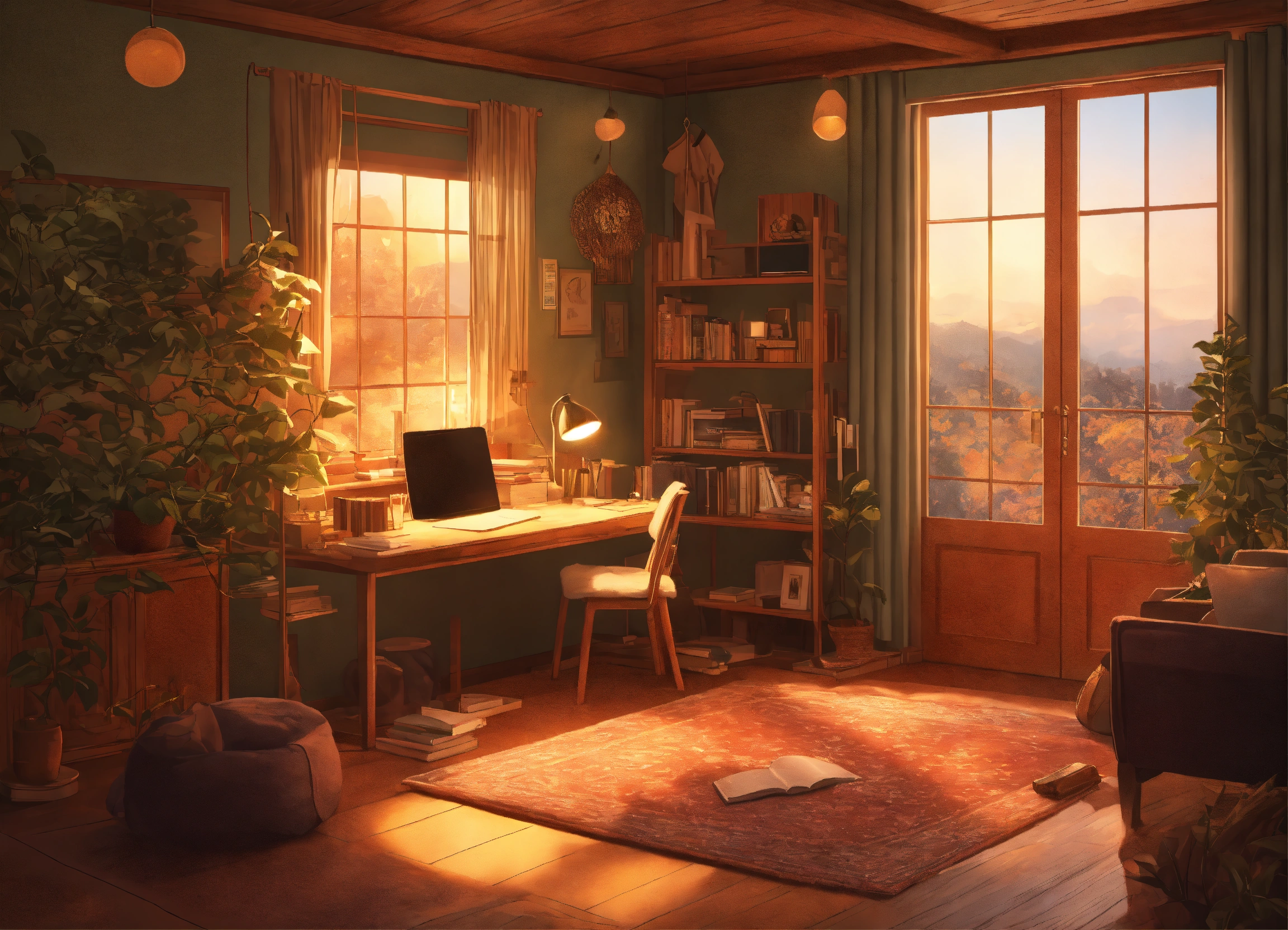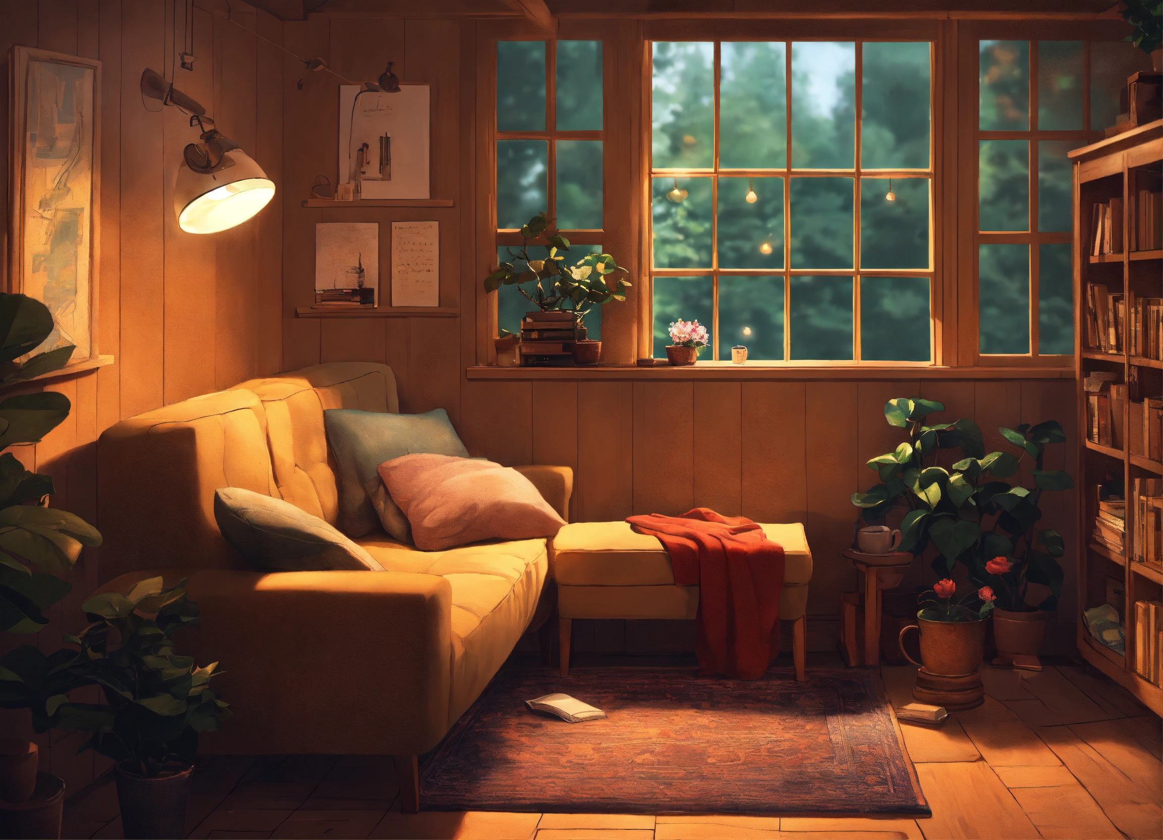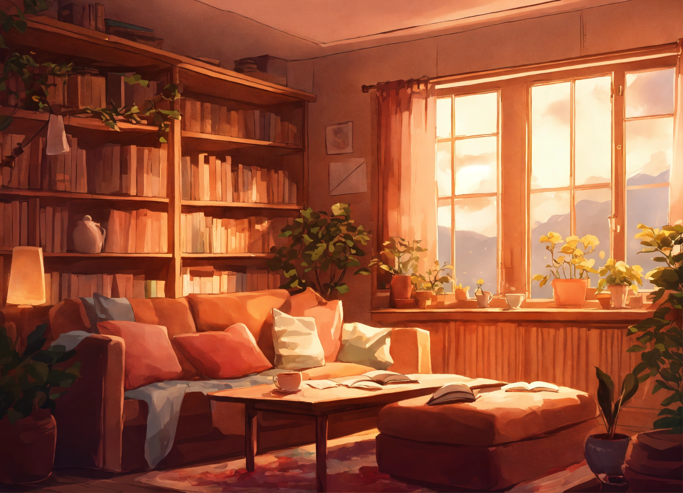 Generate an inviting and cozy room setting that is perfect for a lofi music video aimed at enhancing the studying experience. the scene should feature a softly lit, warm, and comfortable space with elements such as soft blankets, comfortable seating, open books, gentle lighting, and perhaps a steaming cup of tea or coffee. the ambiance should evoke feelings of focus, relaxation, and contentment. the image should be visually pleasing and create an atmosphere that is both motivating and calming for students and learners. it should capture the ideal cozy study environment for viewers of a lofi music video.