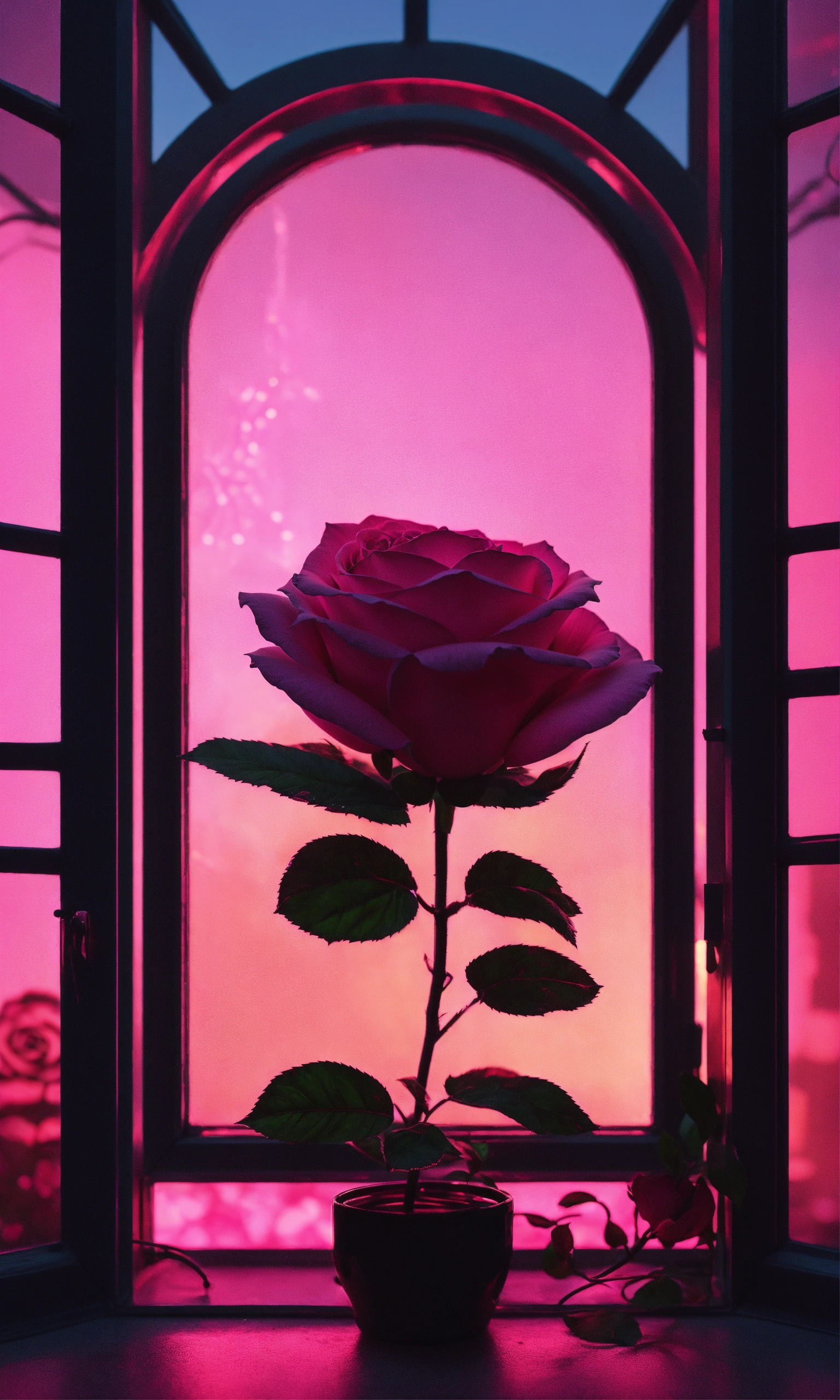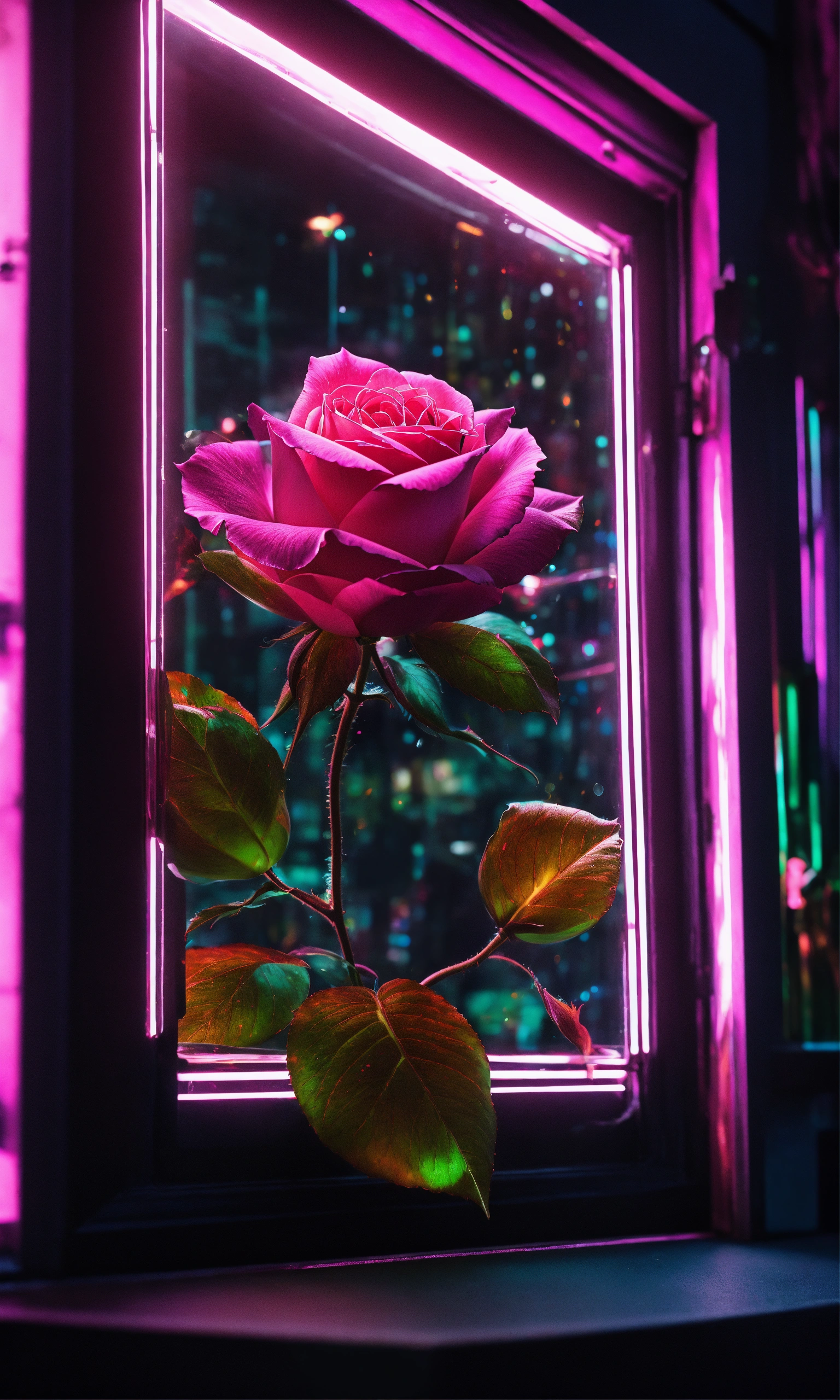 Window realist, glass realist, flower rose, curve, cyberpunk, 8k, realist metal, fundo black, realist neon, botao de rosa, fundo alpha
