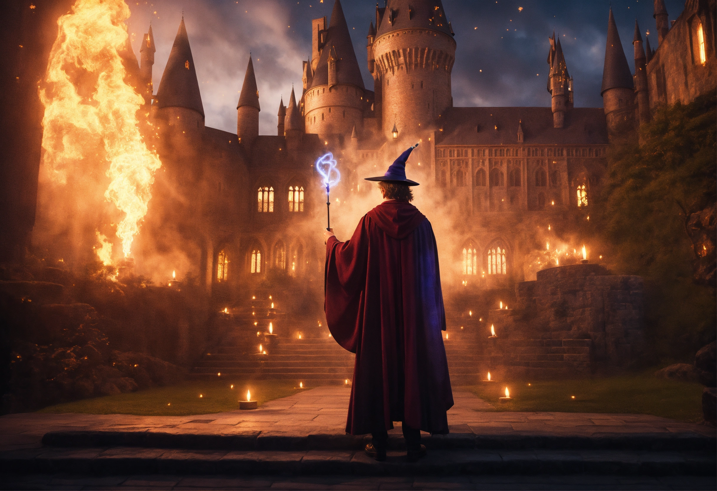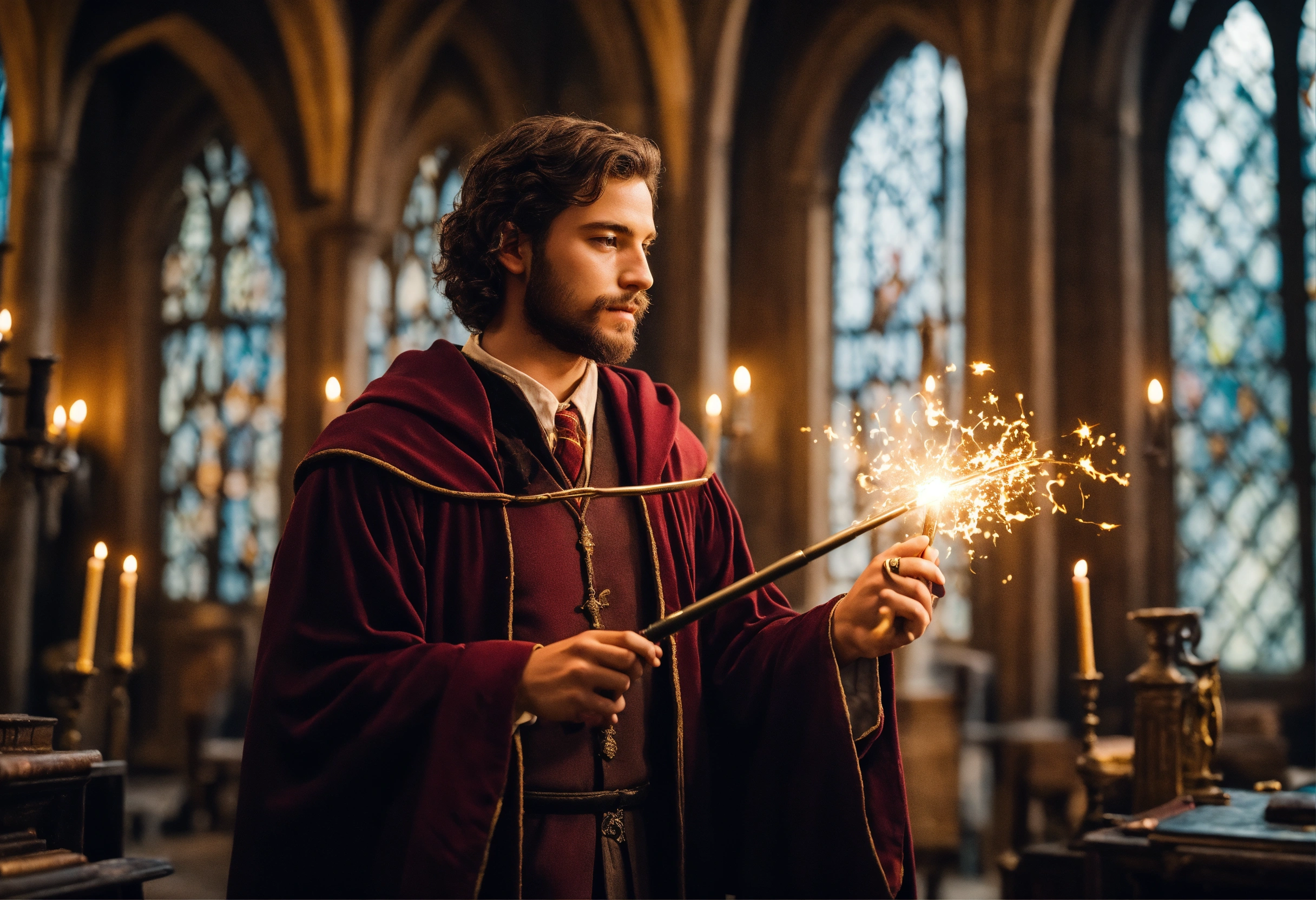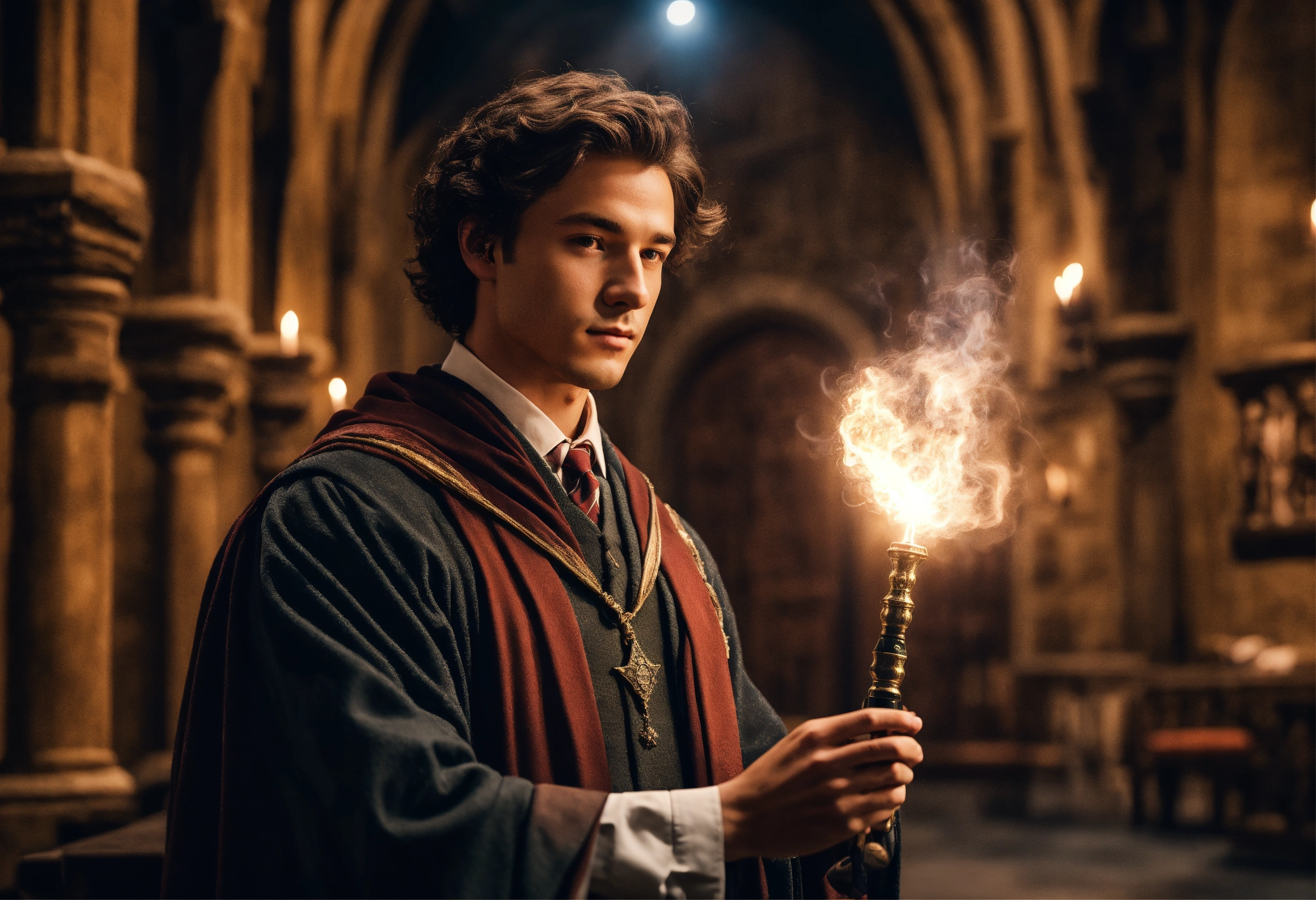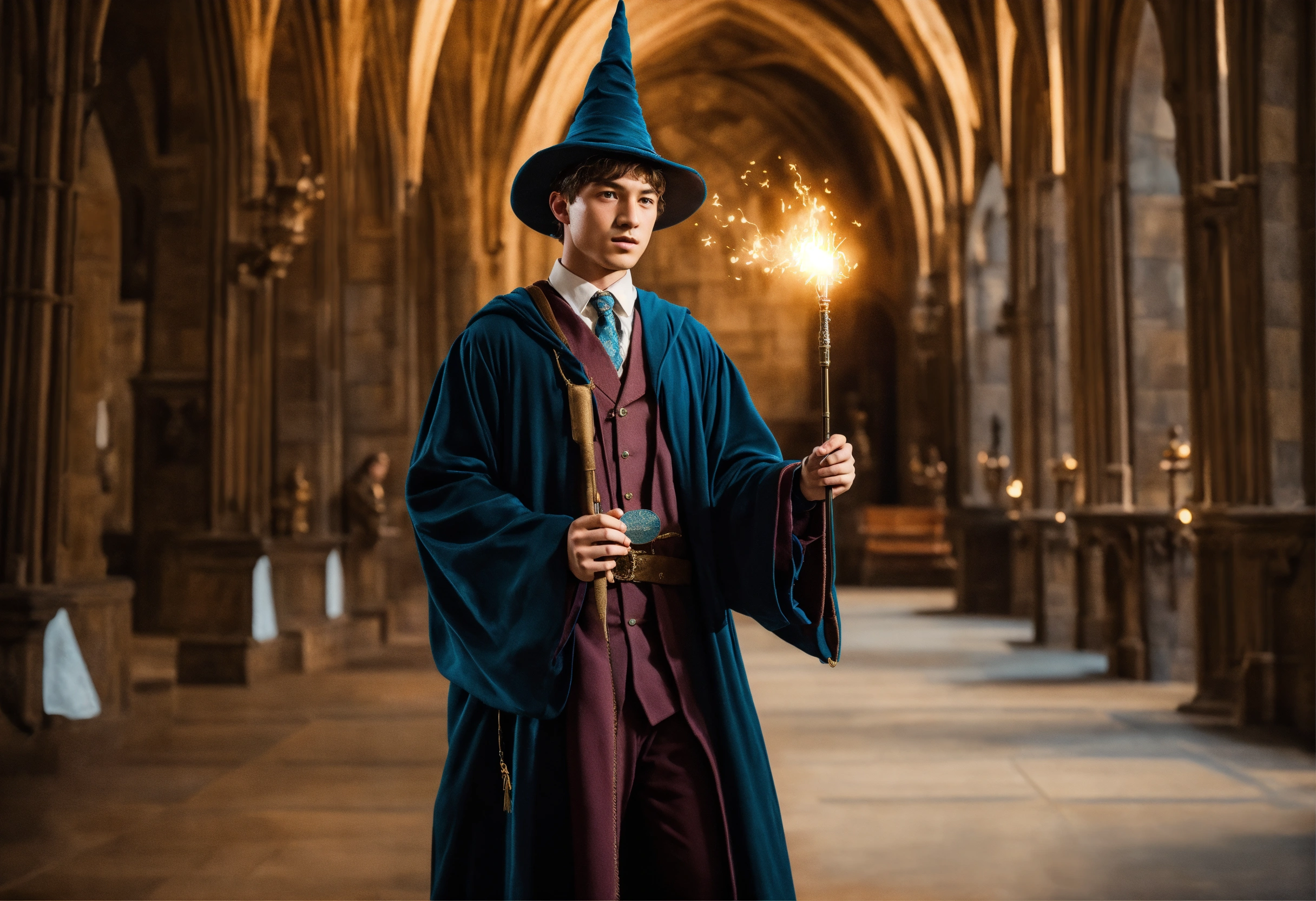 inside hogwarts with a magic wand in his hand 2023 year