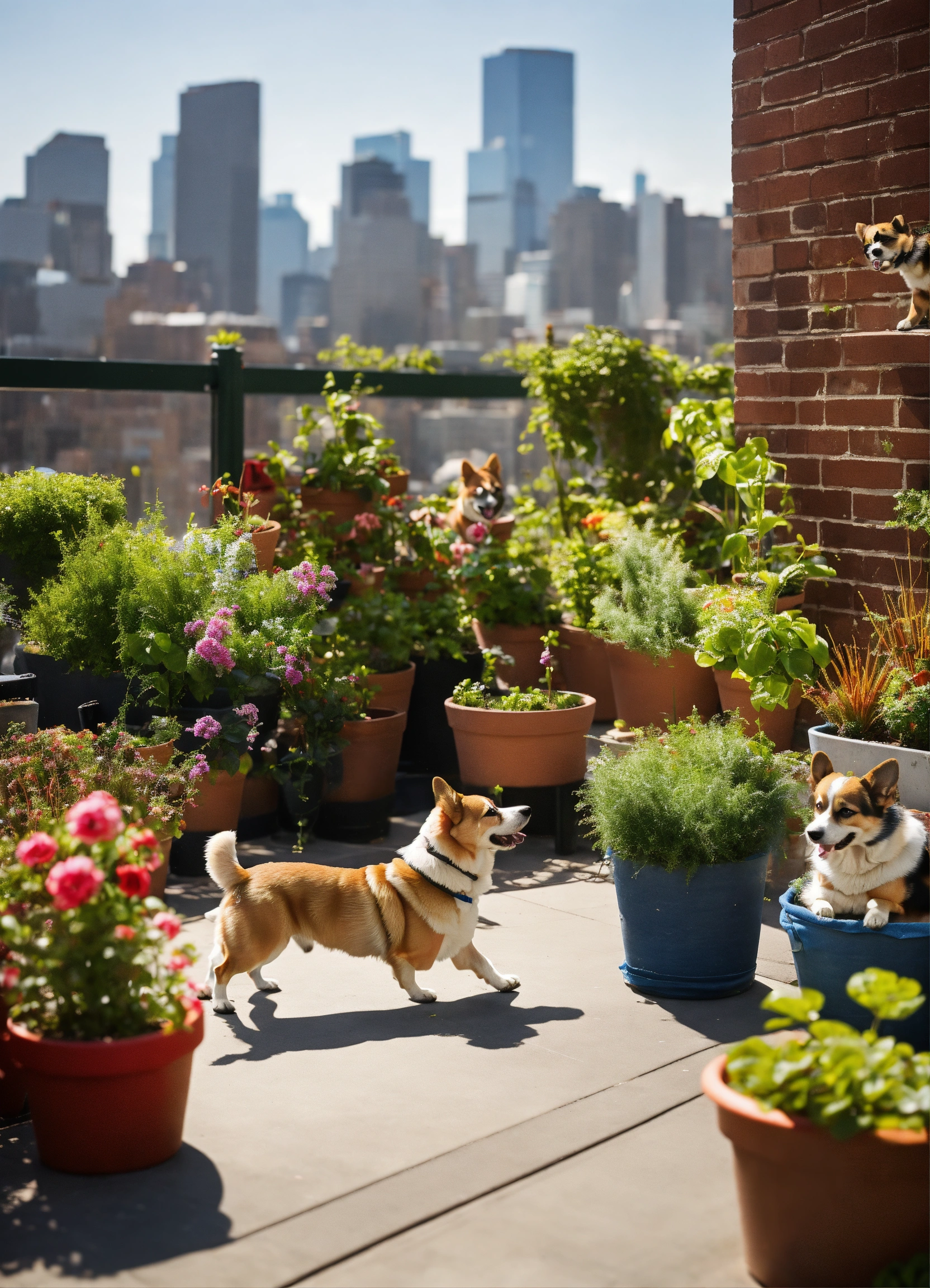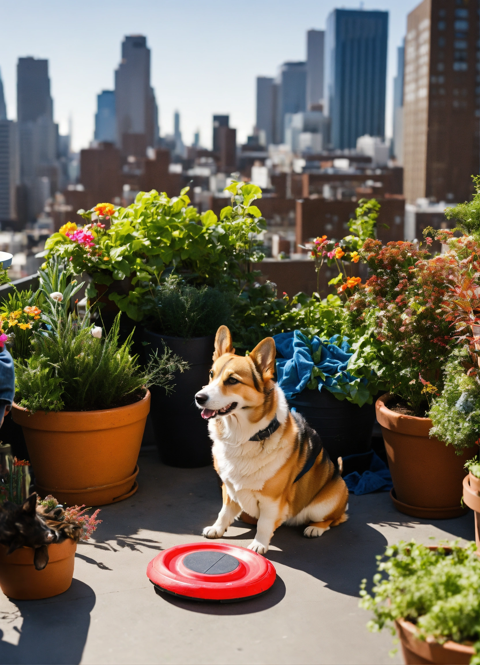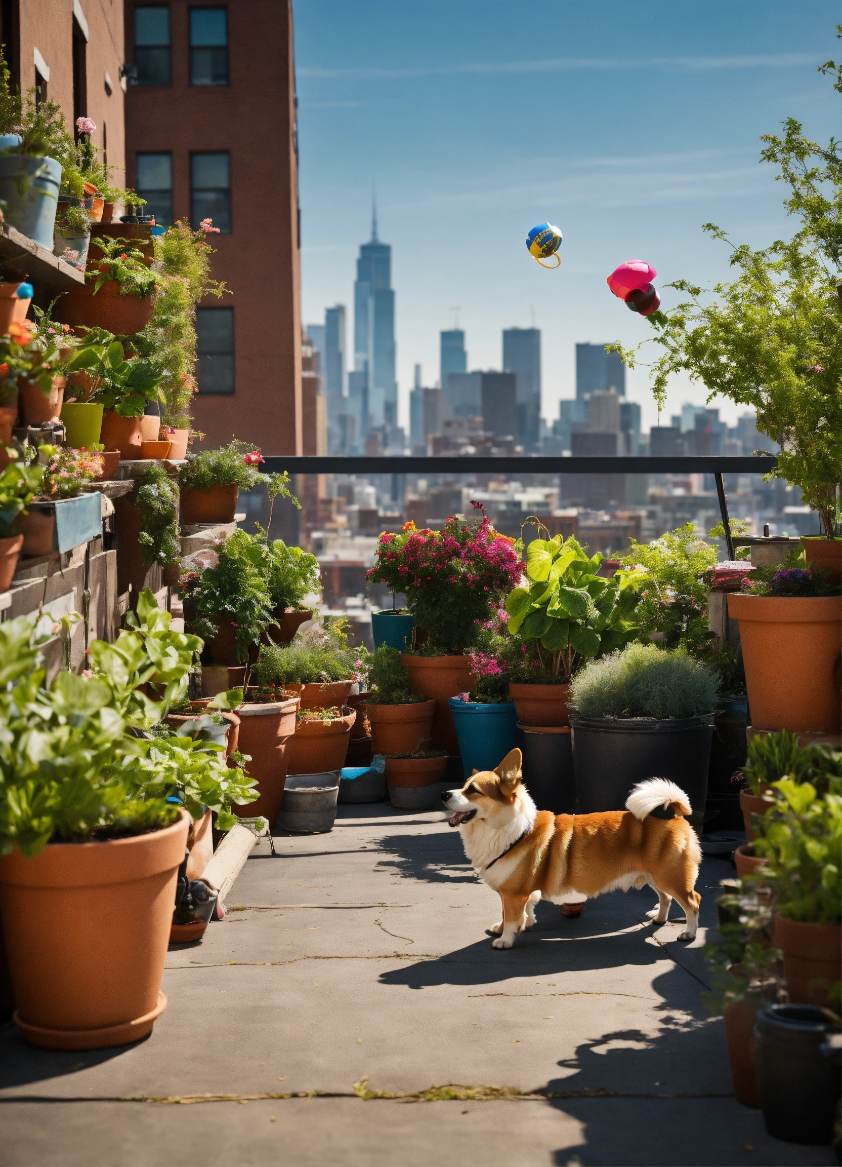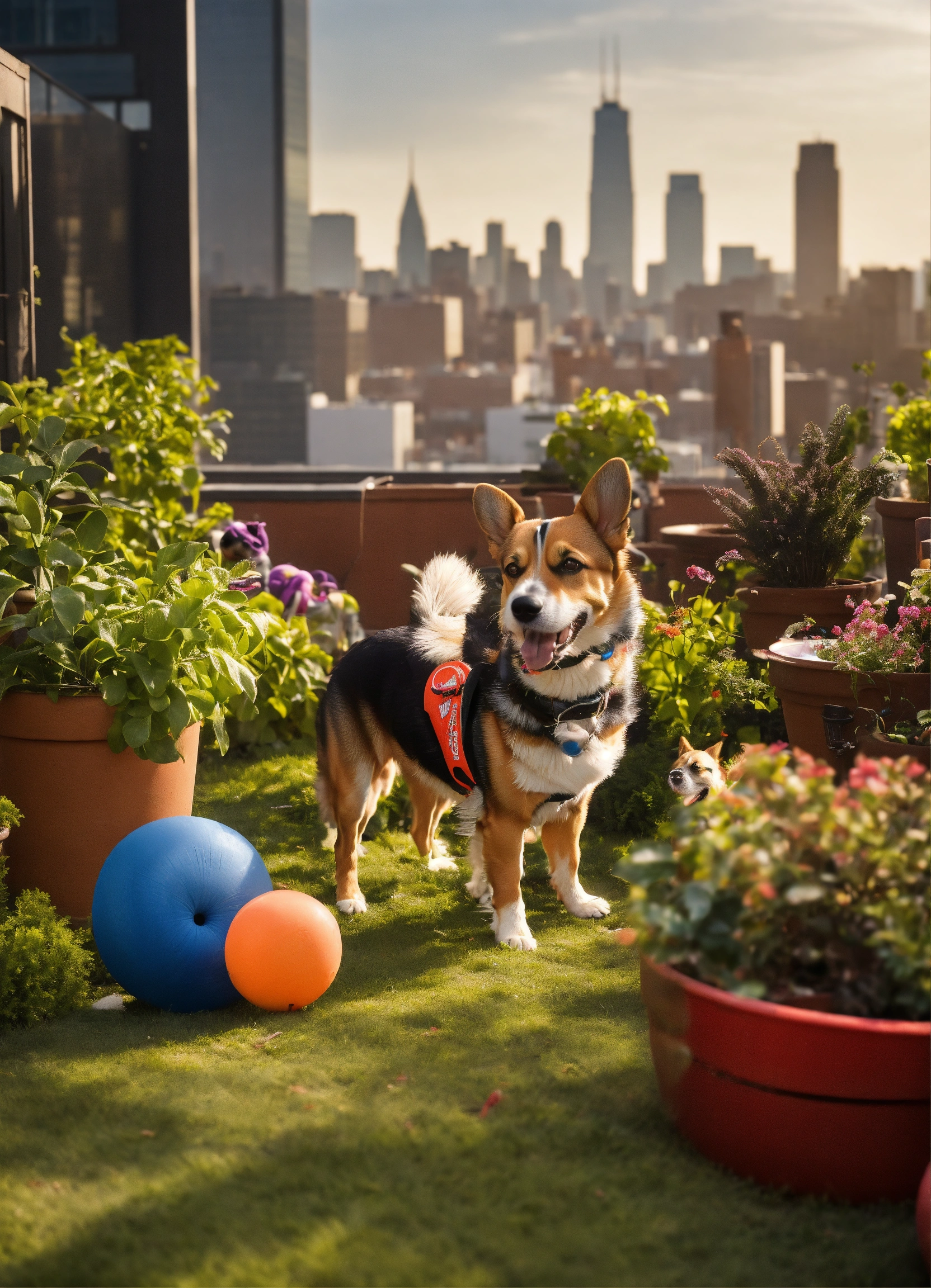 "atop a city rooftop garden, amid potted plants and urban views, dogs gather for a diy toy fest. a corgi gleefully chases a hand-crafted frisbee, while a terrier investigates a toy made of old jeans, the cityscape providing a contrasting backdrop."