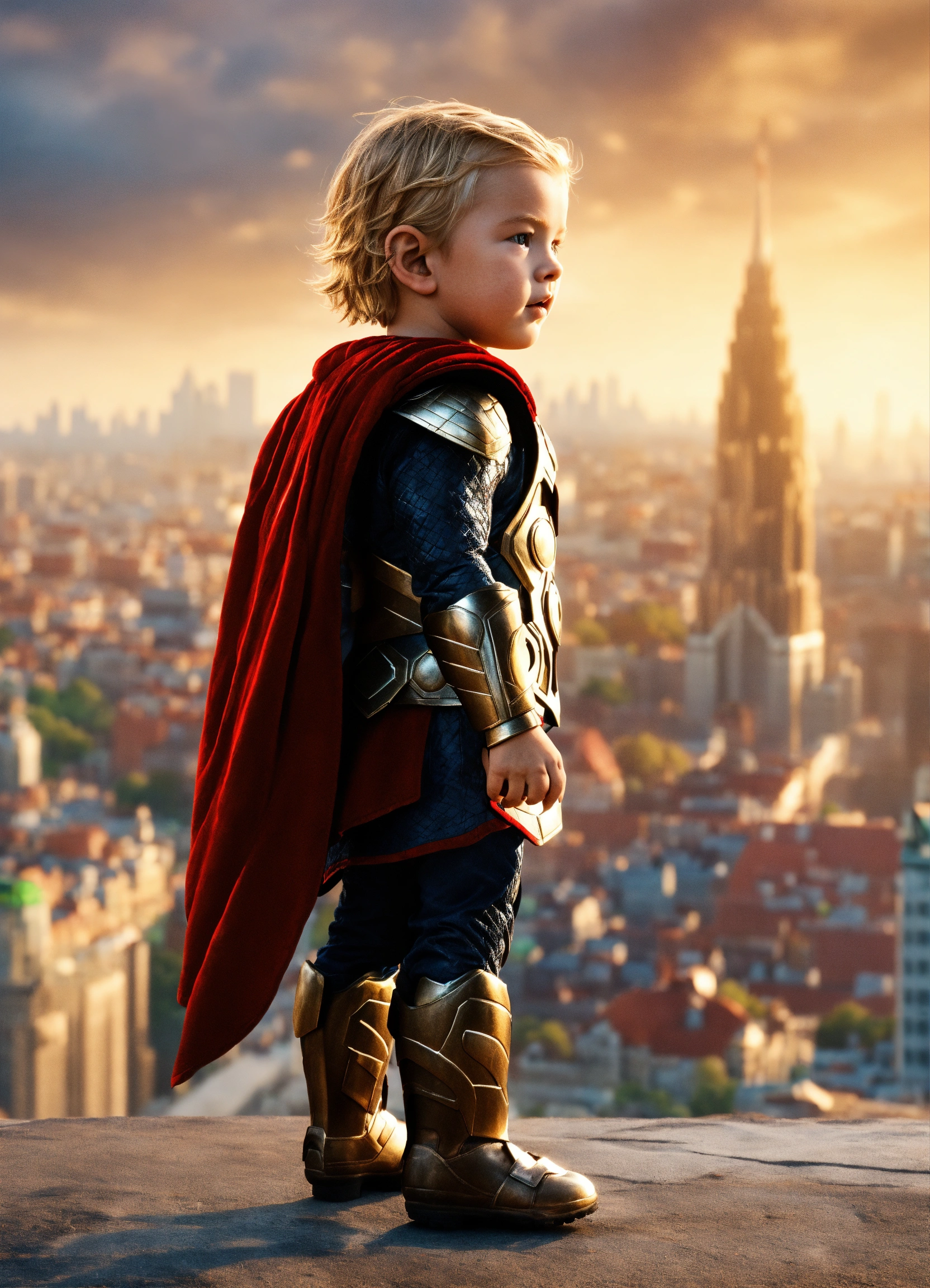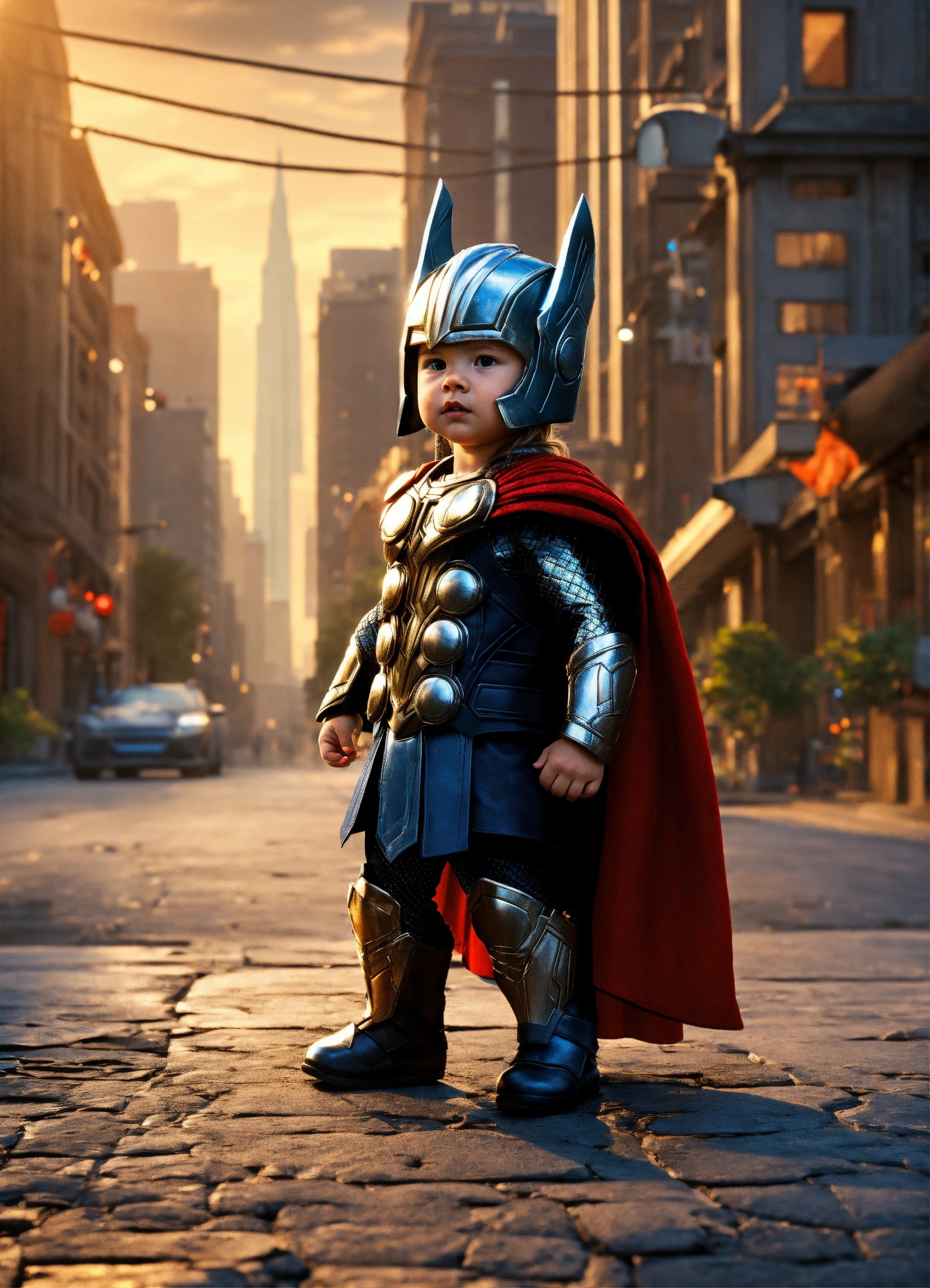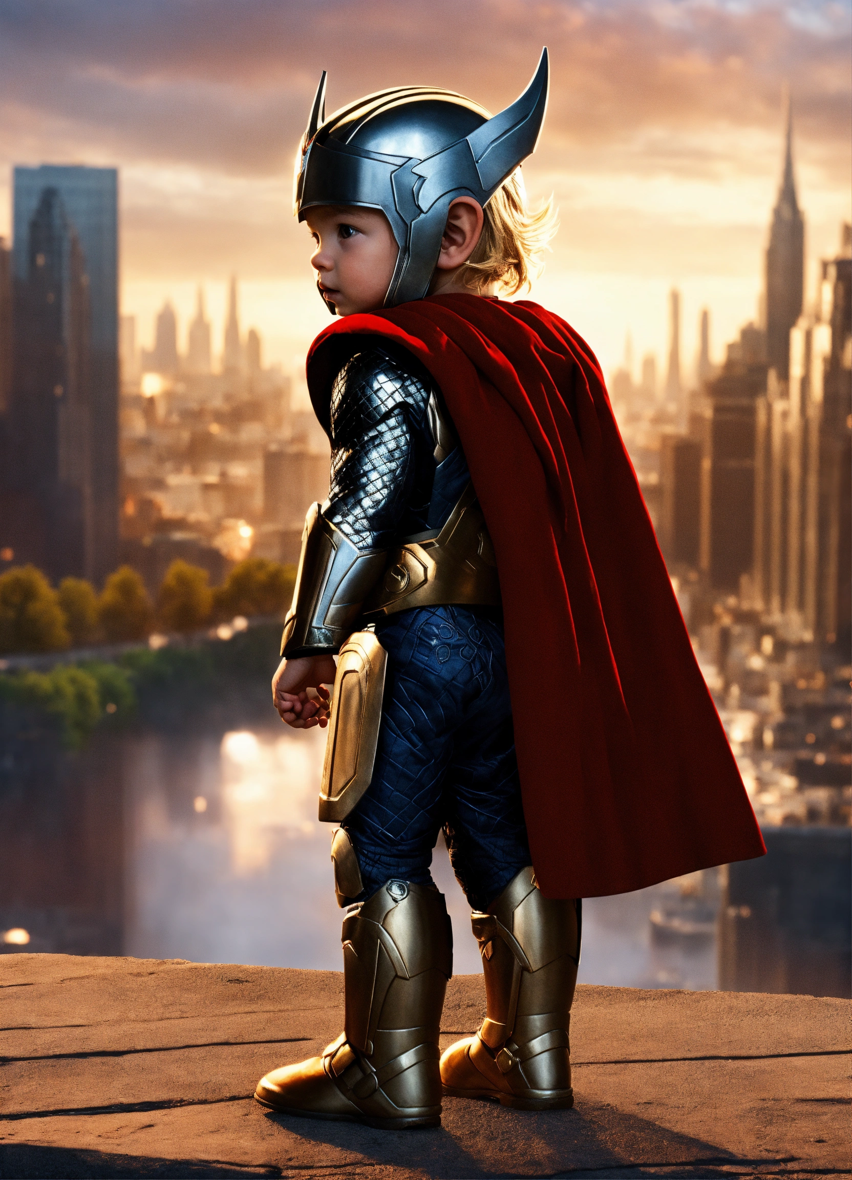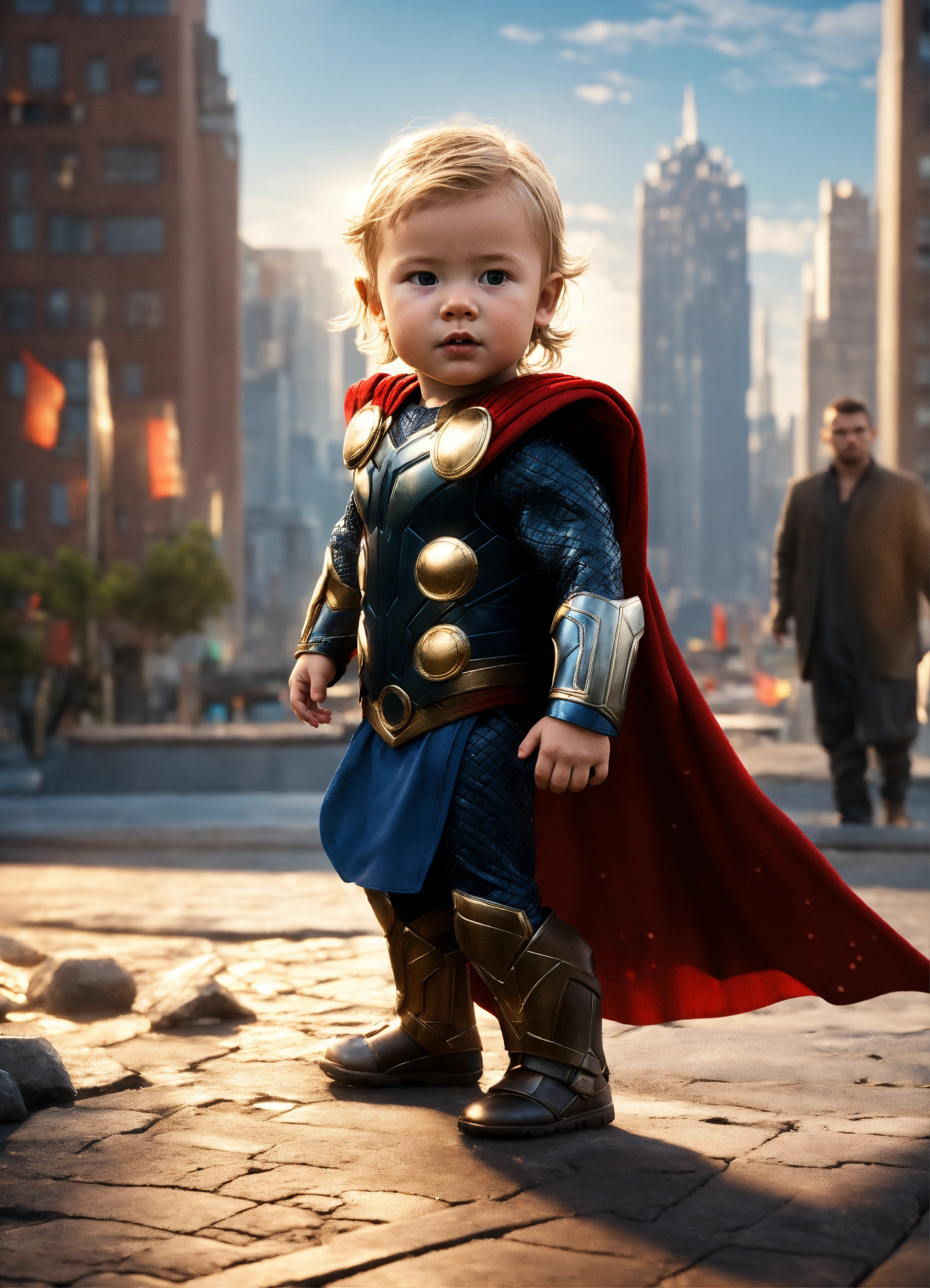 Baby thor standing in front of the city. highly tender