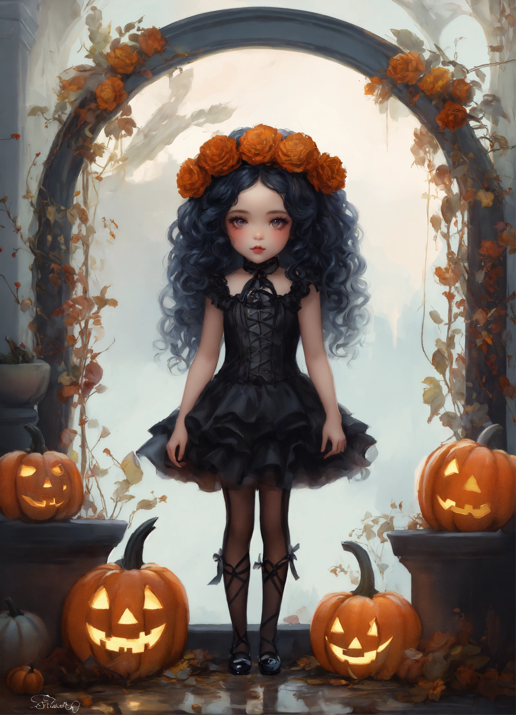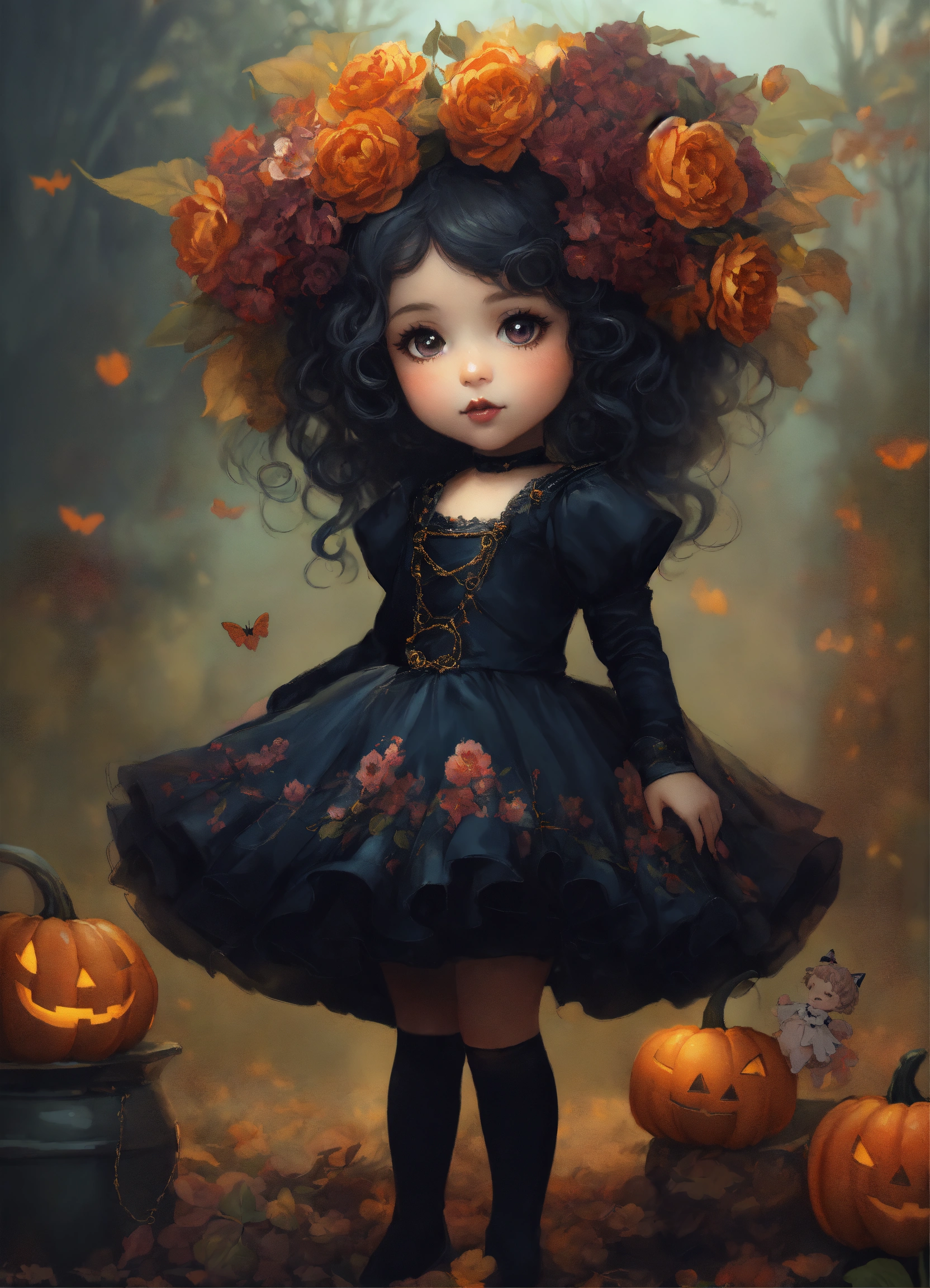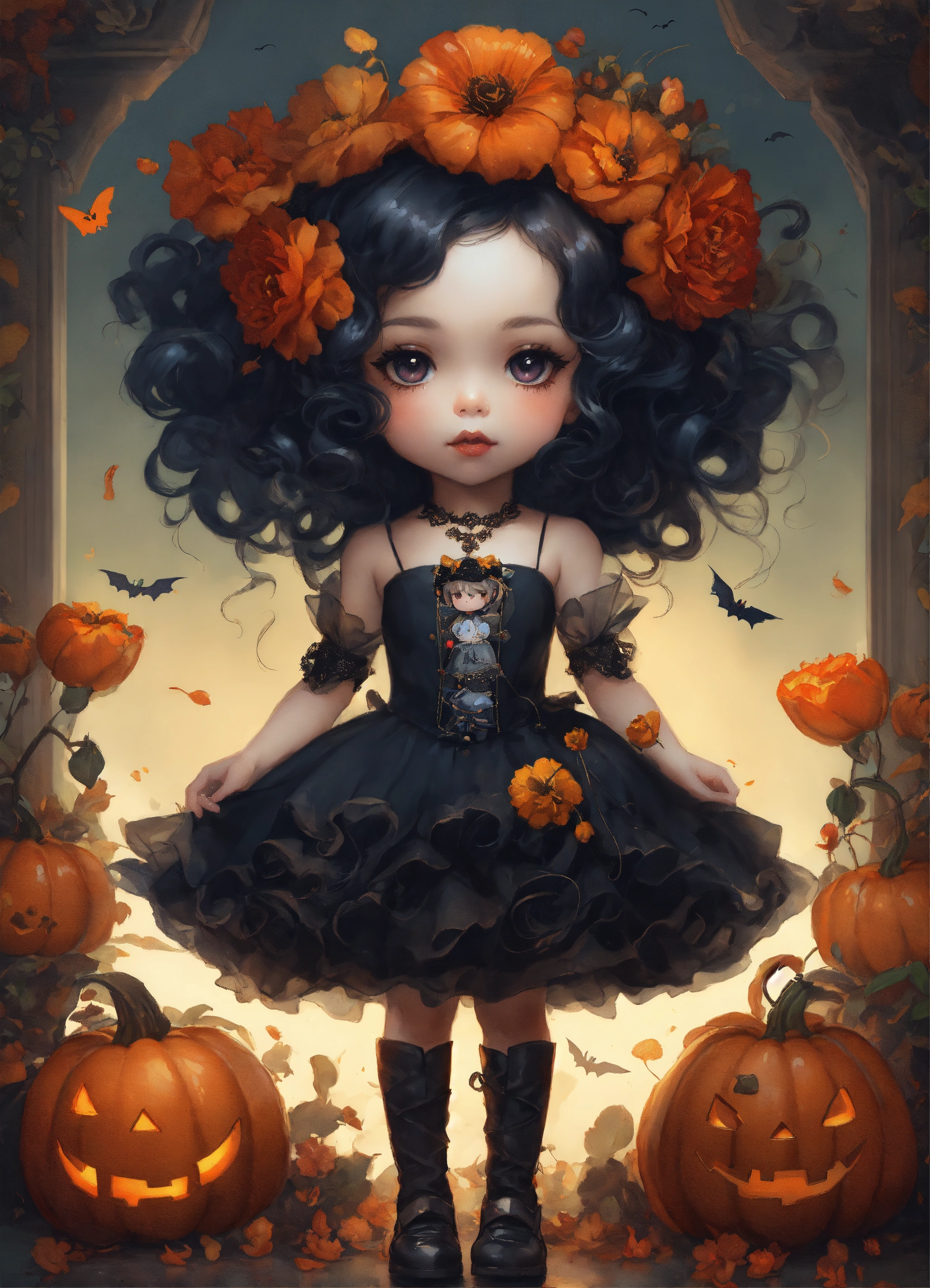Portrait and shot full body of a very cute dark princess gothic chibi girl in halloween time, kewpie fairy clothes, white background, long curly hair oil paint vray, and flowers by stanley artgerm and tom bagshaw