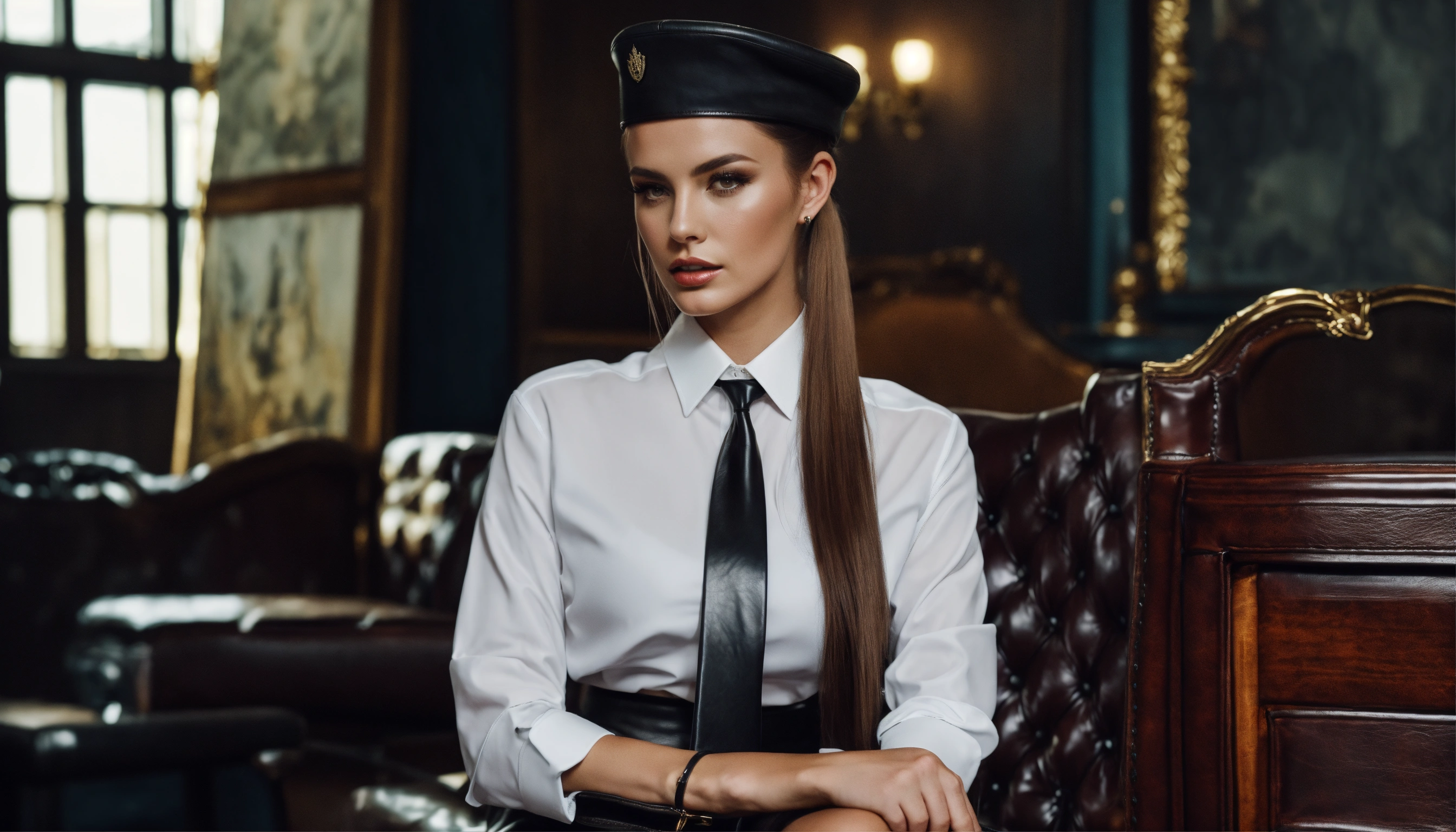 Two stunning european mistress women fashion models sitting, brunette straight high ponytail, strict business leather skirt, white shirt and leather long necktie, leather black big military cap, mansion room, shirt and tie
