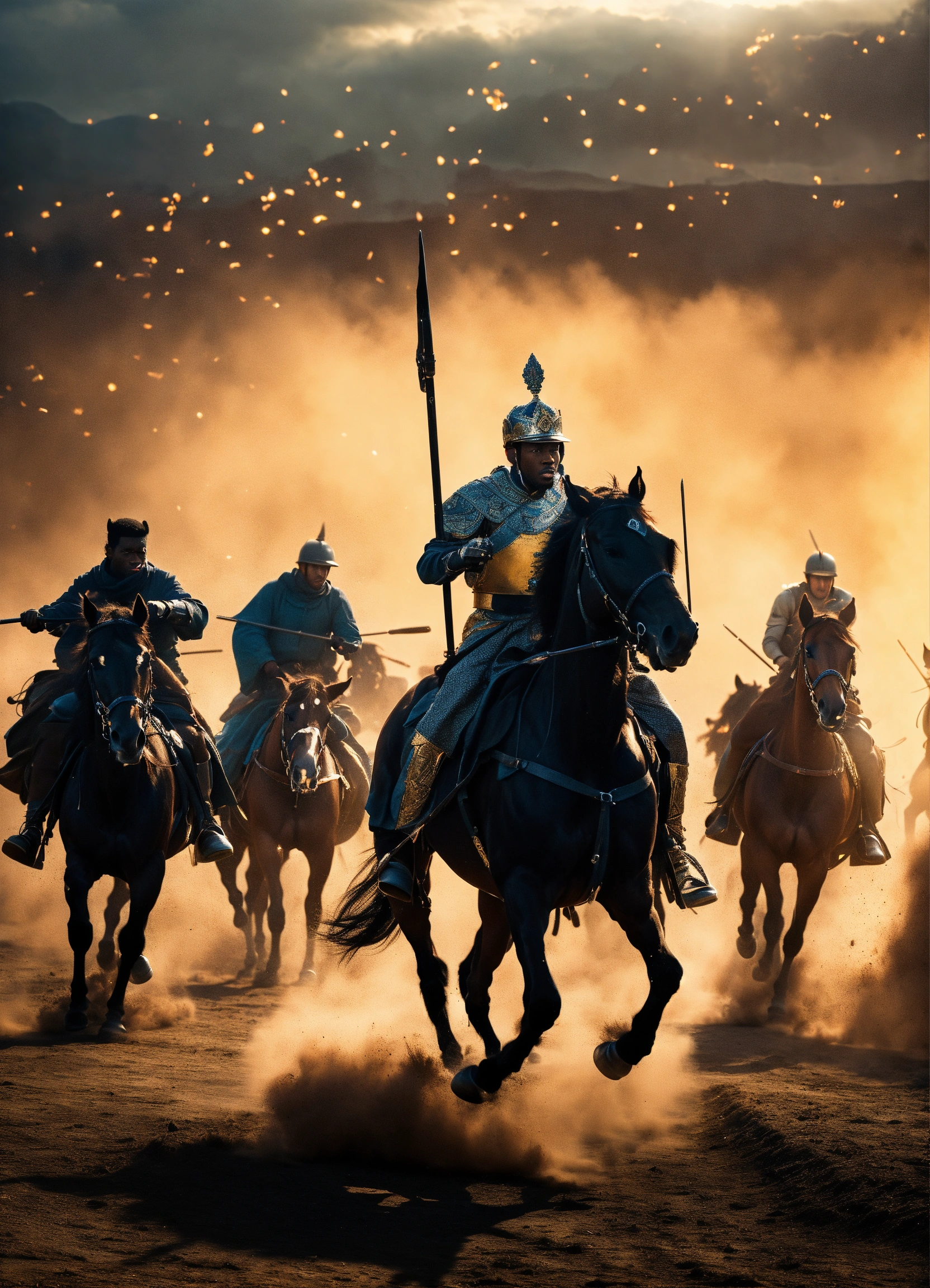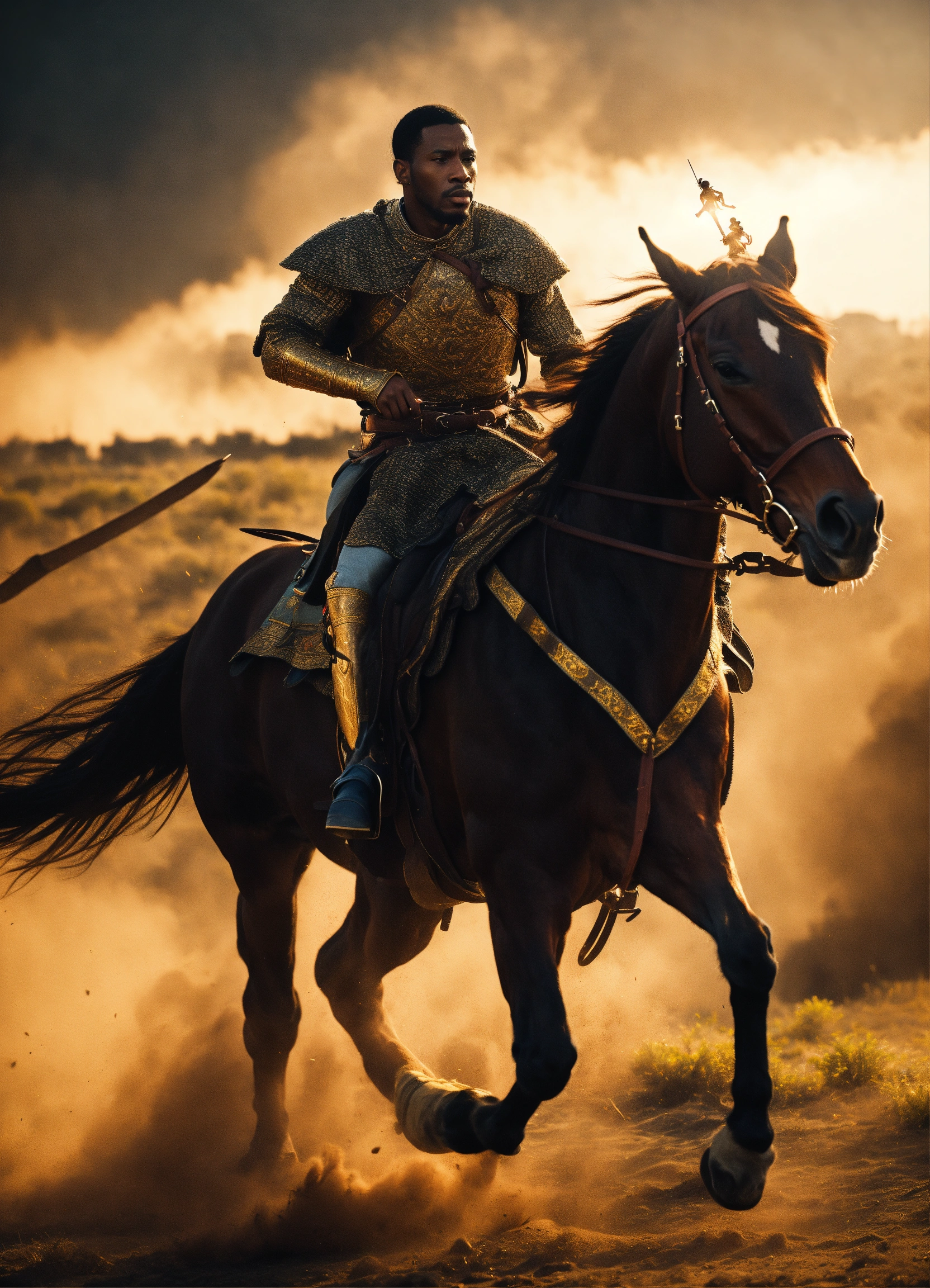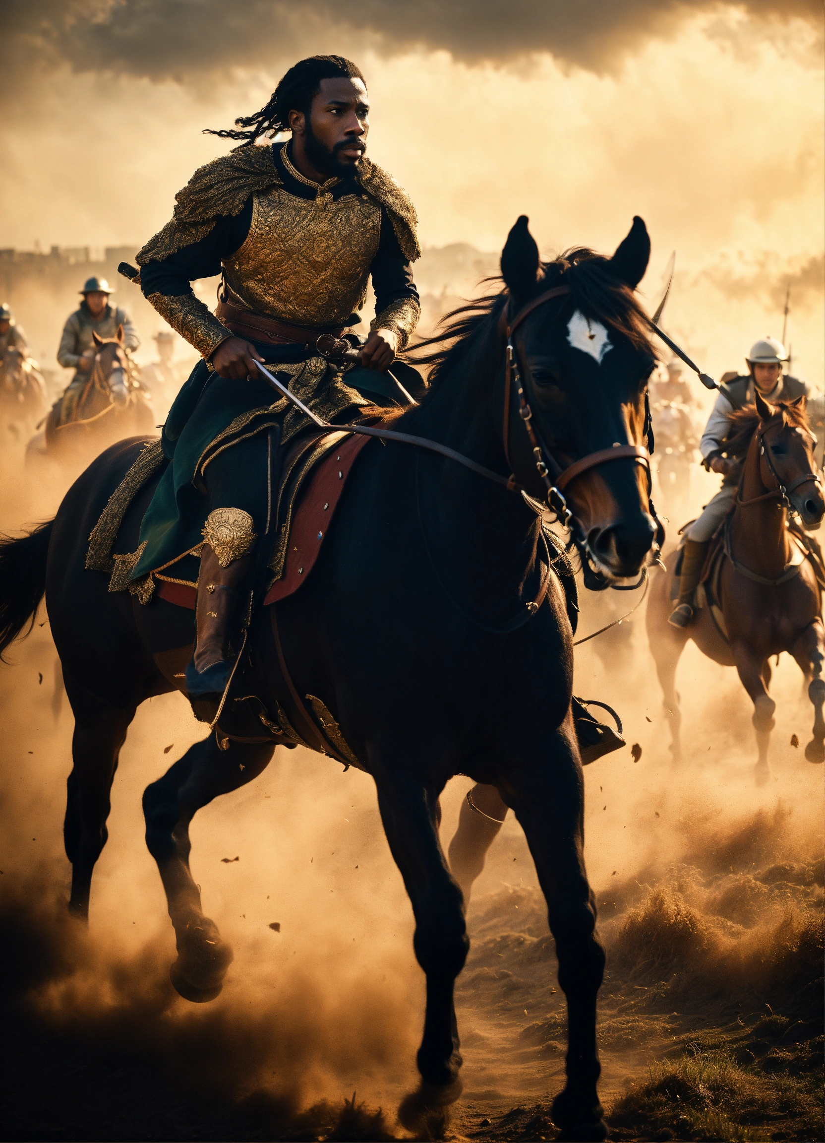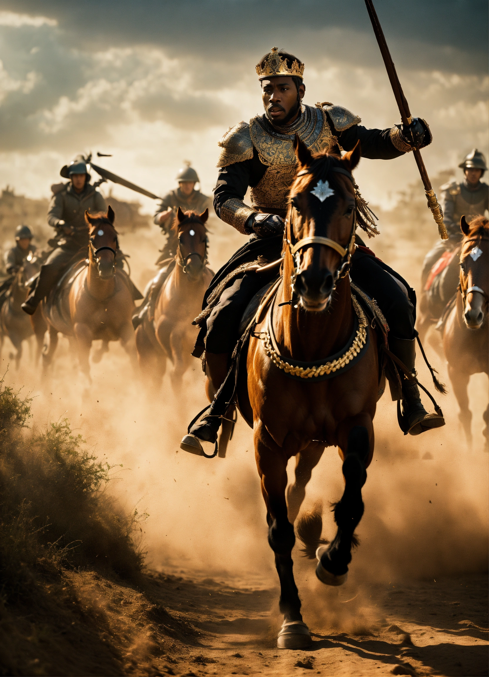 A black king is escaping a battle field on horseback, but is being chased by a latino king. cinematic film still. stunning lighting.