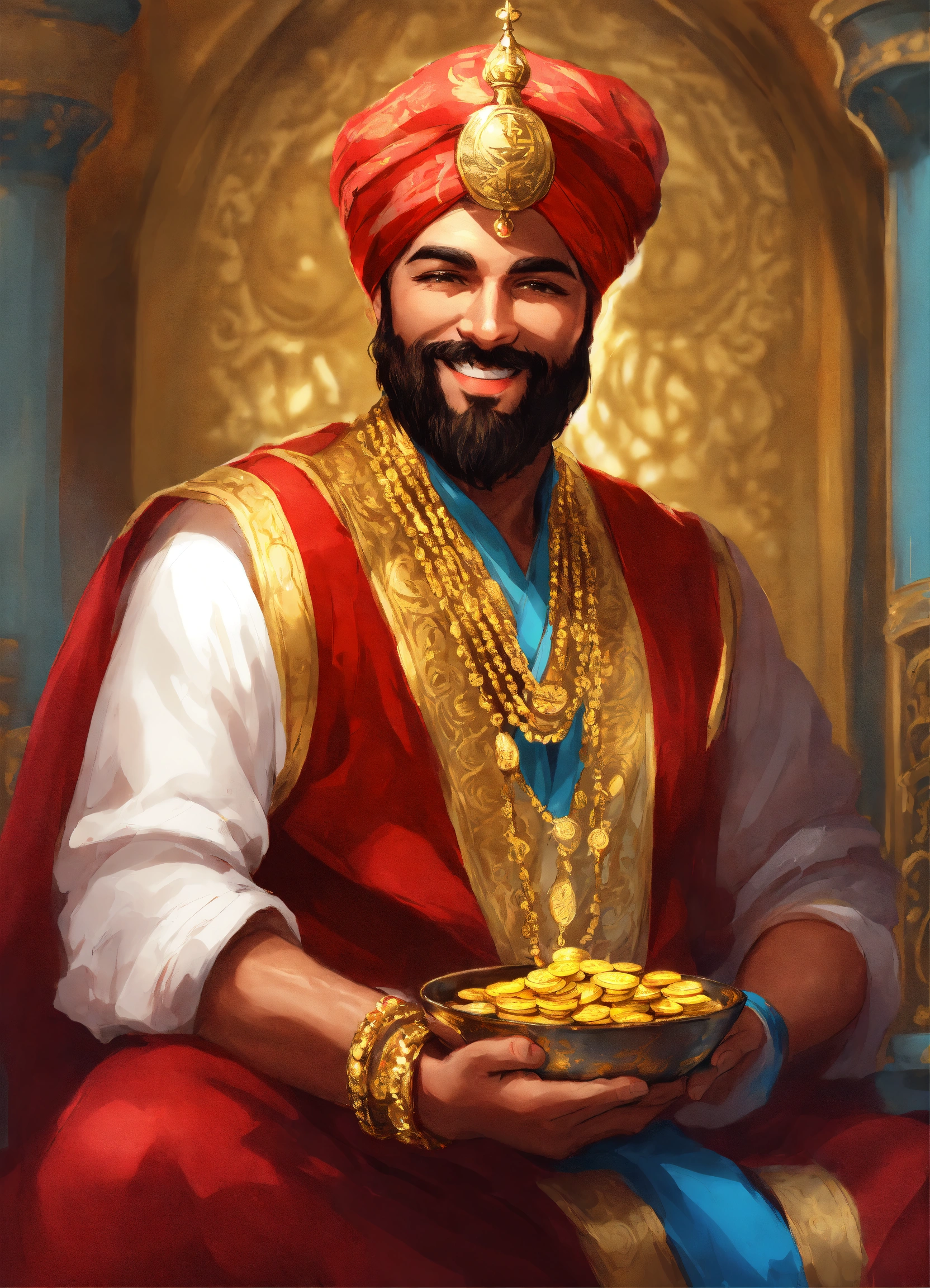 Stout handsome smiling genie with a short black goatee wearing royal sultan clothes and a red and white turban, holding gold coins, the genie has light blue colored skin, sketch