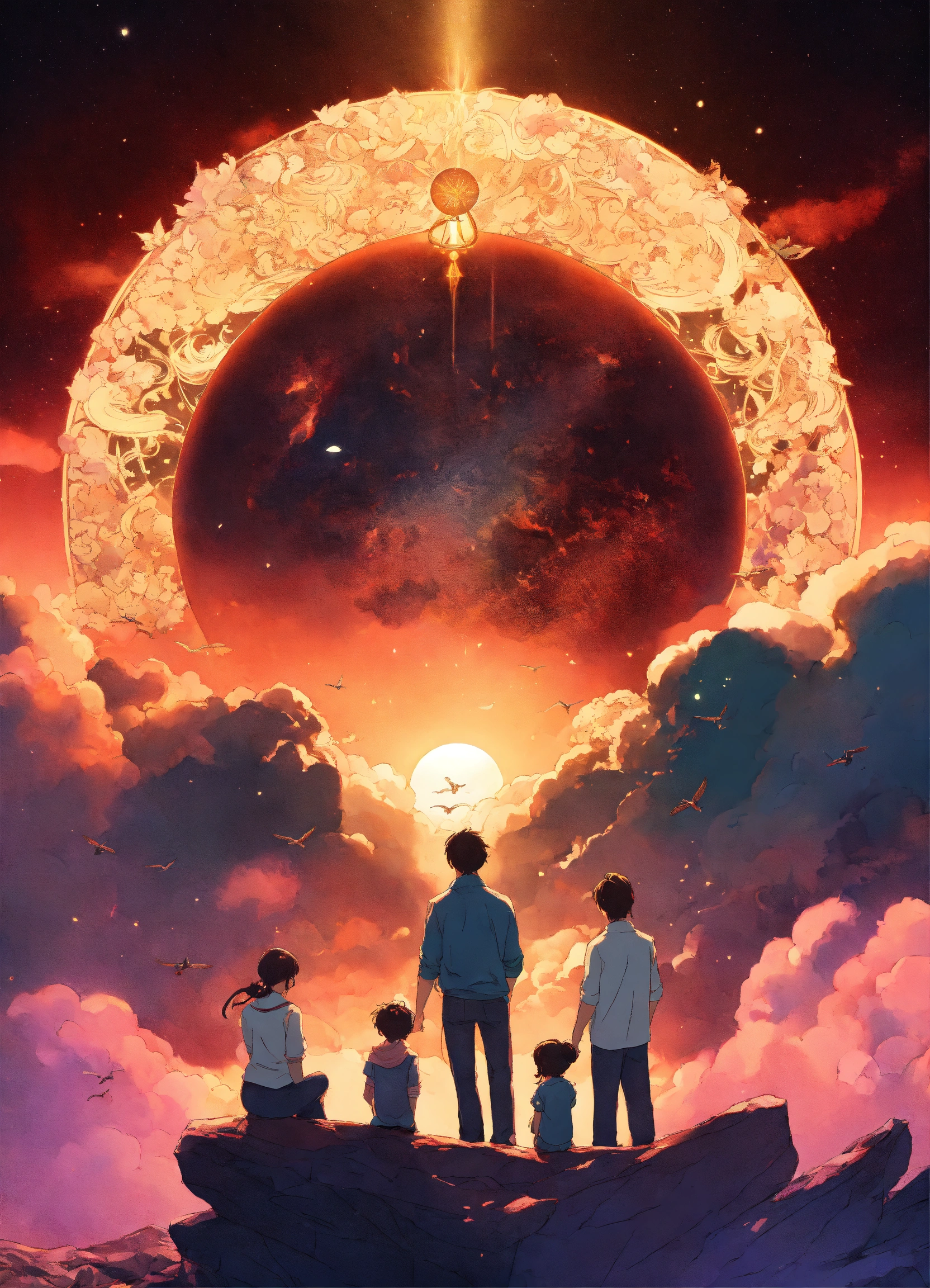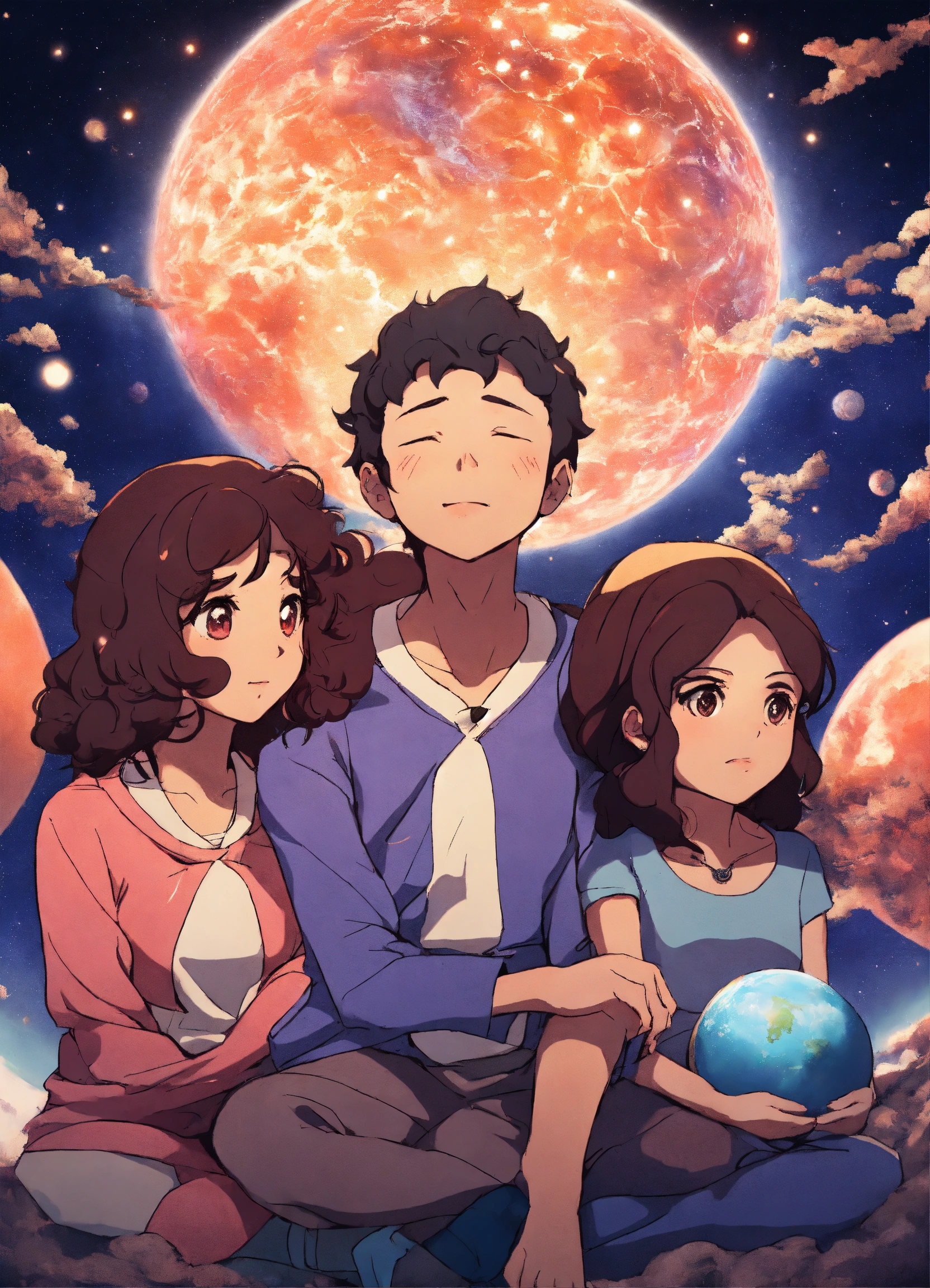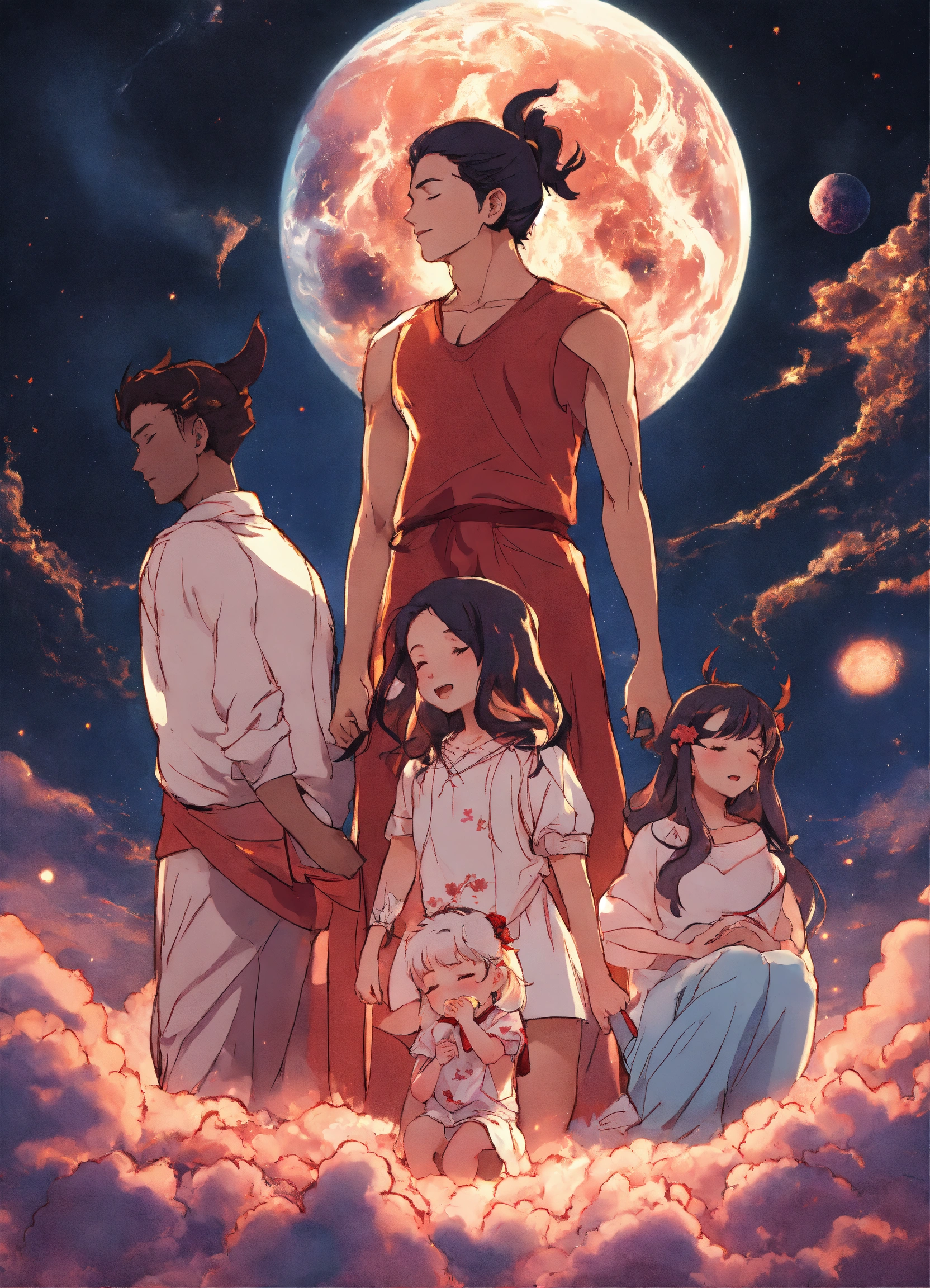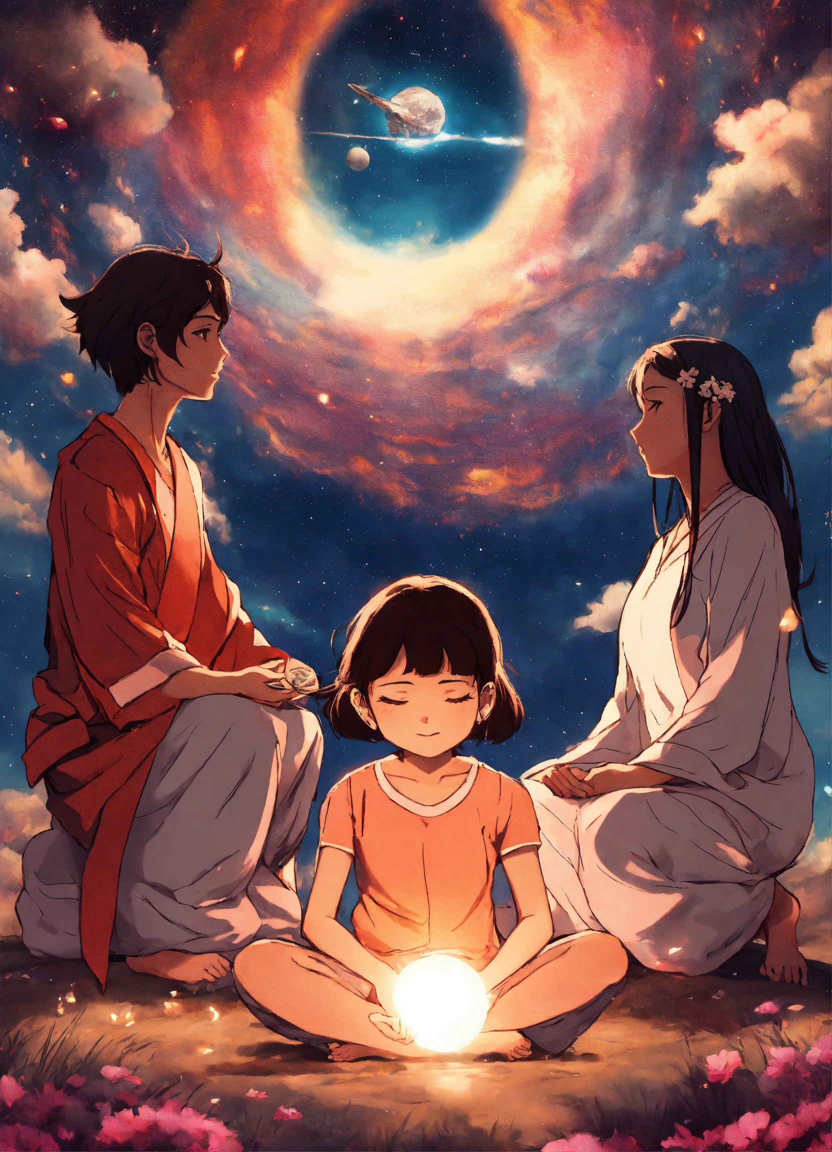 Familia latina meditando, demonios cayendo medium shot, alzando vuelo, fuerza del amor, fondo del universo, manga anime style.