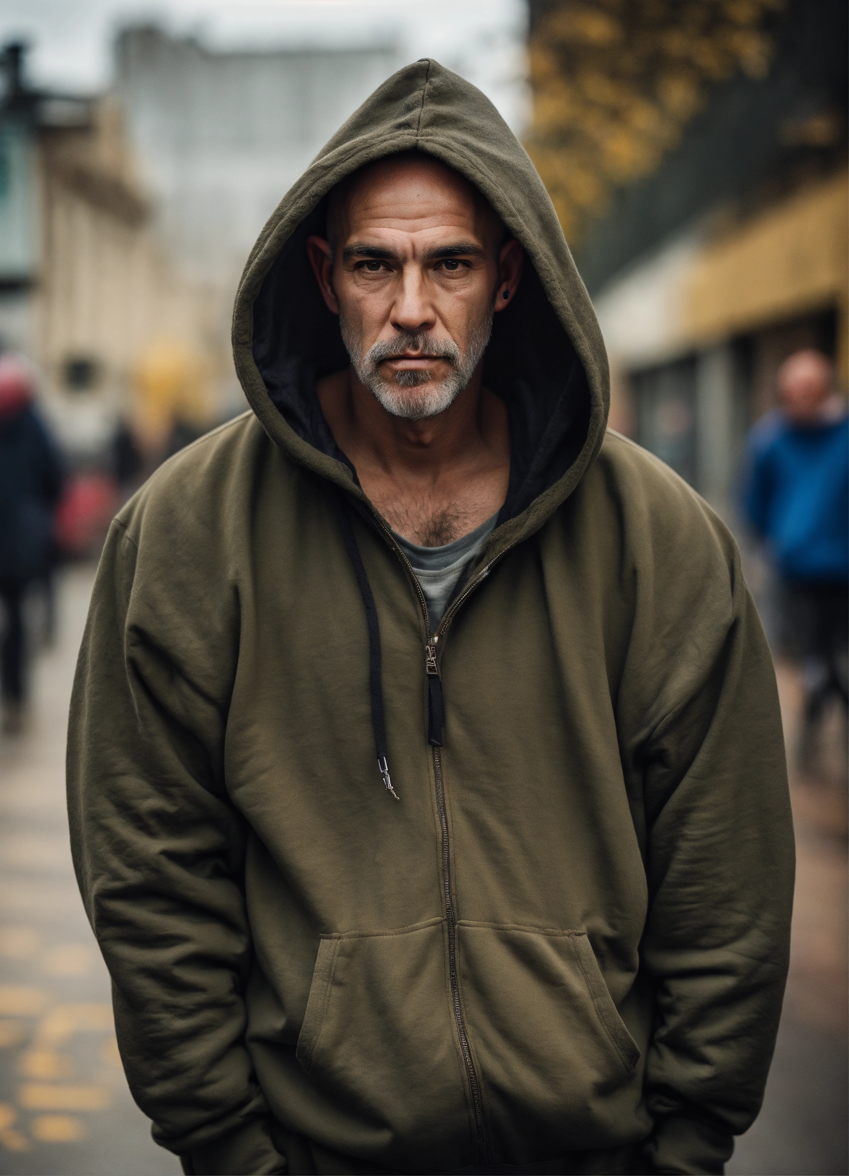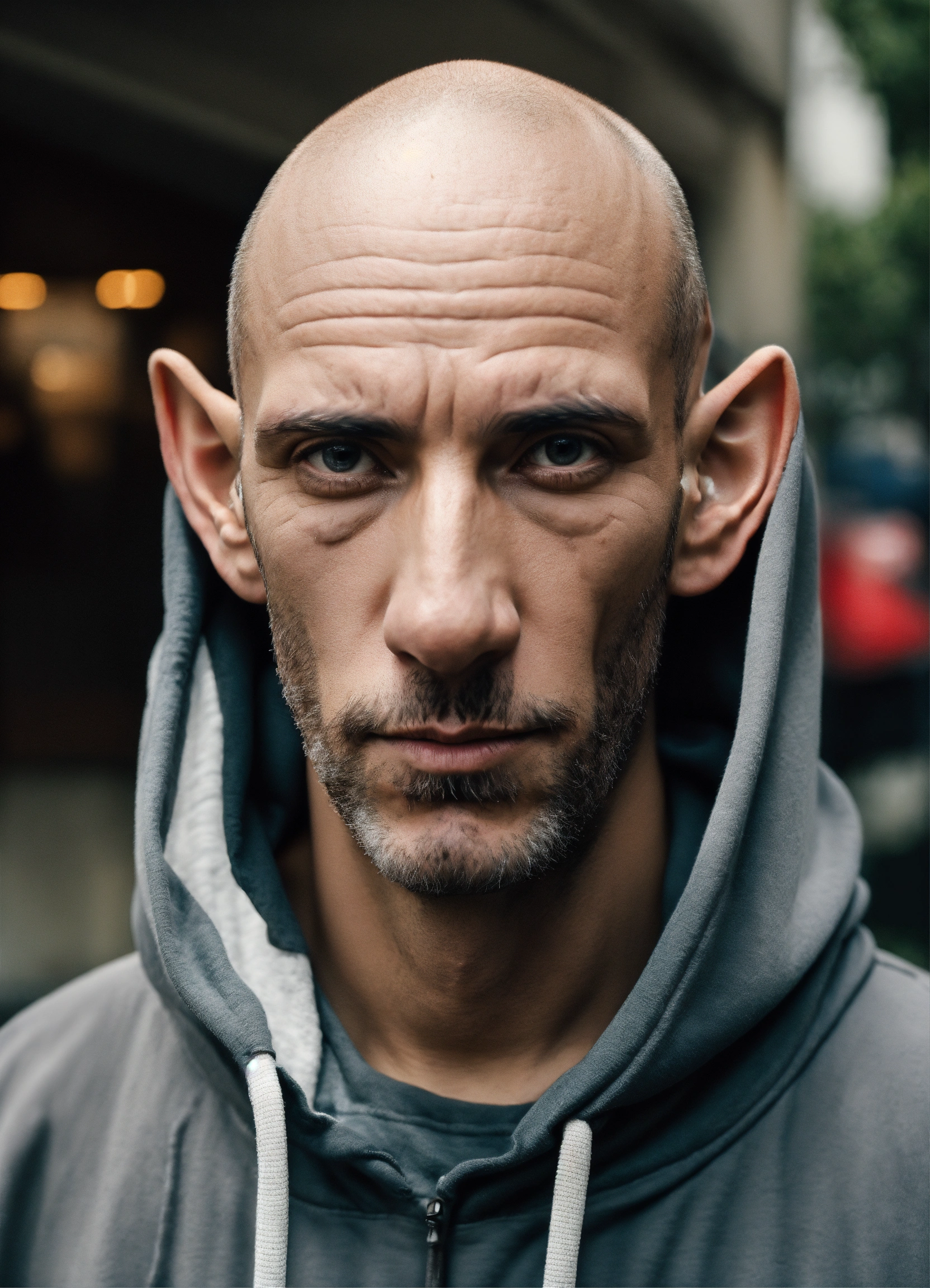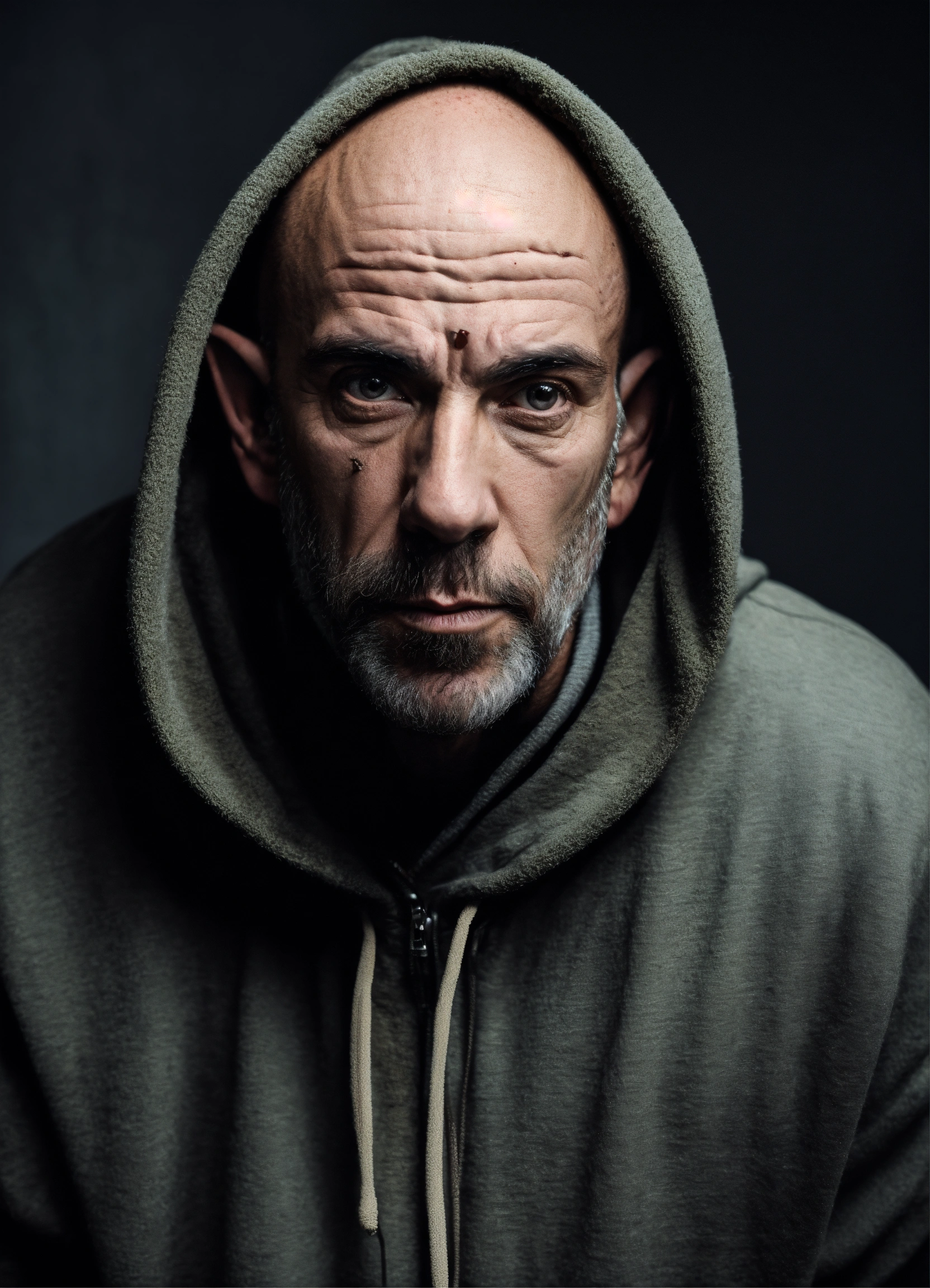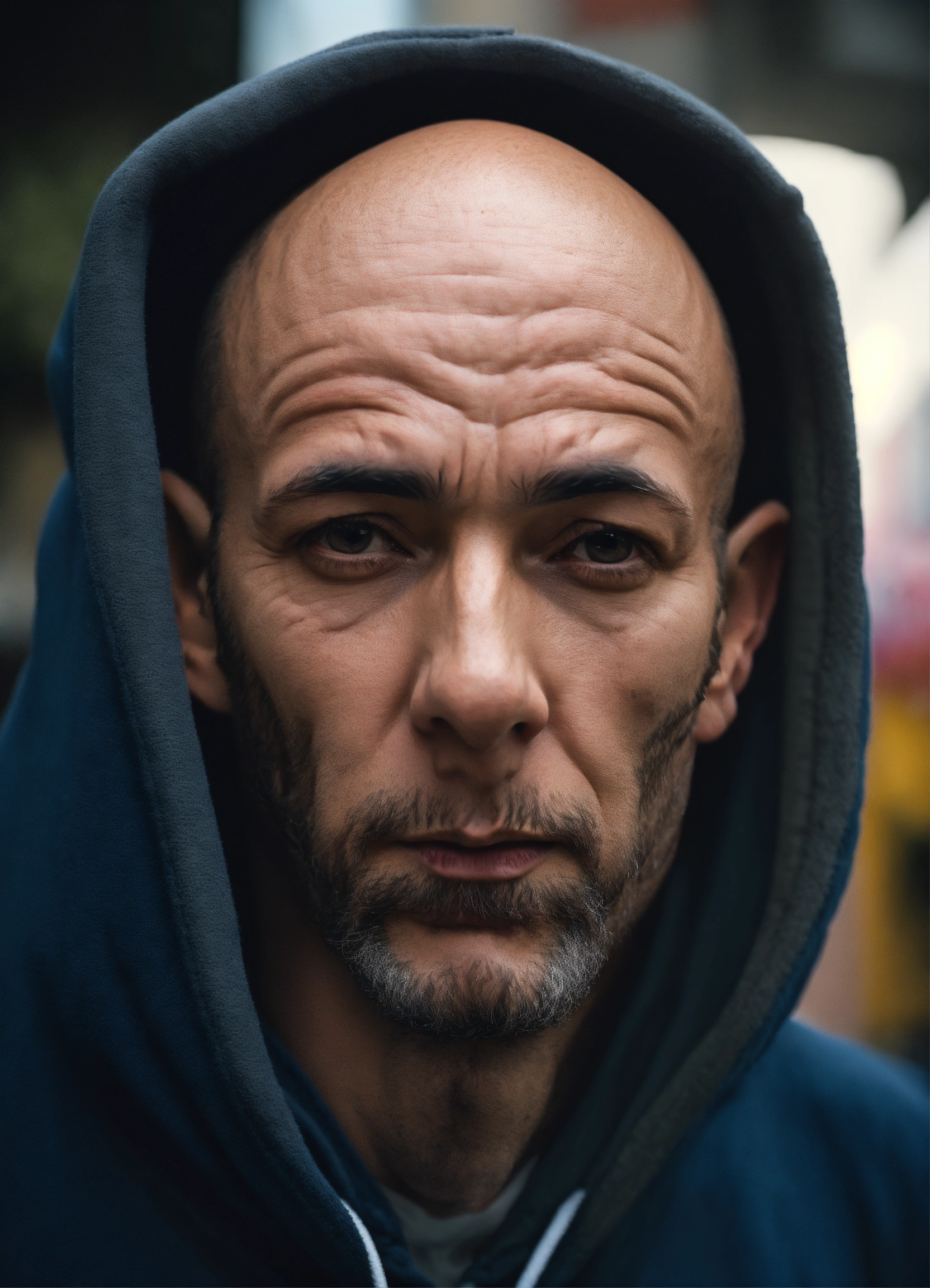 A huge bald homeless man, extended protruding brow forehead, crooked mouth, large ears, wearing a hoodie up over his head