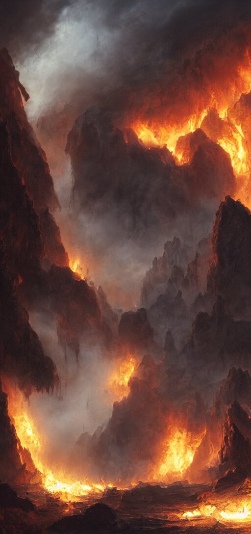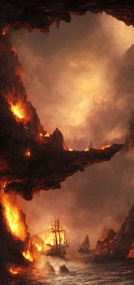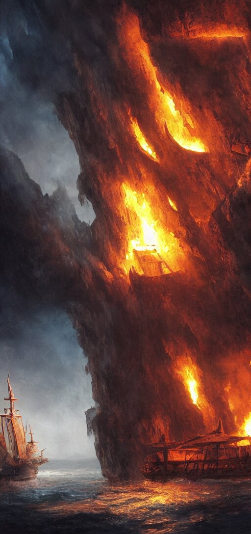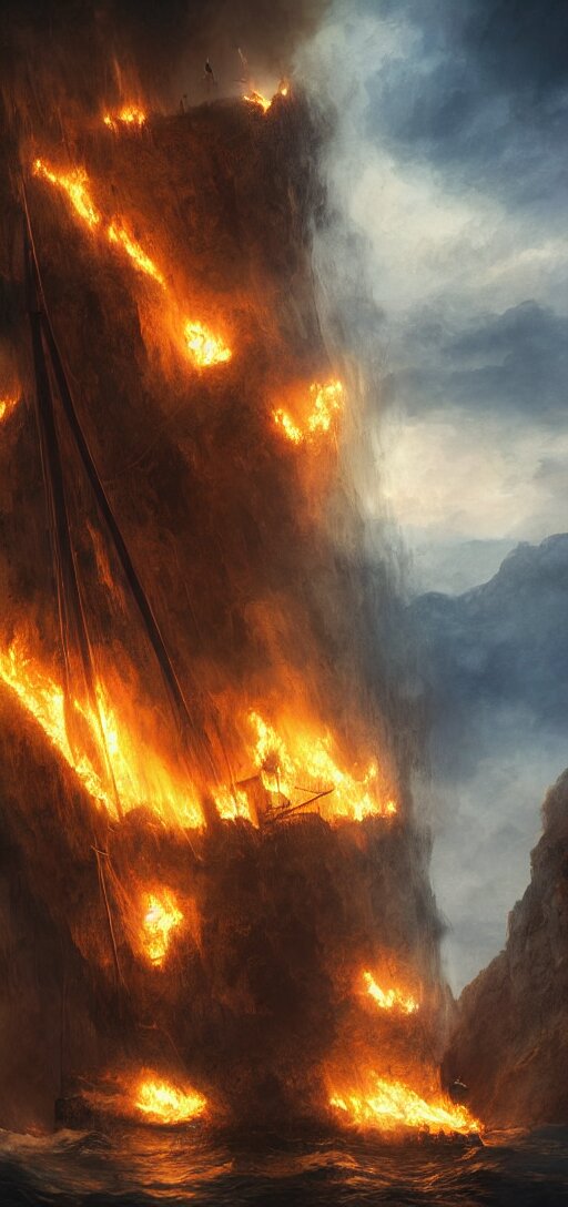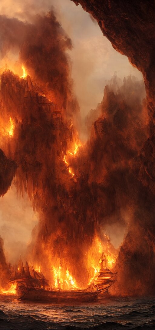 Matte painting of a burning pirate ship in a cave, sail and masts on fire, dramatic light, 8k, very detailed, concept art
