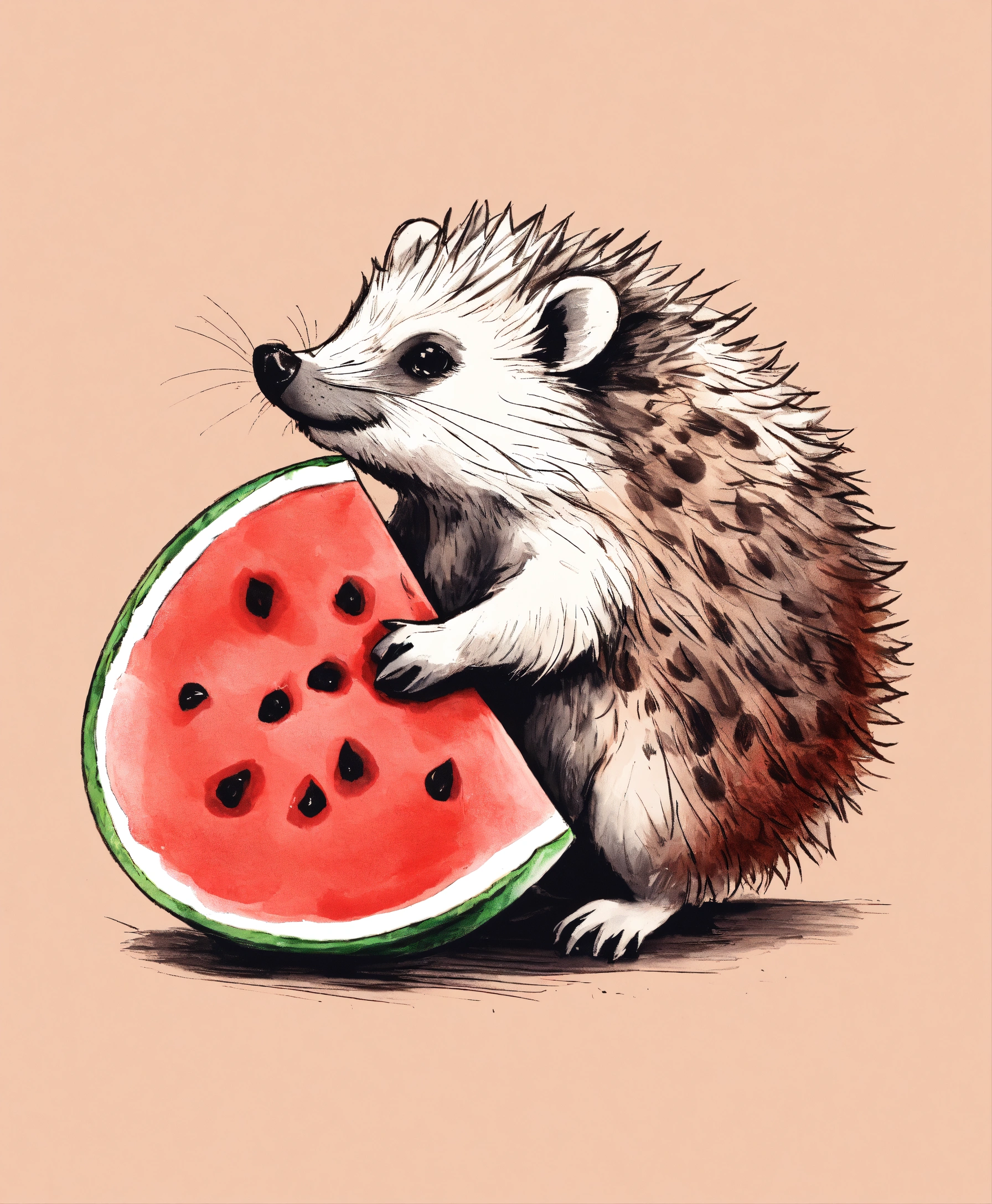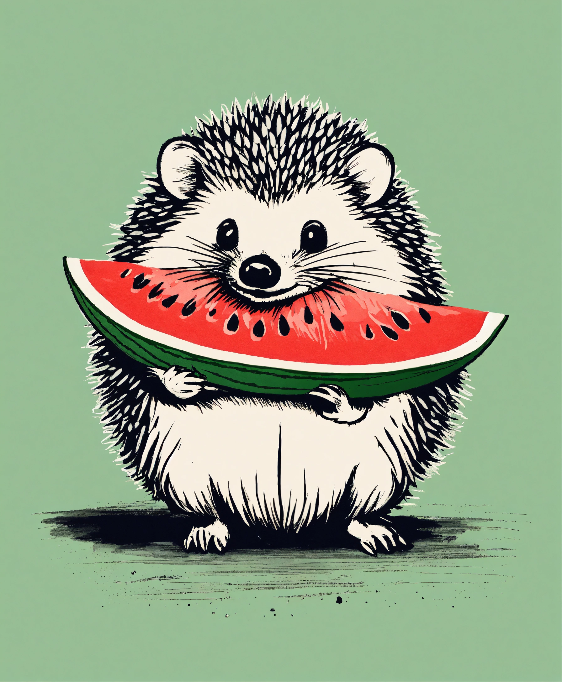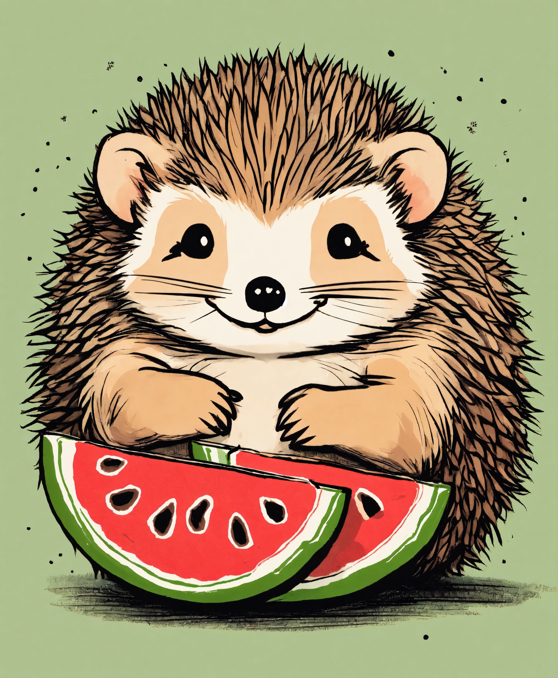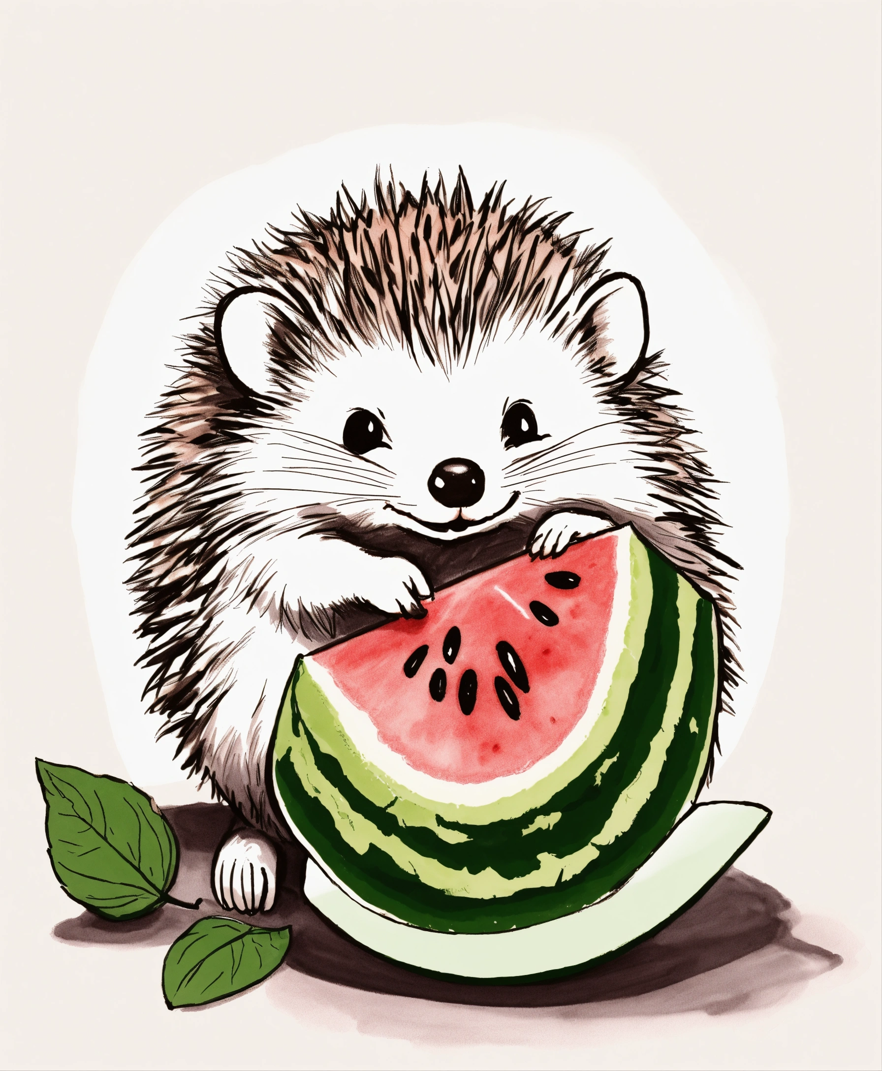 A small hedgehog holding a piece of watermelon with its tiny paws, taking little bites, eyes closed in delight, cute ink sketch style illustration