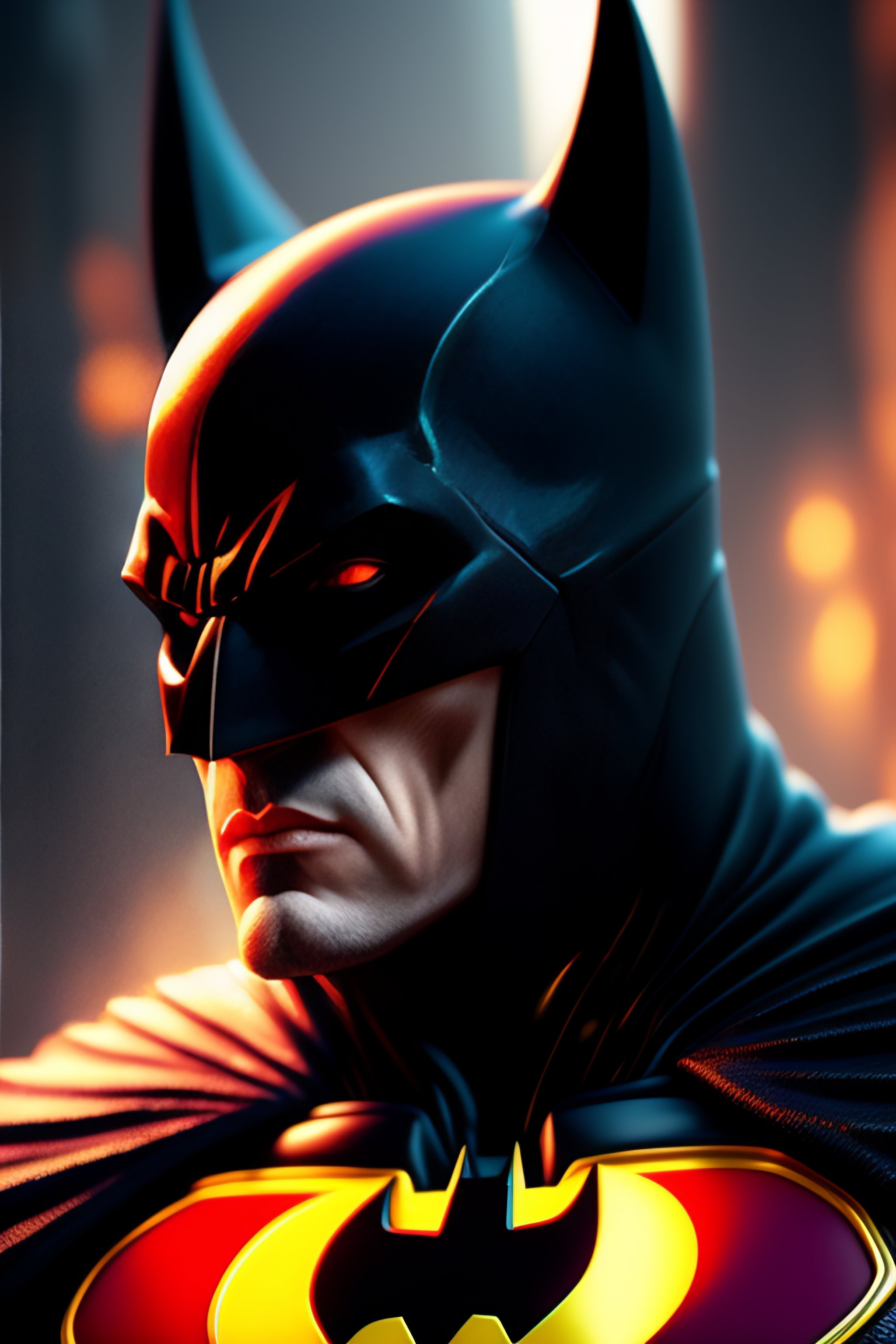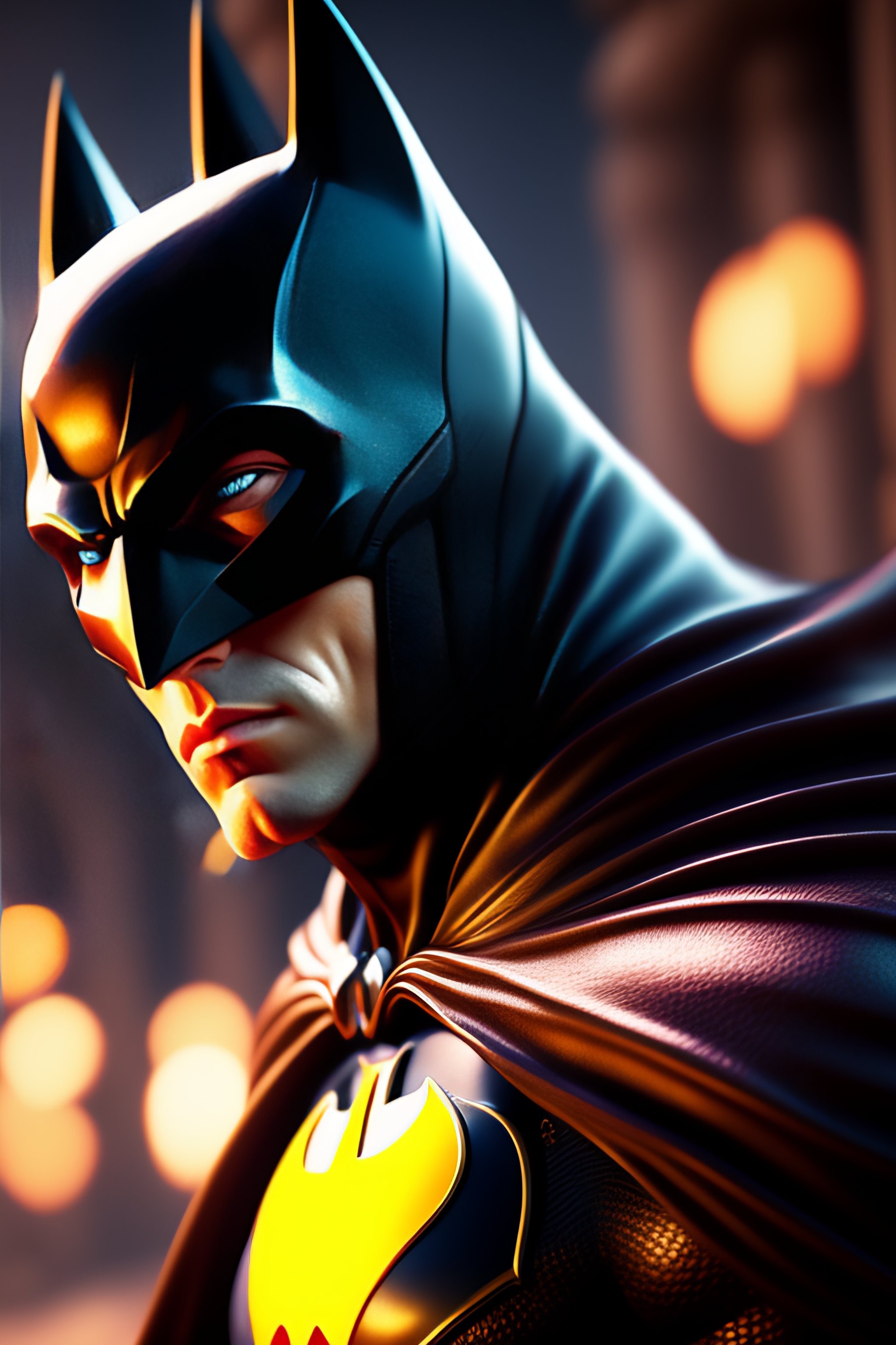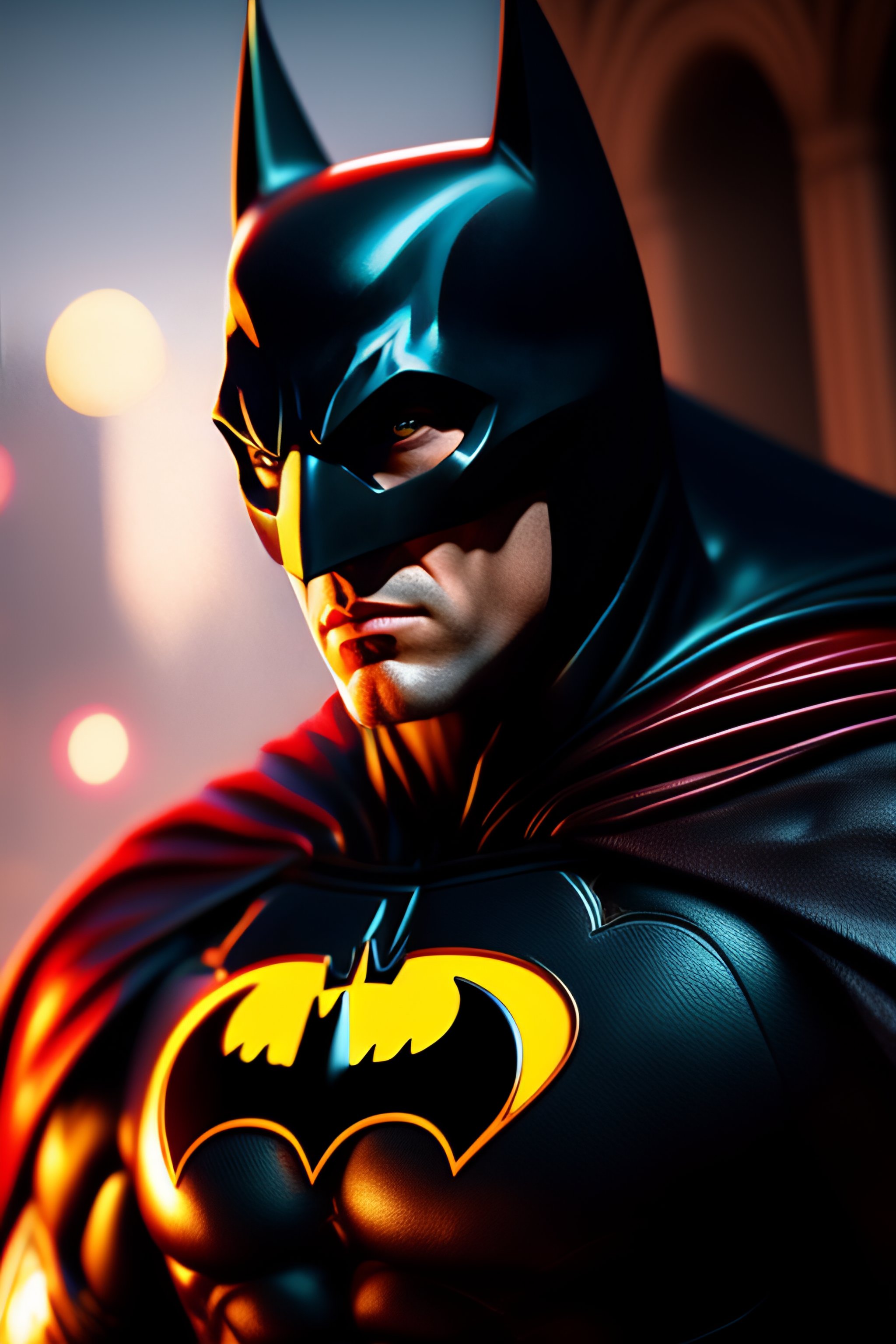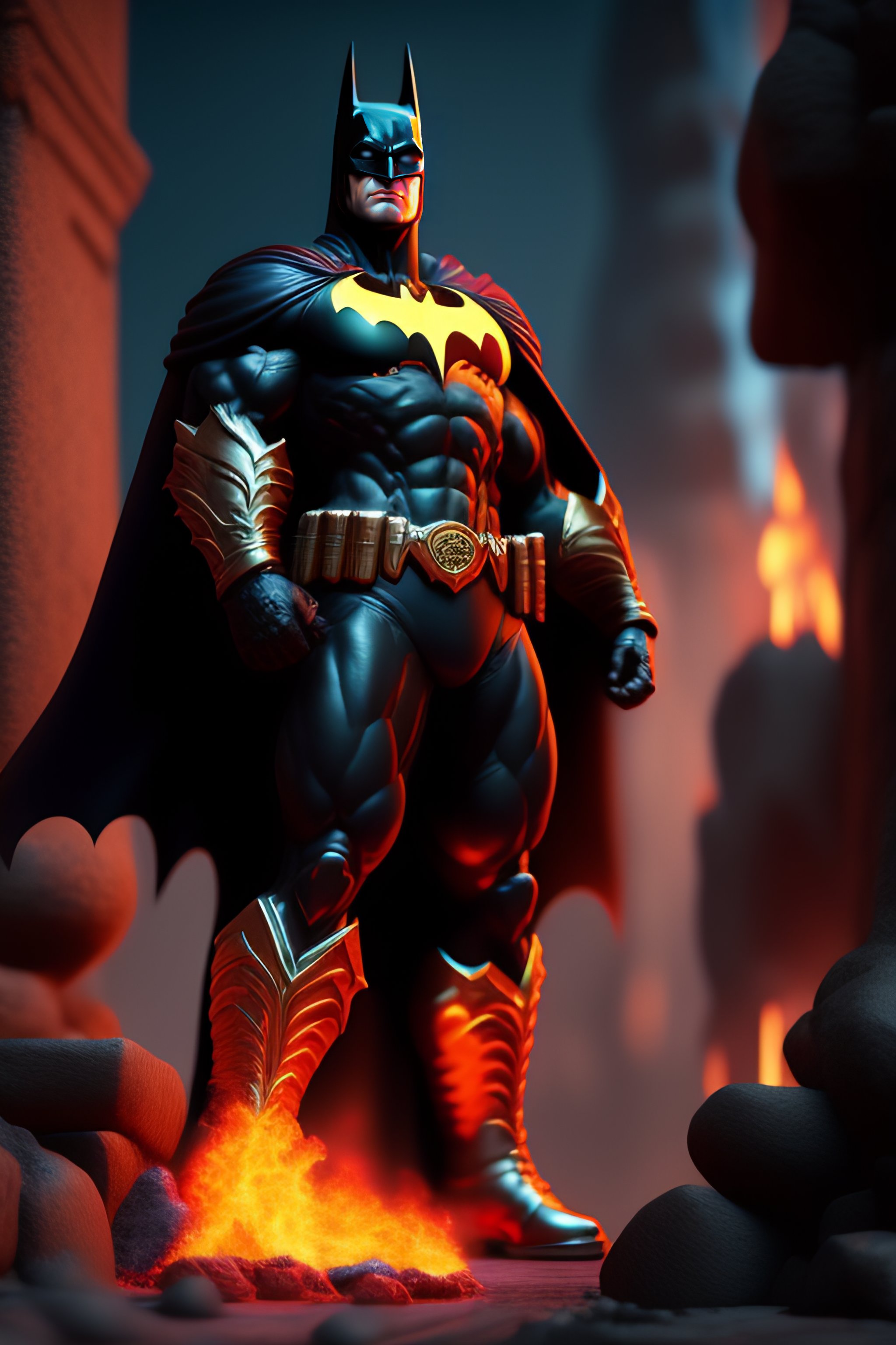 Batman in ancient hellish environment. hyper realistic style, character design, full body portrait, exquisite detail, no depth of field, raytraced, global illumination, colorful