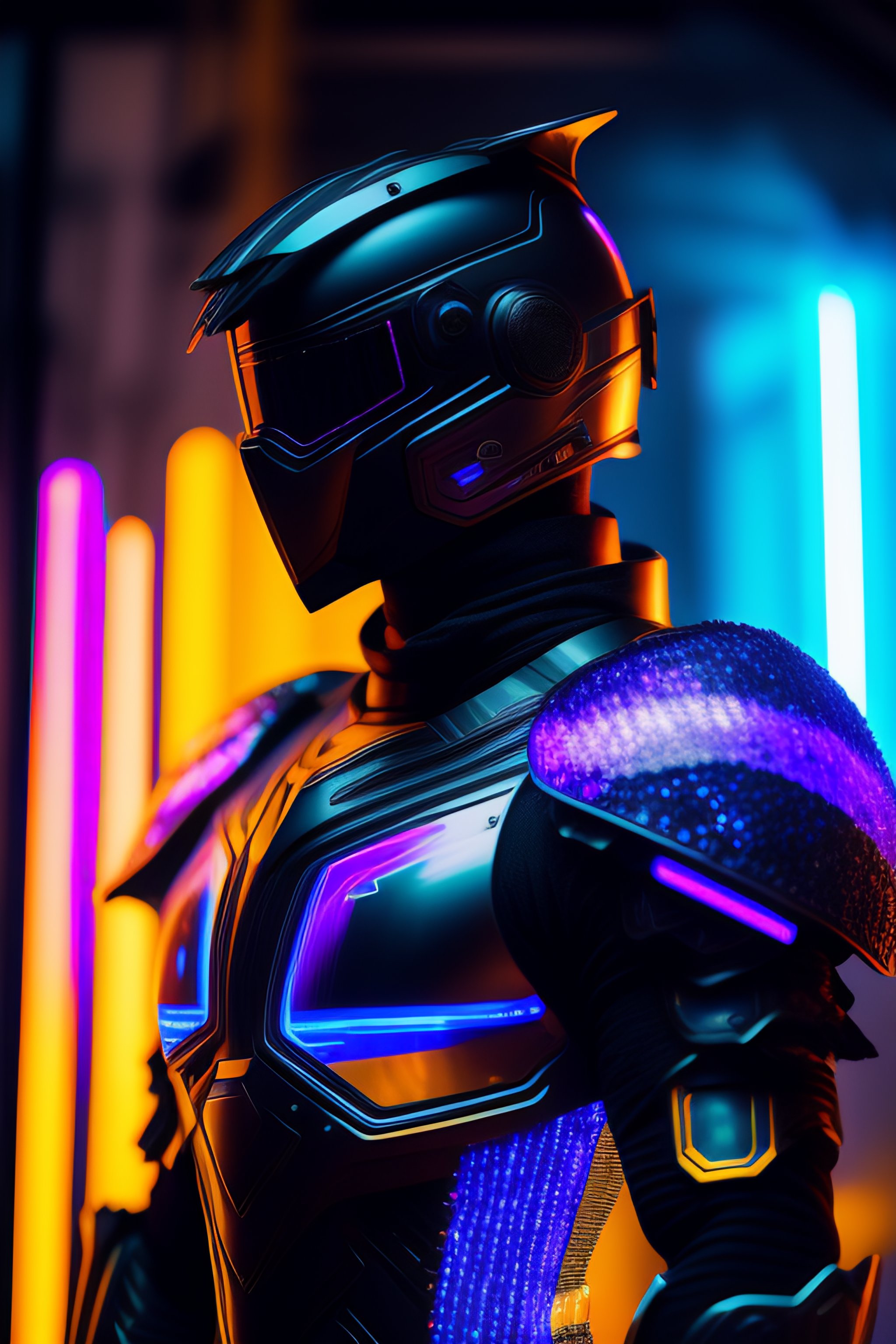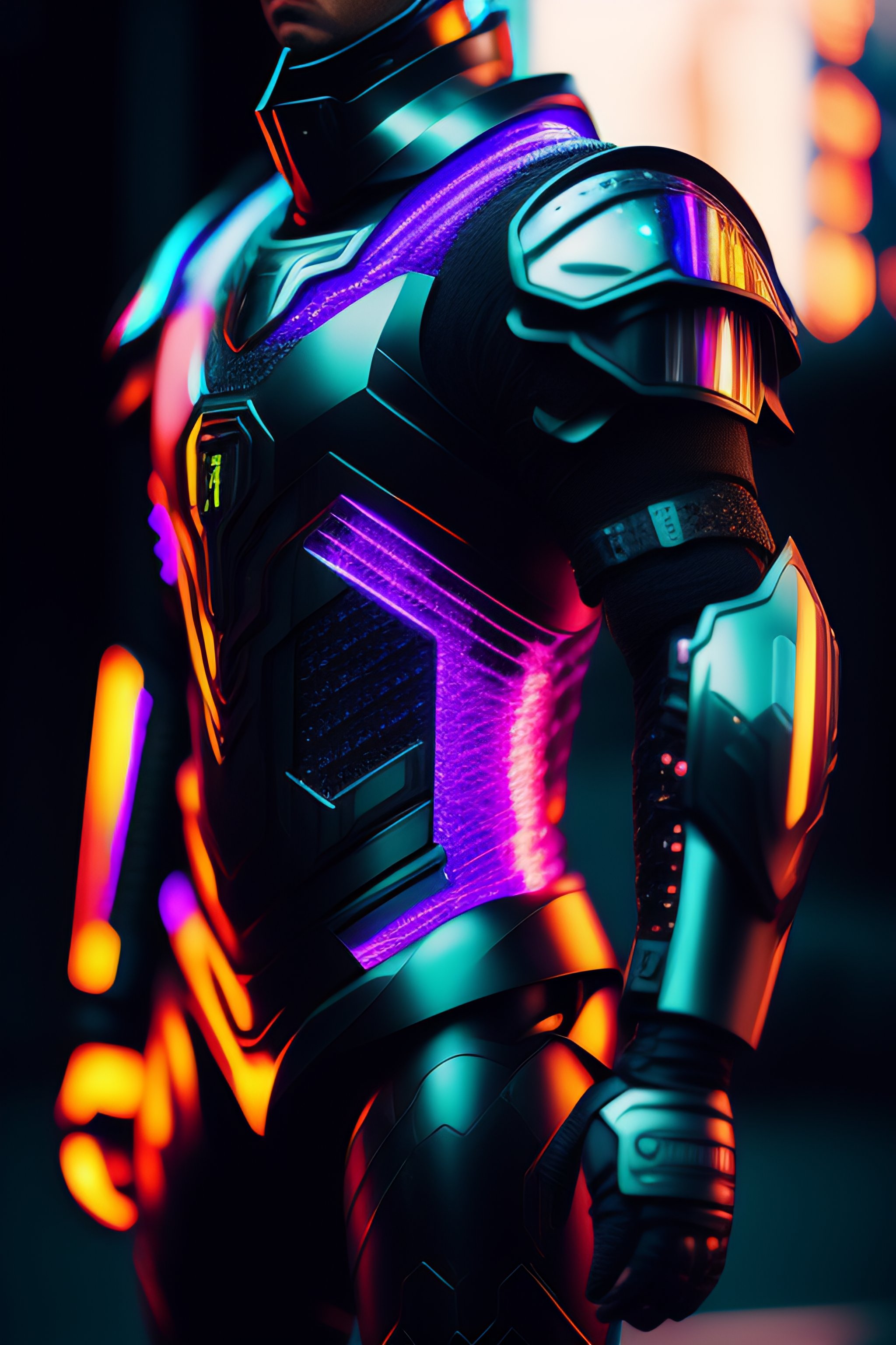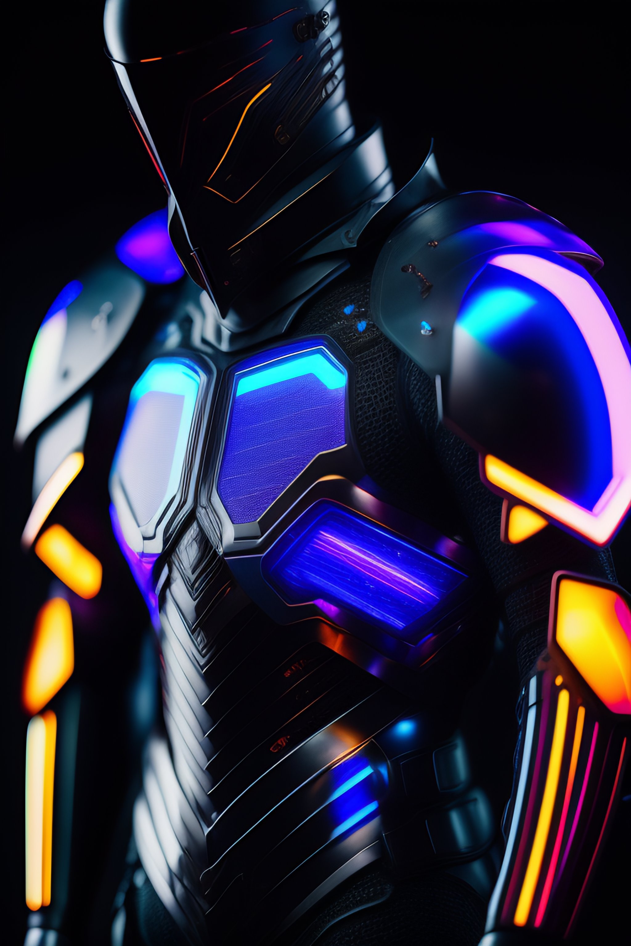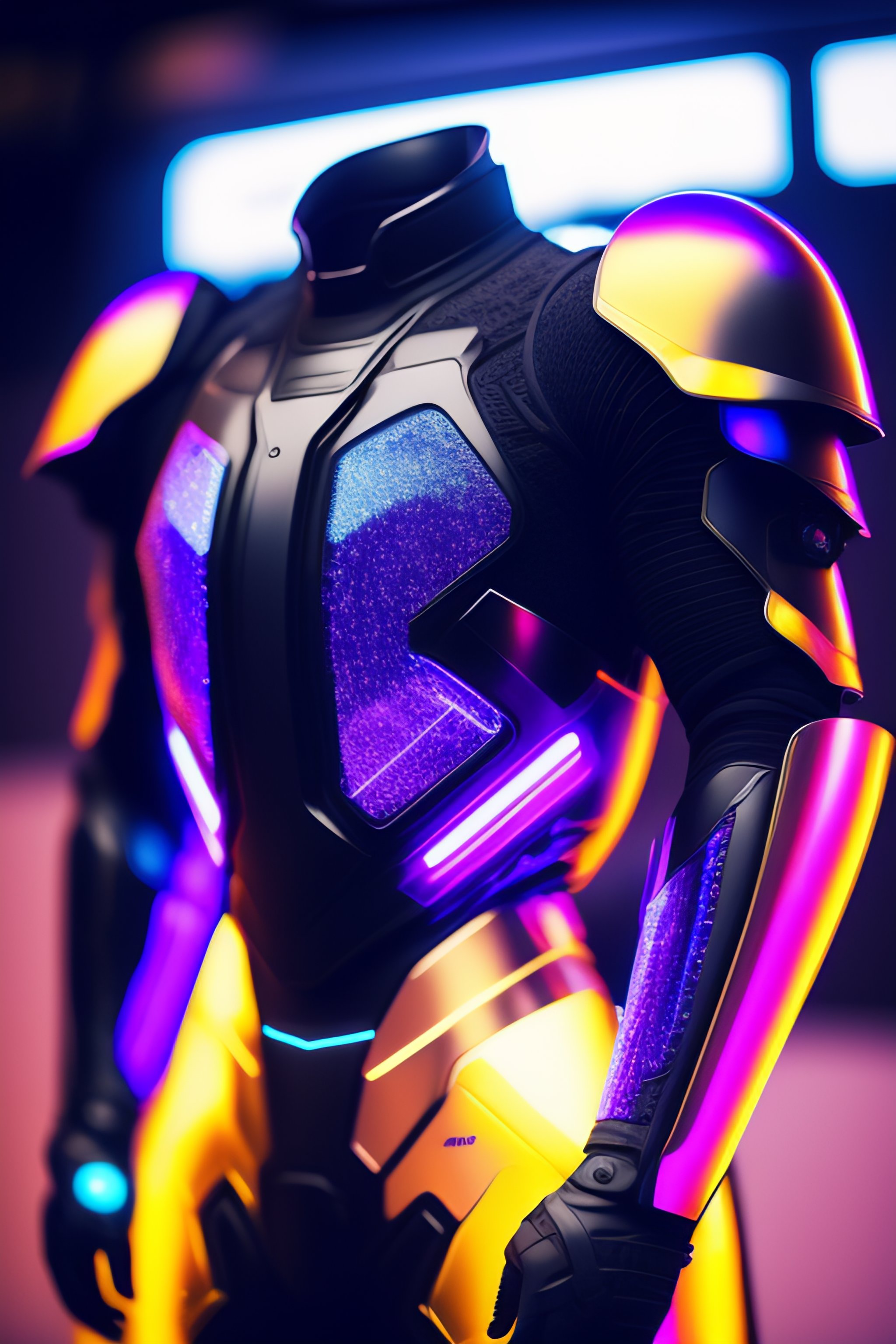 A photograph of a cyberpunk armour made of black titanium and some crystal, rgb leds rainbow, power suit, gradient, crystal, visible wires and microchip, holograph, crystal transparent torso, imposing, elegant, for men, modern minimalism, low poly lines, glitch core, dreamy, colorful, dystopia, godlike, mysterious