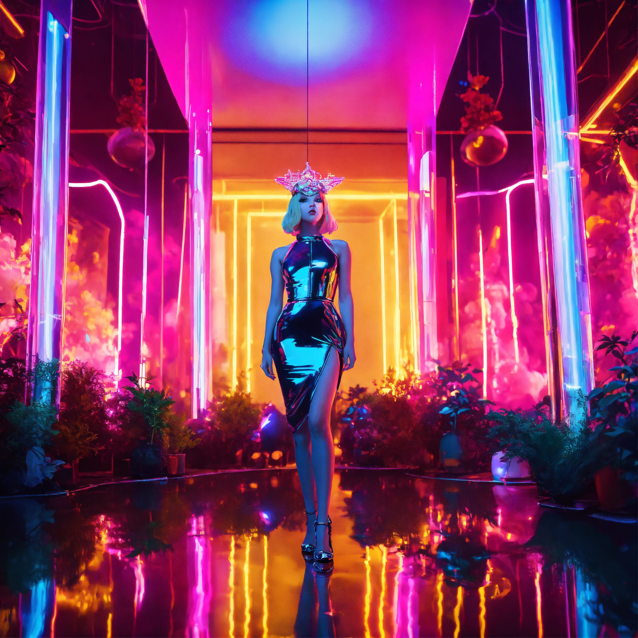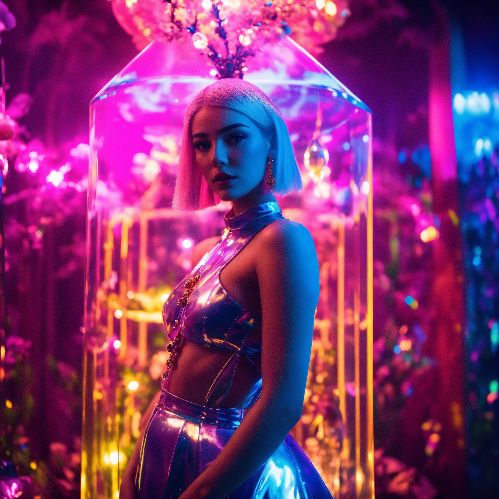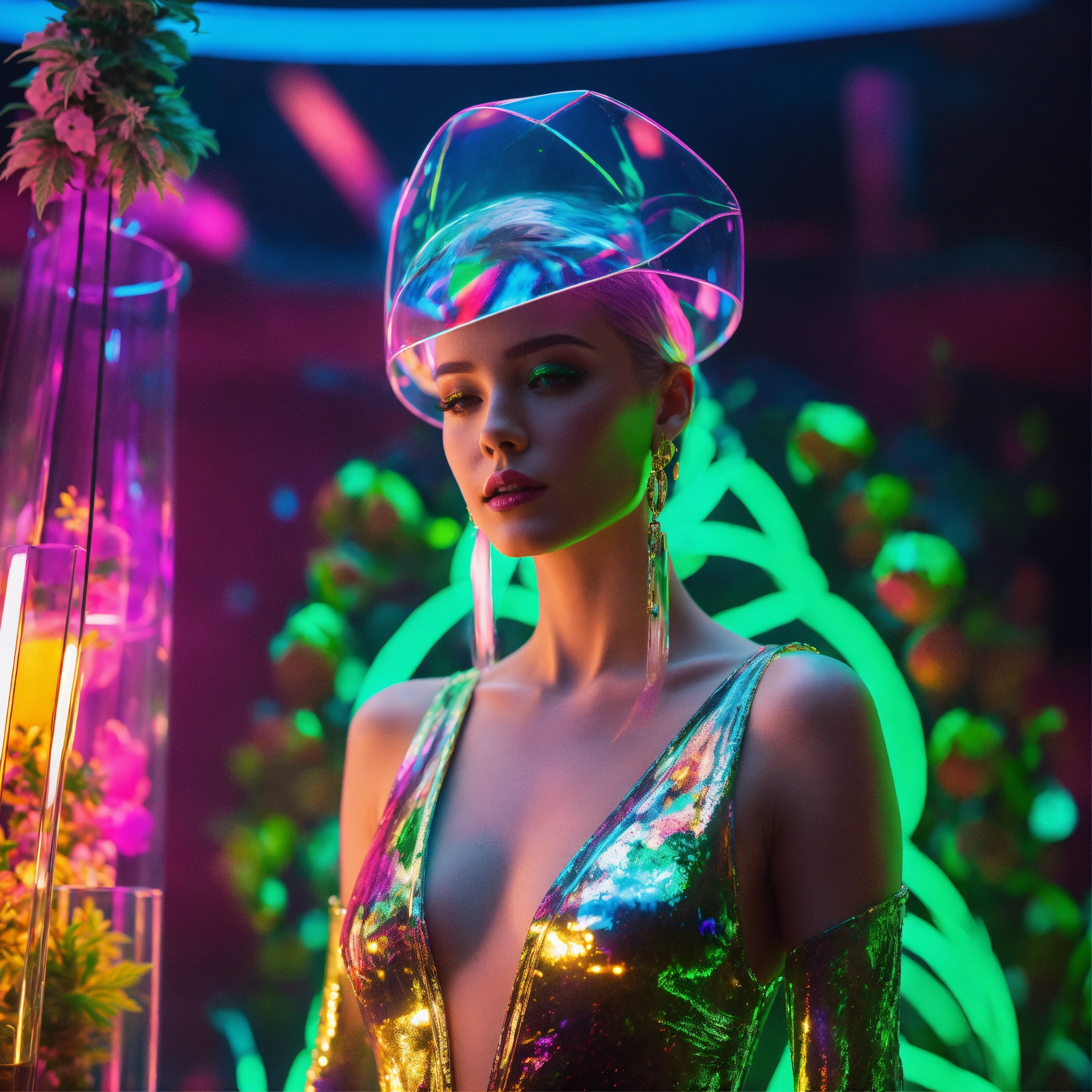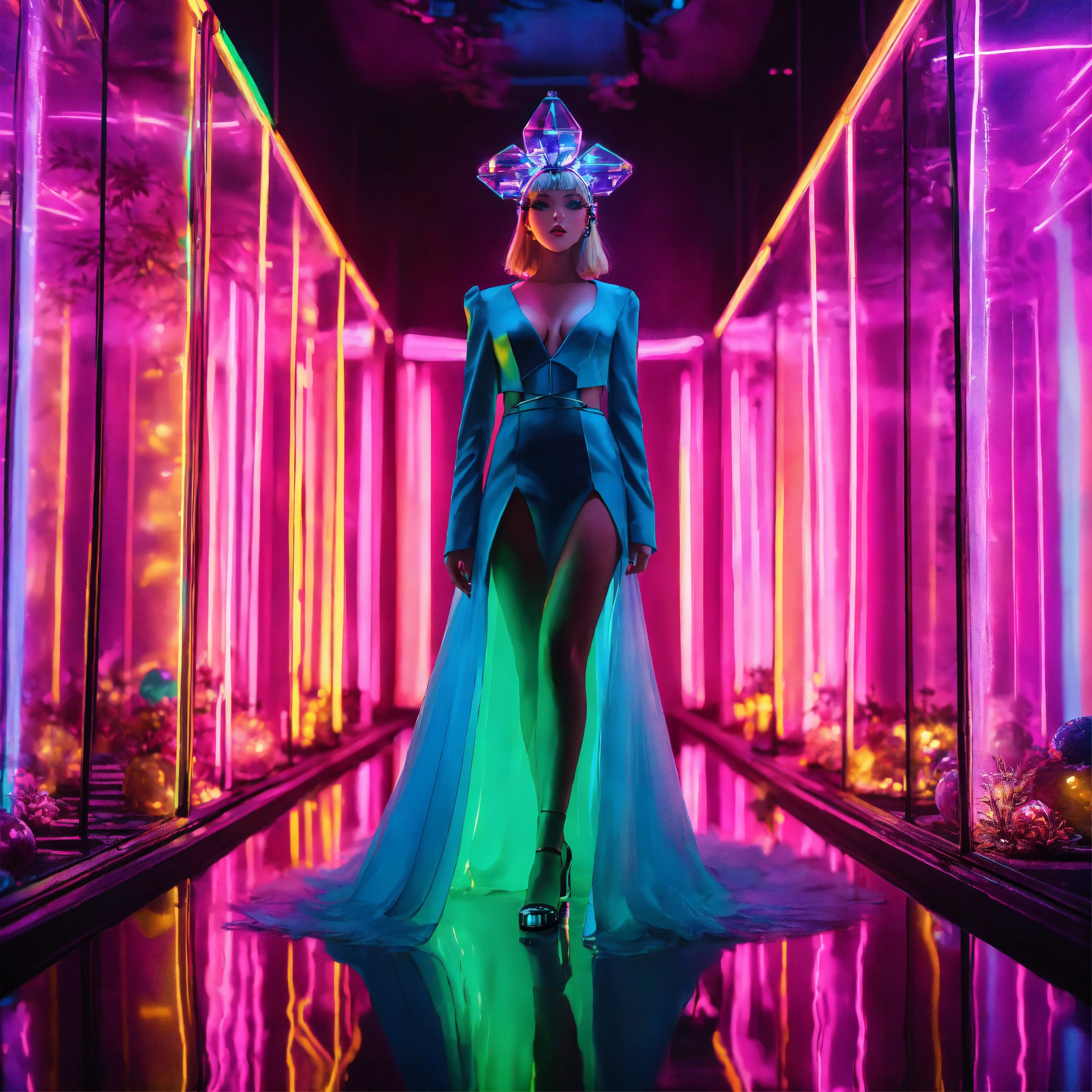 Drone shot of a glass forest and a full body a beautiful futuristic blonde female pop artist in a glass dress all pastel sleek futuristic outfit, with huge headpiece center piece, clean makeup, with depth of field, neon smoke and glass fruits lights with many acid reflections. fantastical edgy and regal themed outfit, captured in vivid colors, embodying the essence of fantasy, minimalist. 8k 16k 32k 64k 128k iredescent shadows and real reflections. super camera shot, movie quality. glass shadows and oil cannabis trees. glass fruits and gold cannabis trees in matte pots. waterfalls and reflections. neon smoke trees.