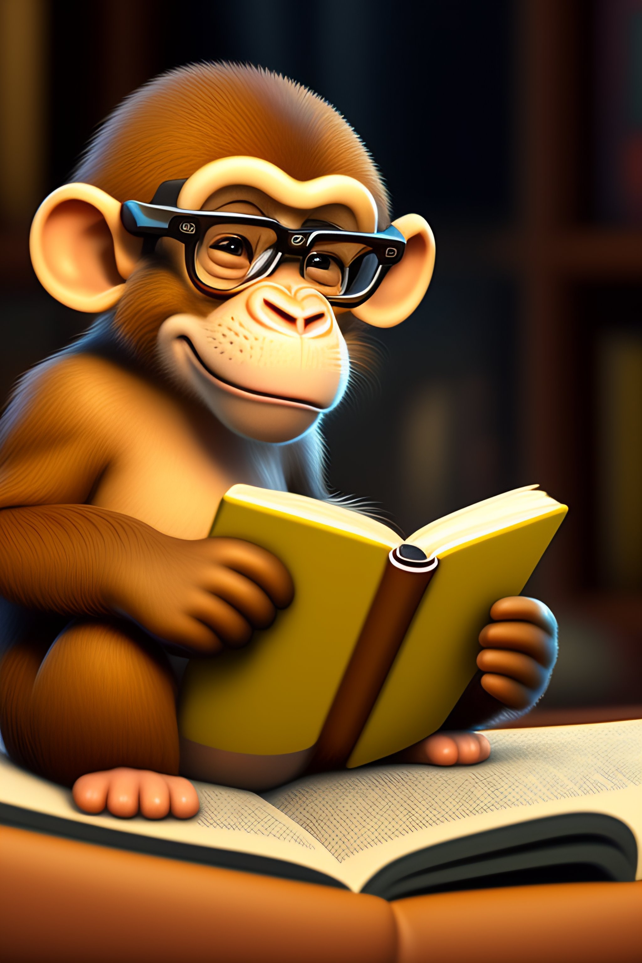 Pixar art of a funny smiling monkey reading a book with glasses