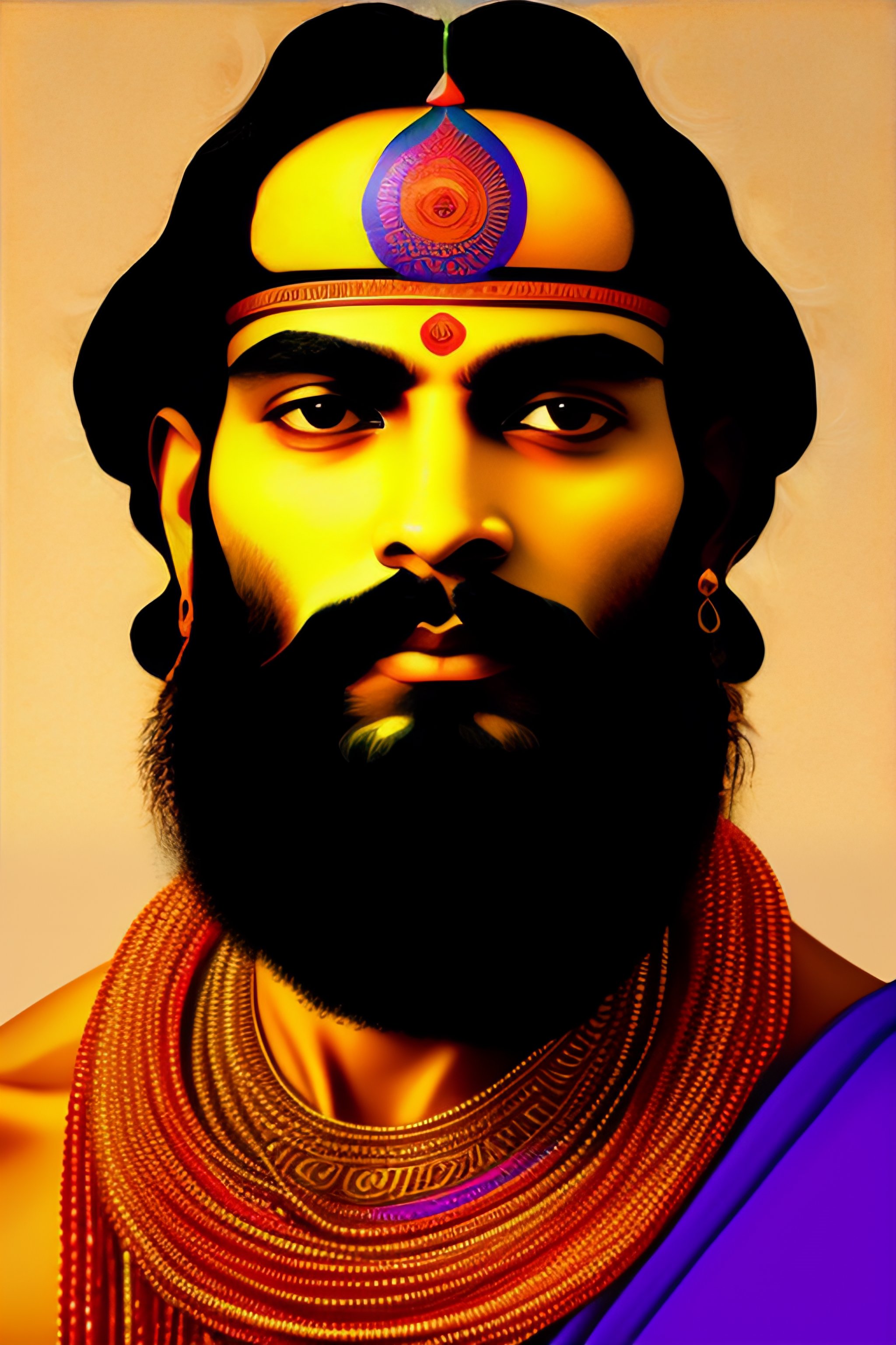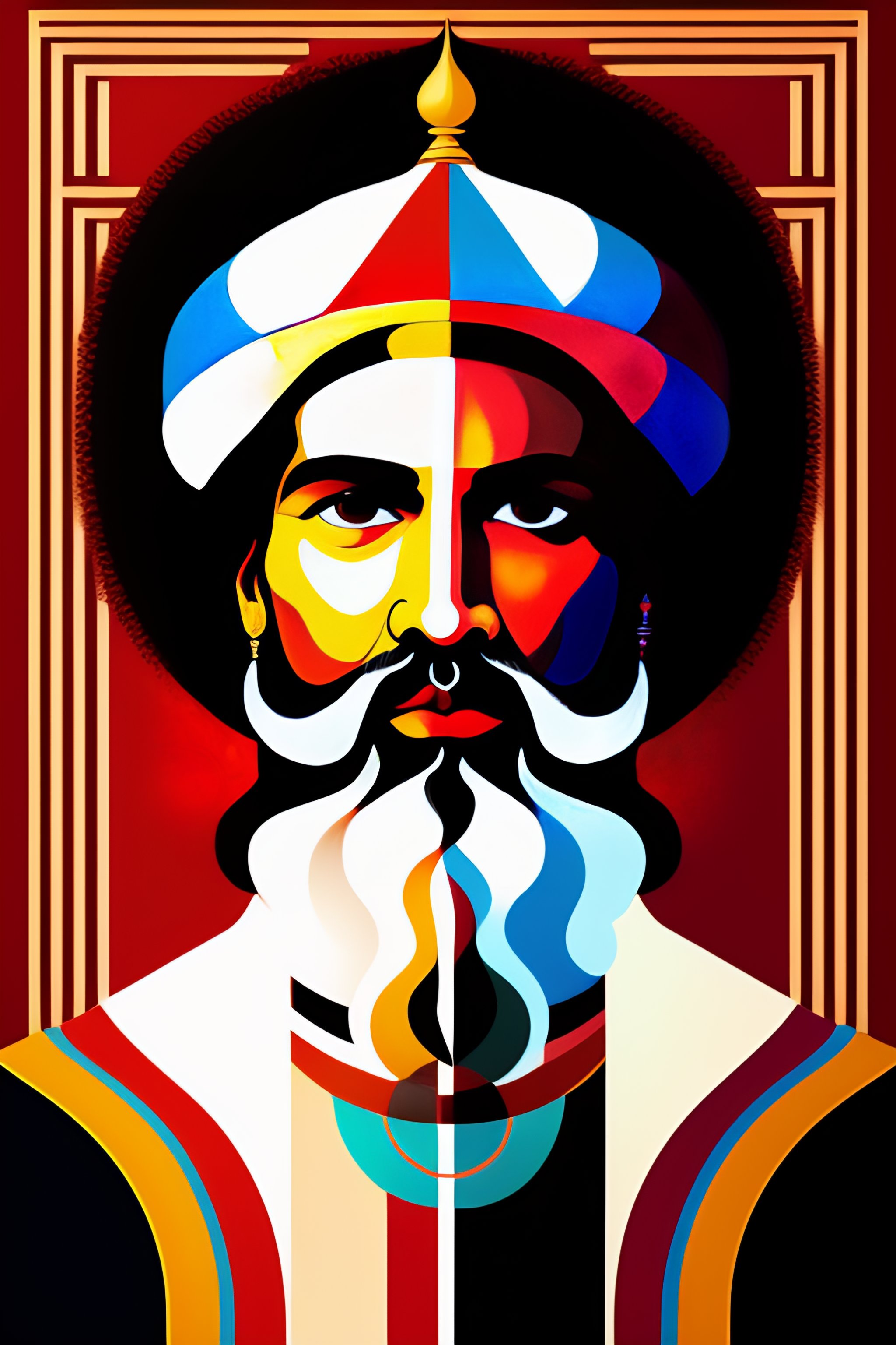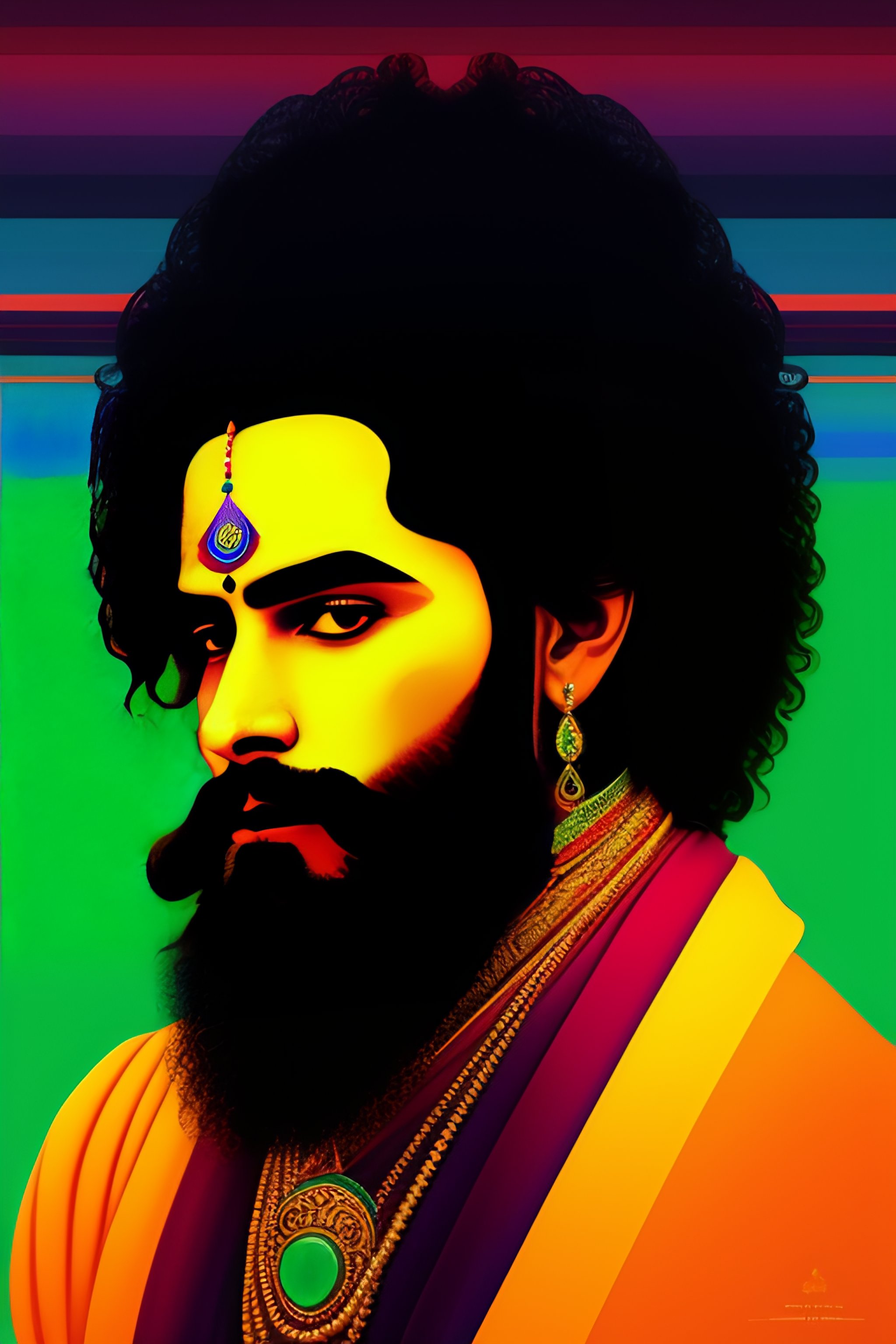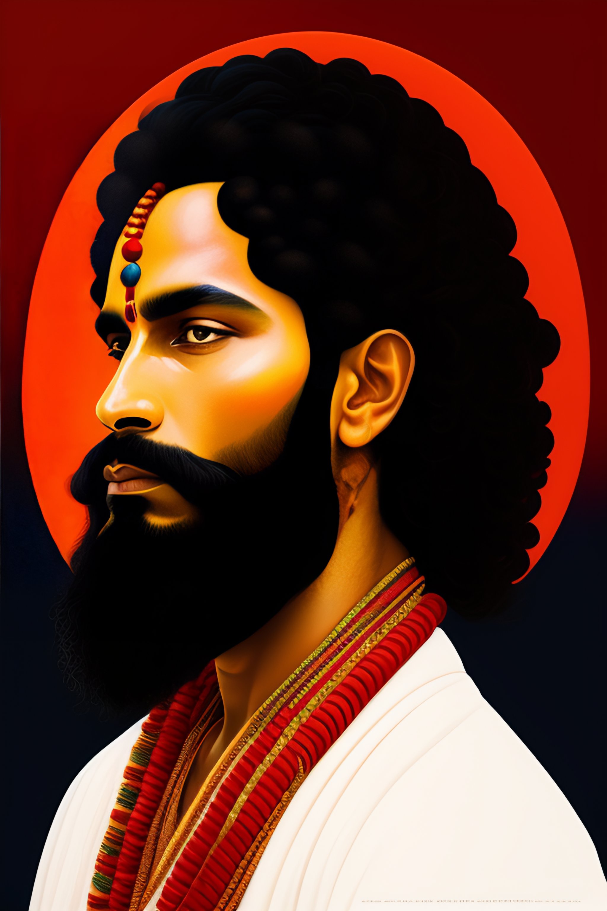 Portrait of an ancient hindu brahmin monk with curly long hair and beard, serious face, in the style of french artist and illustrator malika favre, characterized by pure minimalism within pop art and op art, sometimes described as 'pop art meets op art', tilak on forehead