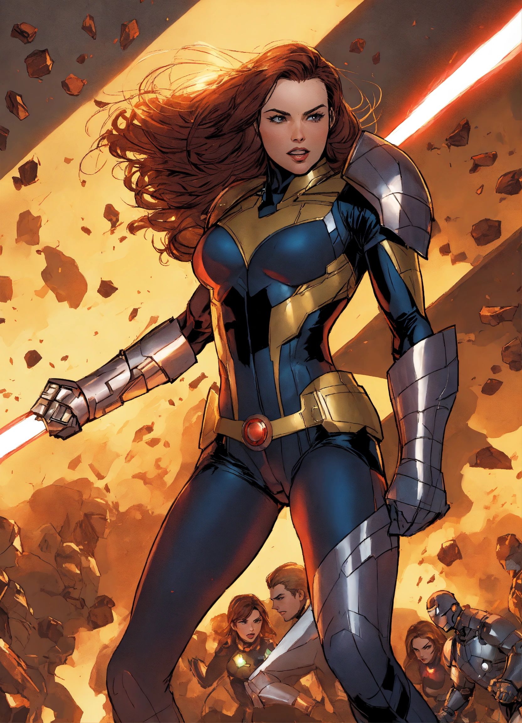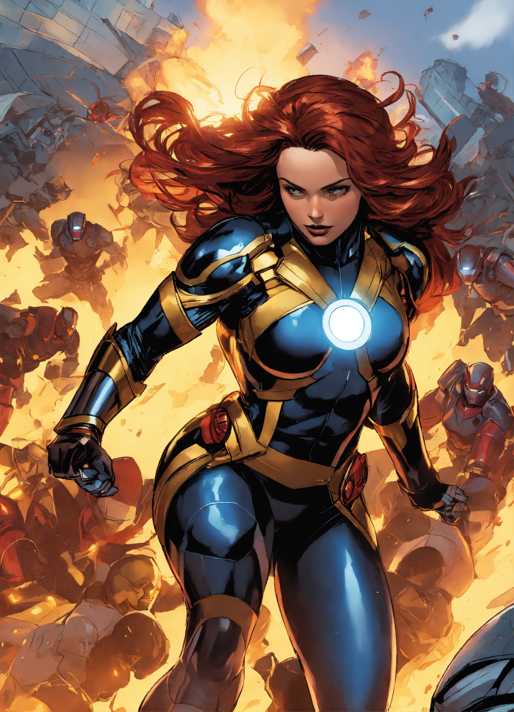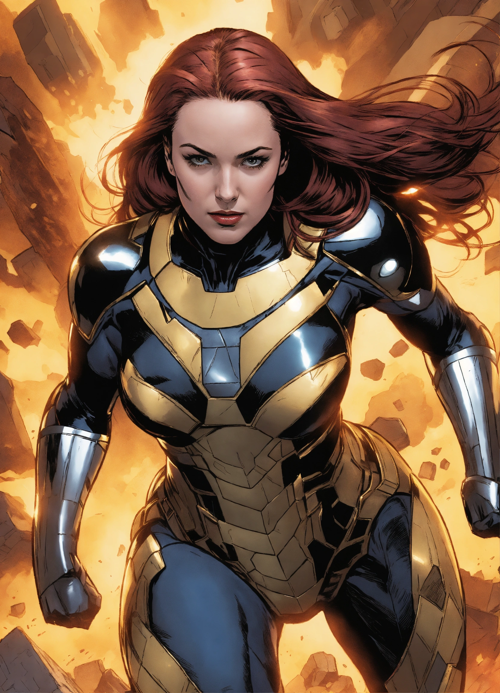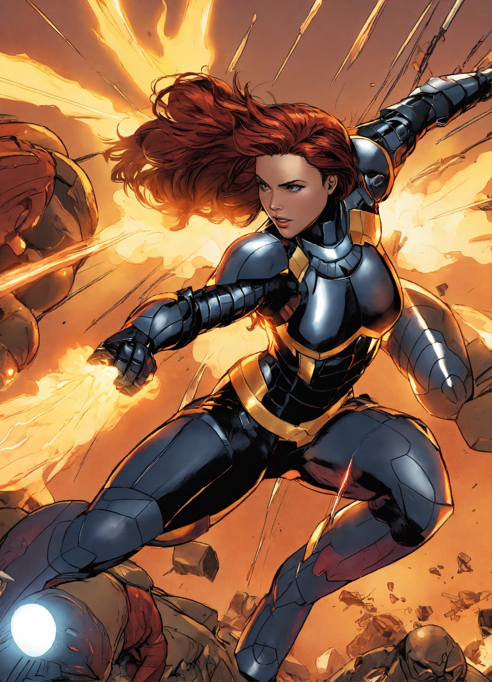 Female x-men shadowcat wearing metal black iron man armor dominating a battle