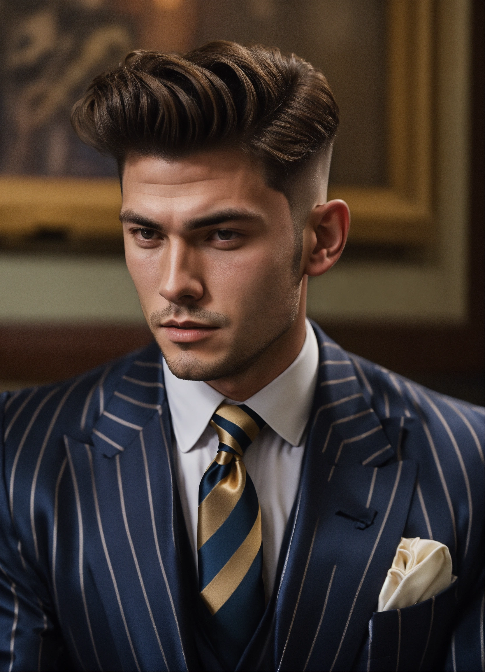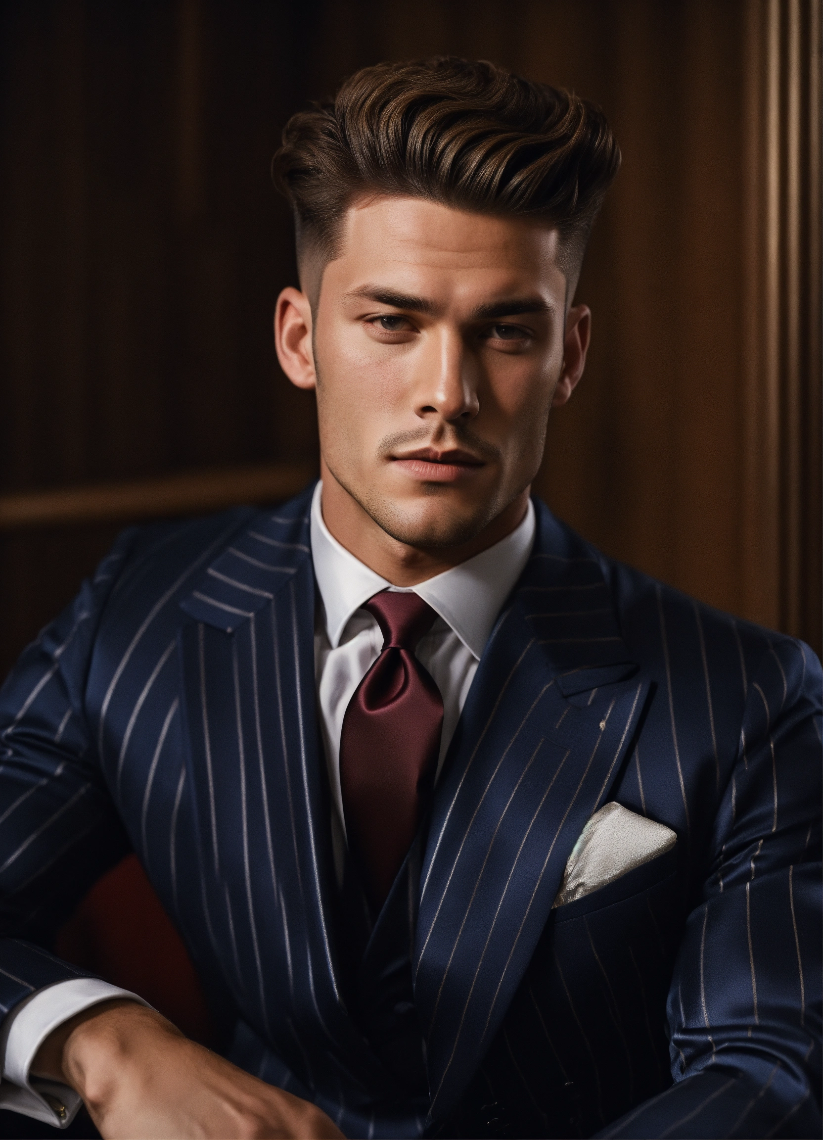 Portrait of hansome young brown lightly wavy pompadour with fade, muscled sportsman in navy satin large pinstripe double breasted suit, club tie, pompadour haircut