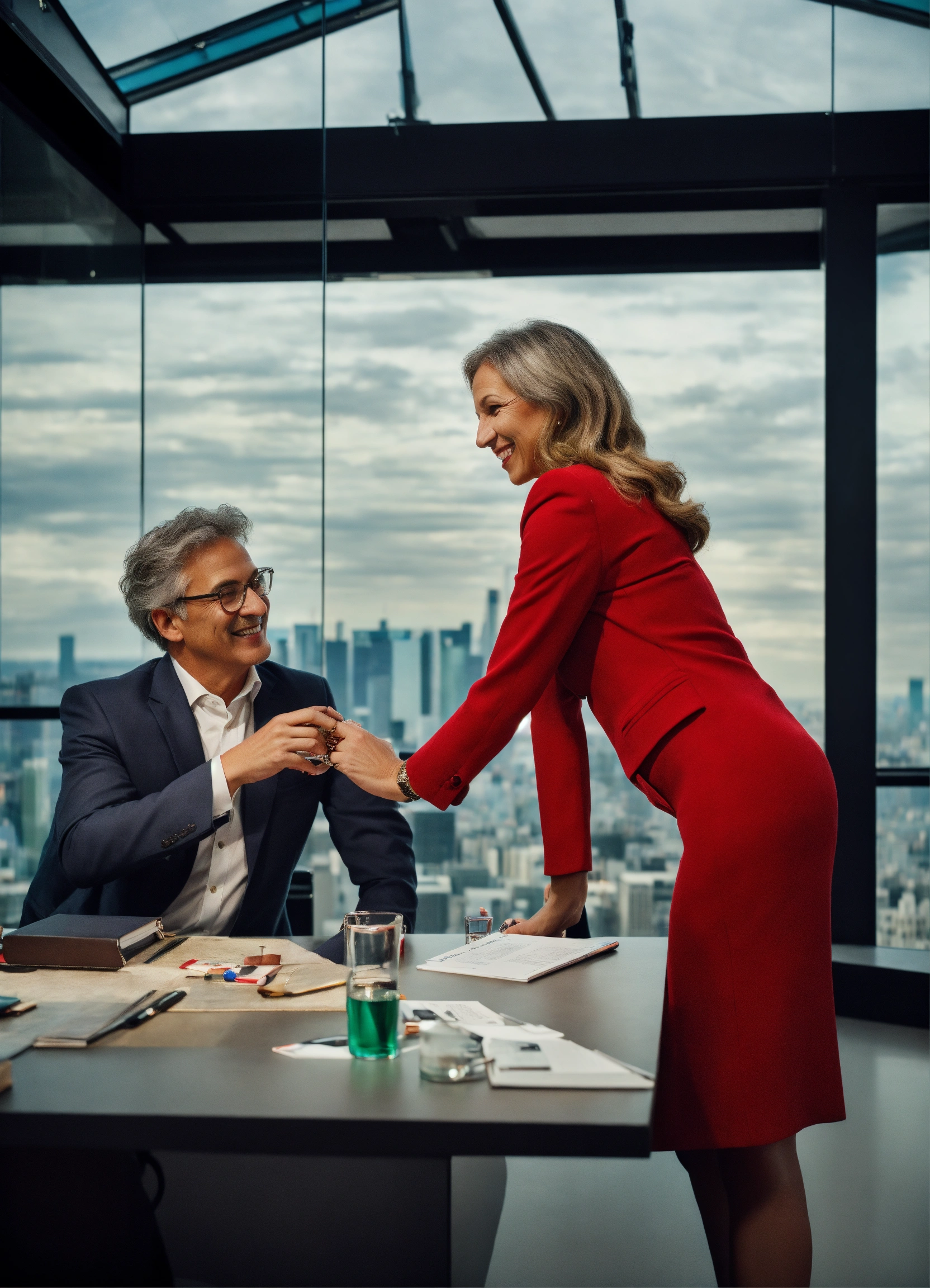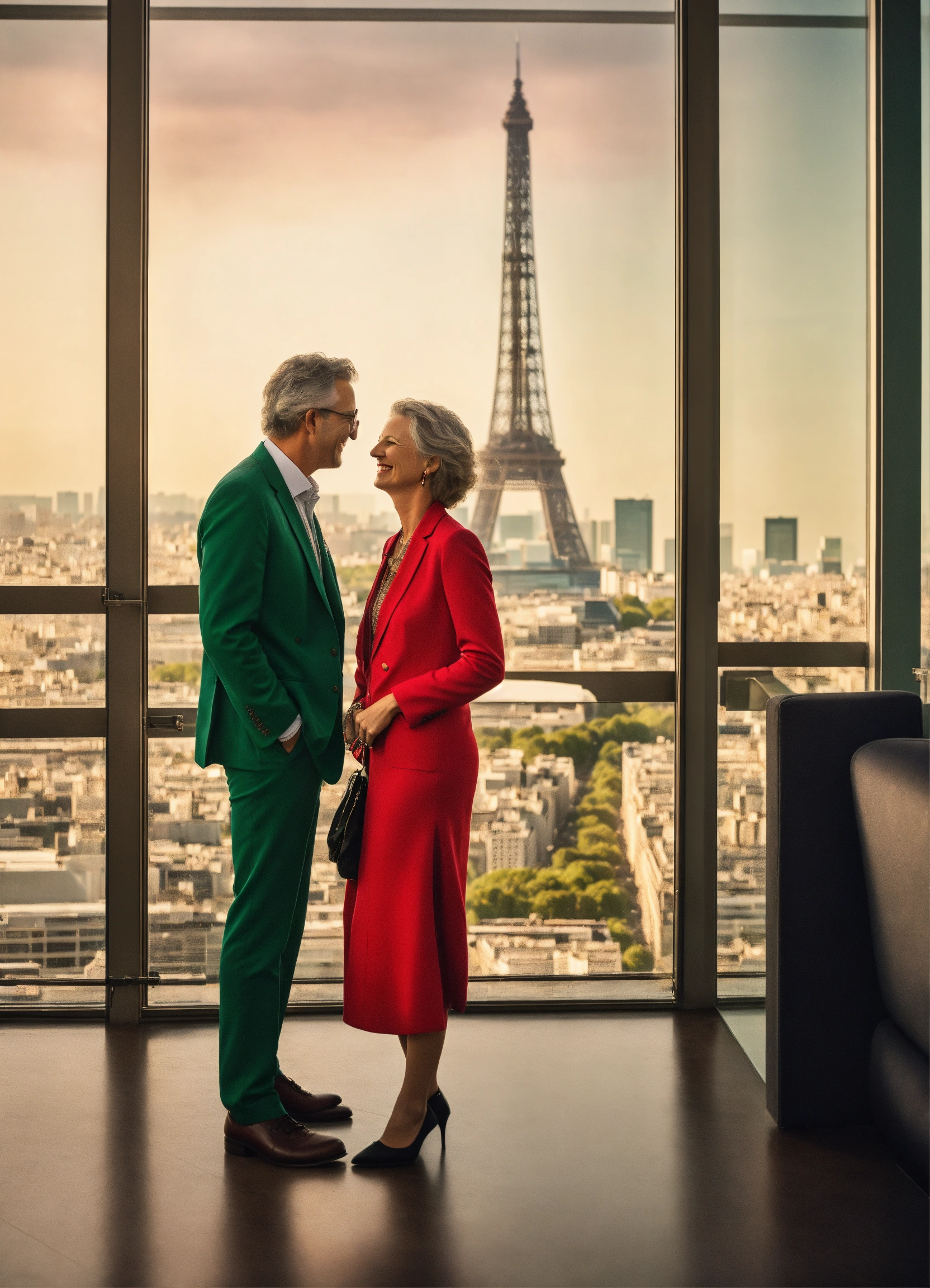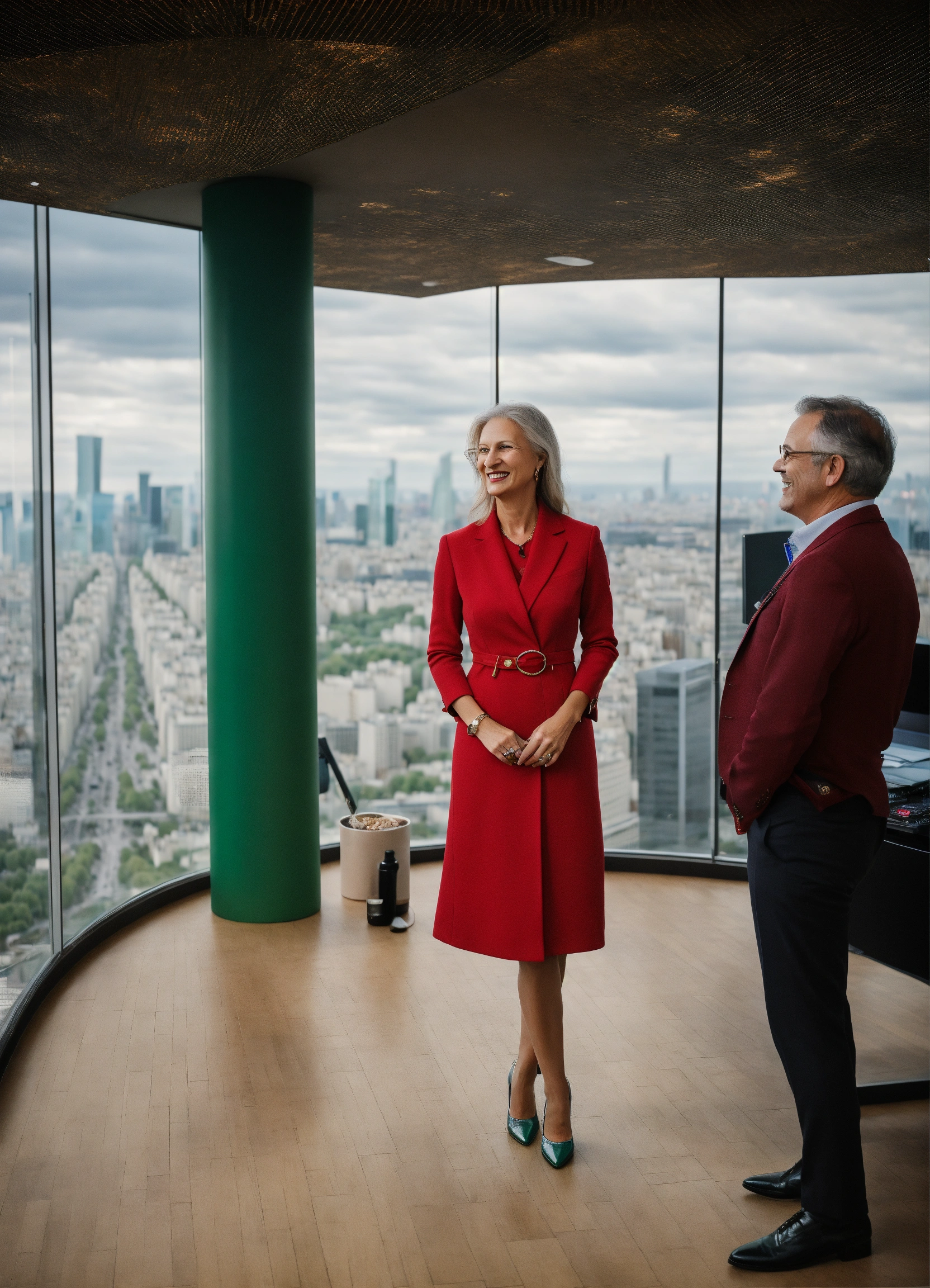 Create a 169 wide-angle, hdr, 4k resolution image that encapsulates the essence of annie leibovitz' photography style. the setting is in a creativity room, in france at la défense with expansive windows offering a panoramic view of the city. the atmosphere should be, bright, and modern. two persons speaking together, one convinced woman in her twenties she is dressed in red business woman dress, she is logical and organised speaking with one man in his fifties, he is dressed in a causal green suit decontract and smiling.
