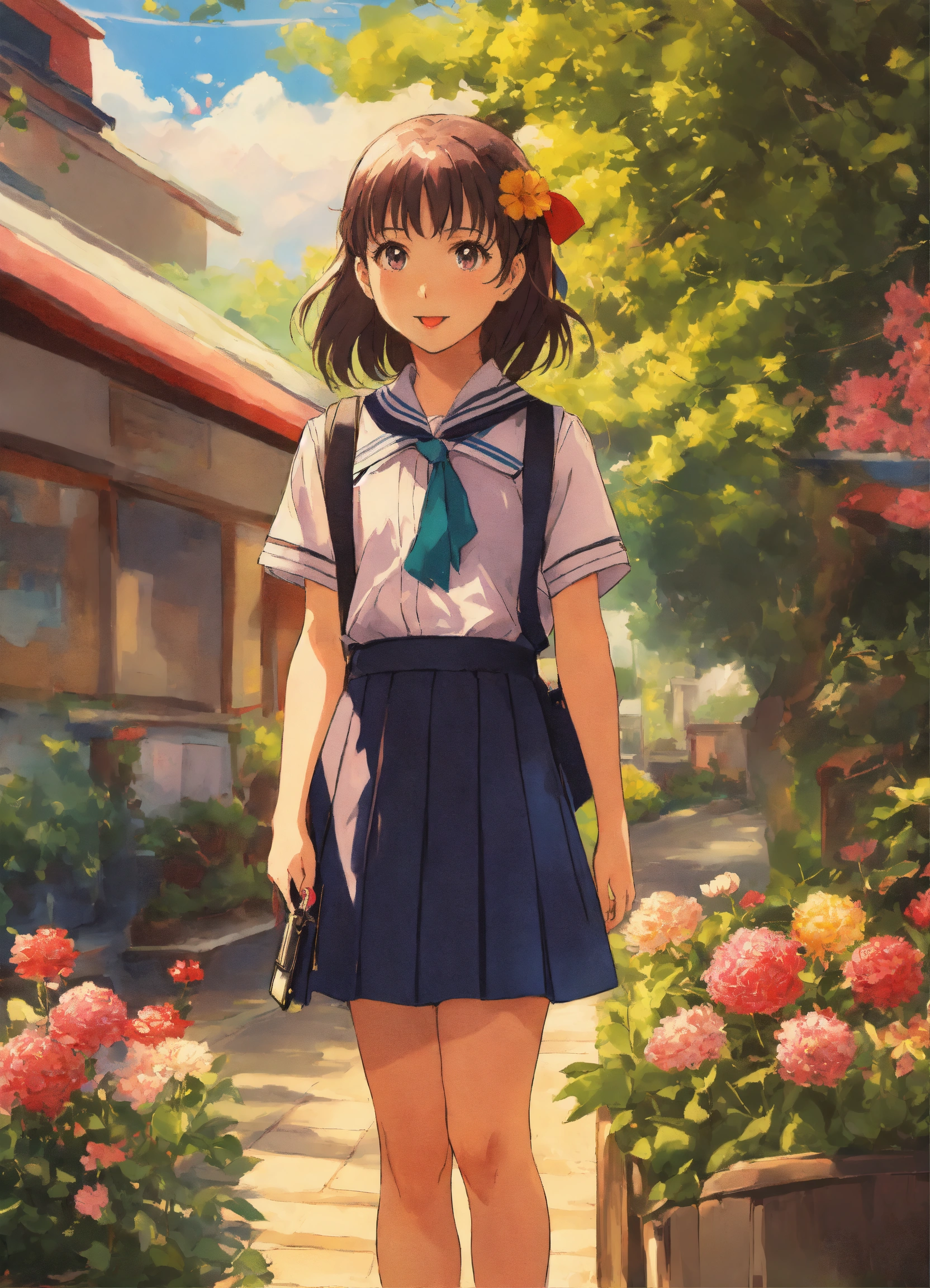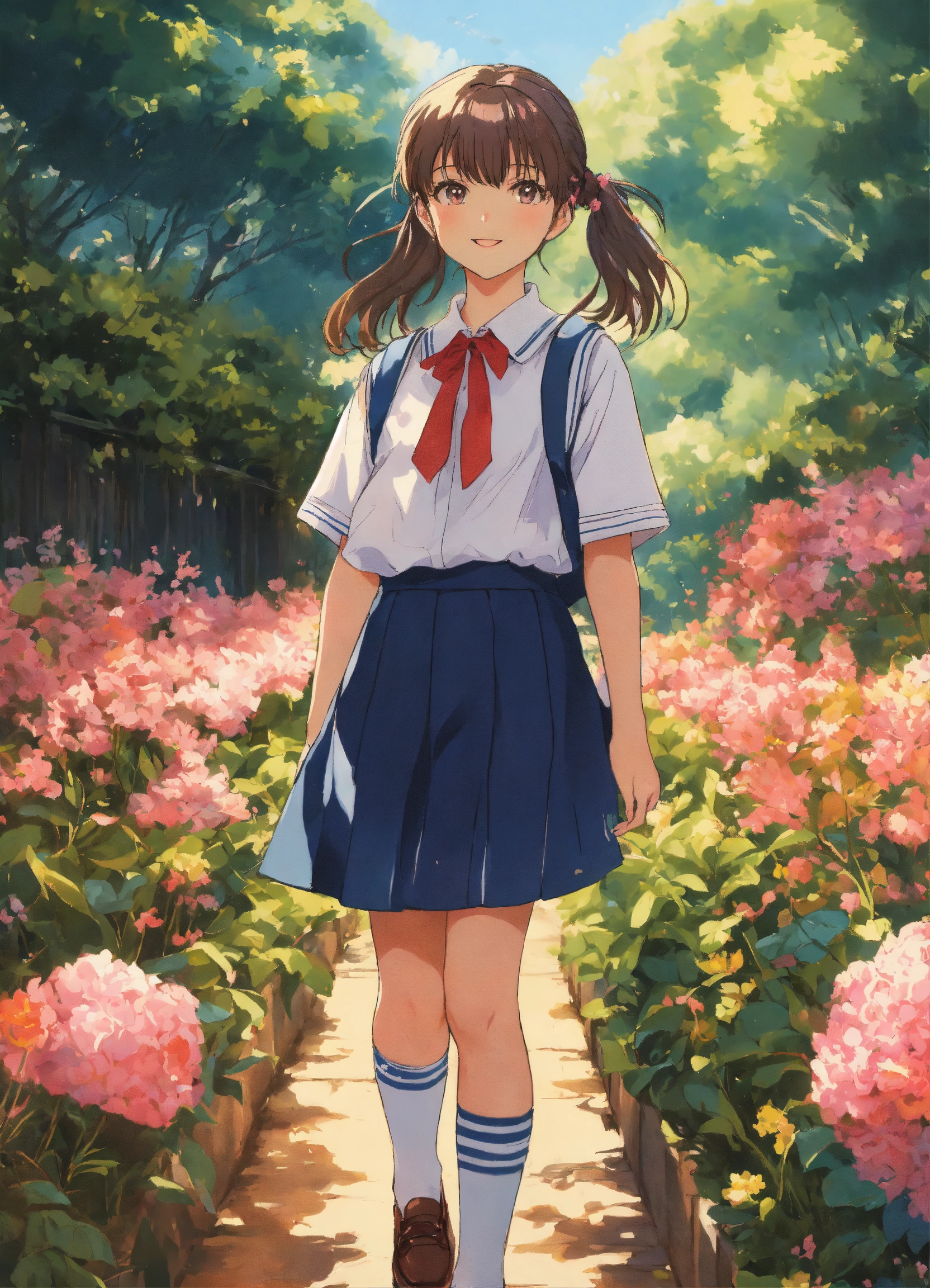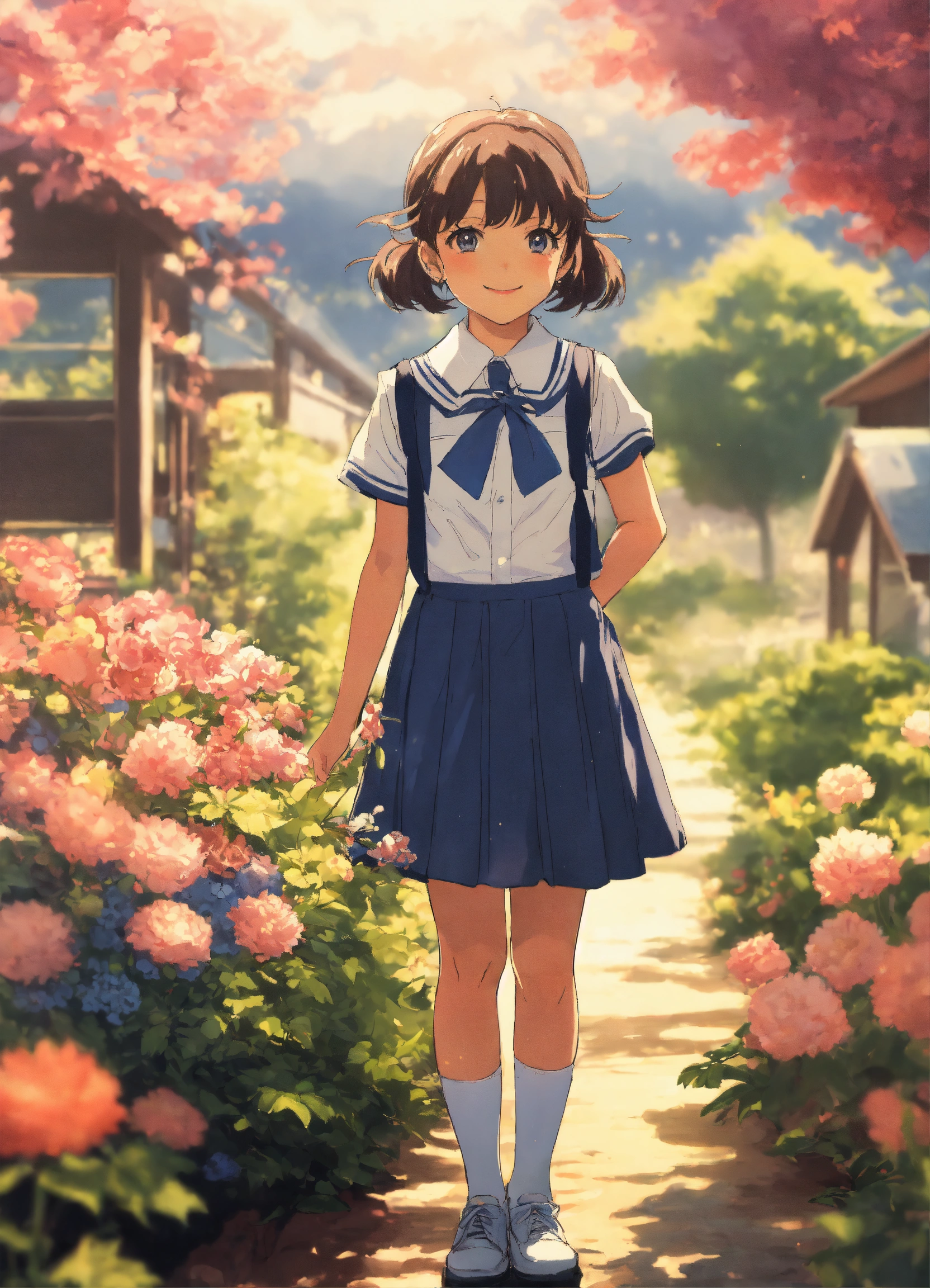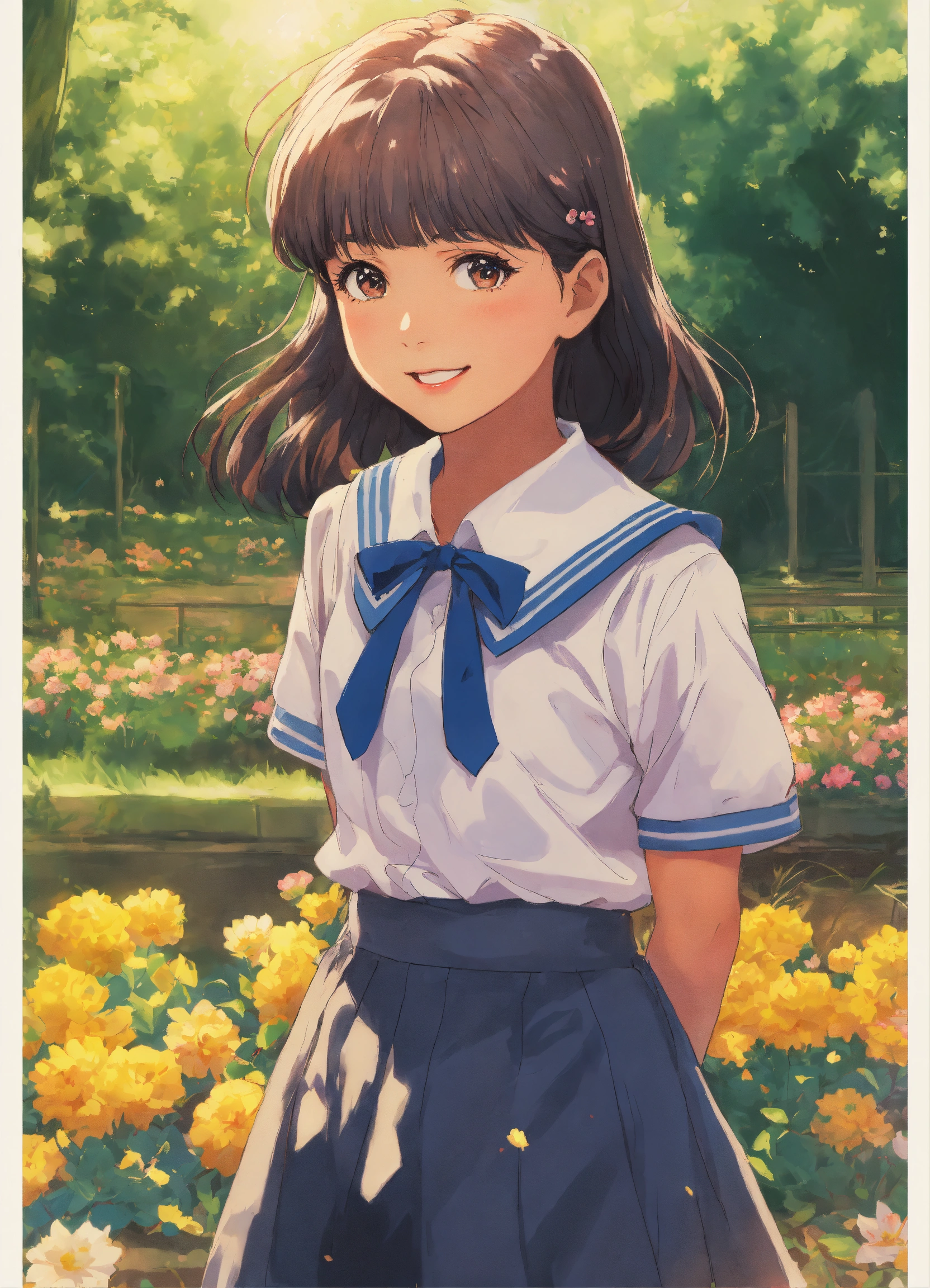 Anime style art of a young girl in a seifuku, happy, beautiful, outdoors, sunny, flowers, vintage 80s style anime art, 8k, young girl, seven years old, elementary school age, adorable, stunning detail, realism