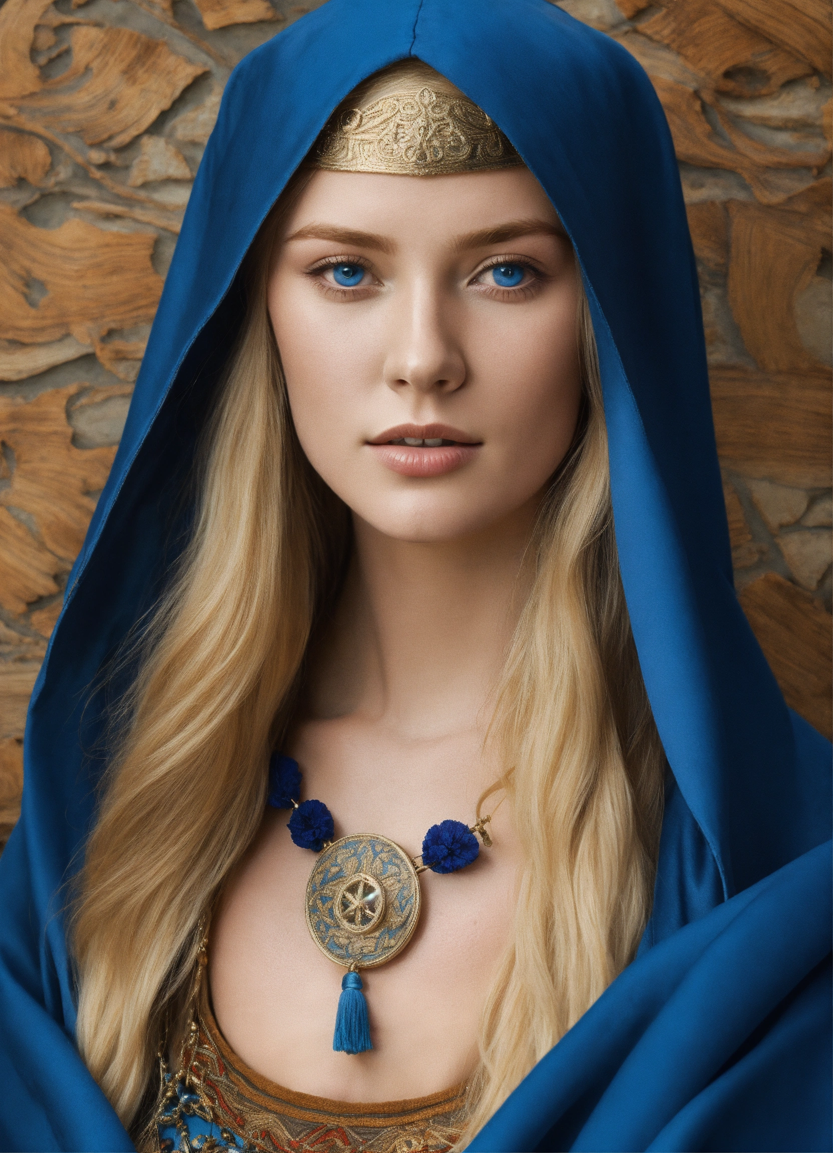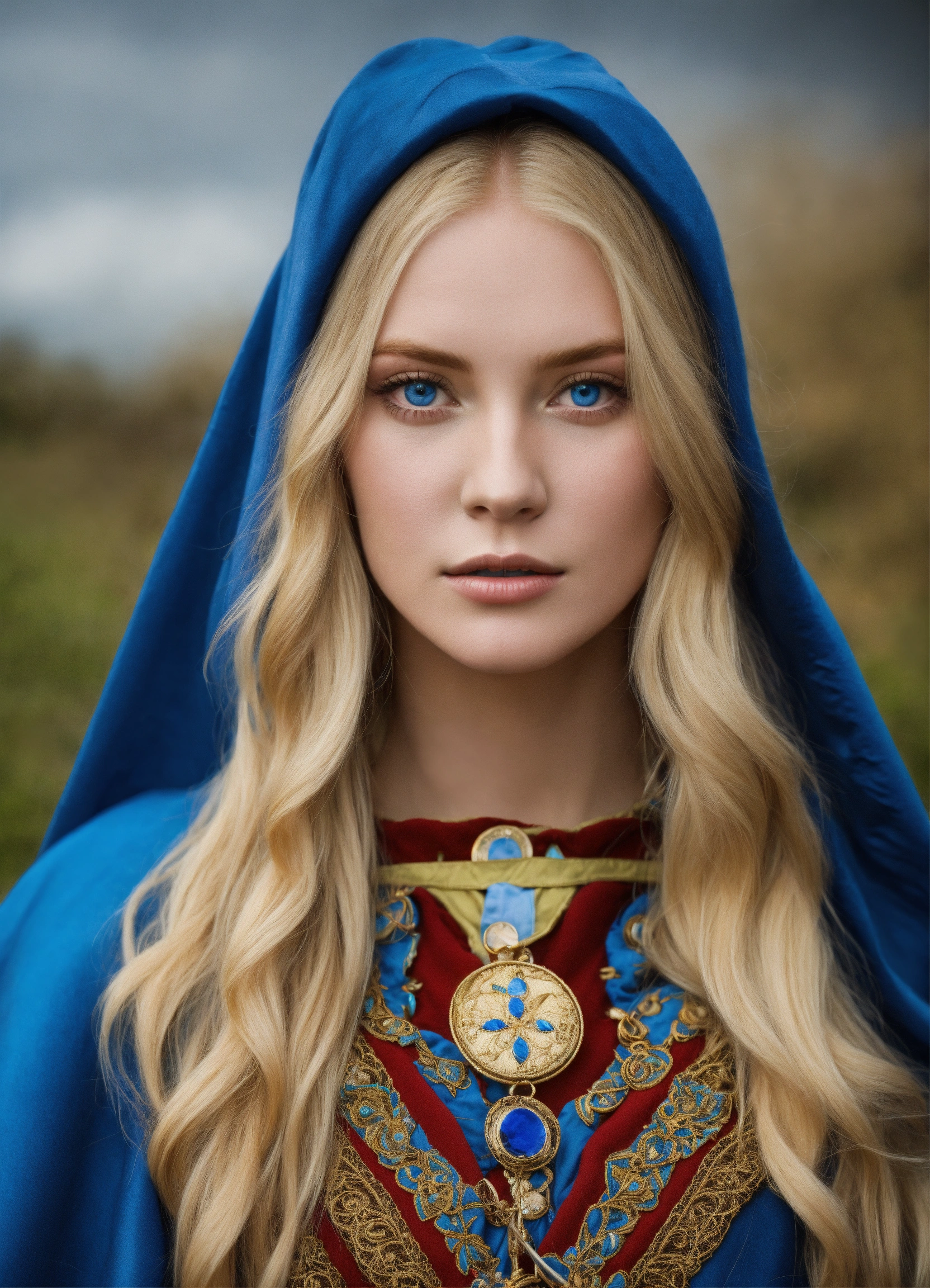 Anglo saxon blonde woman with blue eyes and blue cloak