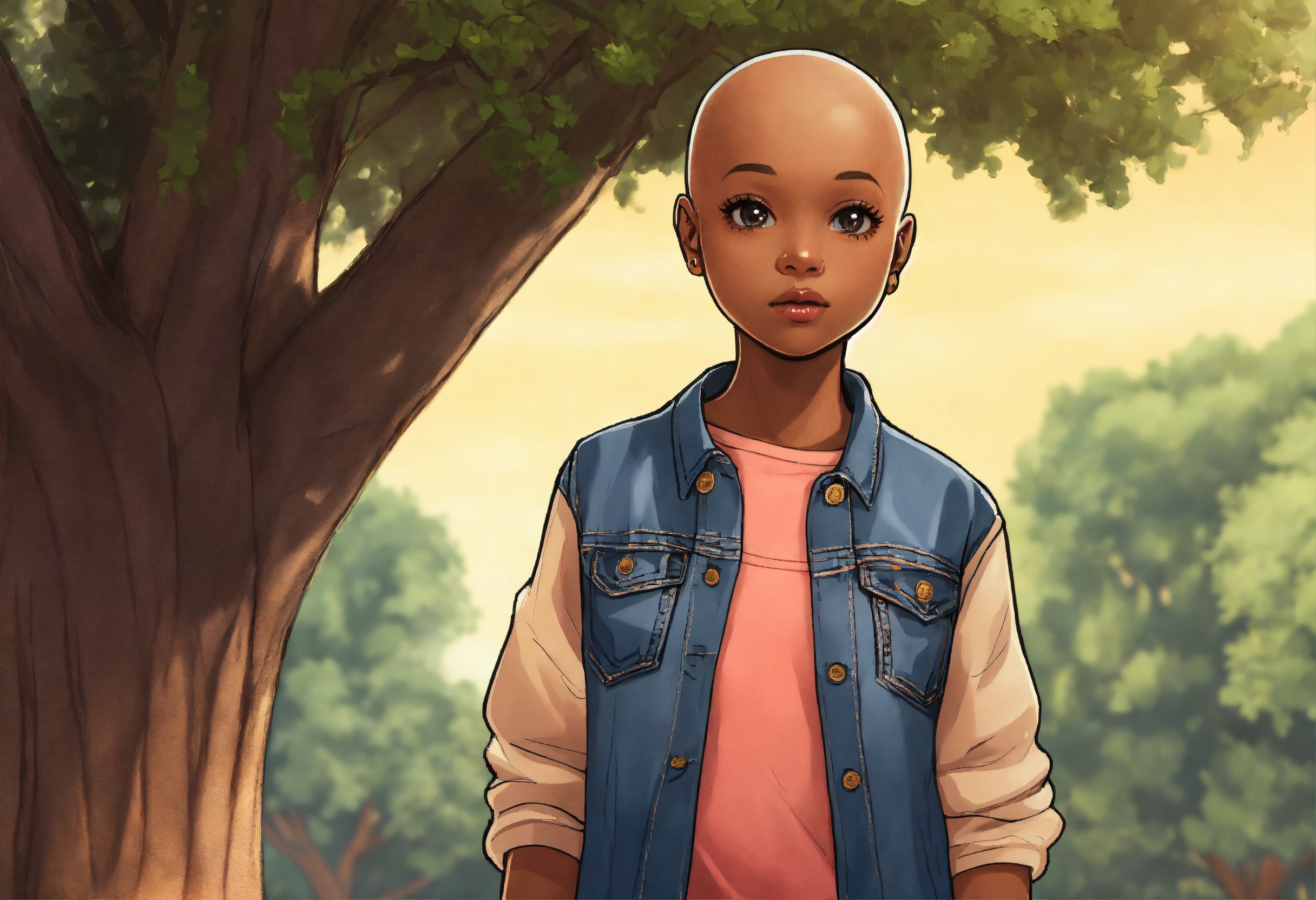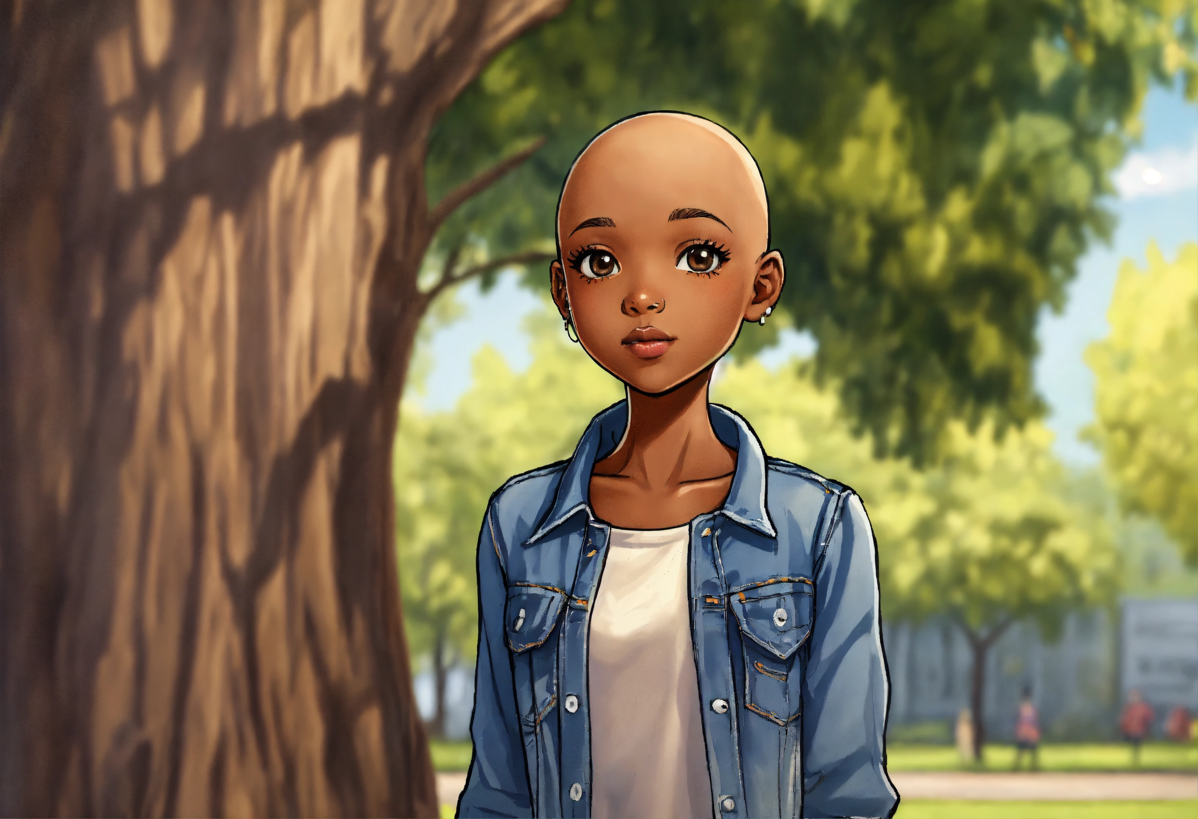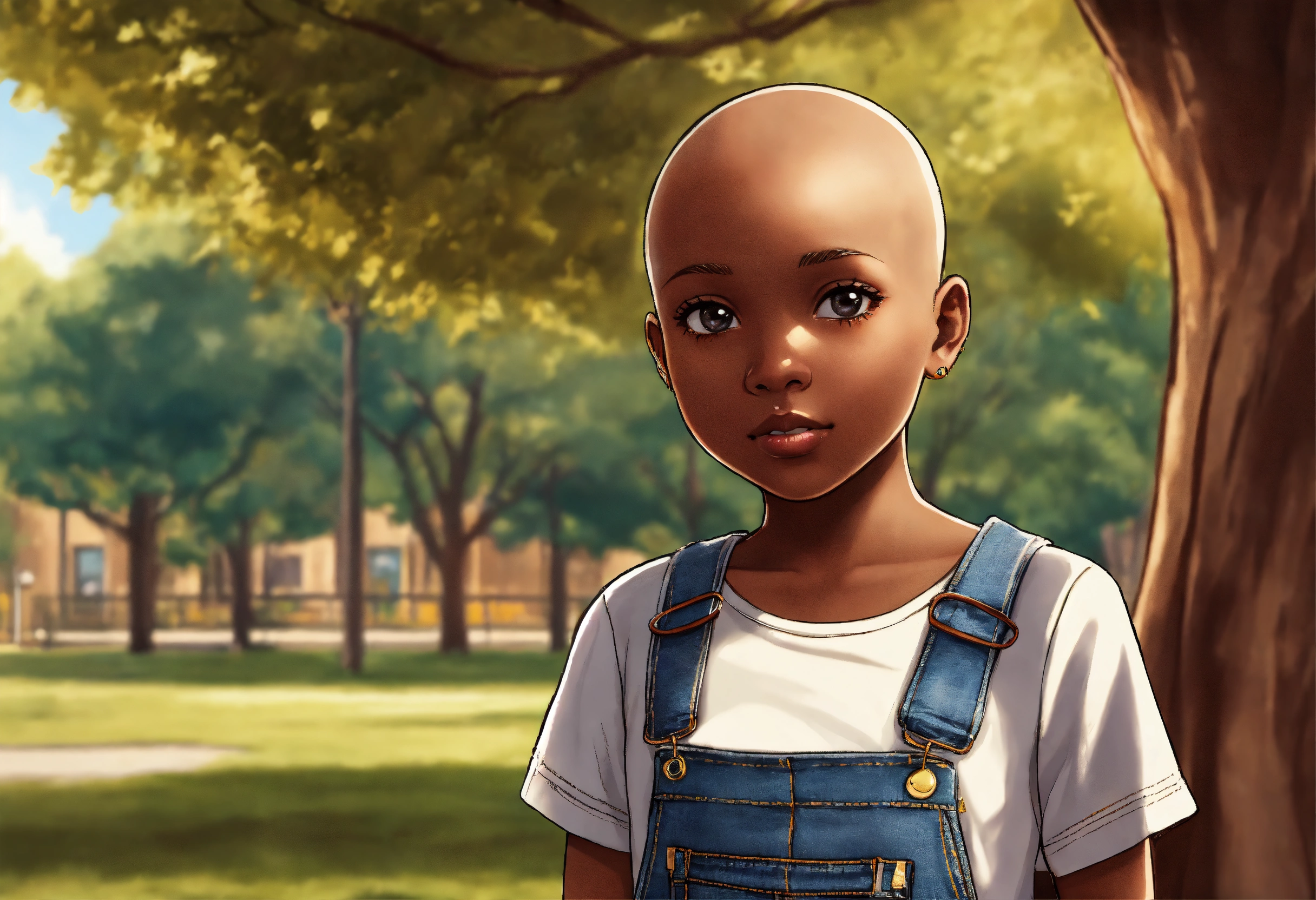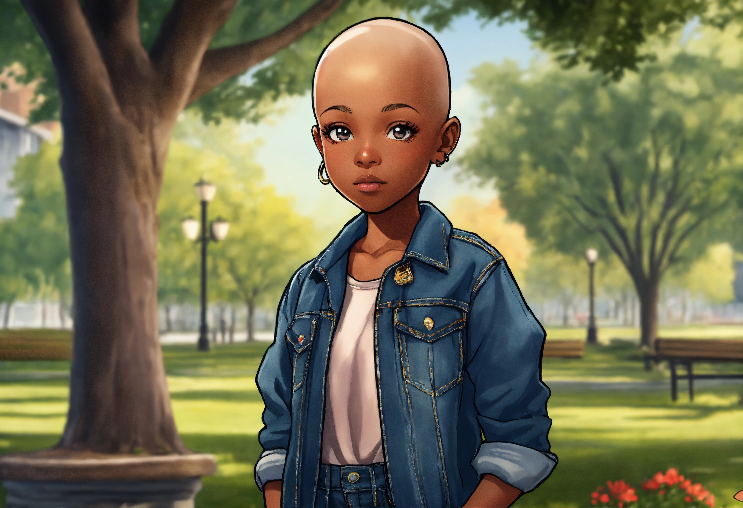 Realistic hd manga cartoon dark complexion african american 8 year old bald girl with full alopecia, wearing denim street wear style standing near a tree in a park, alopecia awareness, bald head and no eyebrows