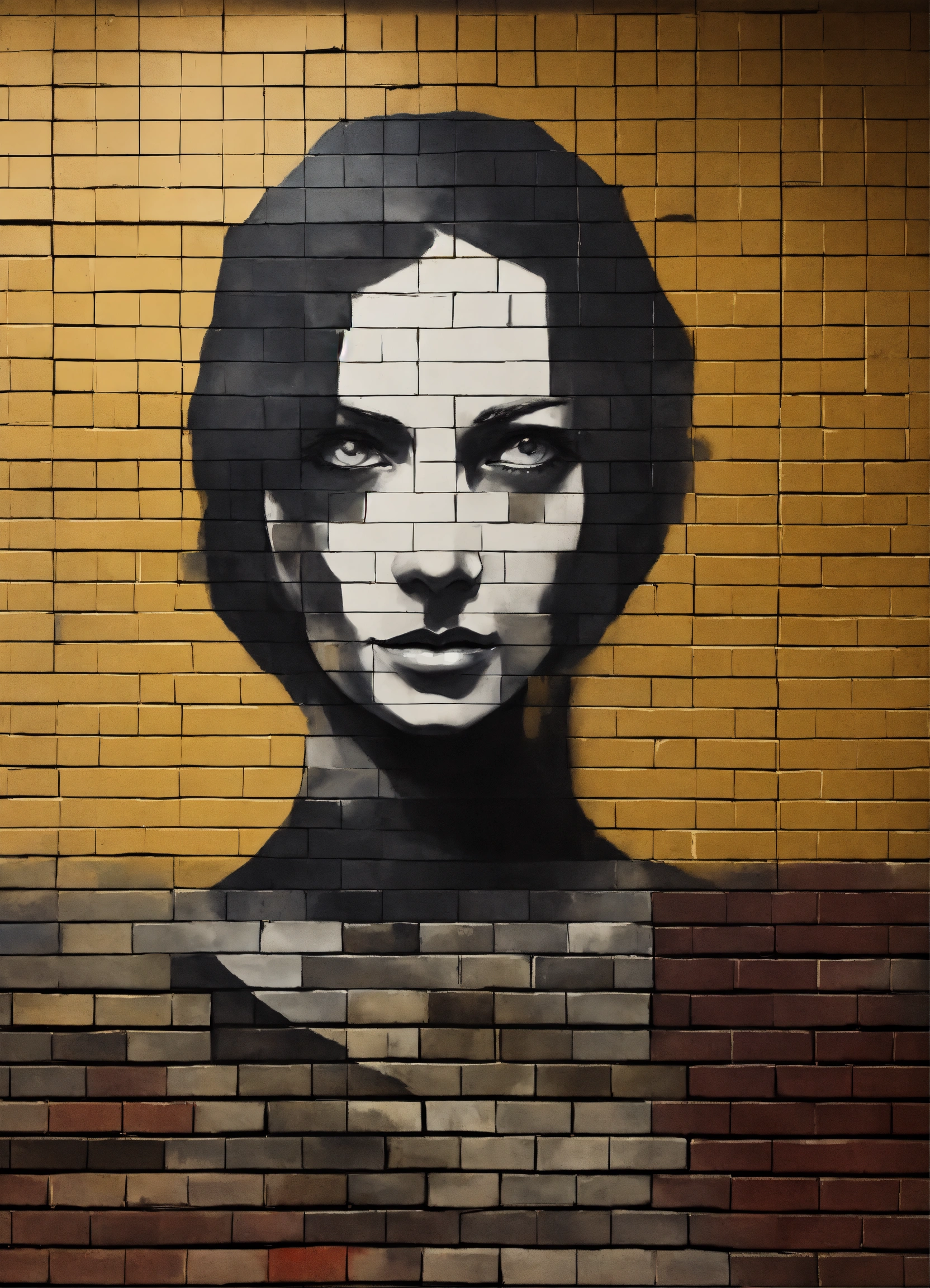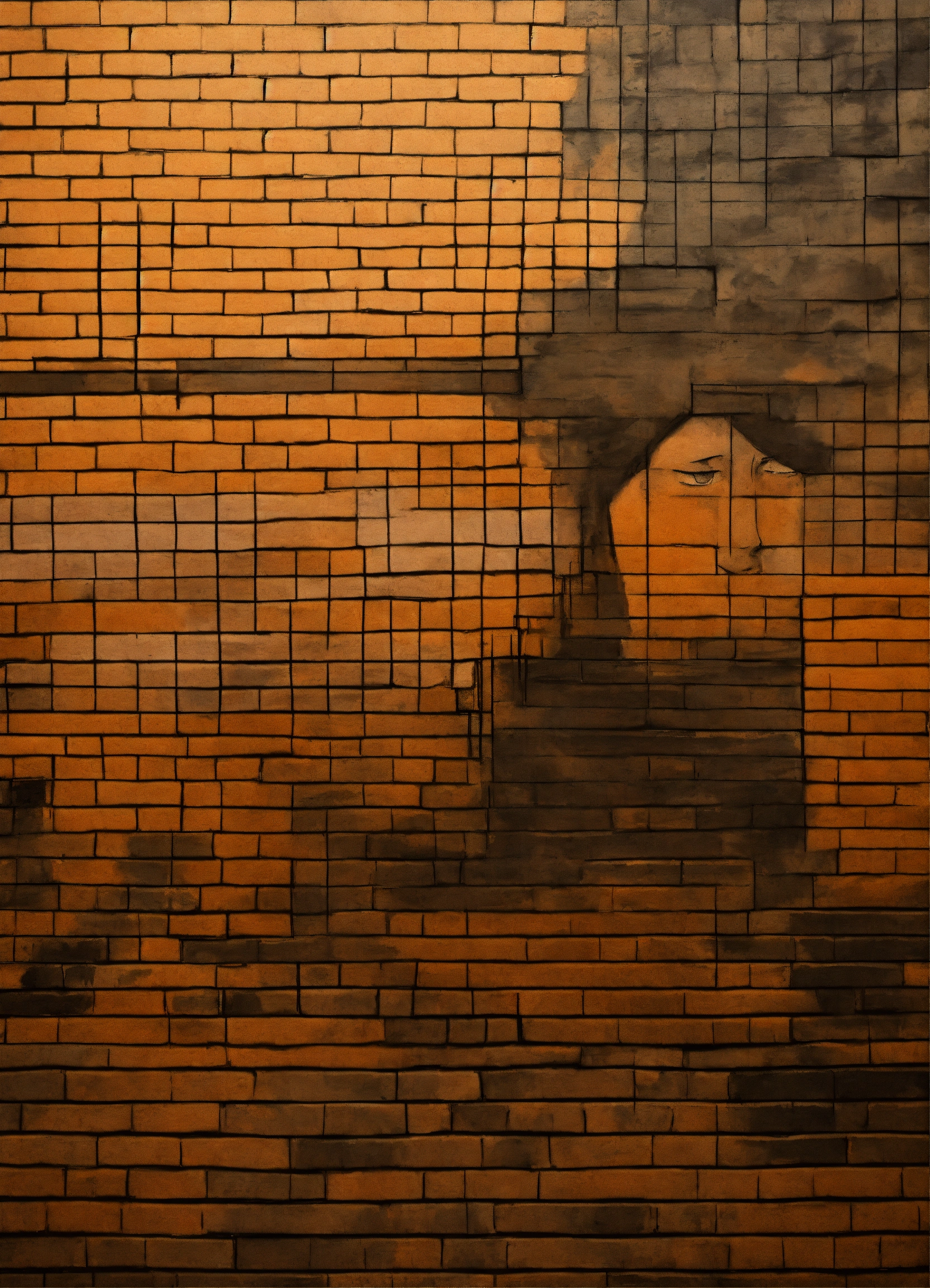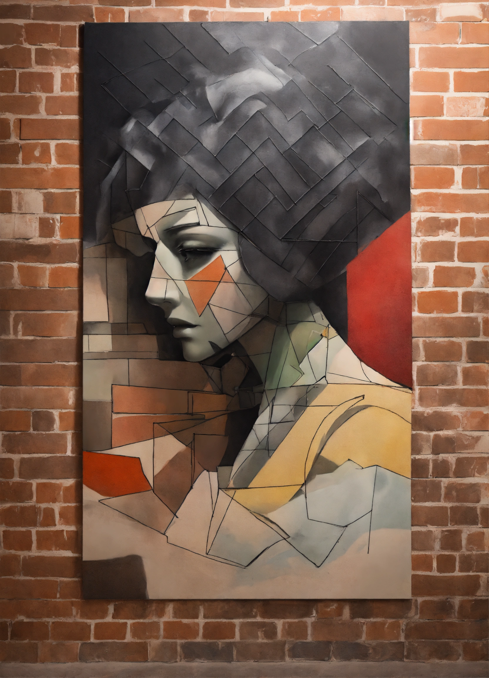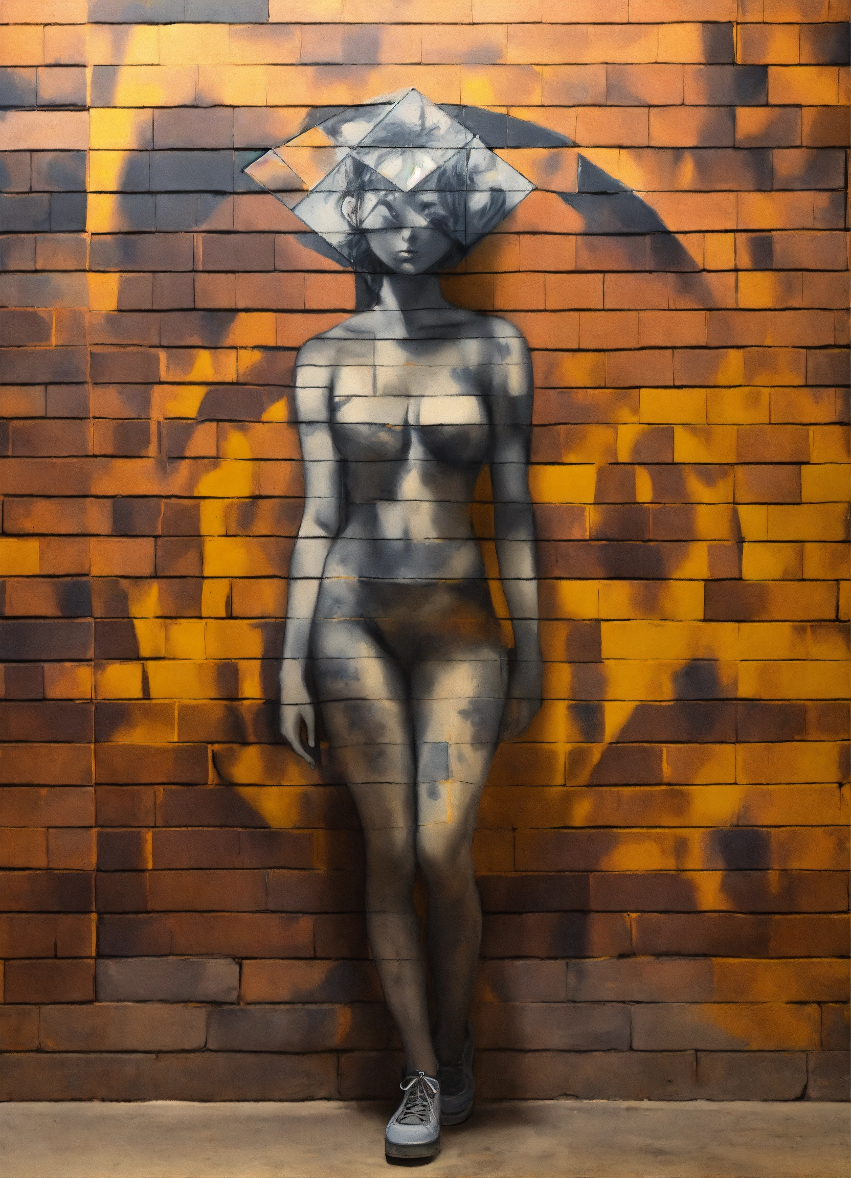 Create the outline of a personification of anxiety, painted with a few charcoal smudges. in the background there are three geometric figures overlaps. all on a brick wall.