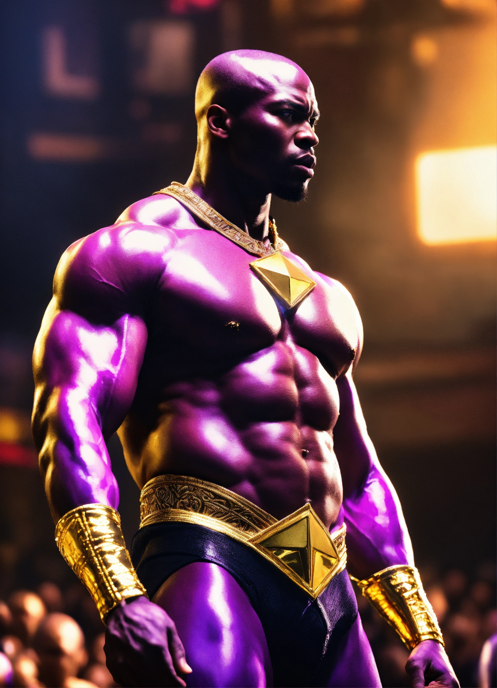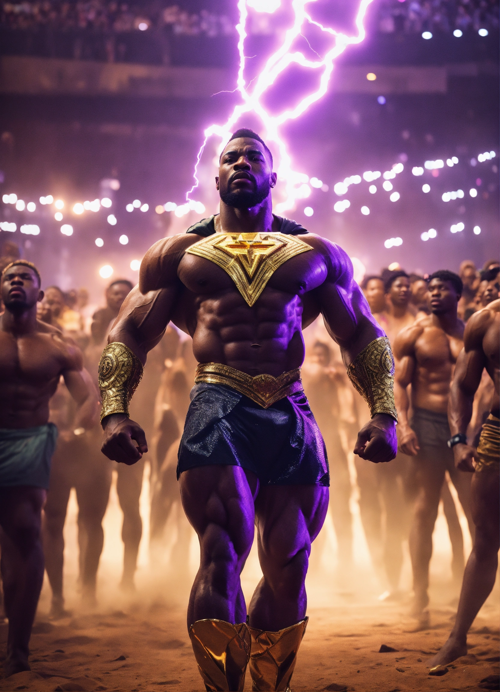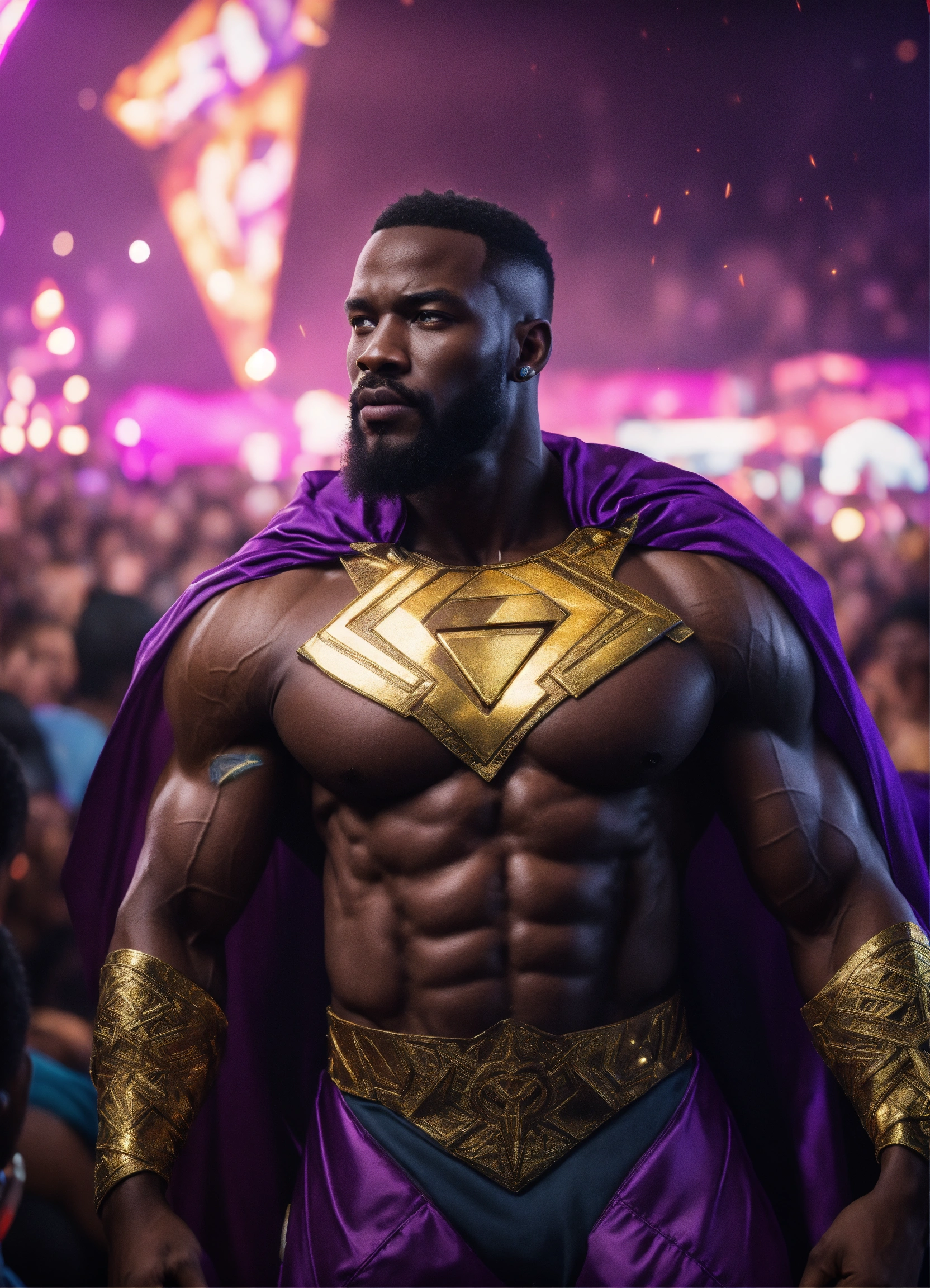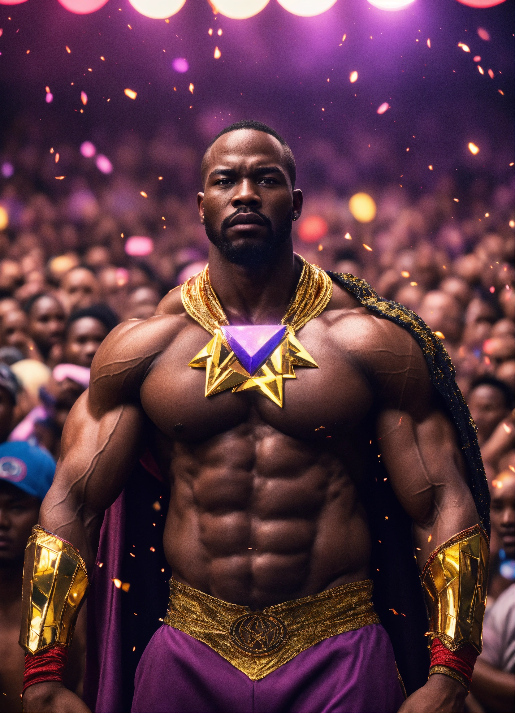 An image of a huge bodybuilder caped african superhero wearing purple & black with a gold octahedron symbol on his chest floating above a crowd of adoring african fans, wide-angled movie image. ensure high resolution, 8k image, realistic, hyper-detailed, insane details, beautifully color graded, dof, super-resolution, megapixel, cinematic lightning, anti-aliasing, fkaa, txaa, rtx, ssao, post processing, post production, tone mapping, cgi, vfx, sfx, insanely detailed and intricate, hyper maximalist, hyper-realistic, volumetric, photorealistic, ultra photoreal, ultra-detailed