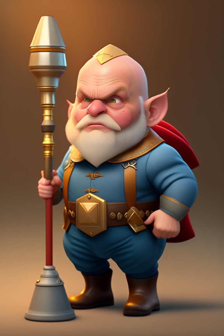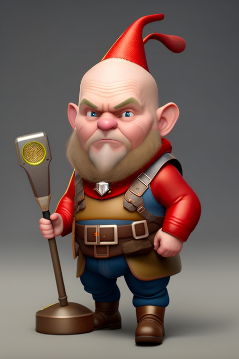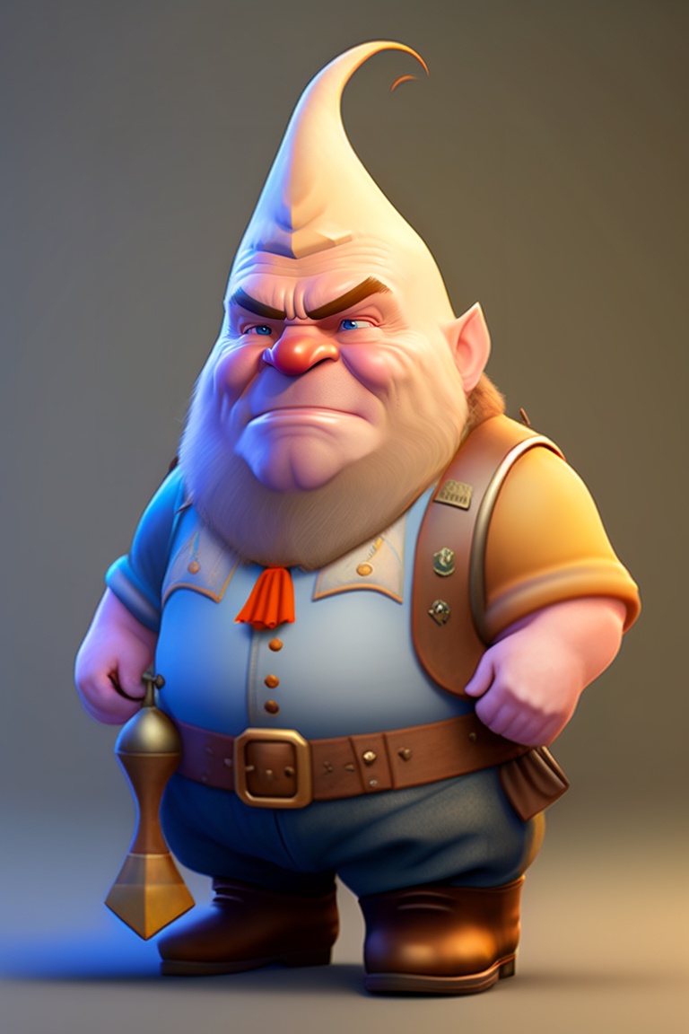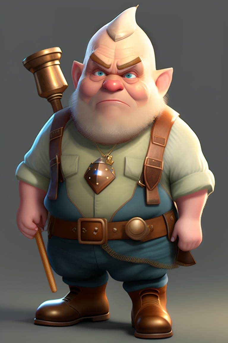 A sickly, bald and grumpy gnome, pointed ears and pale, saggy and wrinkled skin. dirty with grease, poorly dressed, holding useless technological tools