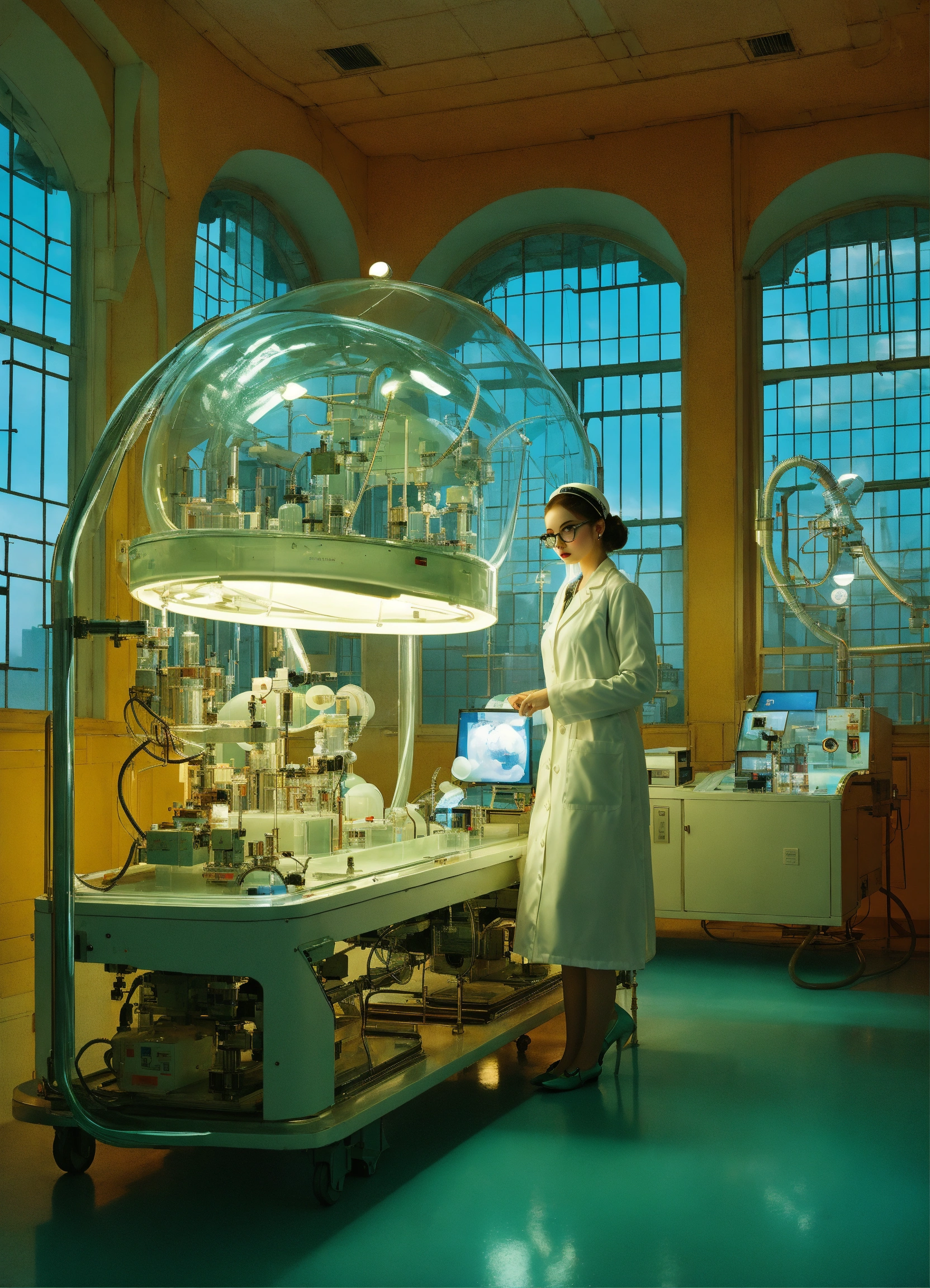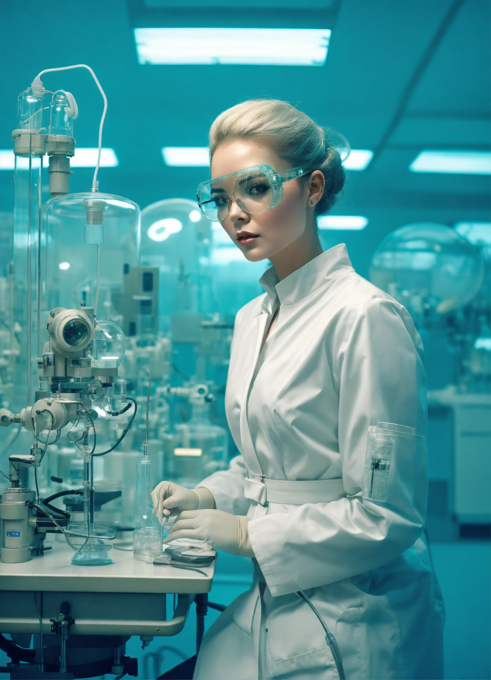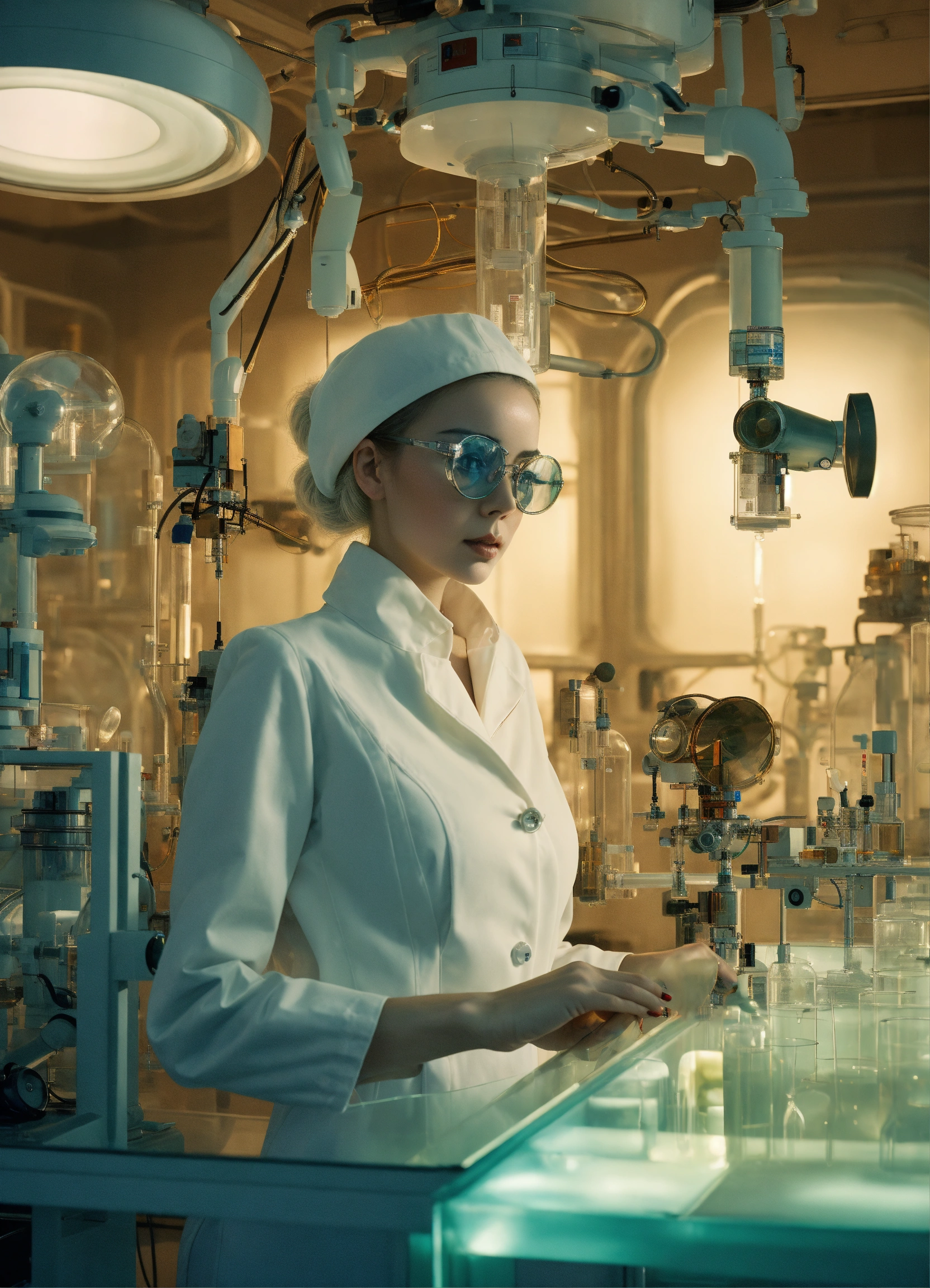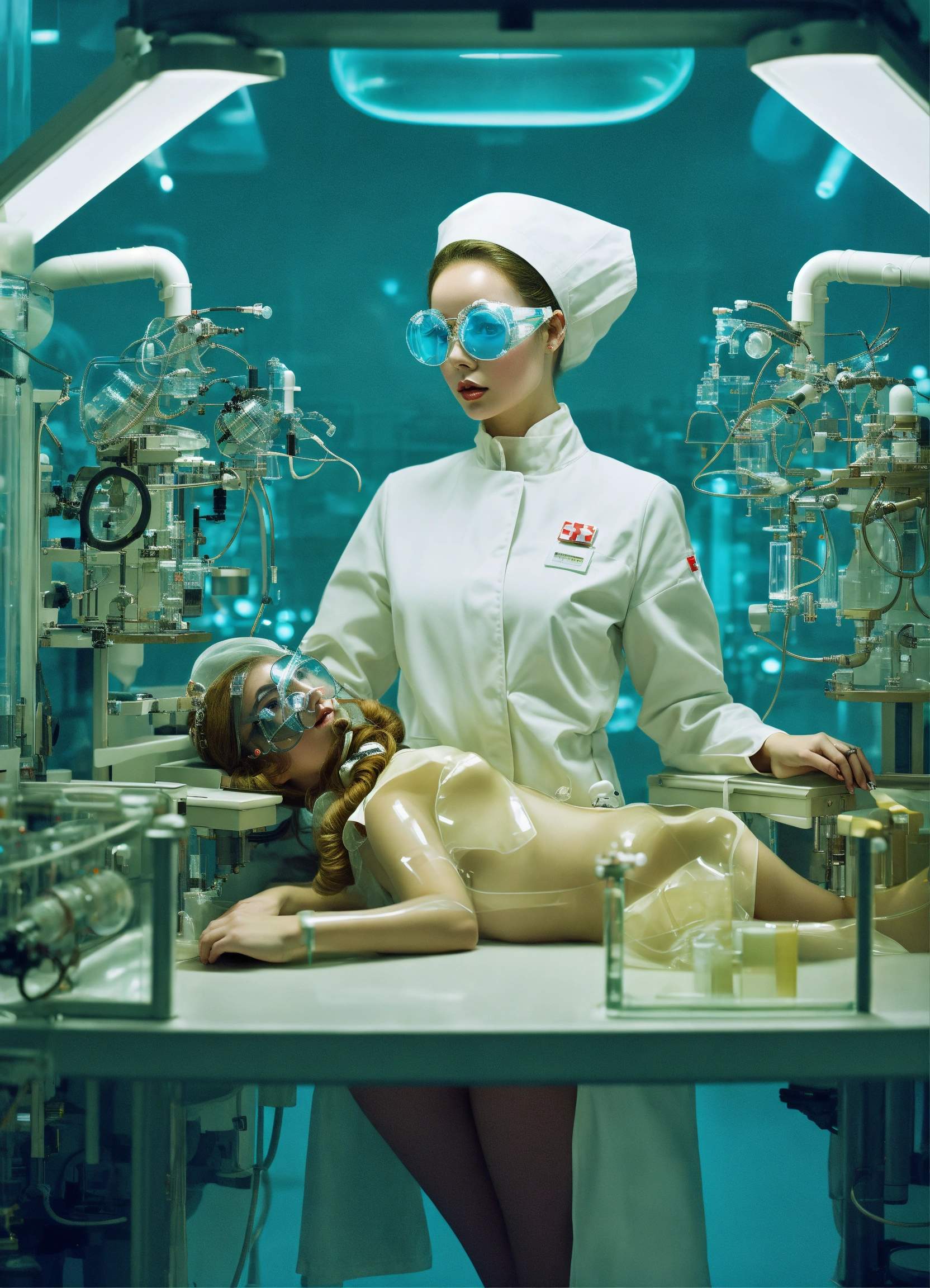 Photography in a futuristic sci fi laboratory, 60's gorgeous night chirurgical nurse woman in short white coat, caring for a sick person, in an army hospital ward full of glass stills and machines, wearing large transparent glasses, with a highly concentrated air, 80 degree view, art by sergio lopez, natalie shau, james jean and salvador dali