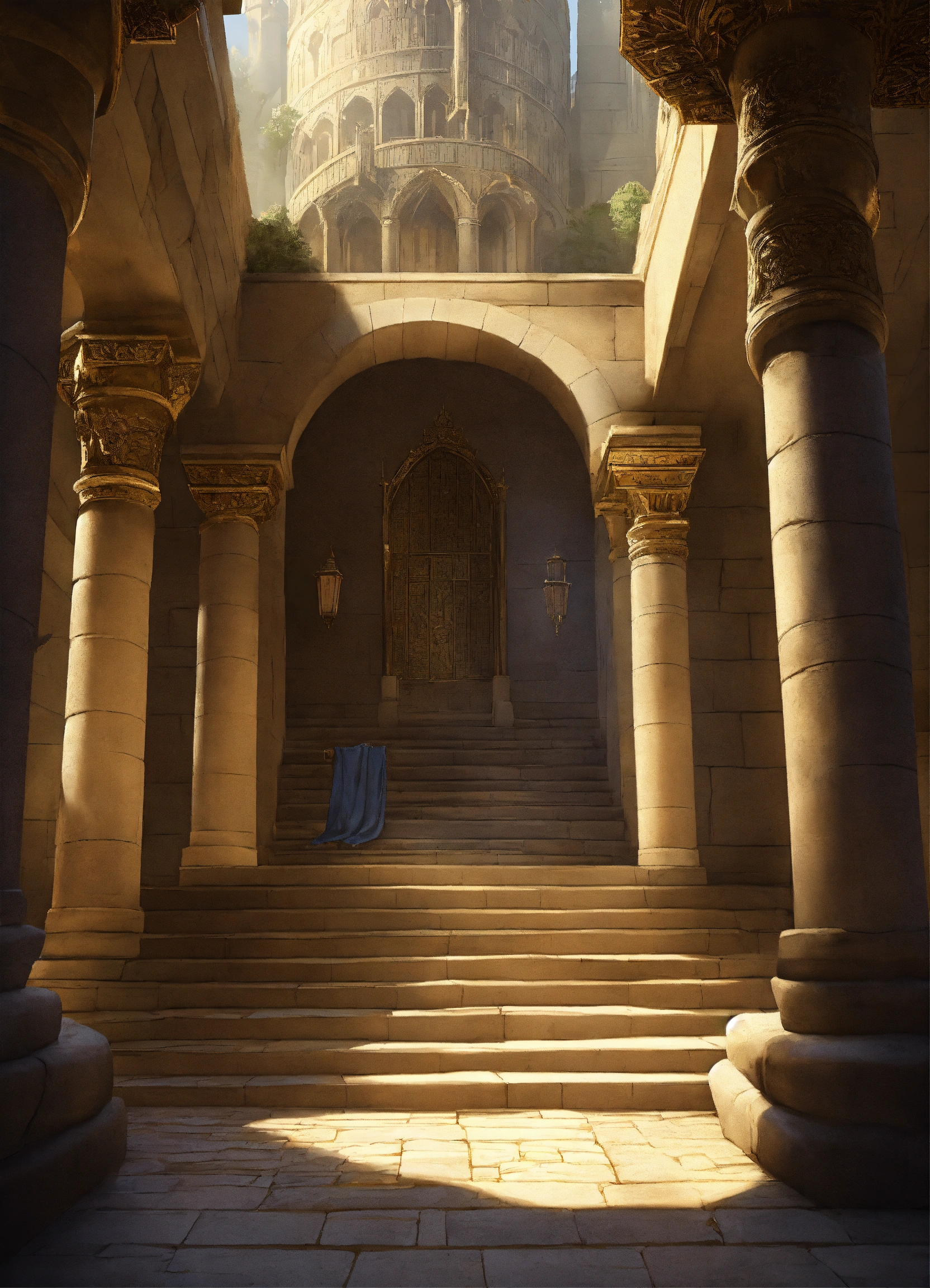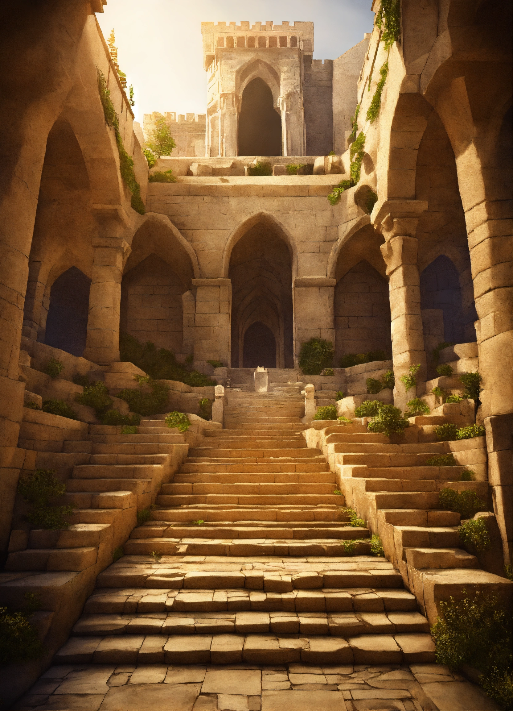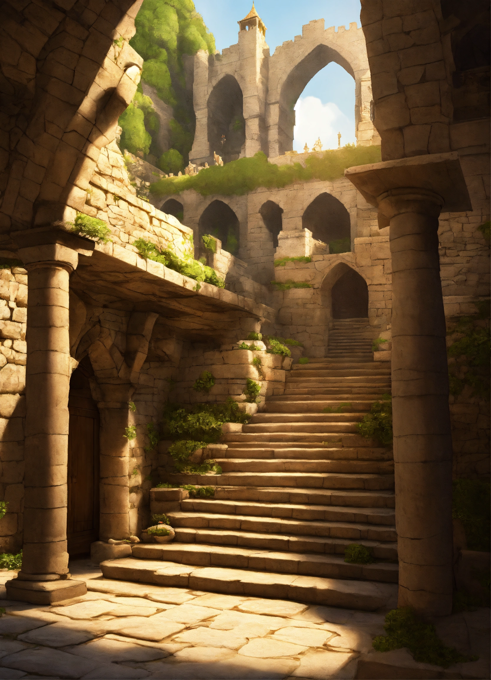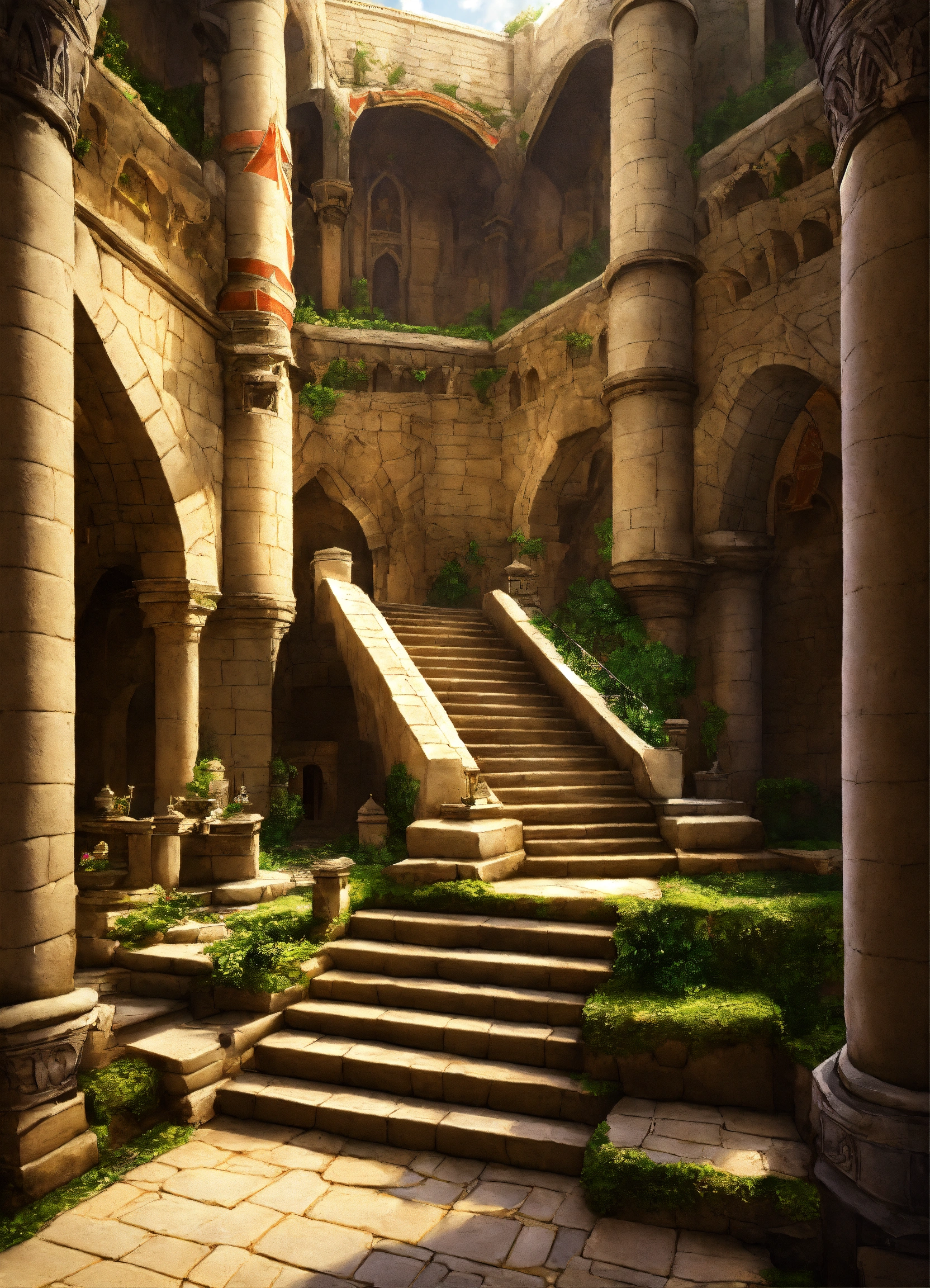 Create an inside of palace medieval, there are a set of 10 stone steps. the steps meet on a flat surface where there's another set of stairs that go down on the other side. to the left of the flat surface, more stairs go up to the kingdom's tower (this doesn't have to be included, but it gives you an idea).