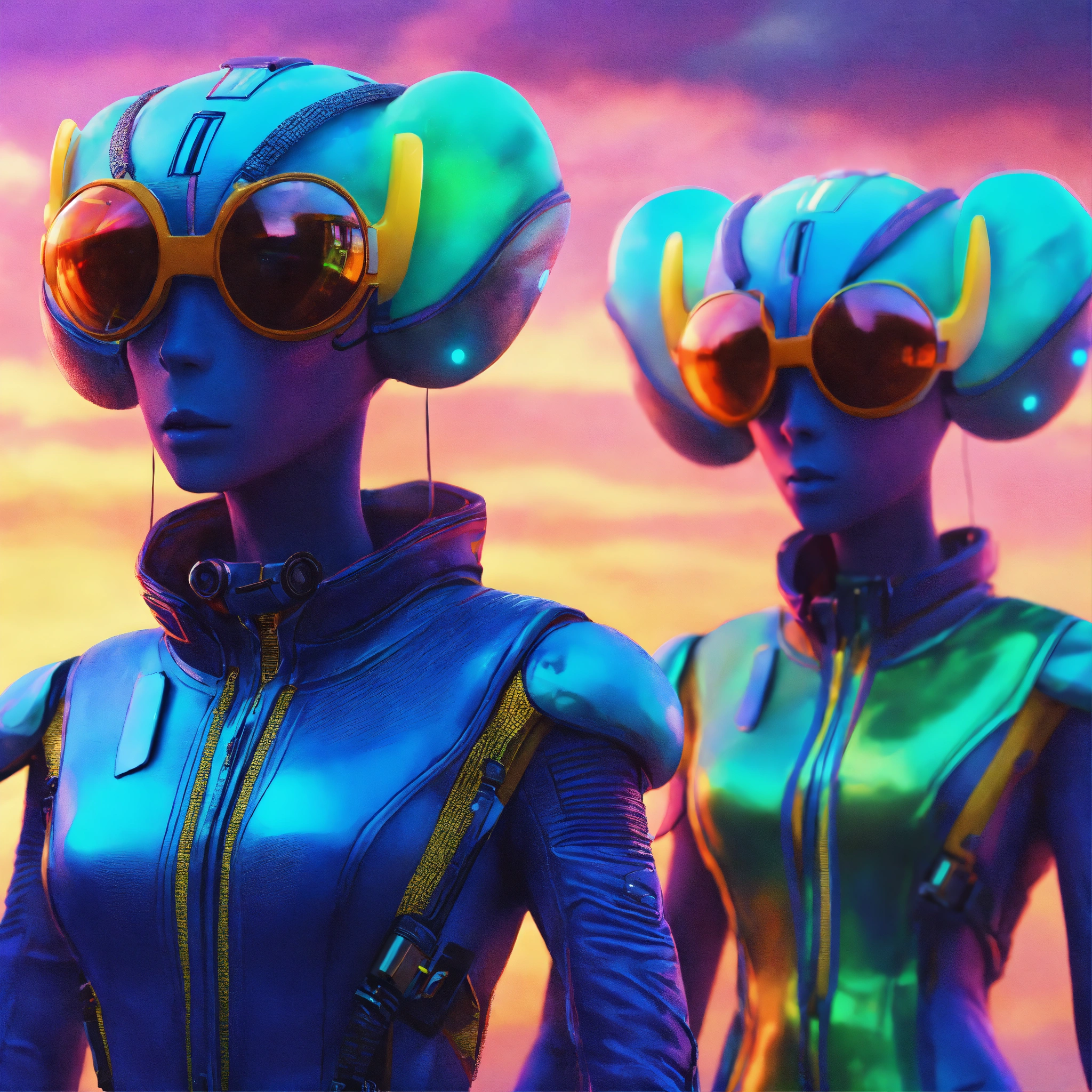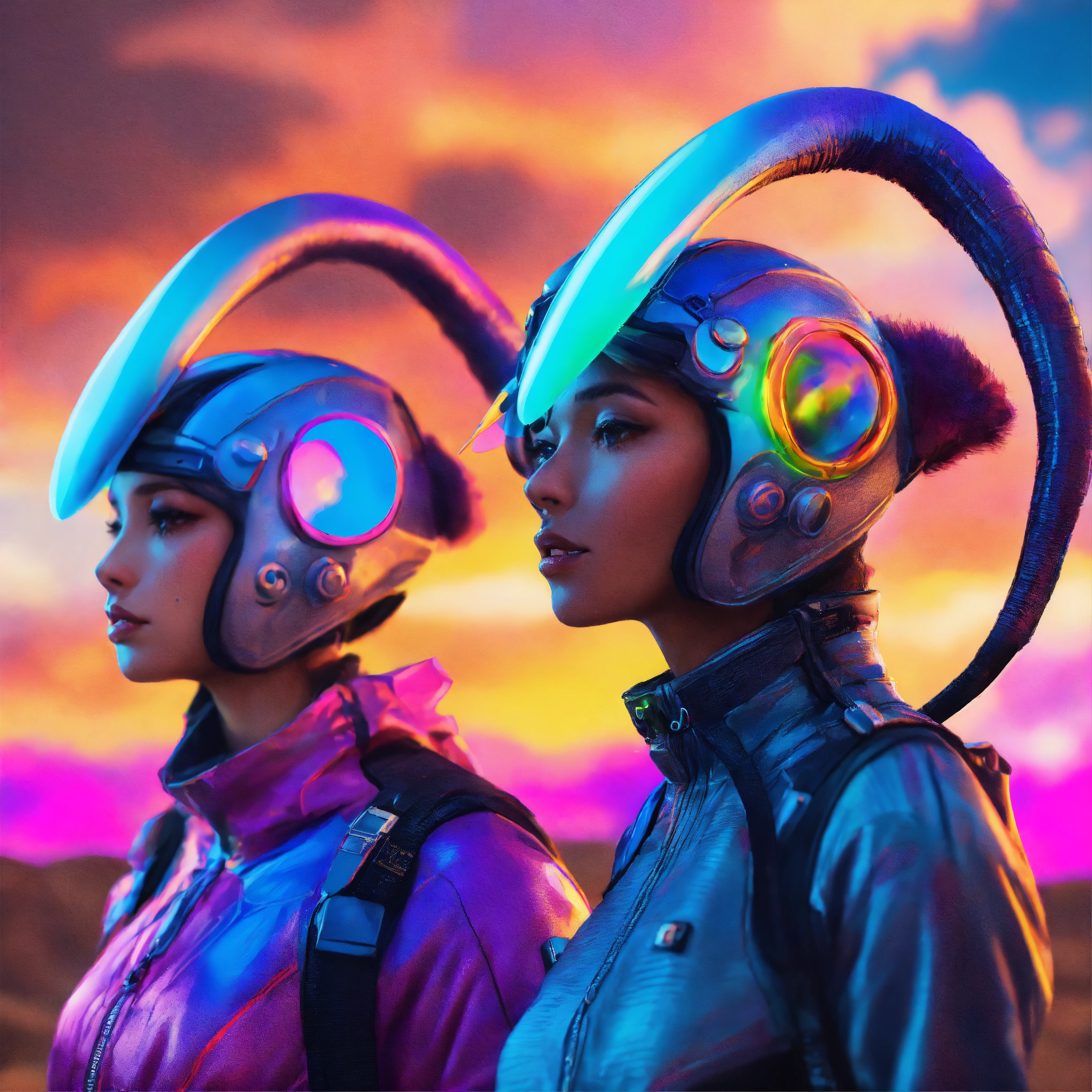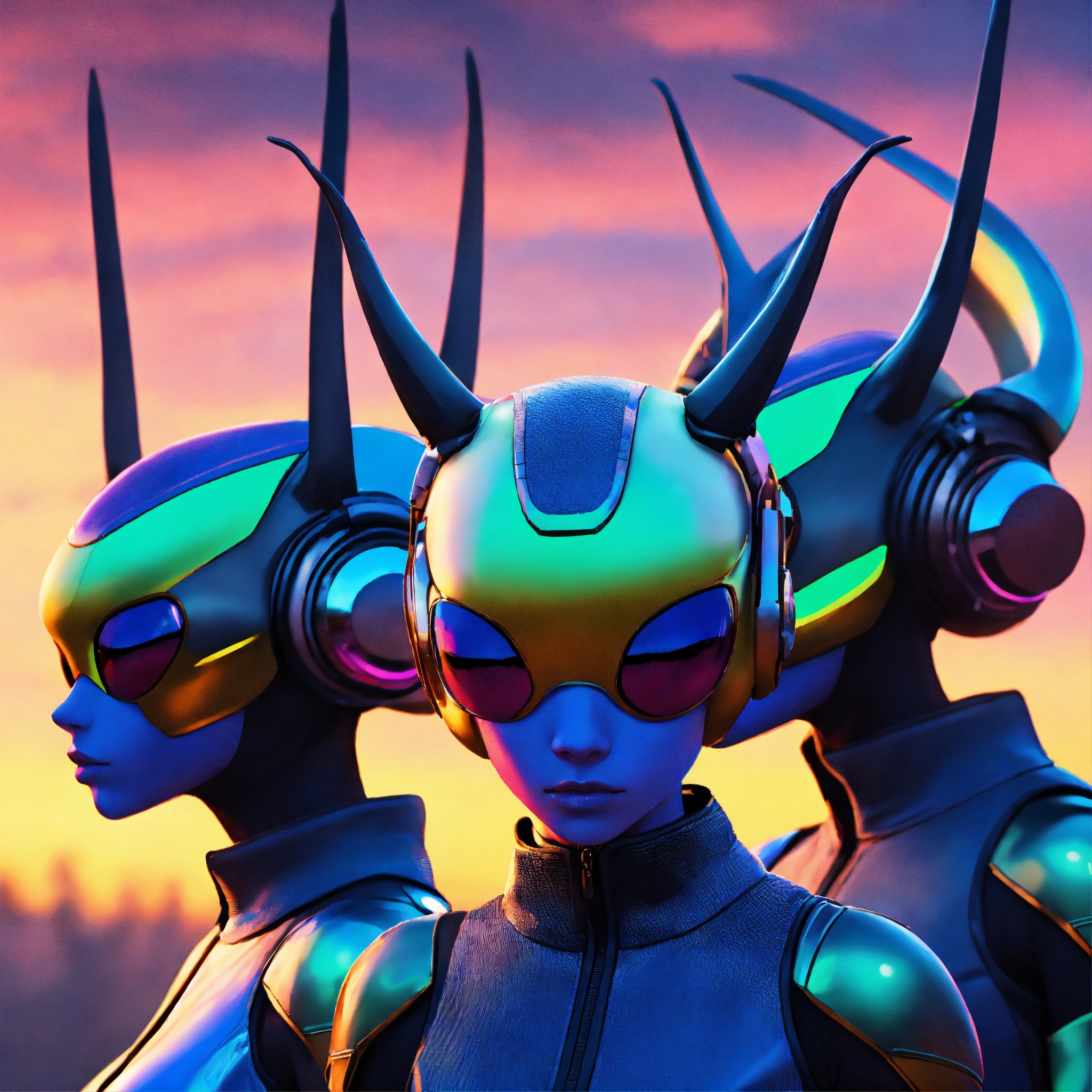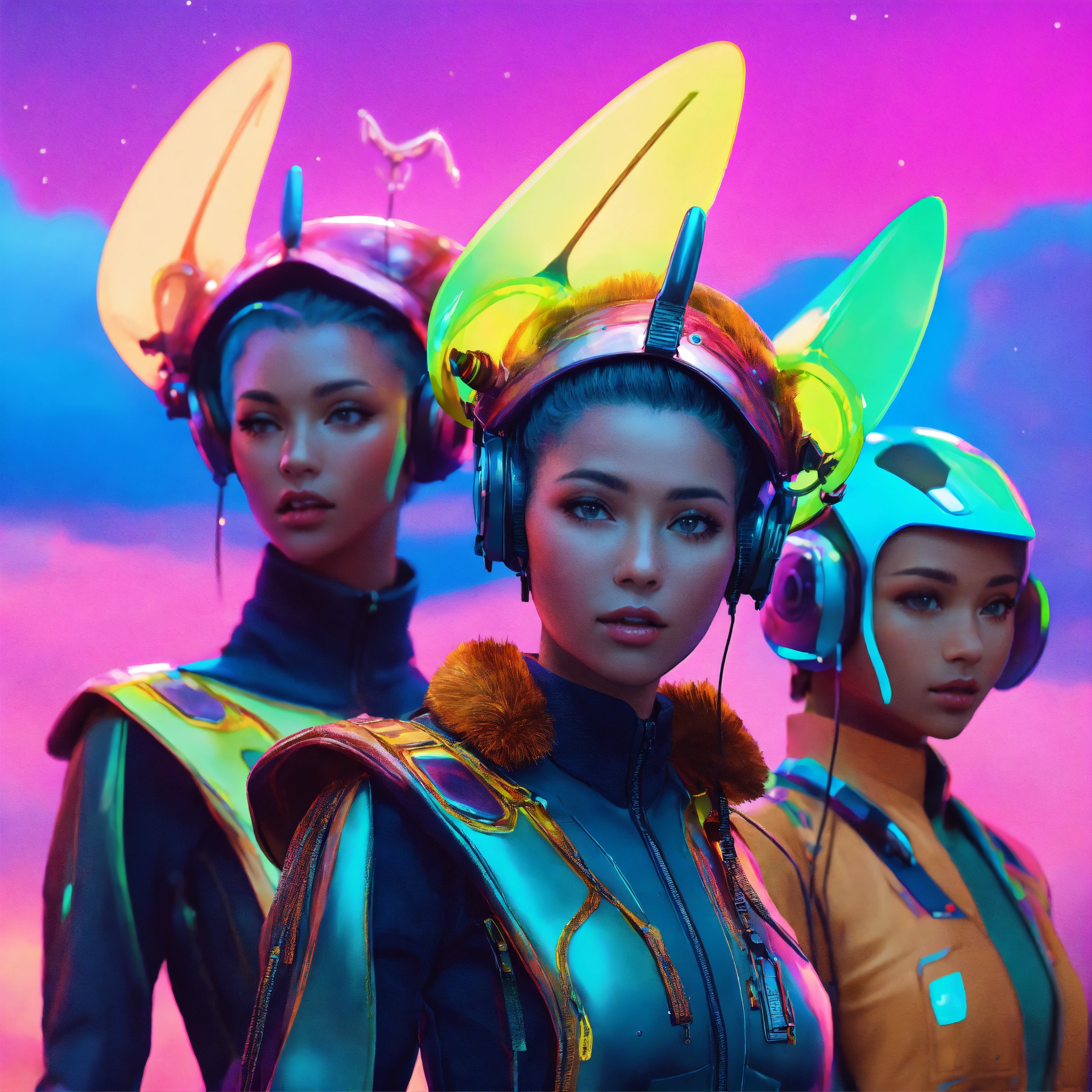 Zoom out of 4 lovable creatures wearing detailed alien ear antennas with futuristic clothing, colorful sky, futuristic, sci-fi, realistic, 8k