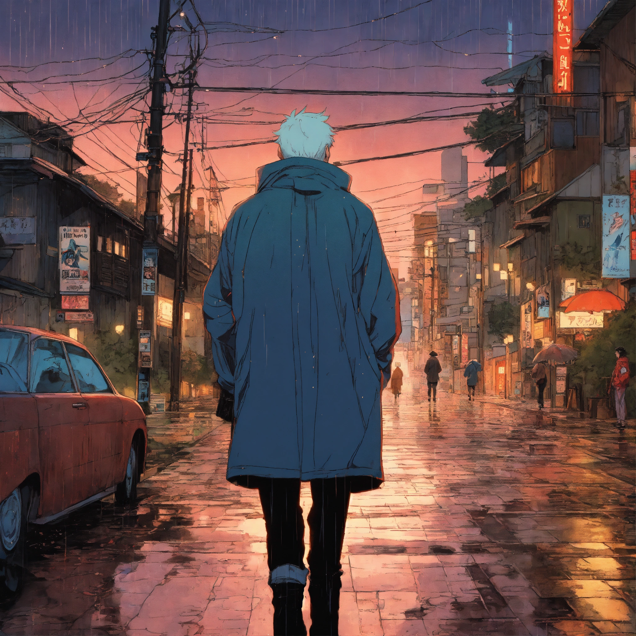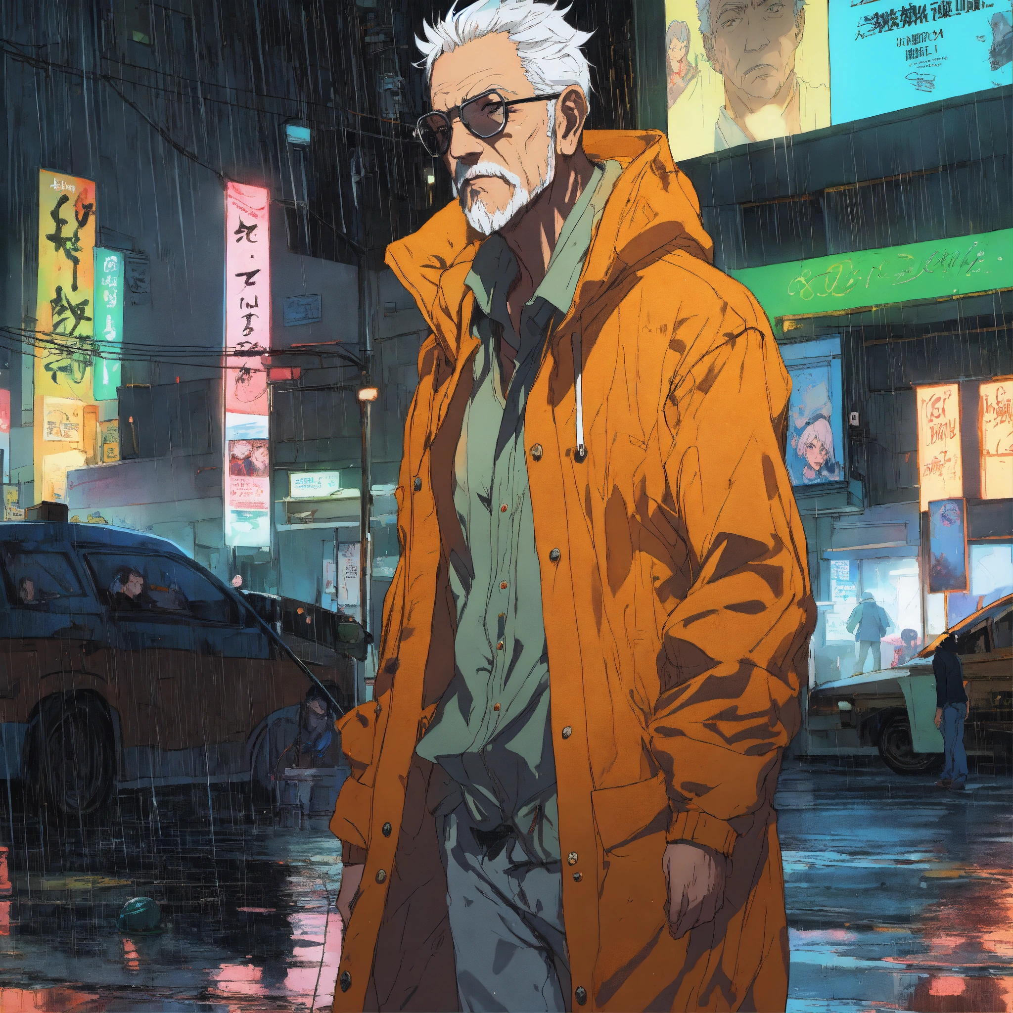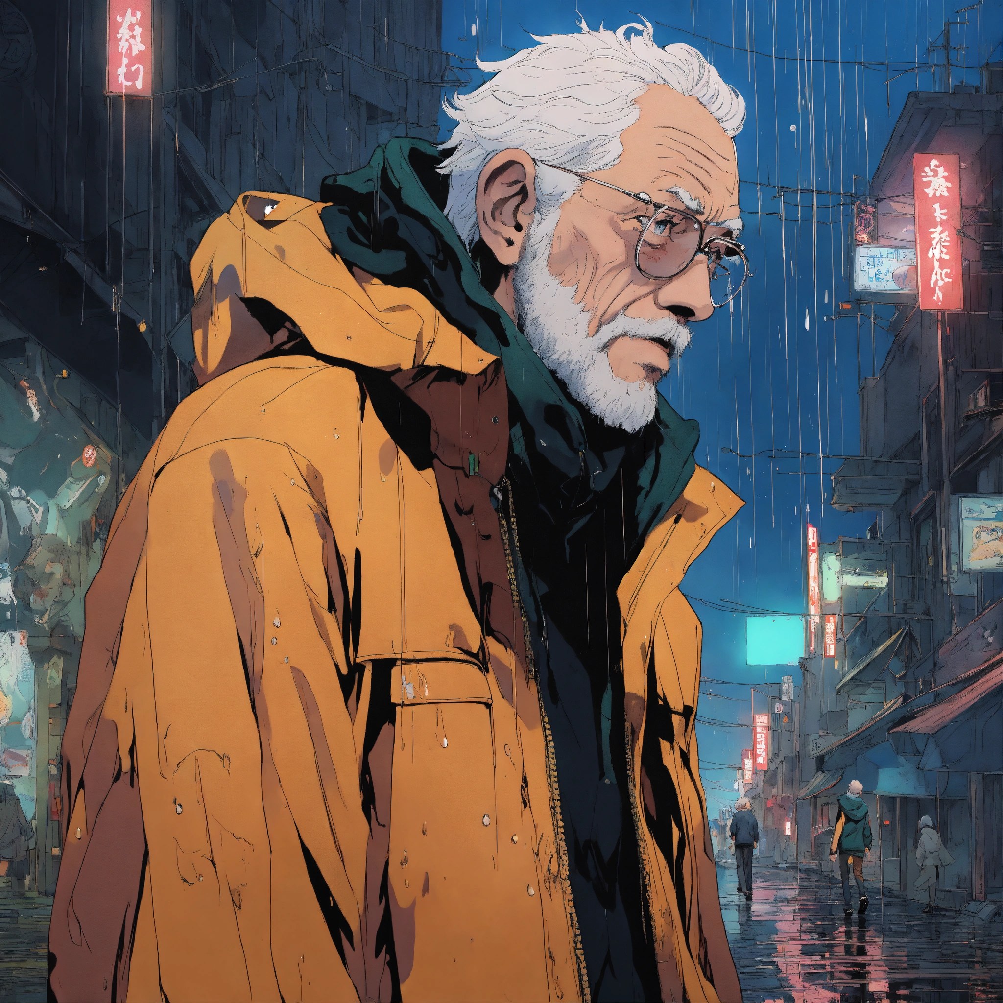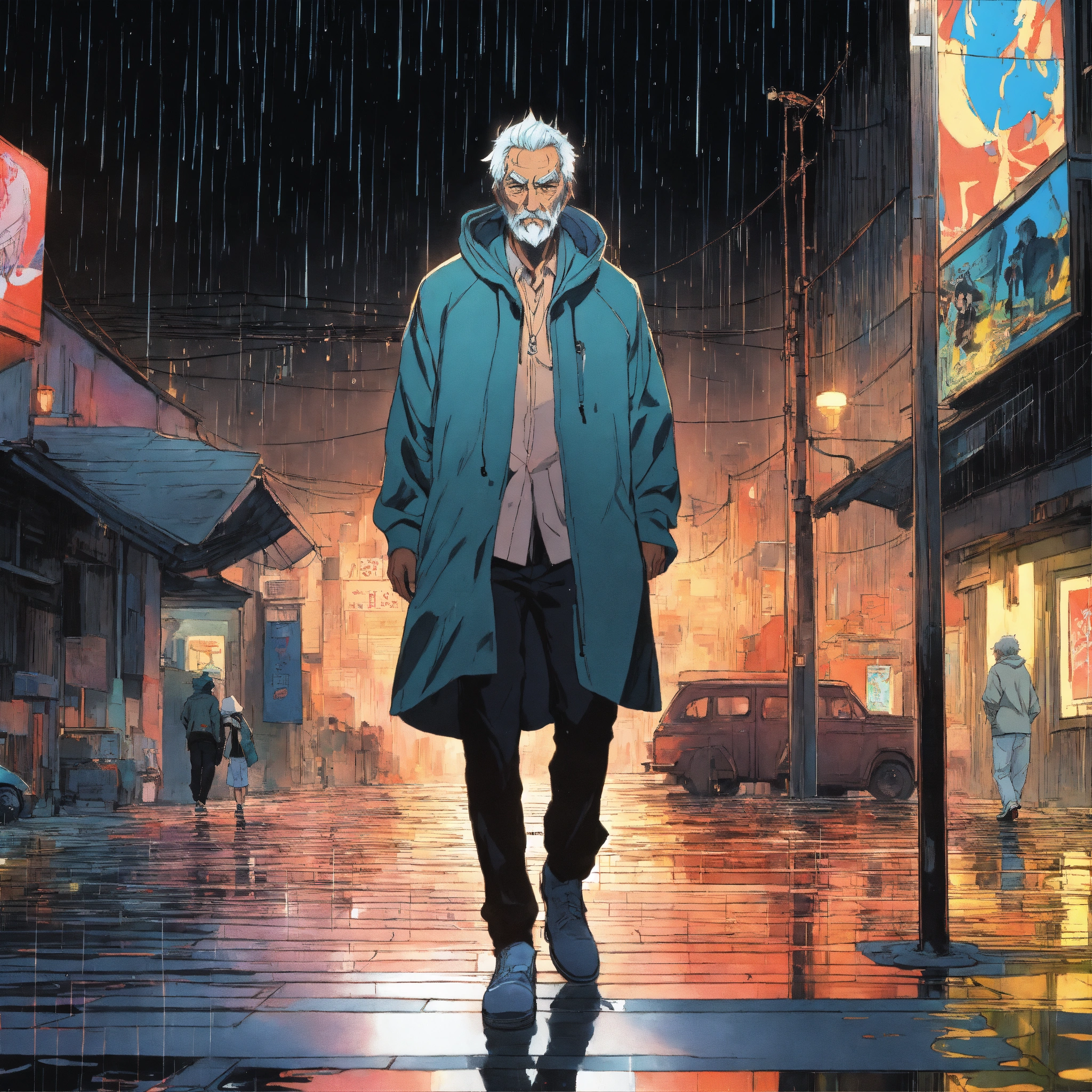 Cel anime, old man, perfect smooth coloring, hoodie, walking in the rain; by shinkai makoto, kaethe butcher, hajime sorayama, greg tocchini, virgil finlay, 4k, long shot.