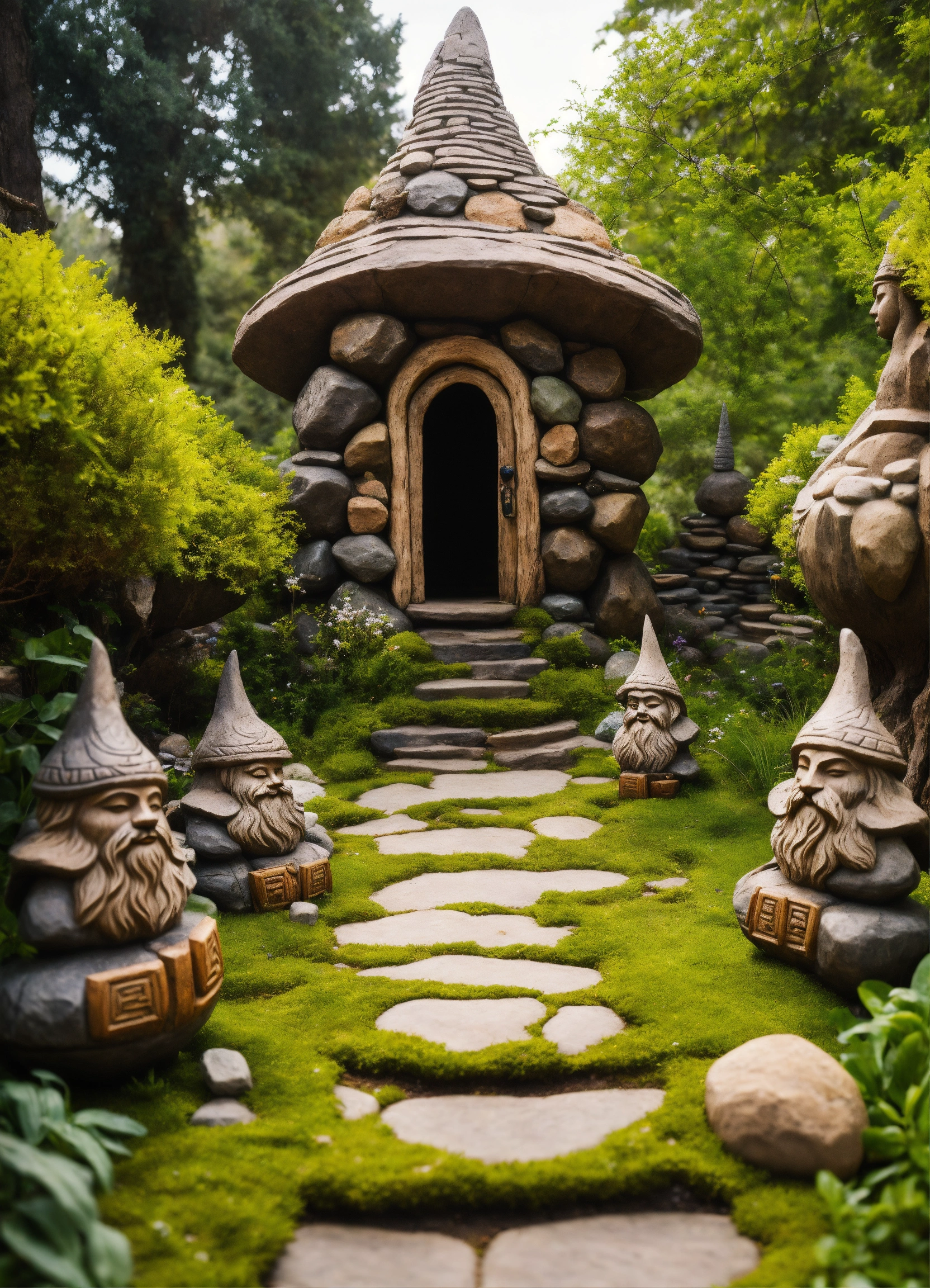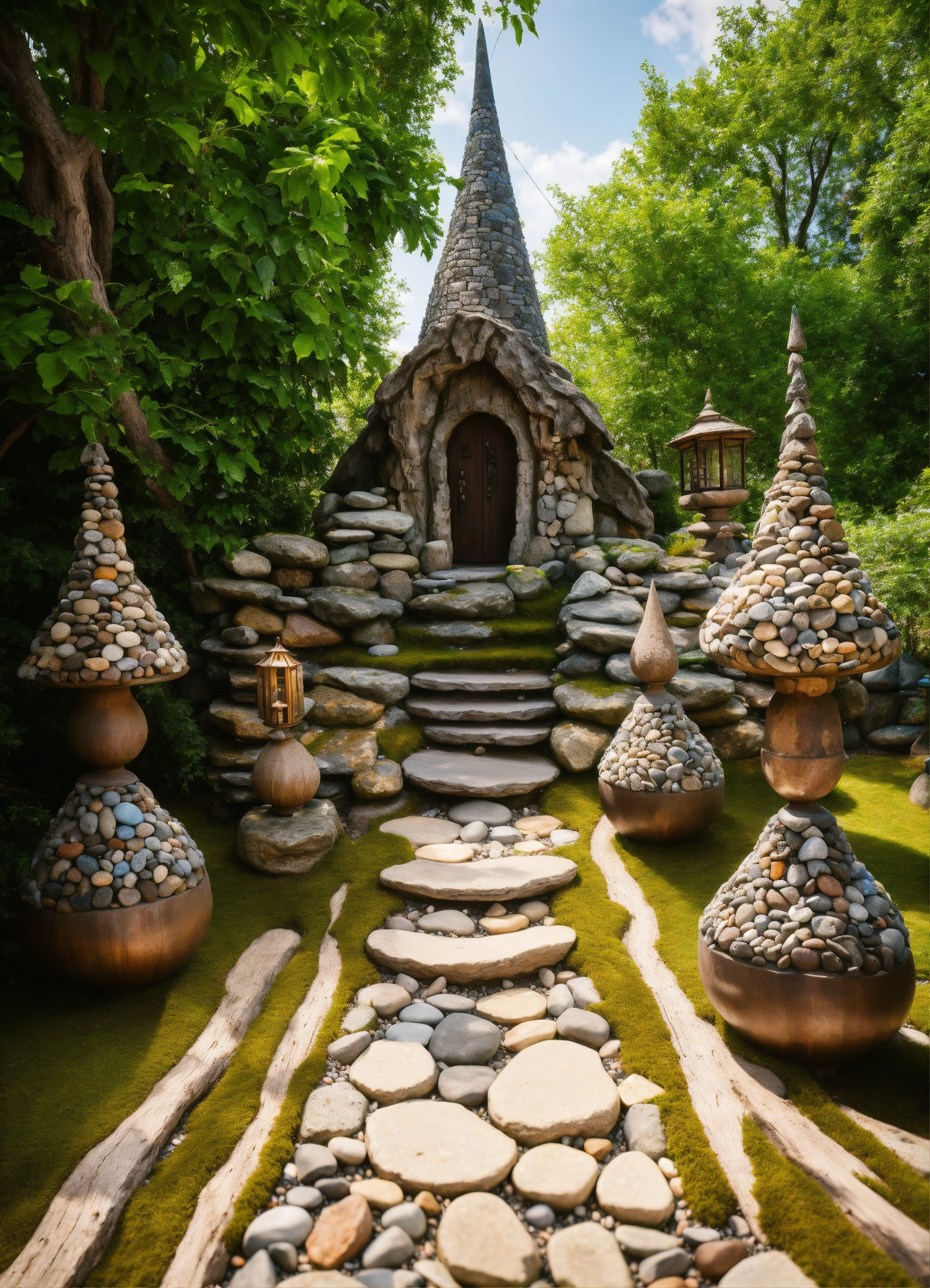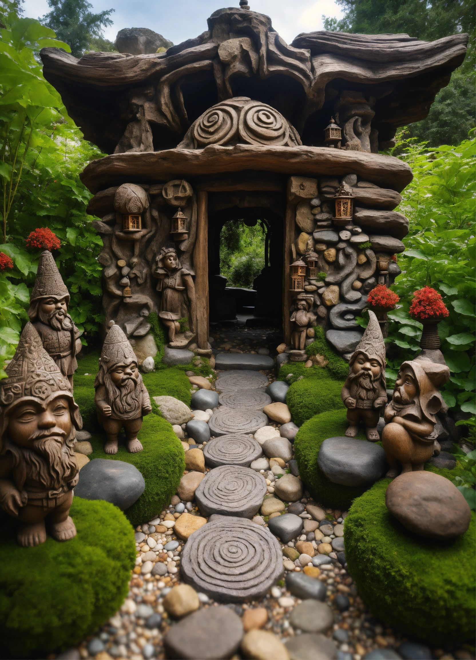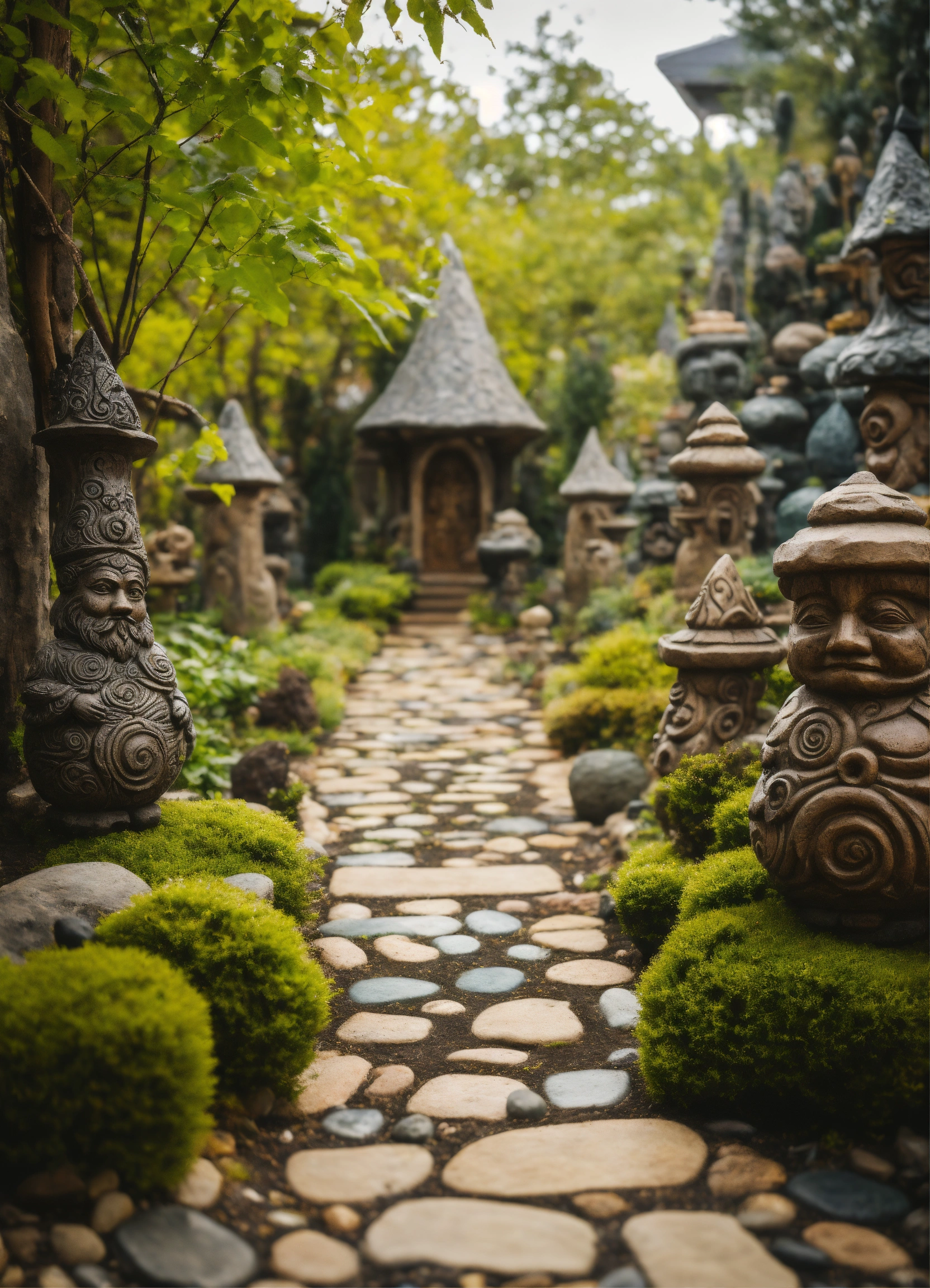 An ancient spiritual gnomes stone pathway rock garden.sculptured . style of alex grey, giger.unreal engine.totem sculptures.swirling patterned stone pathway courtyard.wood.stone.driftwood.statues. artistic sculpture.lanterns.air bnb tiny house