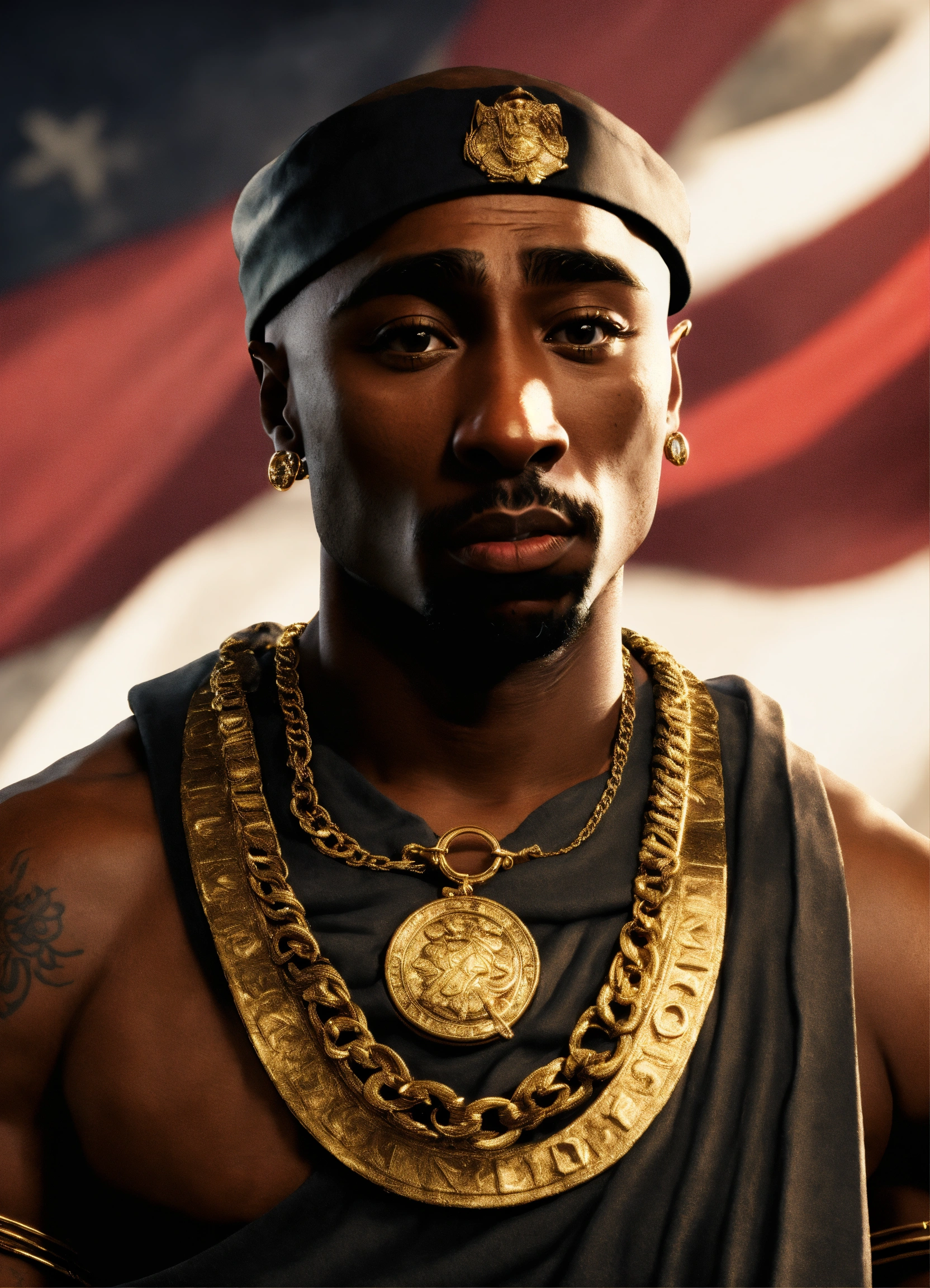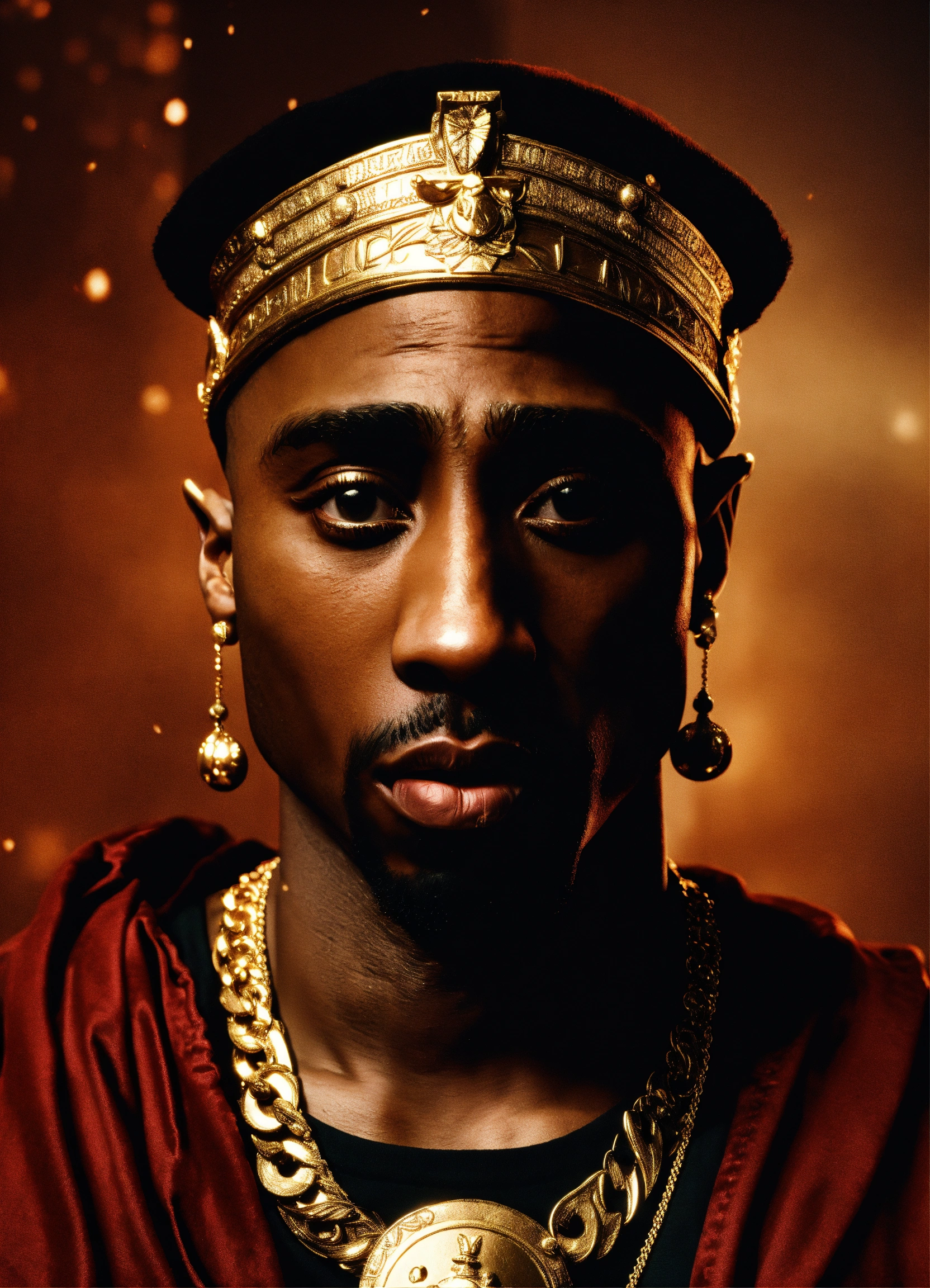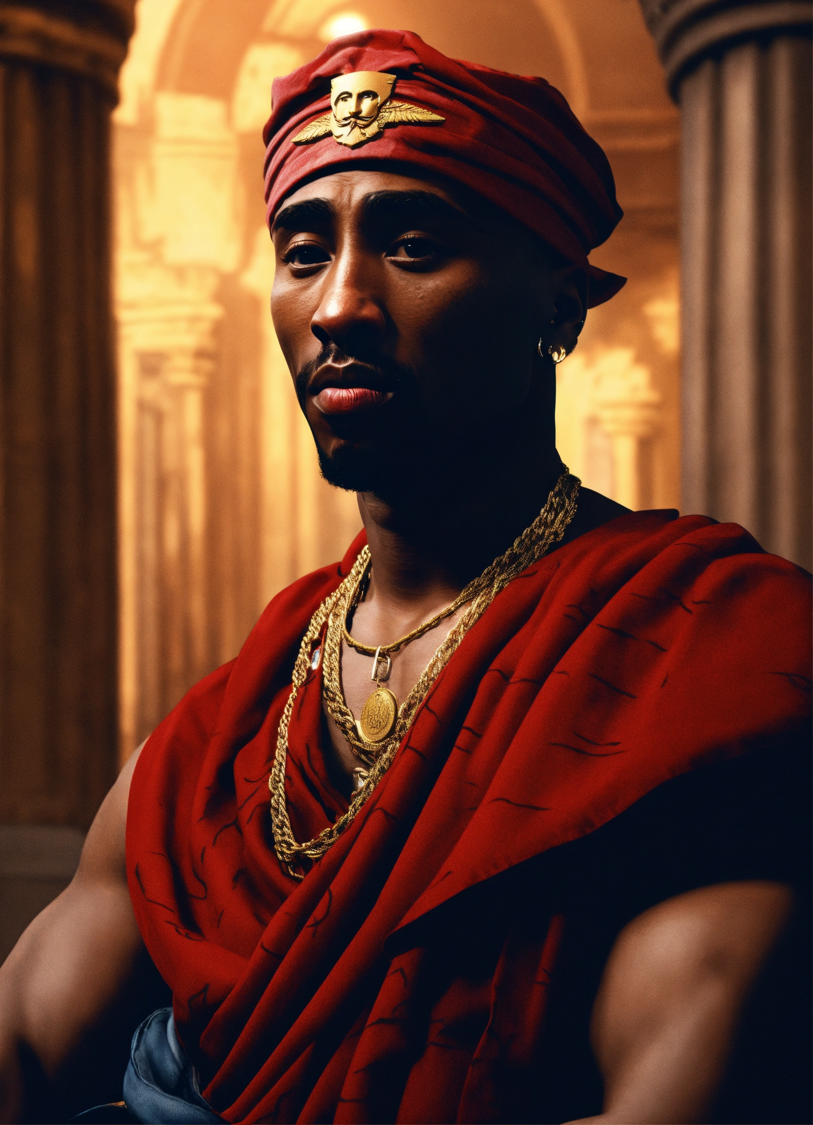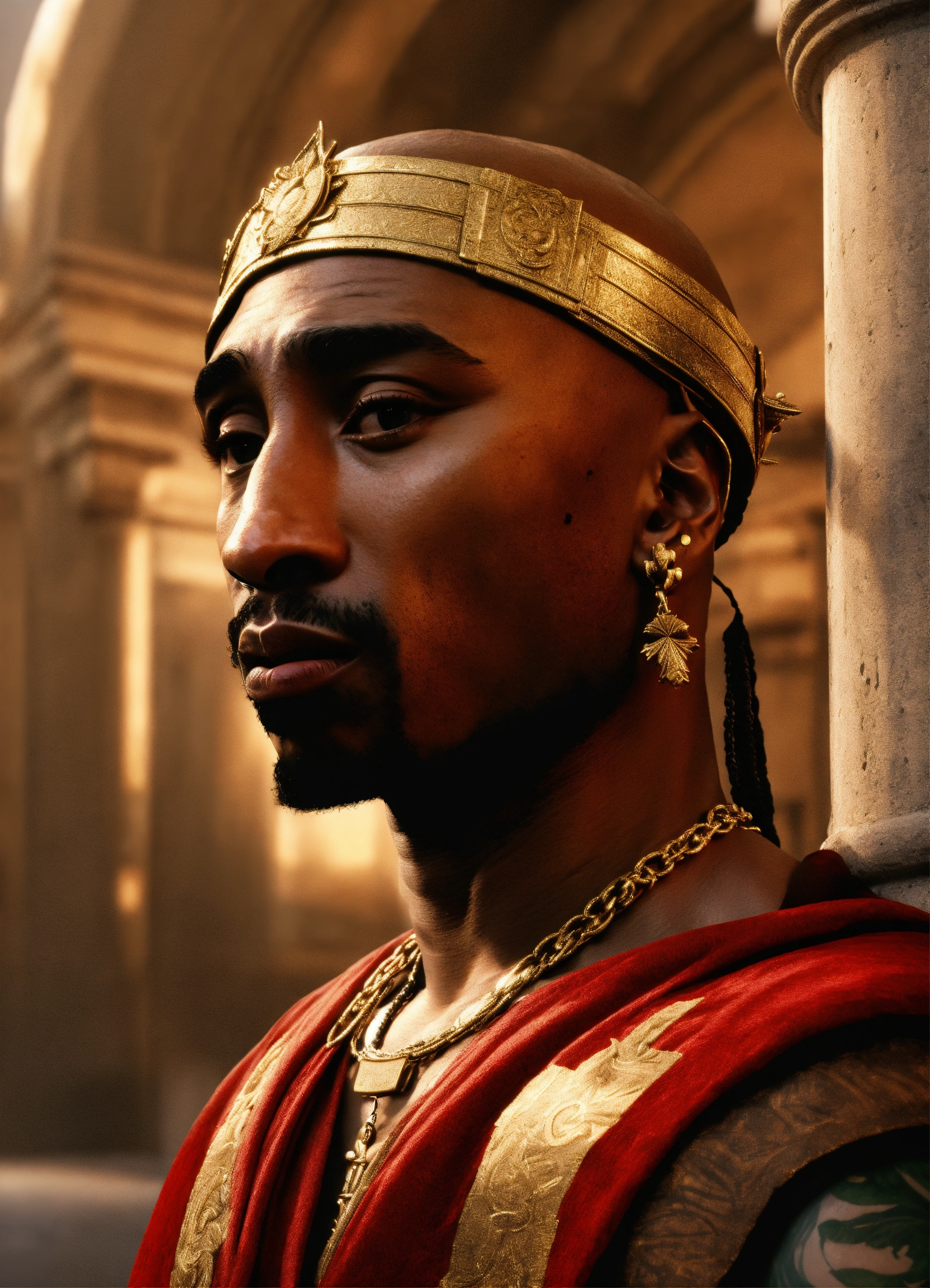 Tupac shakur as julius caesar 8k unreal engine render, photorealism, surreal, hip hop. create as a book cover