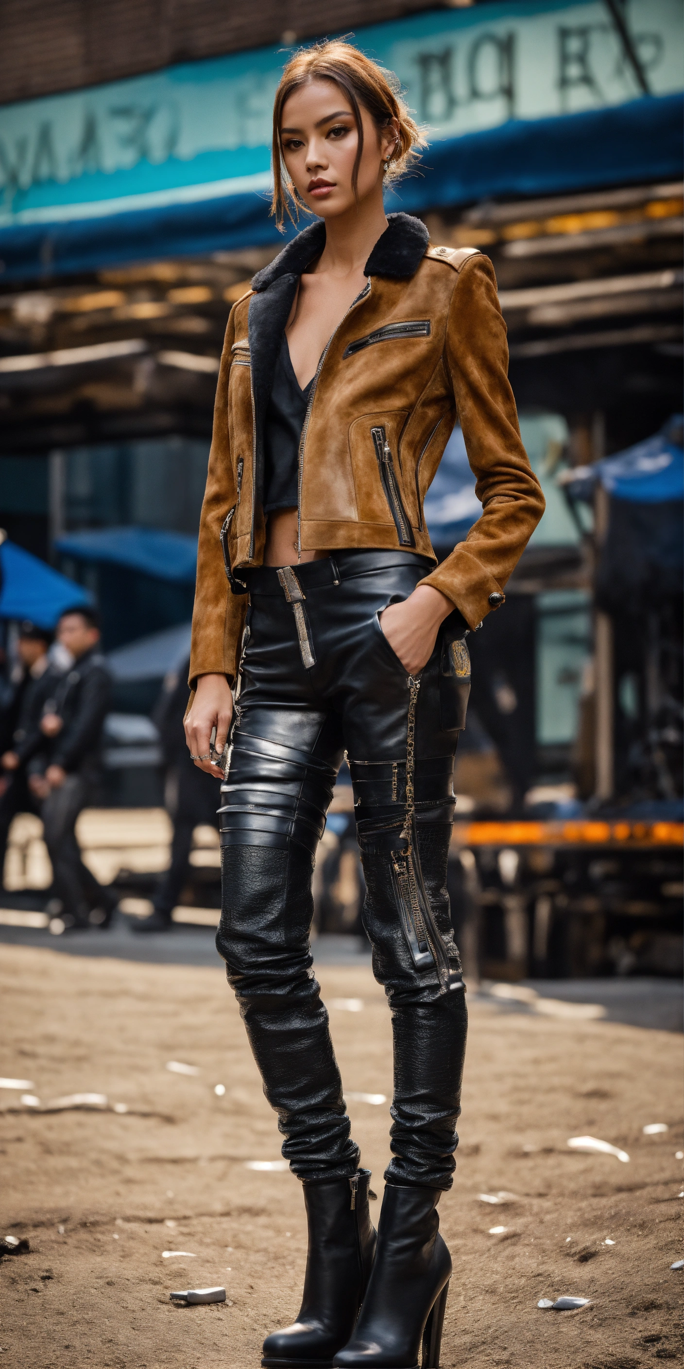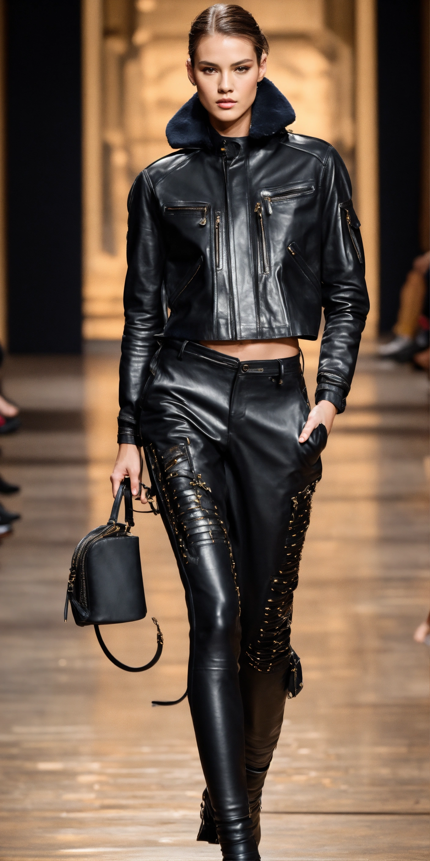 Ultra realistic full body photo of an fashionable model modeling novelty interesting complex unusual sporty modern brave black waxed leather and suede pants, military textures metal walking runway in new york