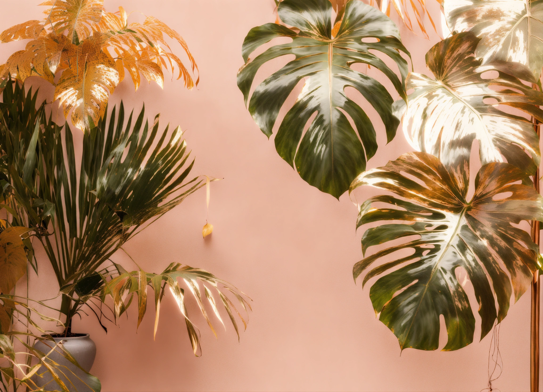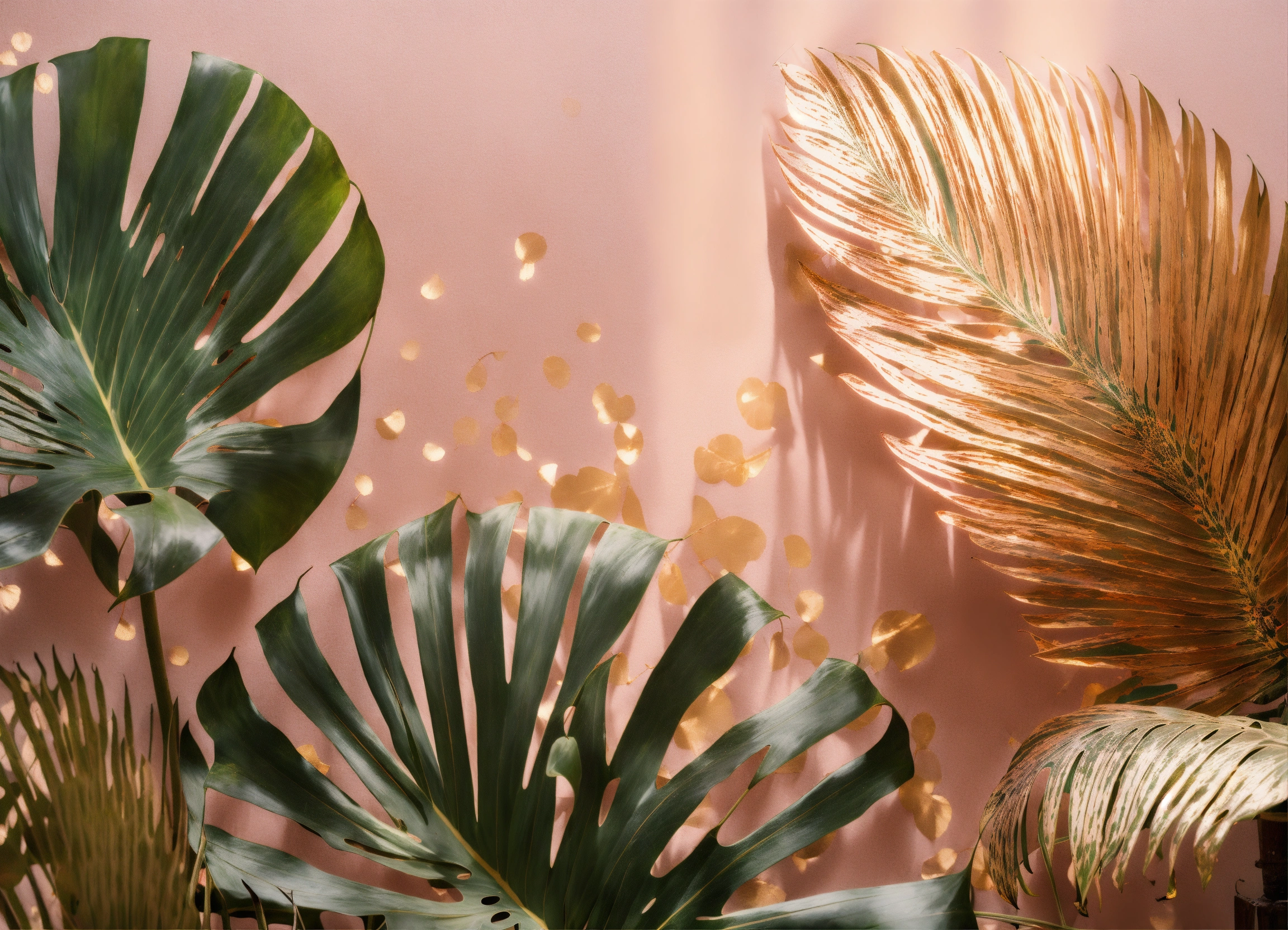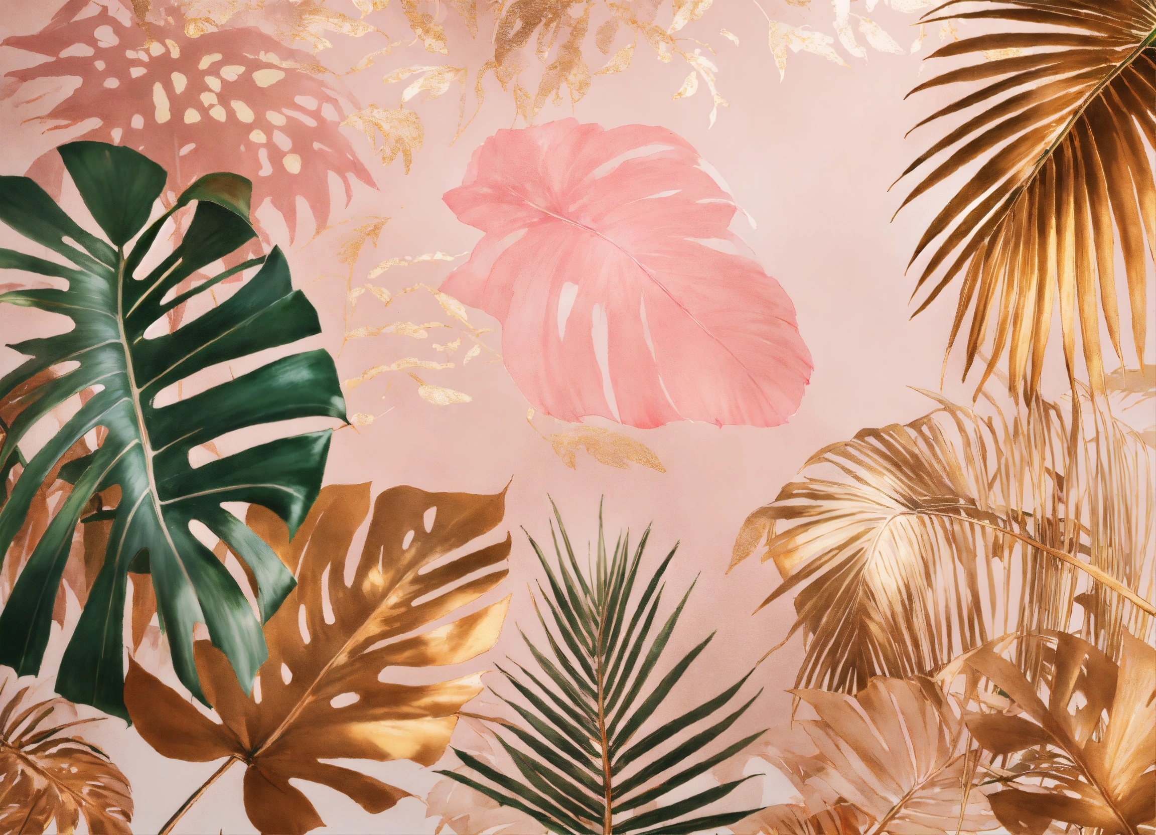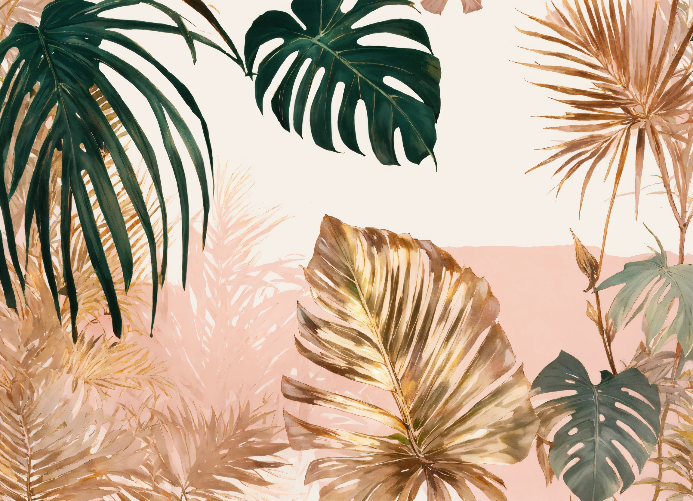 ((studio lighting with white background)) vintage wallpaper tropical painting, studio art, soft neutral colors ((golden palm foliage, golden tropical foliage)) ((monstera leaves)) female silhouettes in rose gold, small mystical crystals