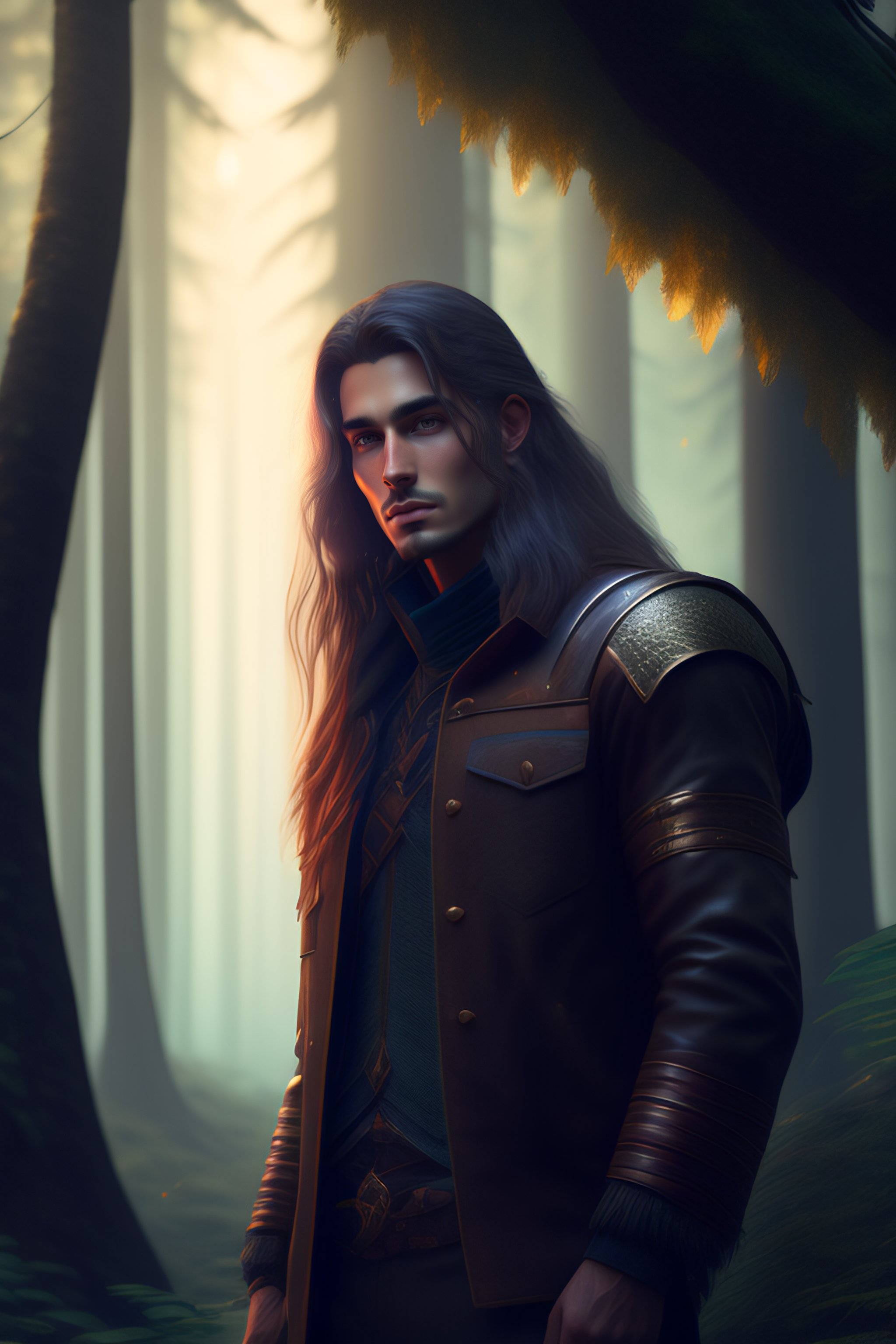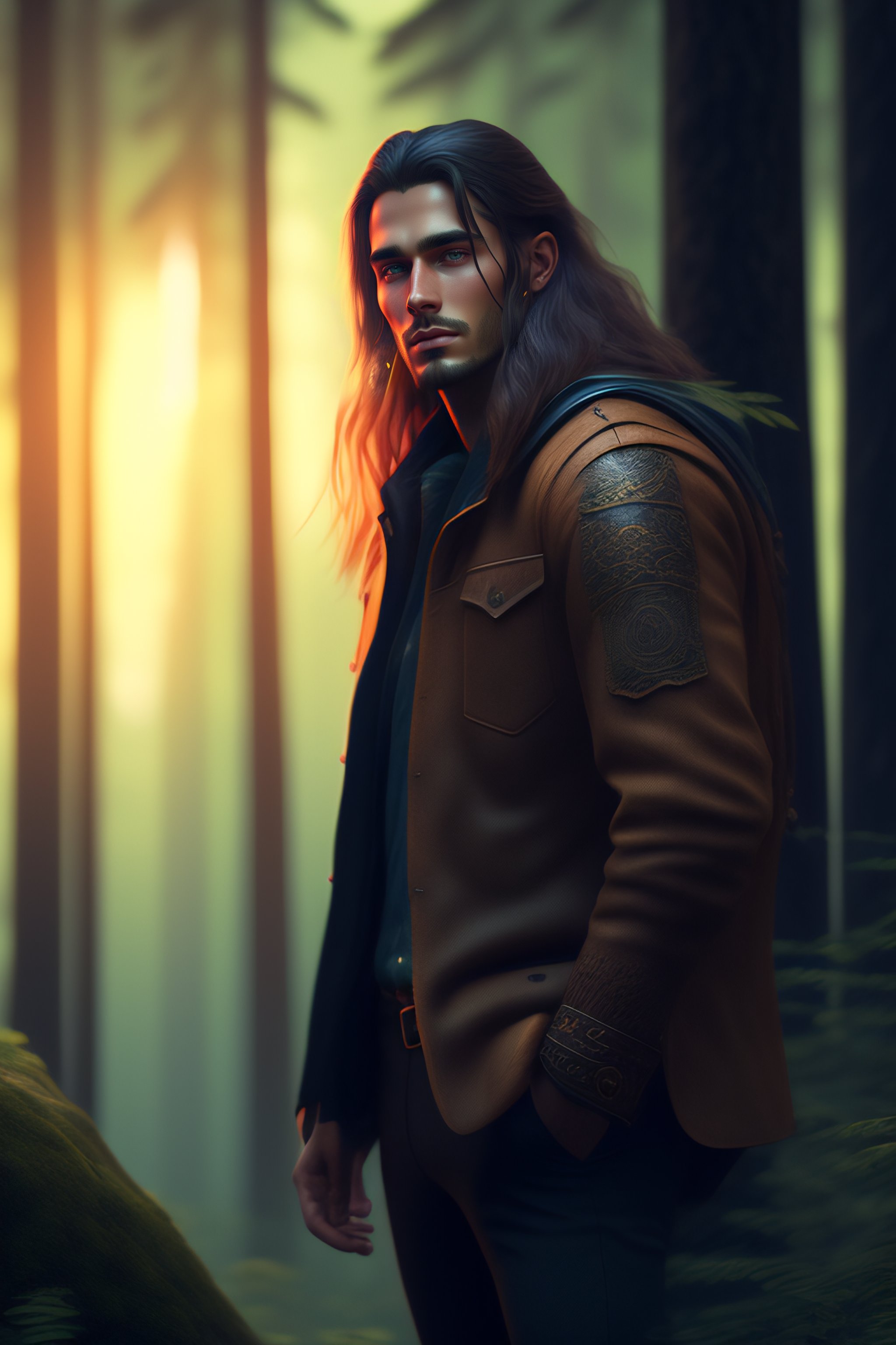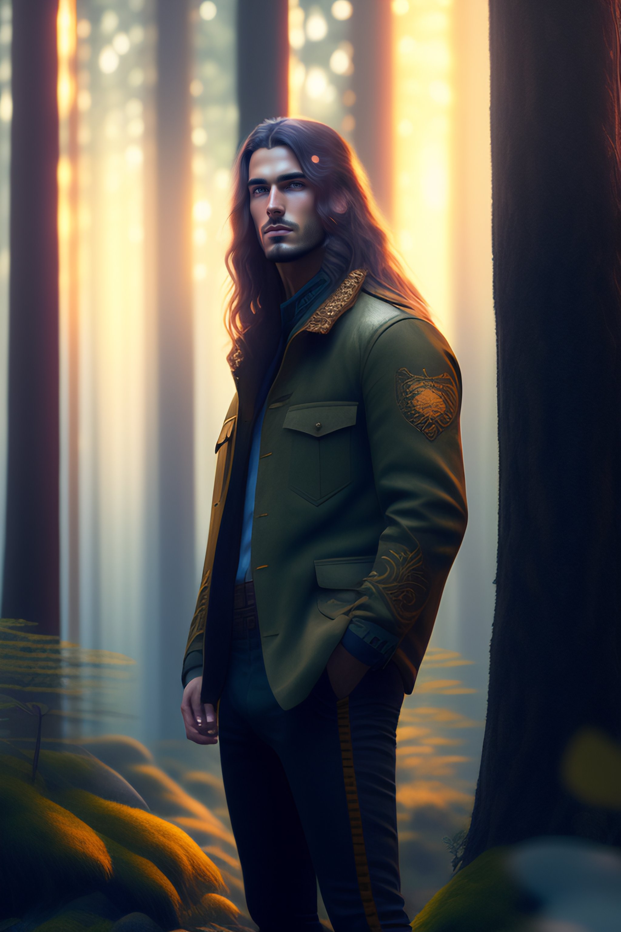 Forest, man, handsome, fantasy, long hair cute handsome young thin, haircut highly detailed, digital painting, atmospheric lighting, octane render, unreal engine, professional