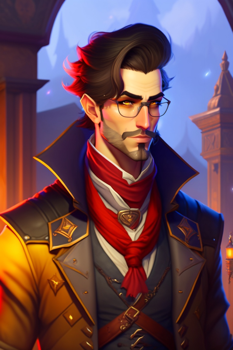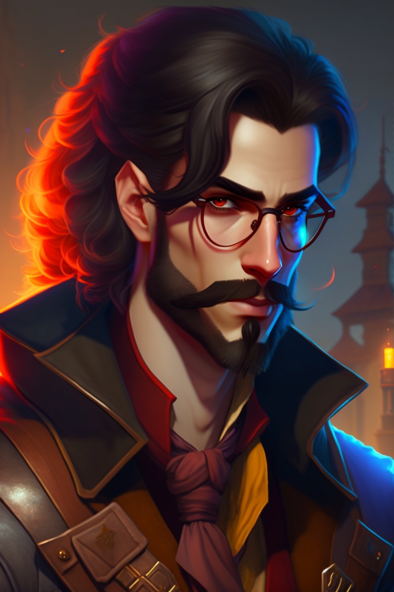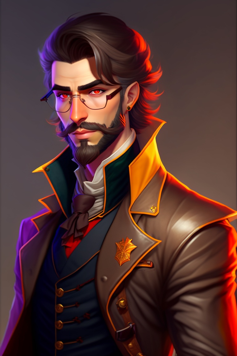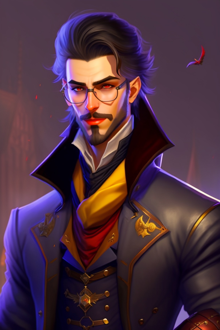 20 years old male vampire character, romani, d&d, vistani, archeologist, magician, dark hair, yellow eyes, glasses, anime style, d&d adventurer, curse of strahd, dark fantasy caharacter vibes, anine style, van helsing vibes, full body, anthropologist, perfect beard