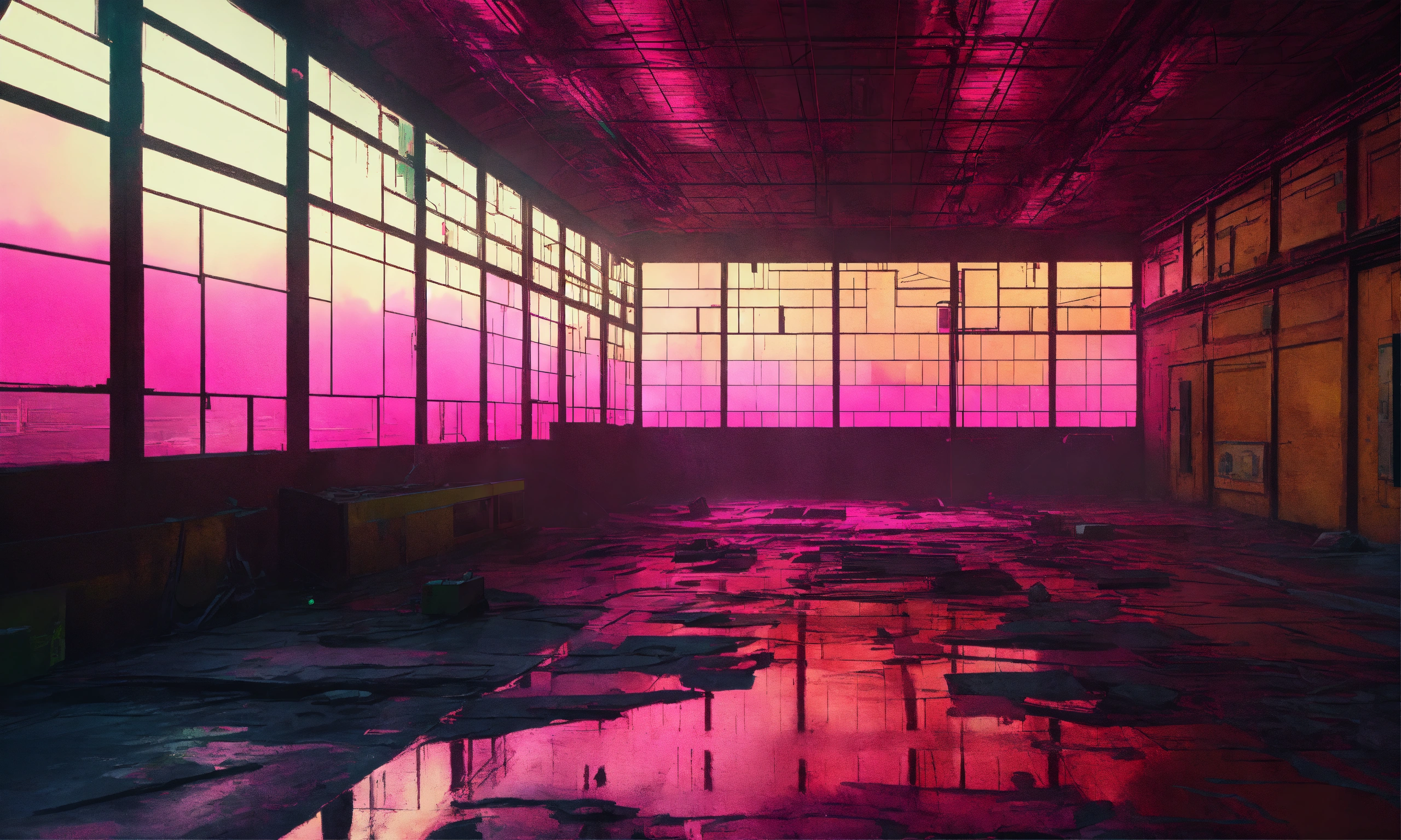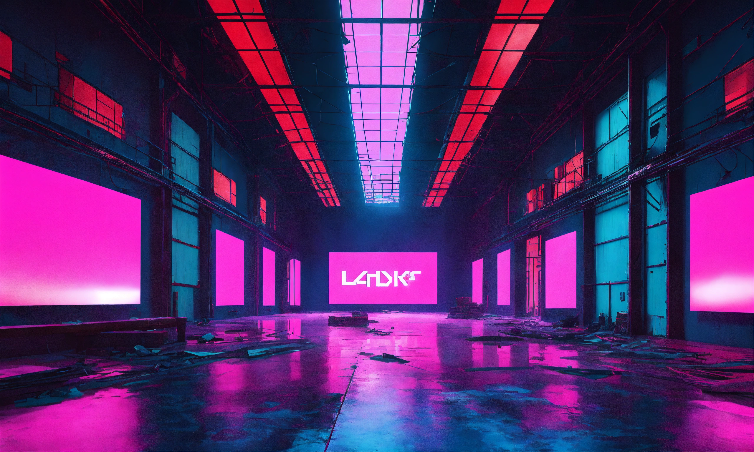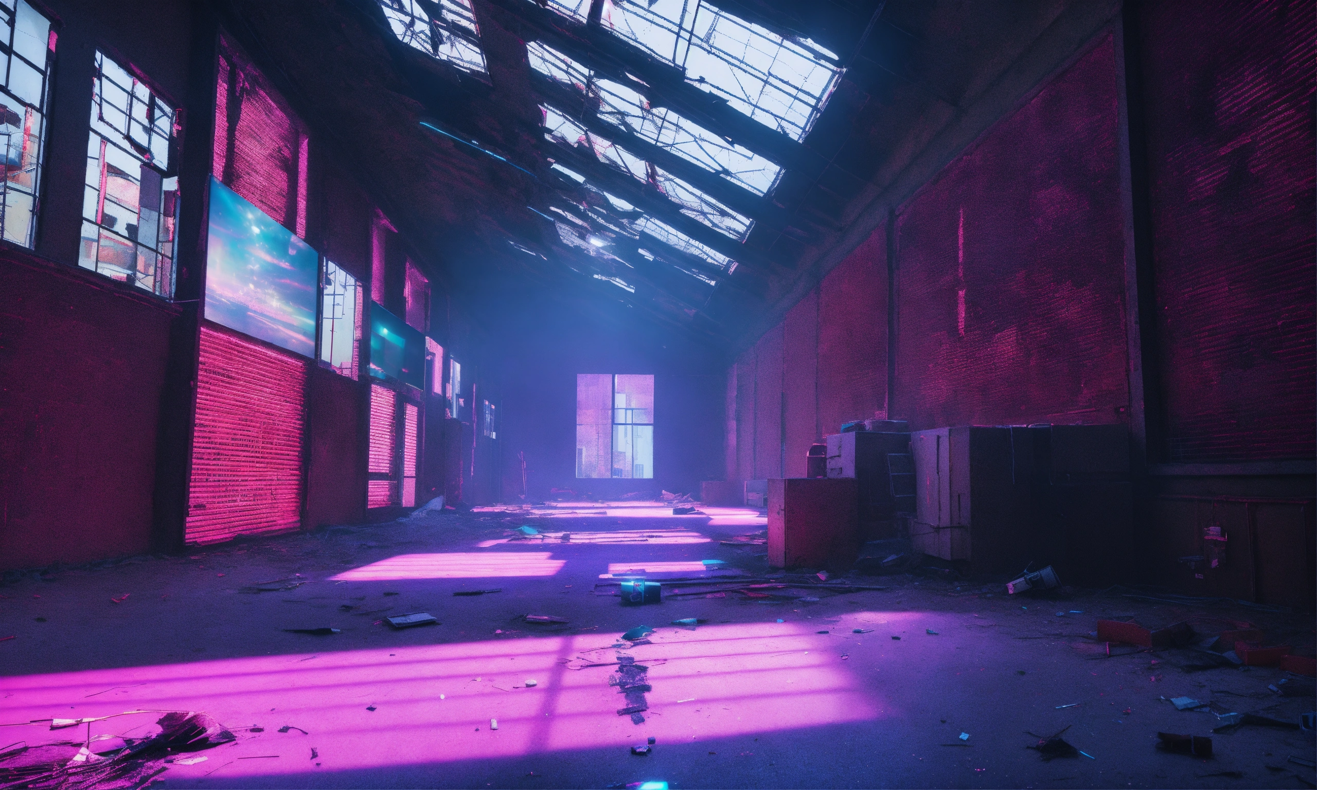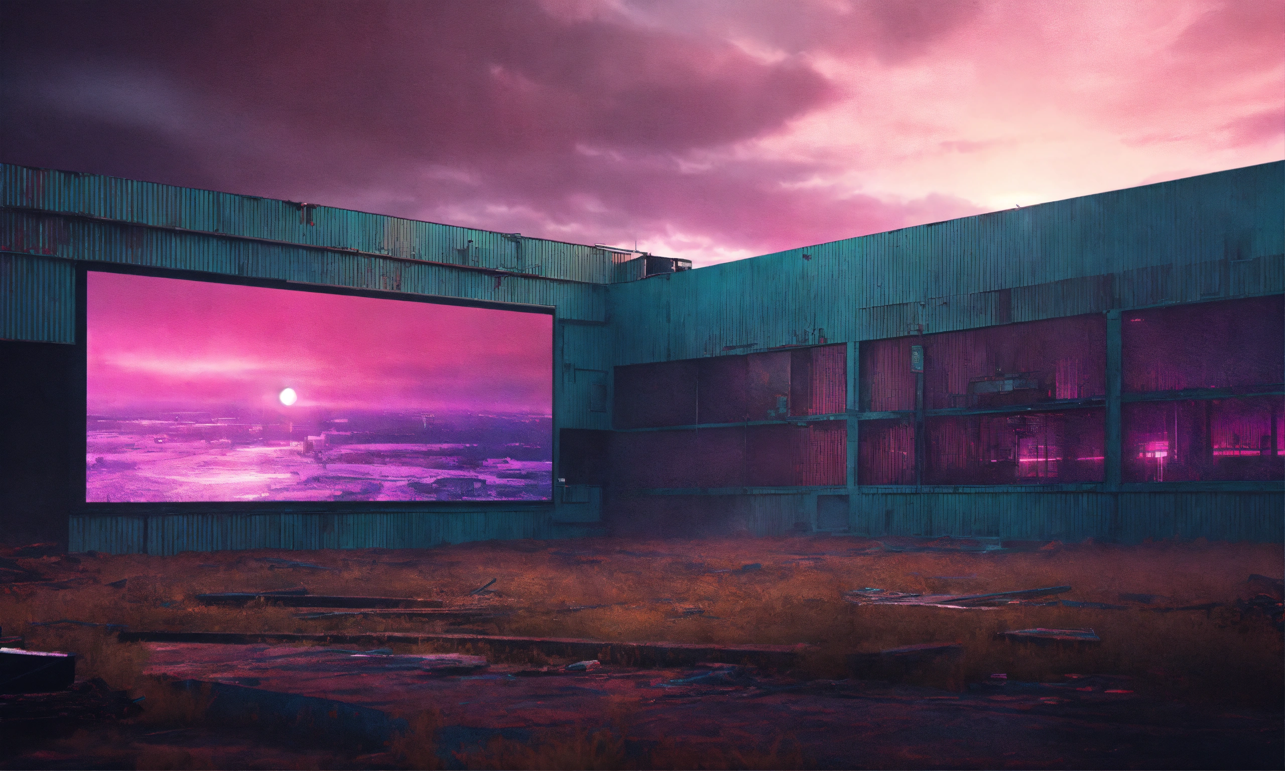 A beautiful, sharp focus, massive led display in the middle of an abandoned wear-house. the space is otherwise empty. the whole area is run down, with broken. window vents letting light in. it's dark and derelict. wide angle. vaporwave ombre rendering. outrun style. by chris moore. beeple colors. ambient occlusion. digital matte painting.